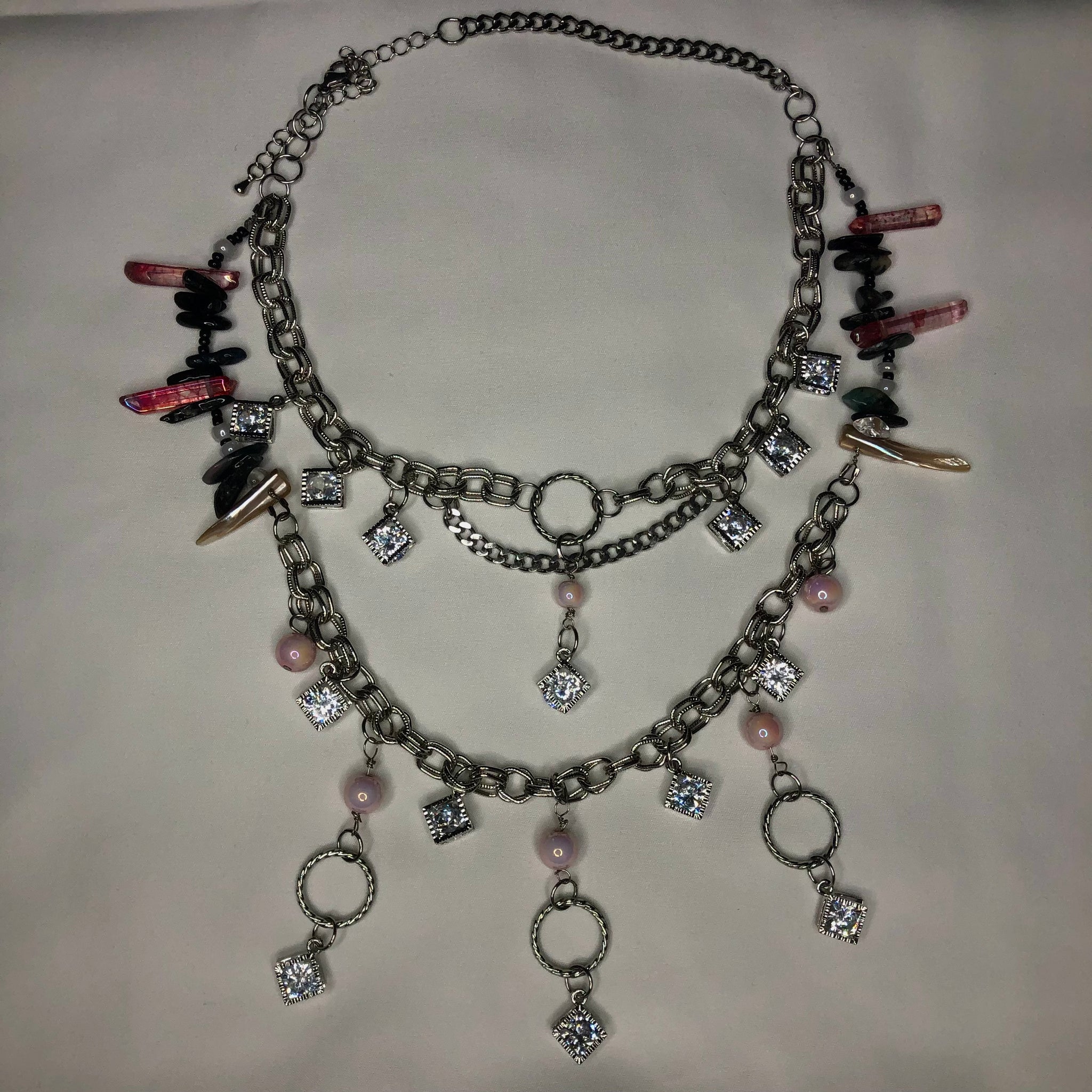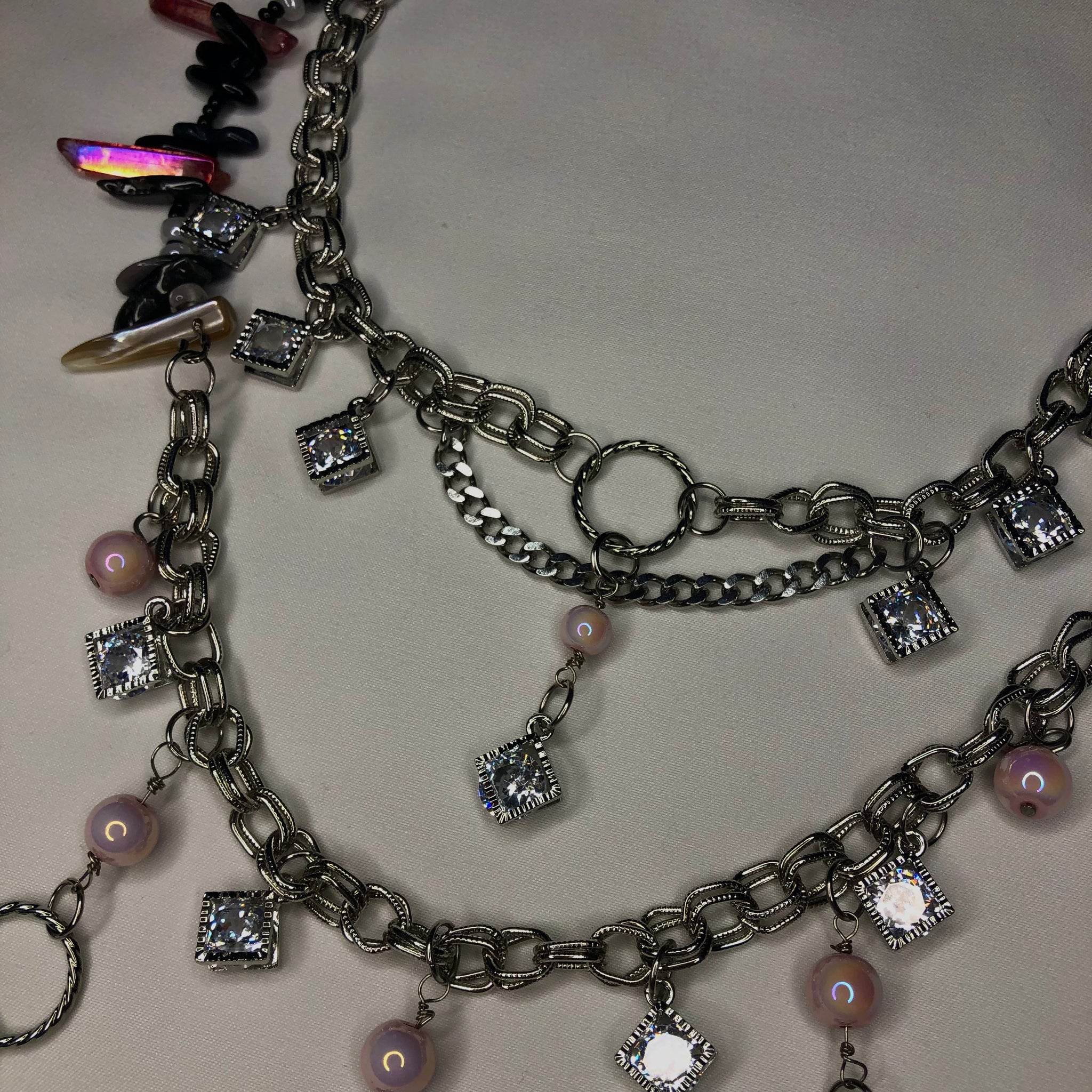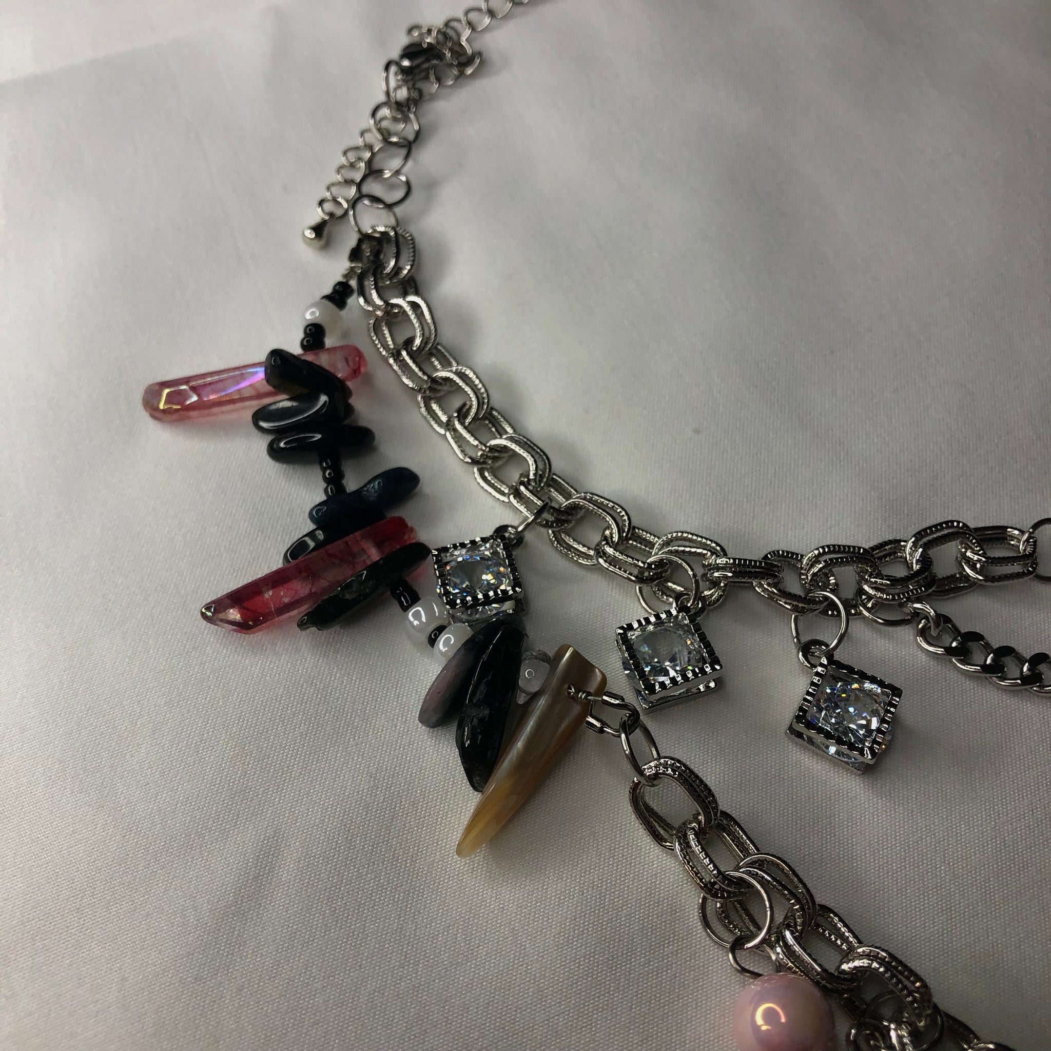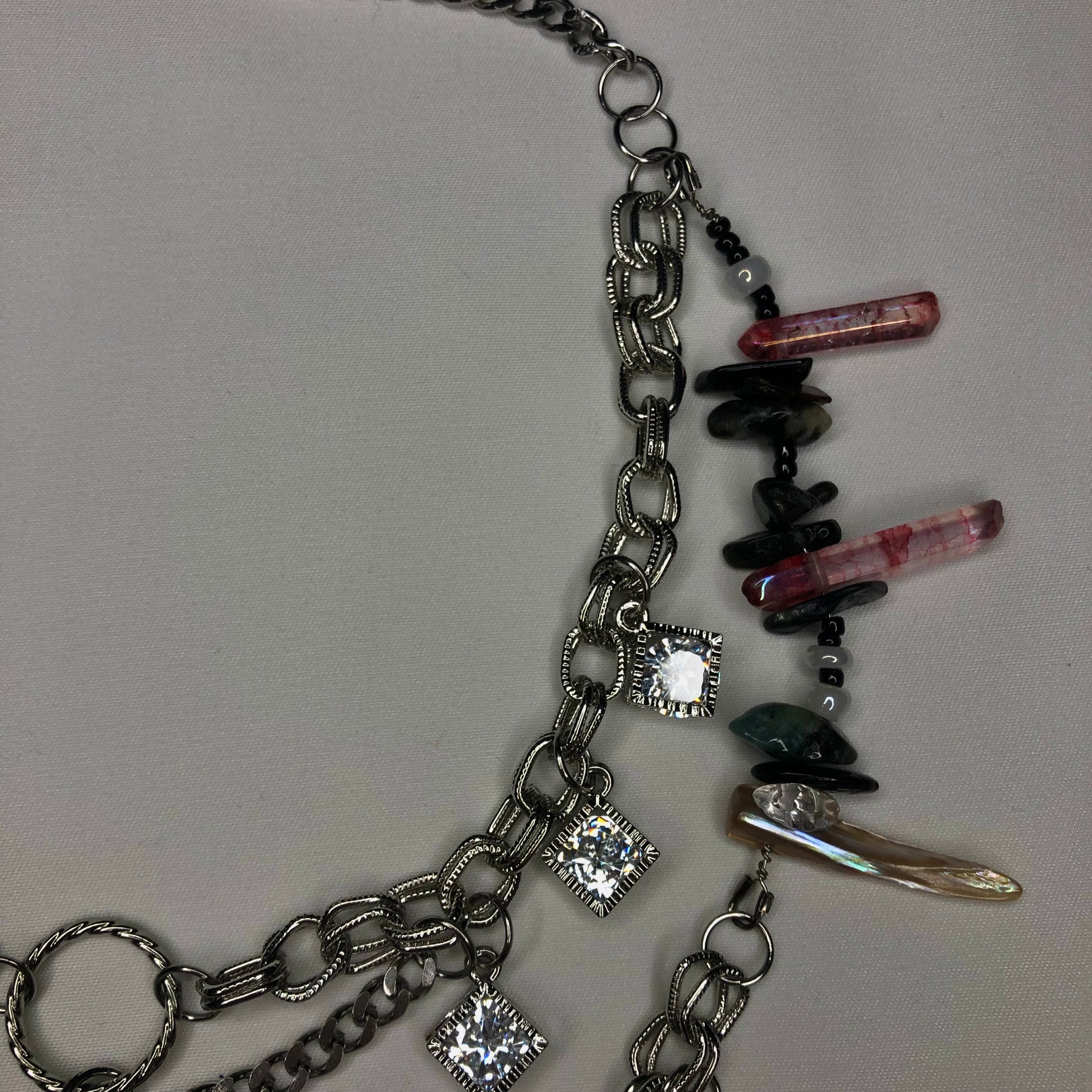 Made with: Aurora Borealis Quartz, Black seed, Zirconia, Pink Marble beads, Black Tourmaline, Shells, Stainless Steel and Clear Quartz.