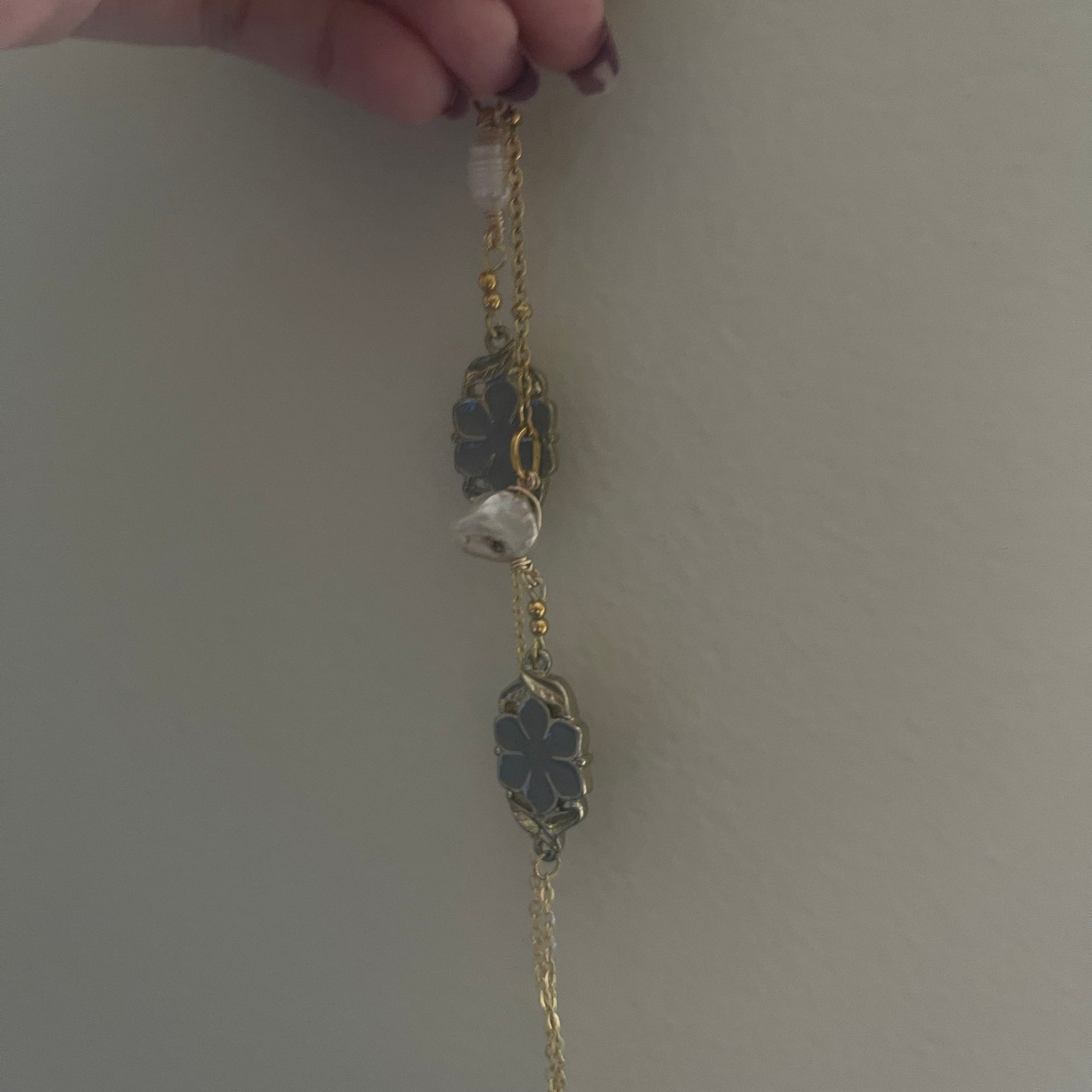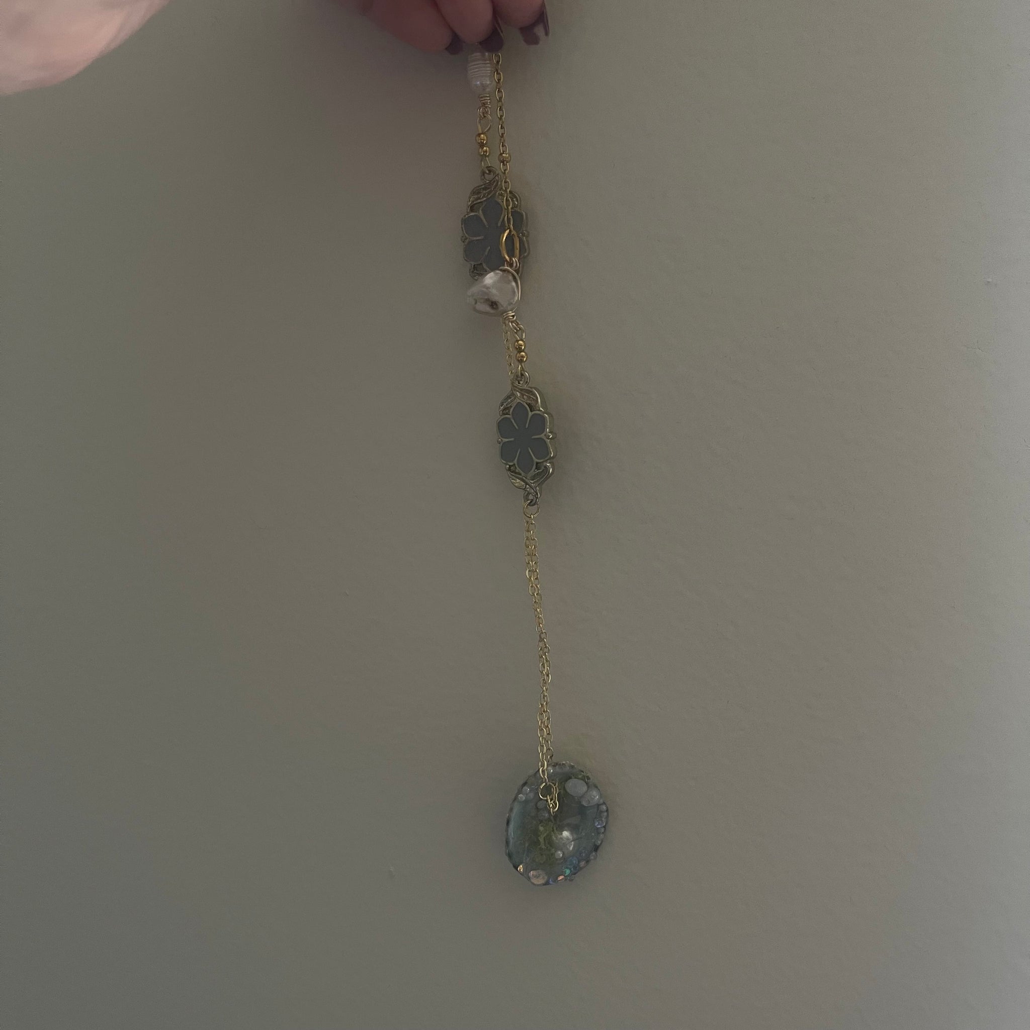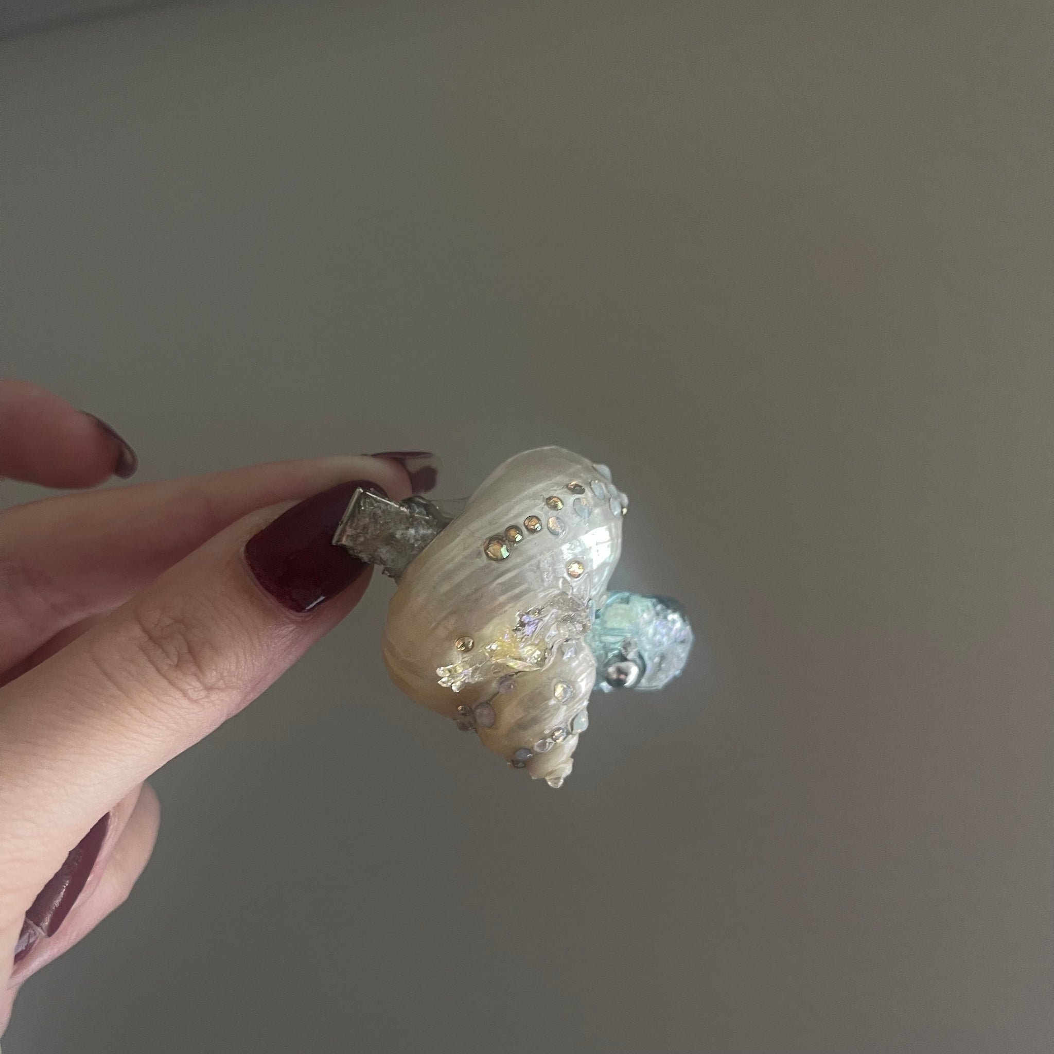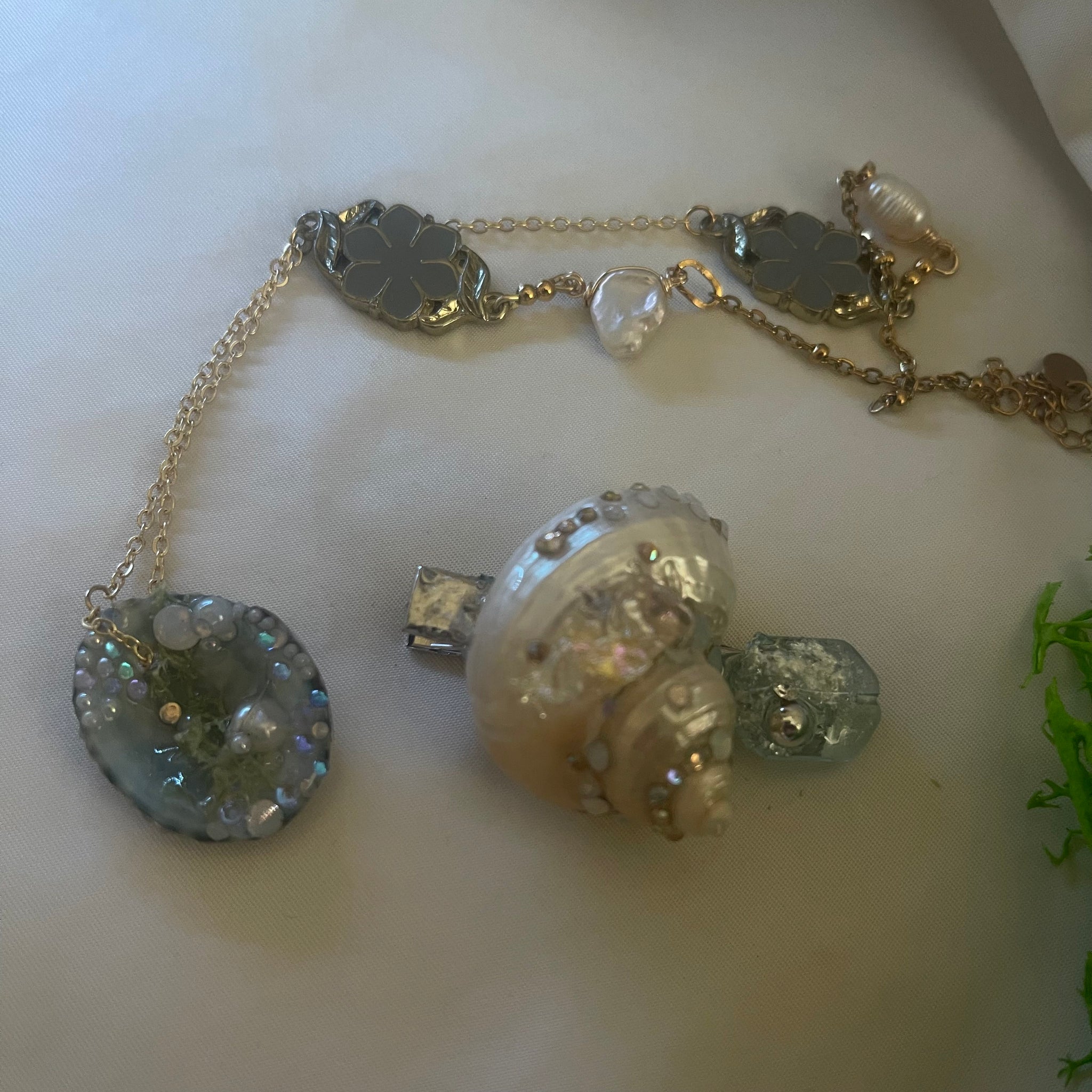 Made with: Antique charms, Real bedazzled seashell, freshwater pearls, Stainless steel chain and Glass.