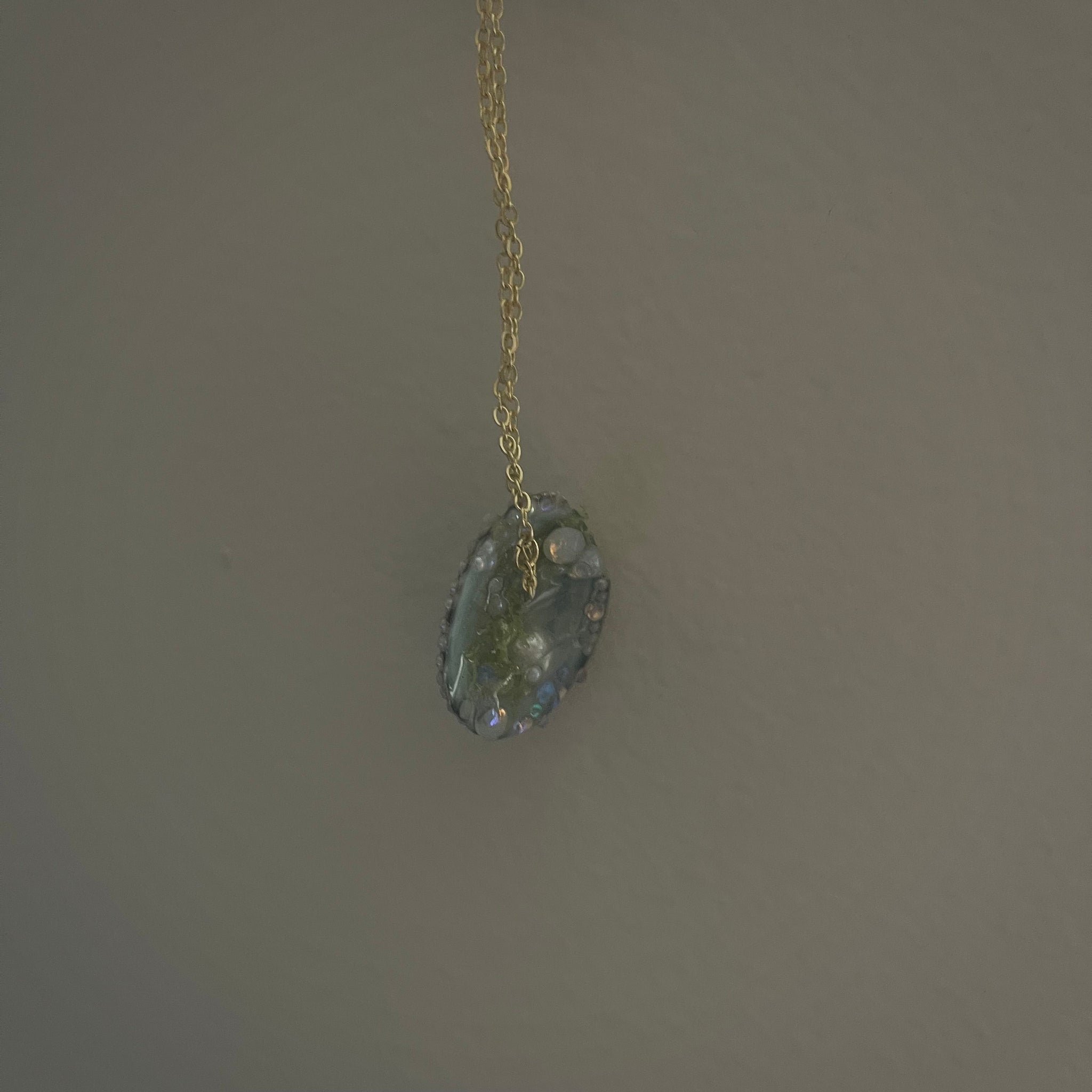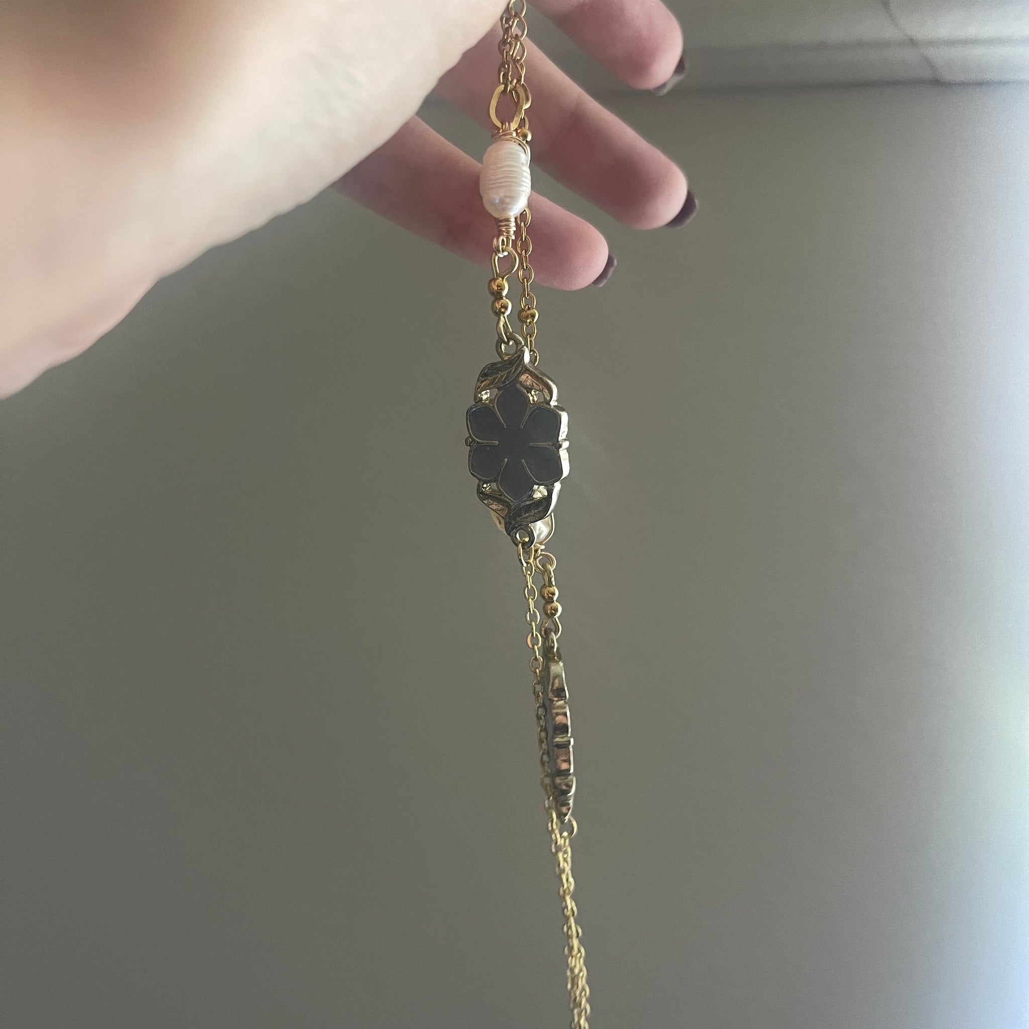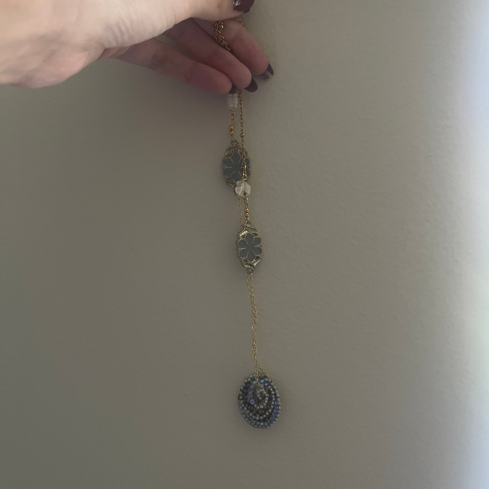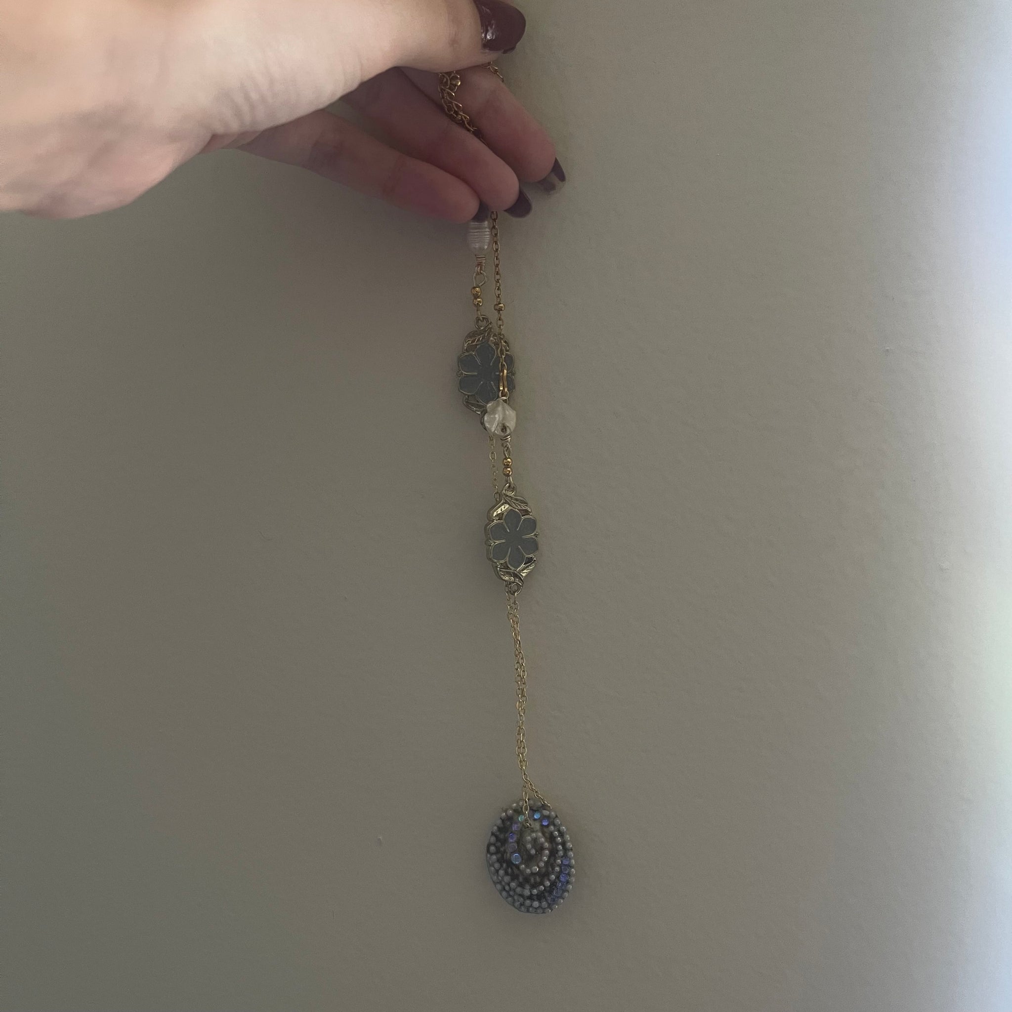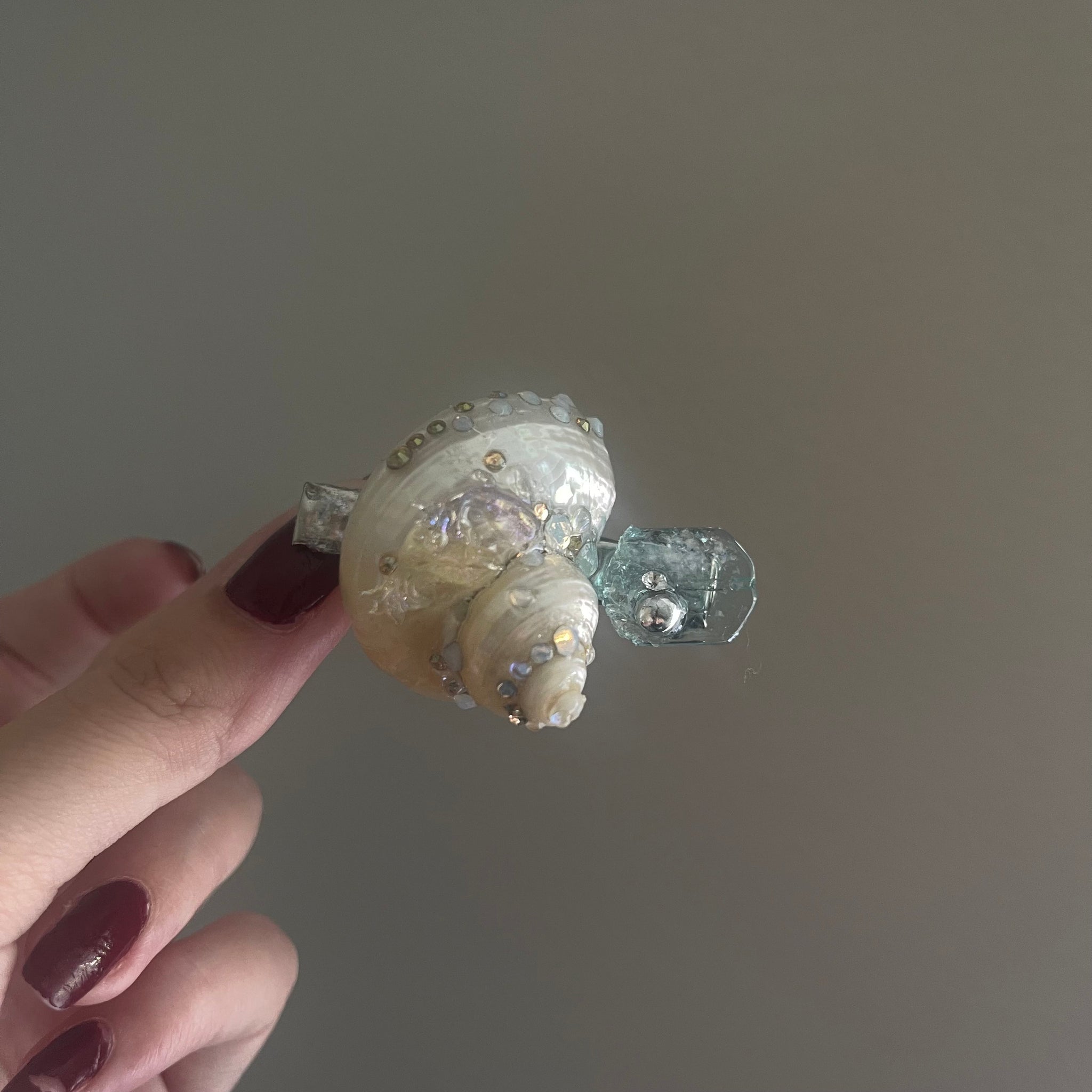 Made with: Antique charms, Real bedazzled seashell, freshwater pearls, Stainless steel chain and Glass.