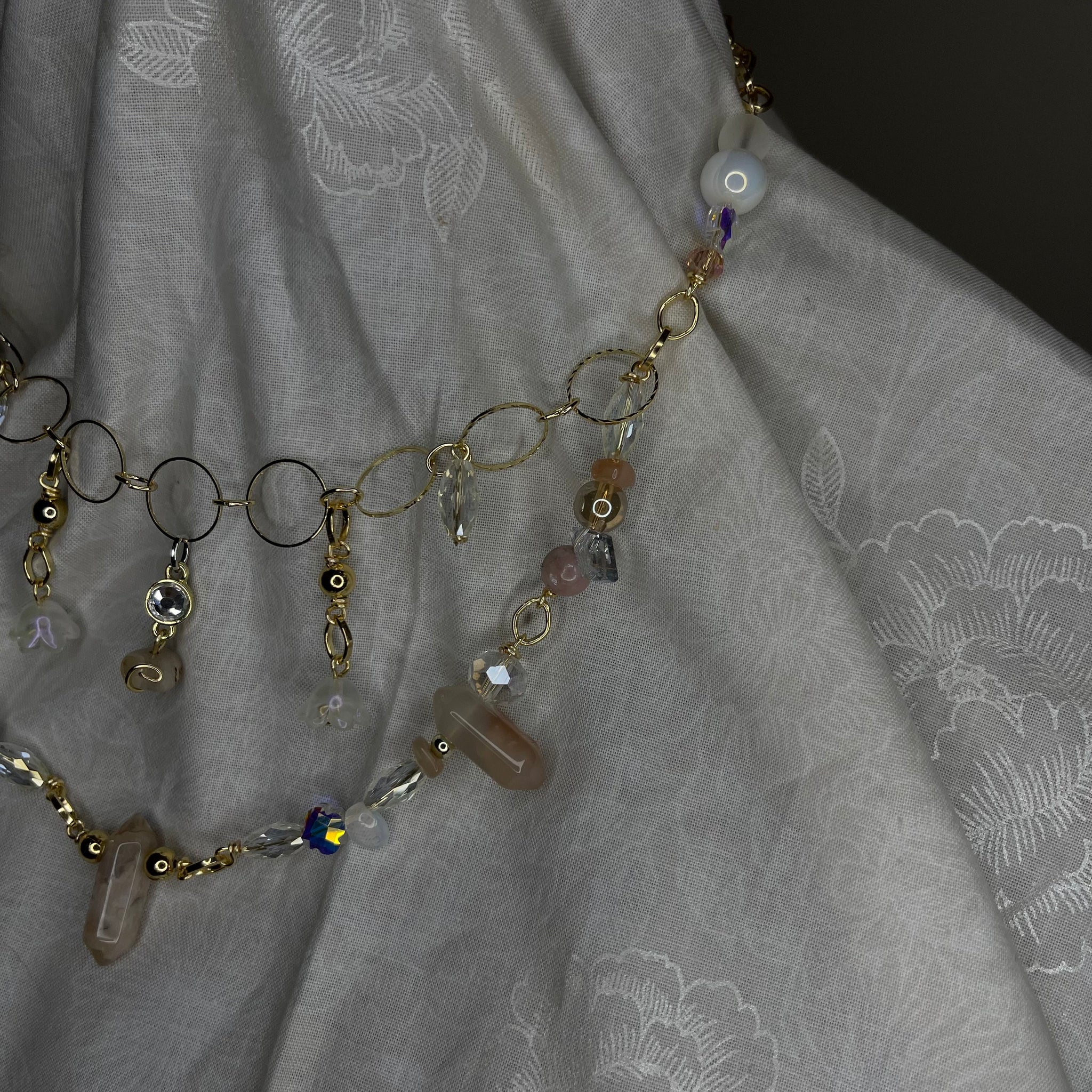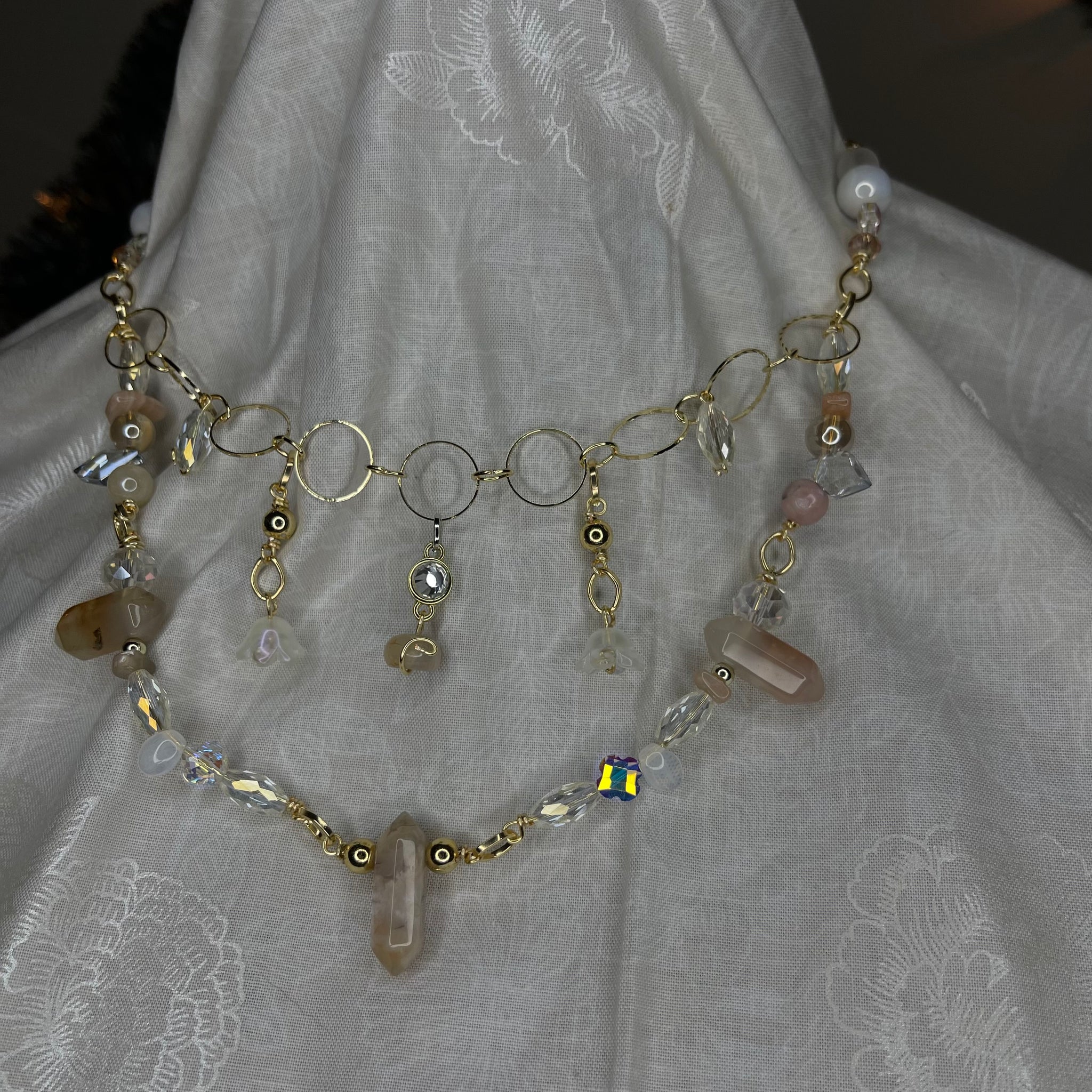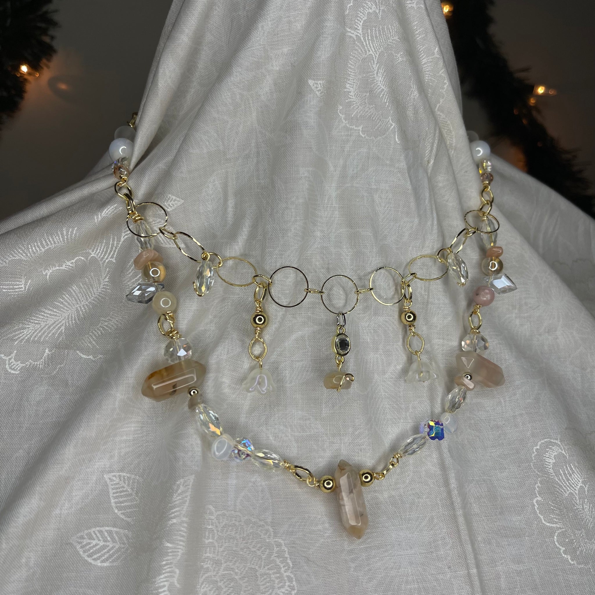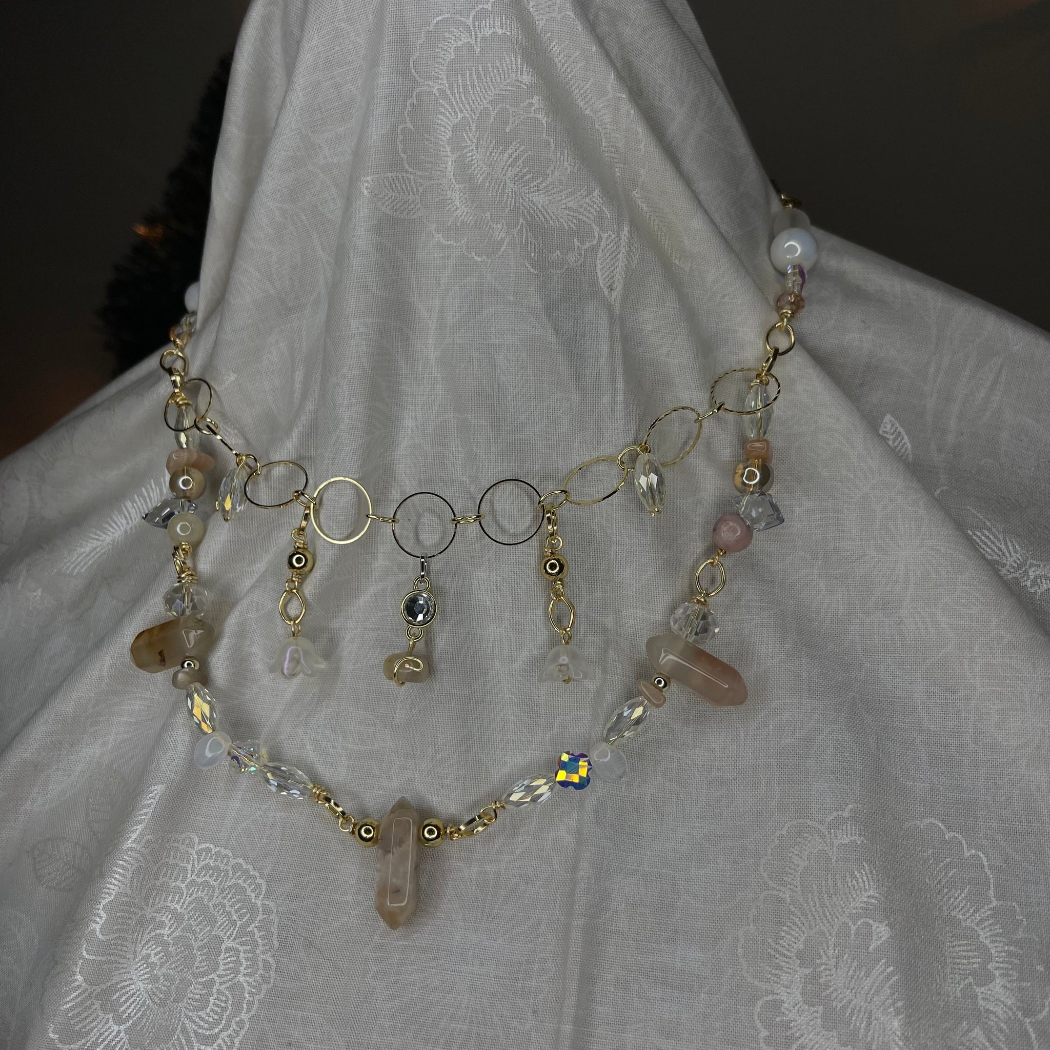 Made with: rhodium, Glass, carnelian, opal and clear quartz.