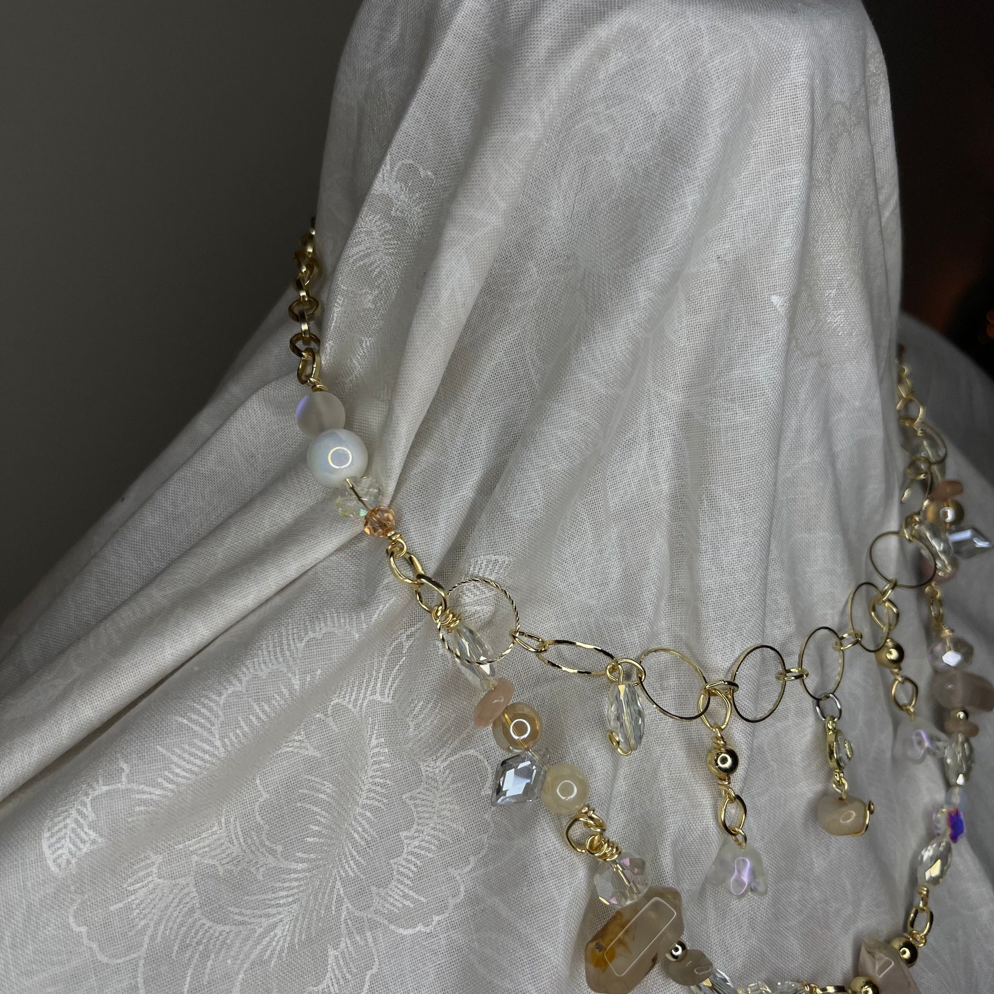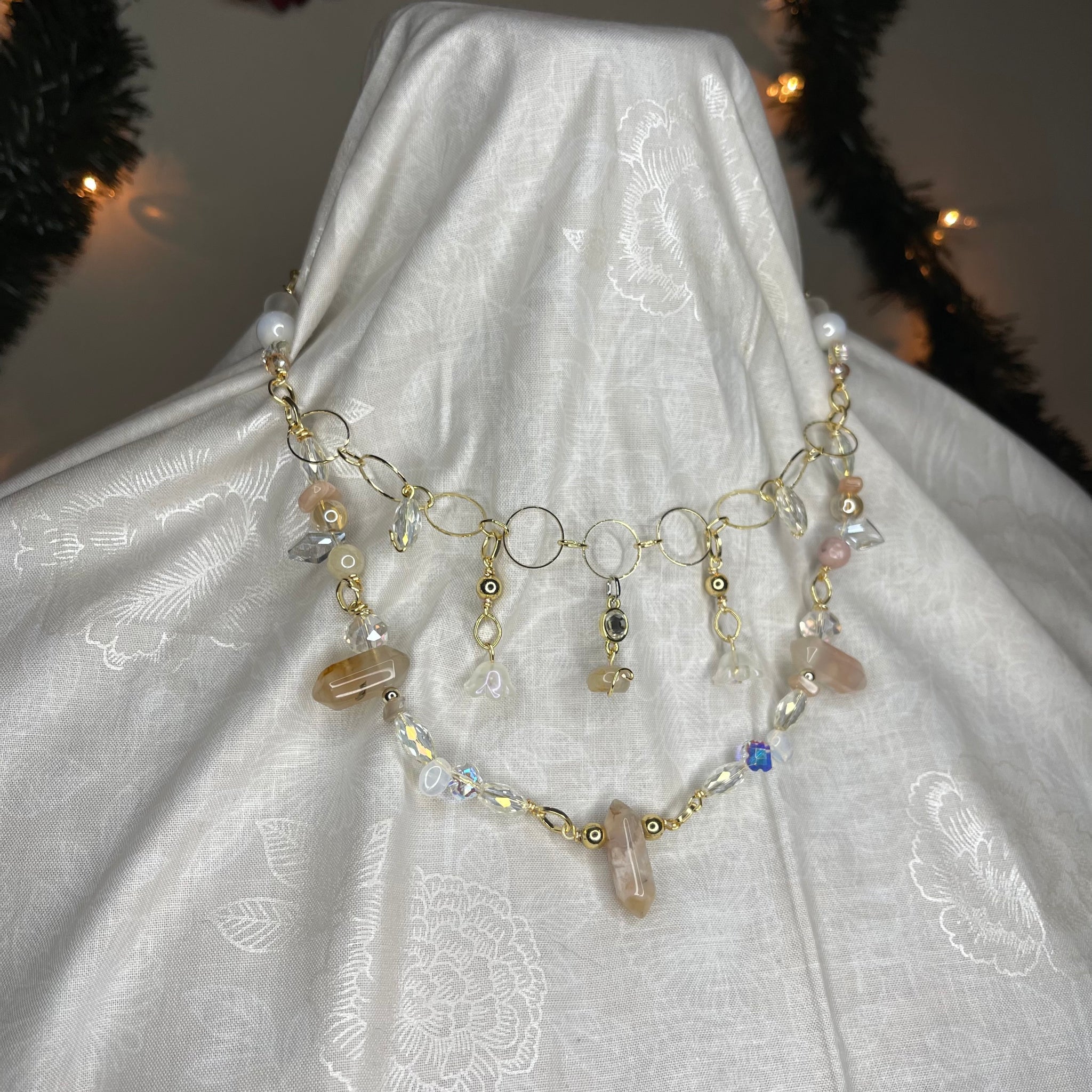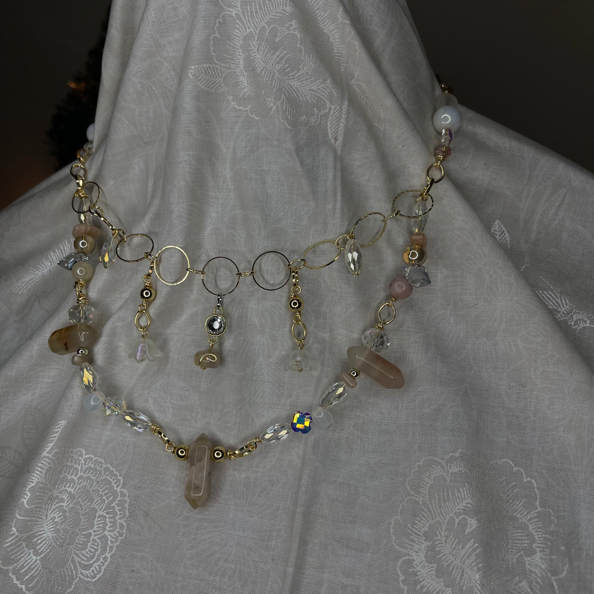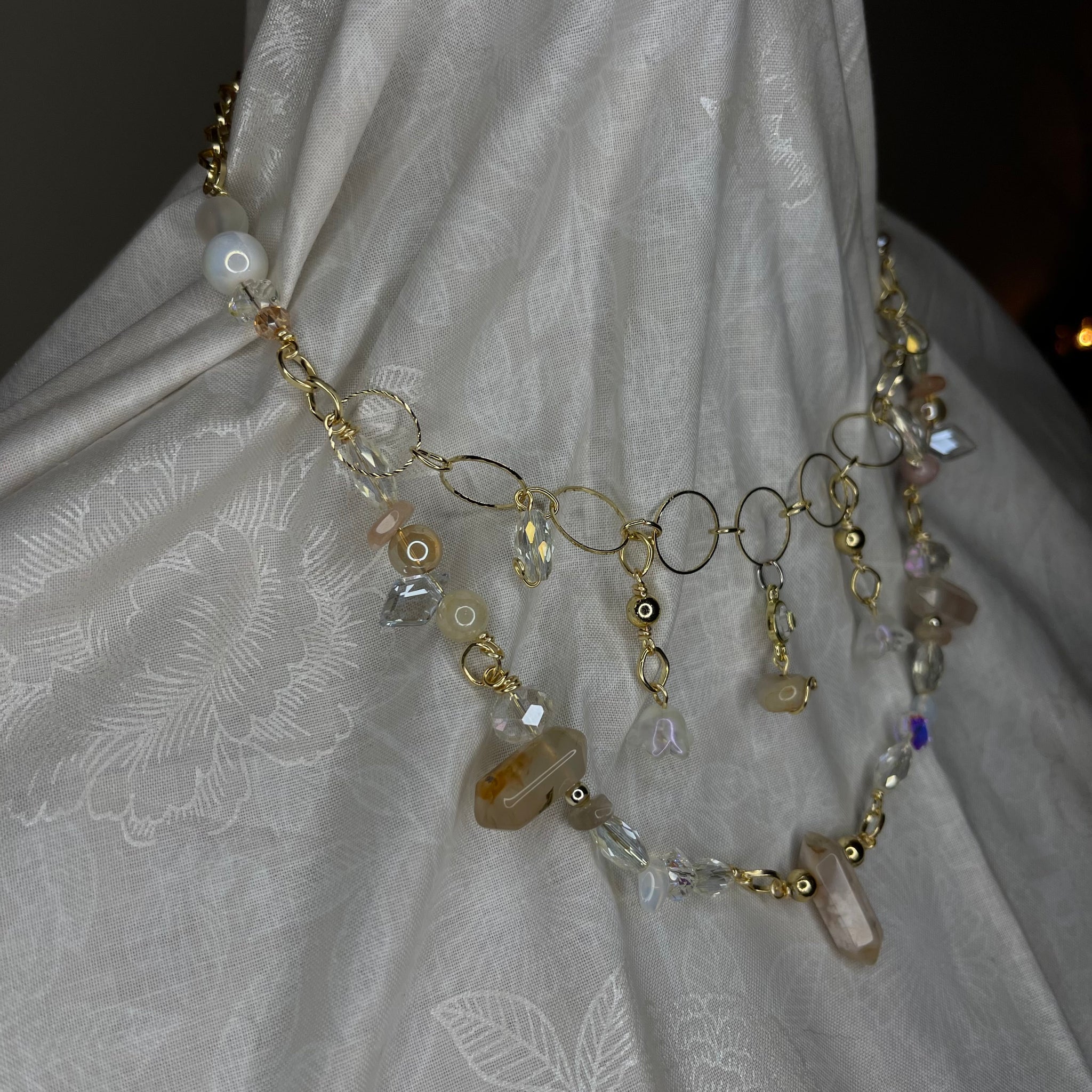 Made with: rhodium, Glass, carnelian, opal and clear quartz.