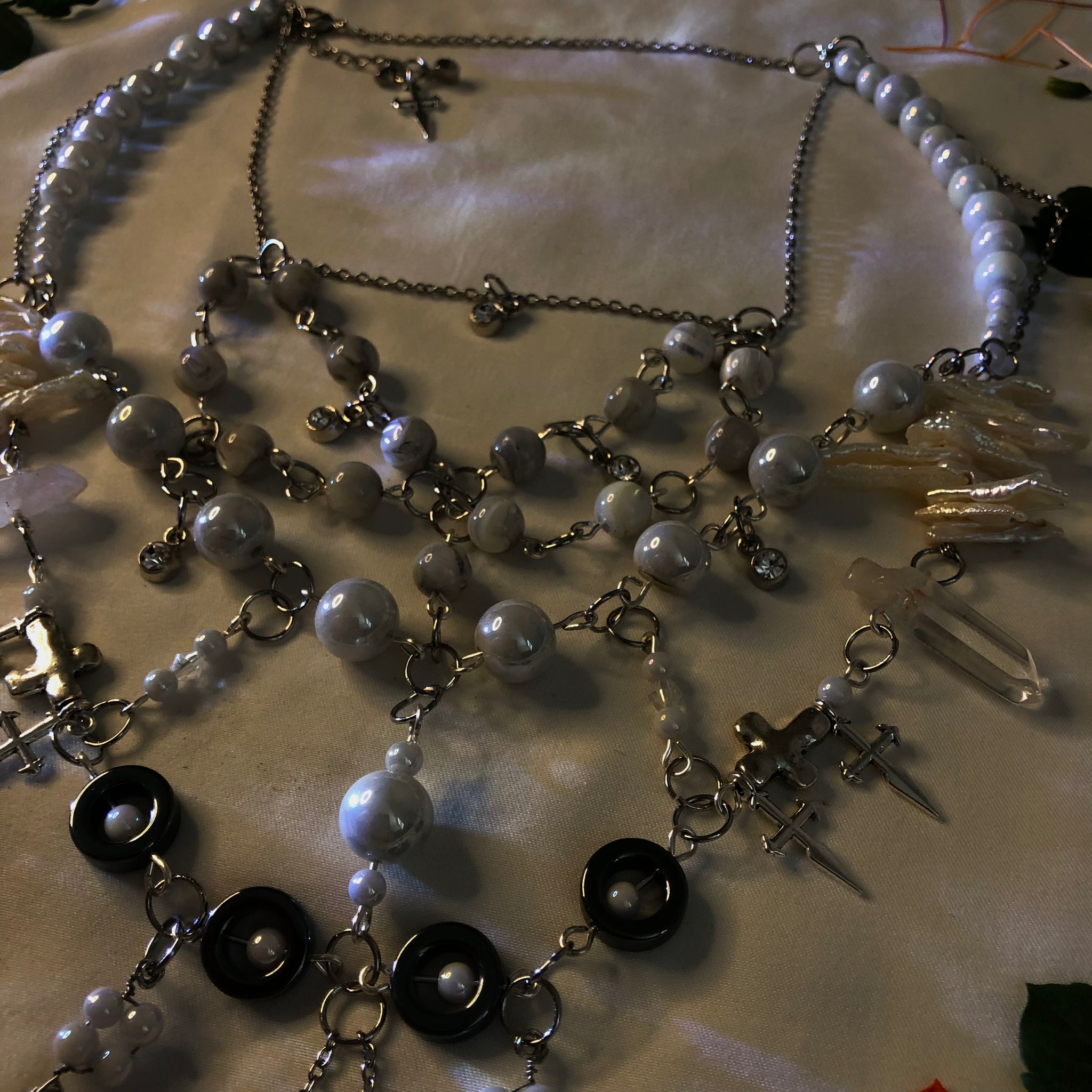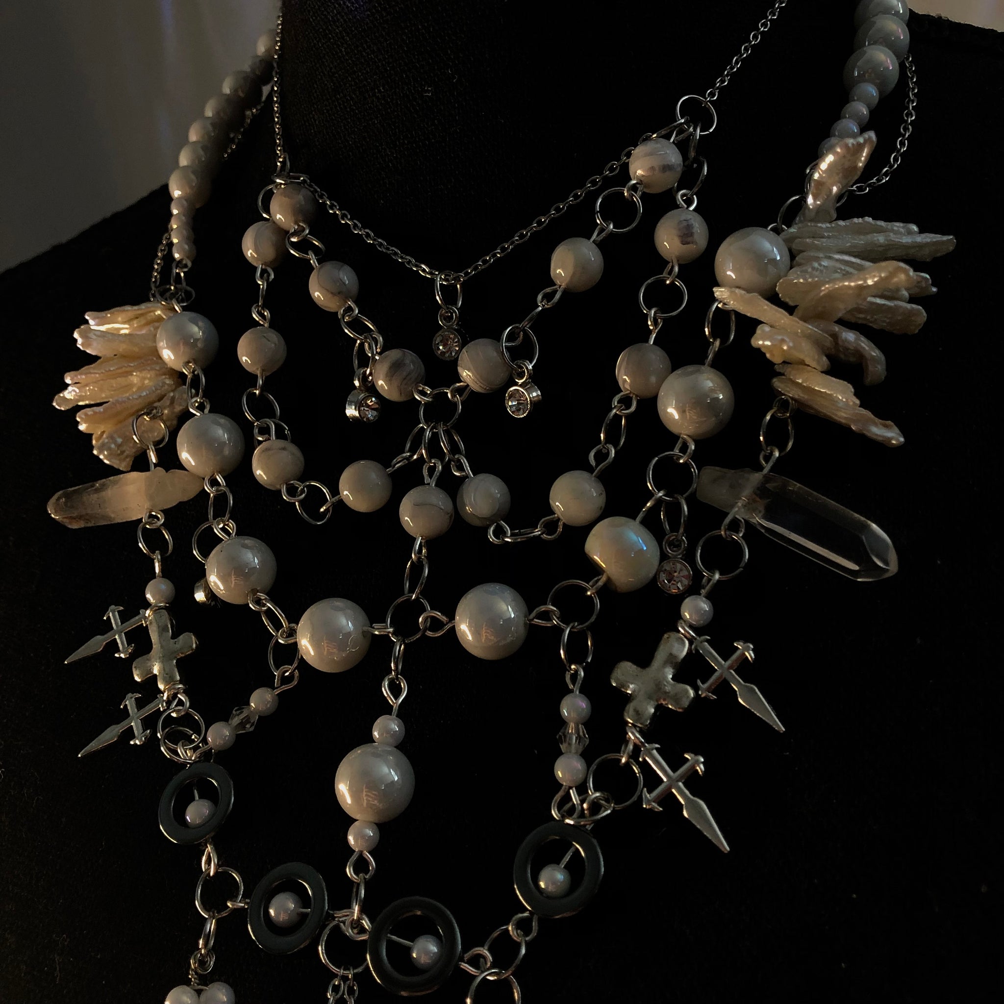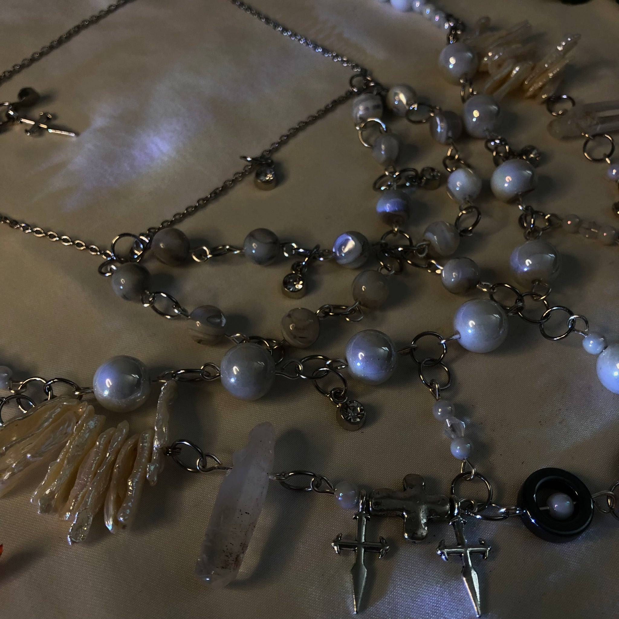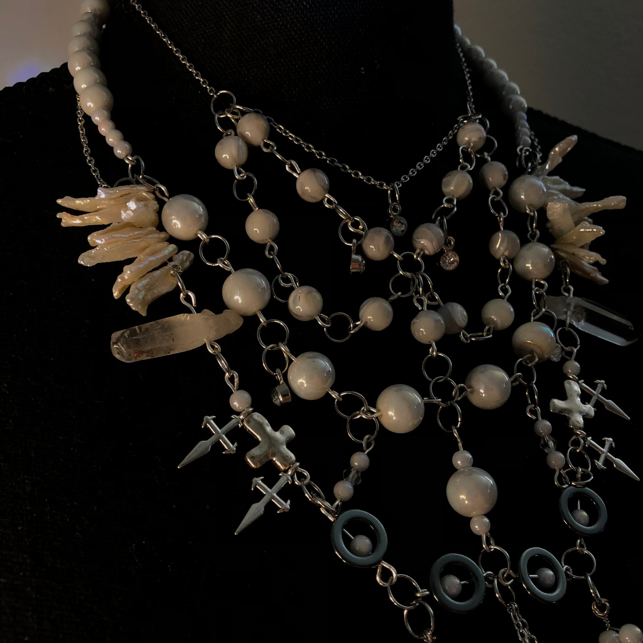 Stainless Steel chain made with Marble Pearls, White Mother of Pearls, Amphibole Angel Phantom Quartz, White Biwa Pearls, Metal crosses and swords.