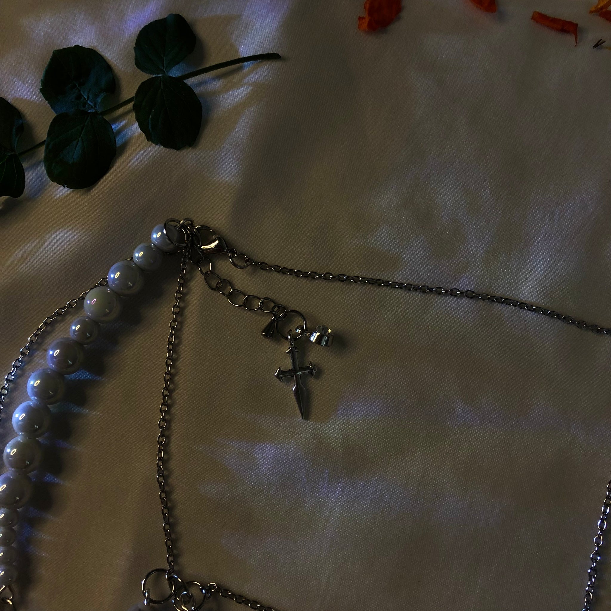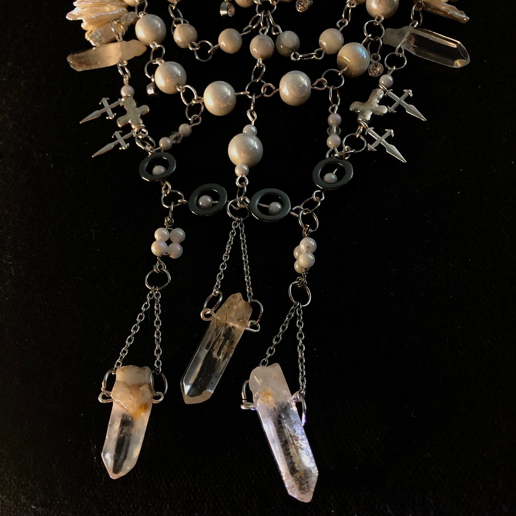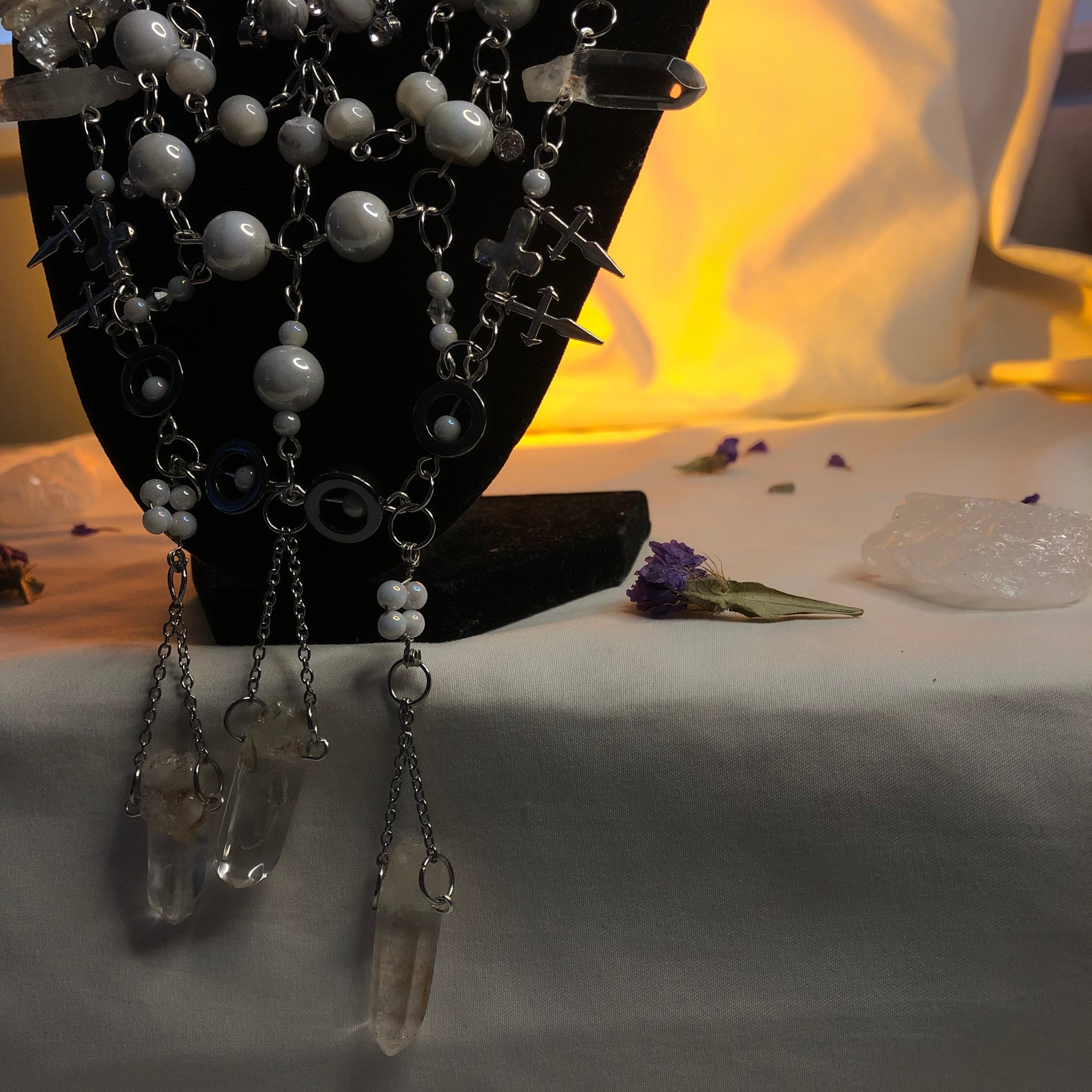 Stainless Steel chain made with Marble Pearls, White Mother of Pearls, Amphibole Angel Phantom Quartz, White Biwa Pearls, Metal crosses and swords.