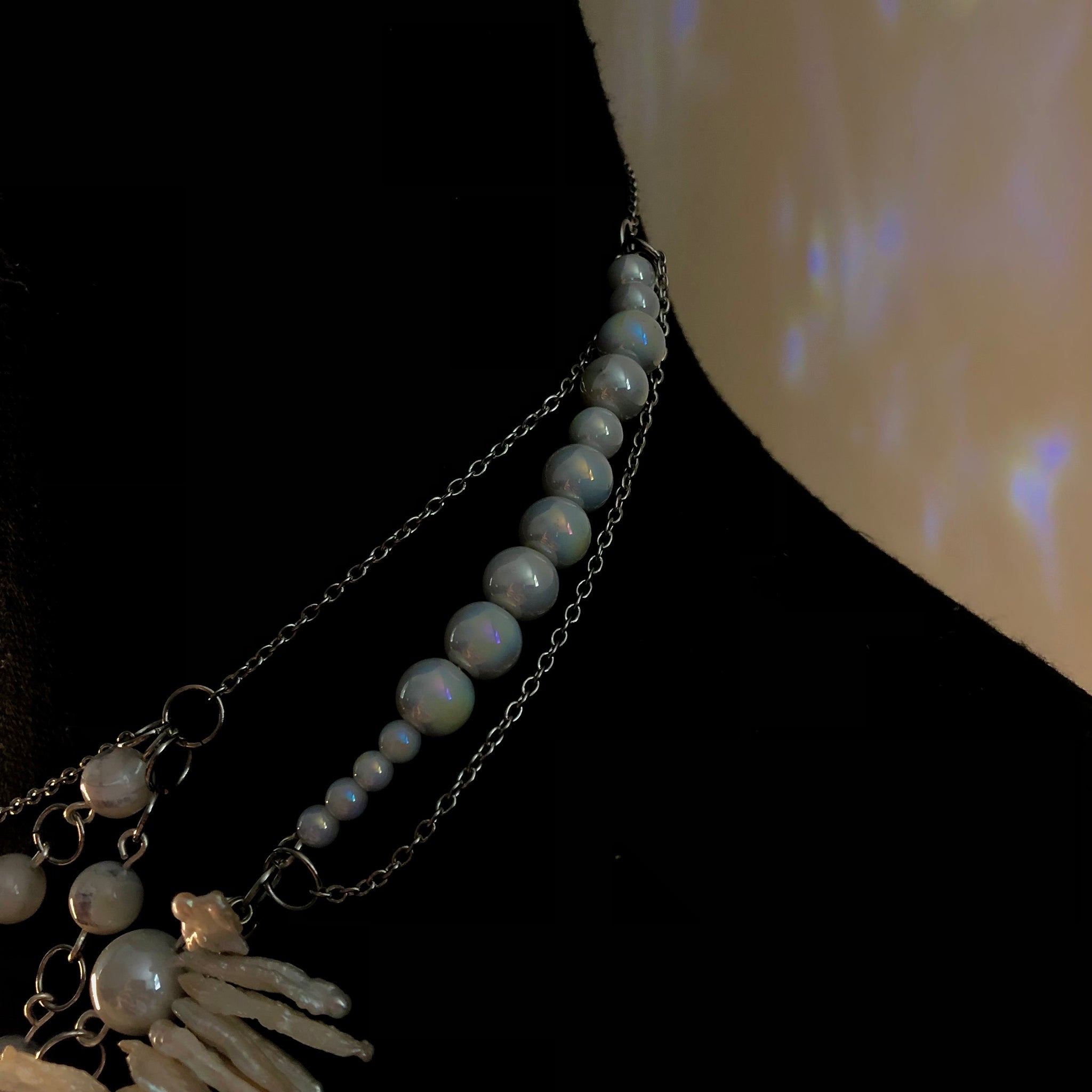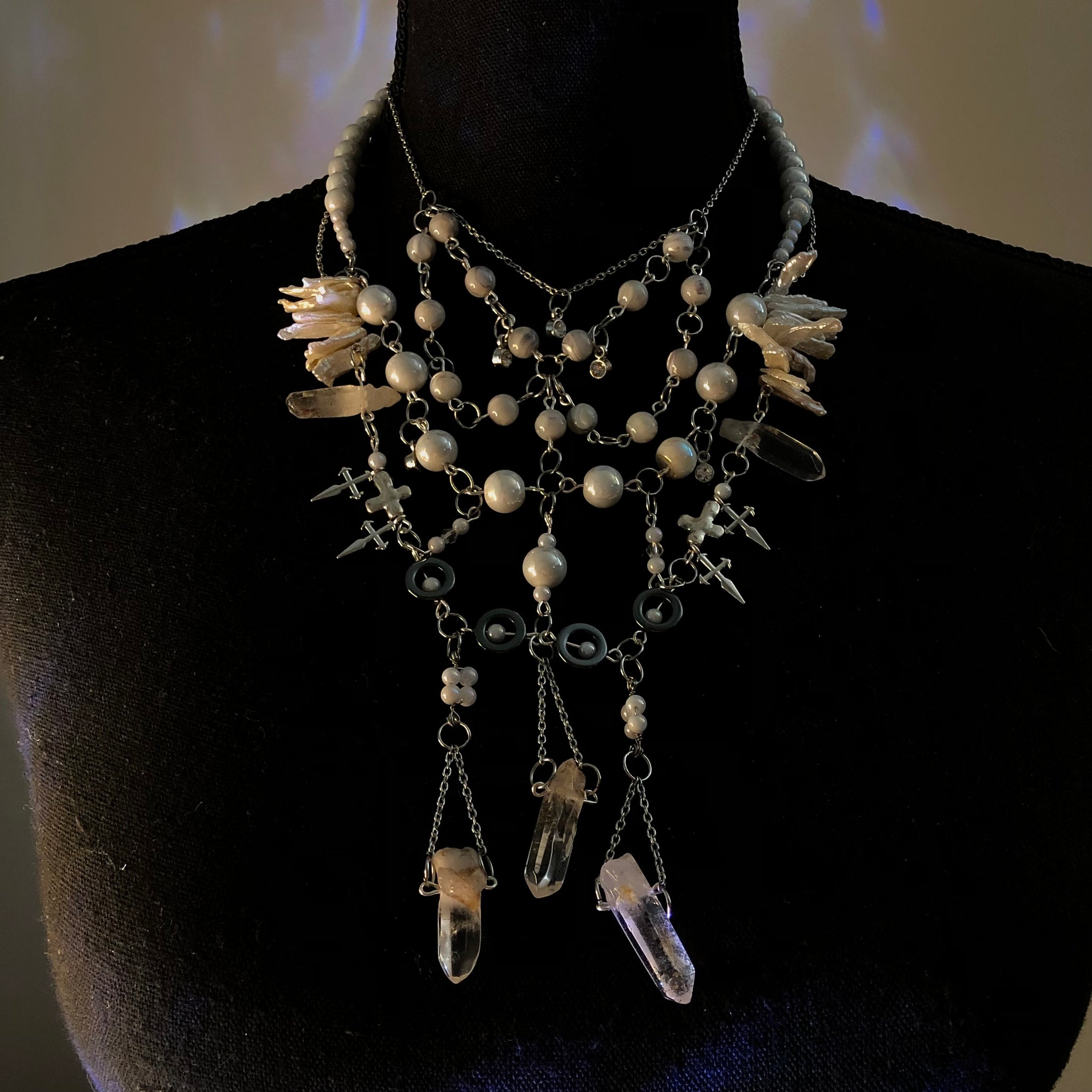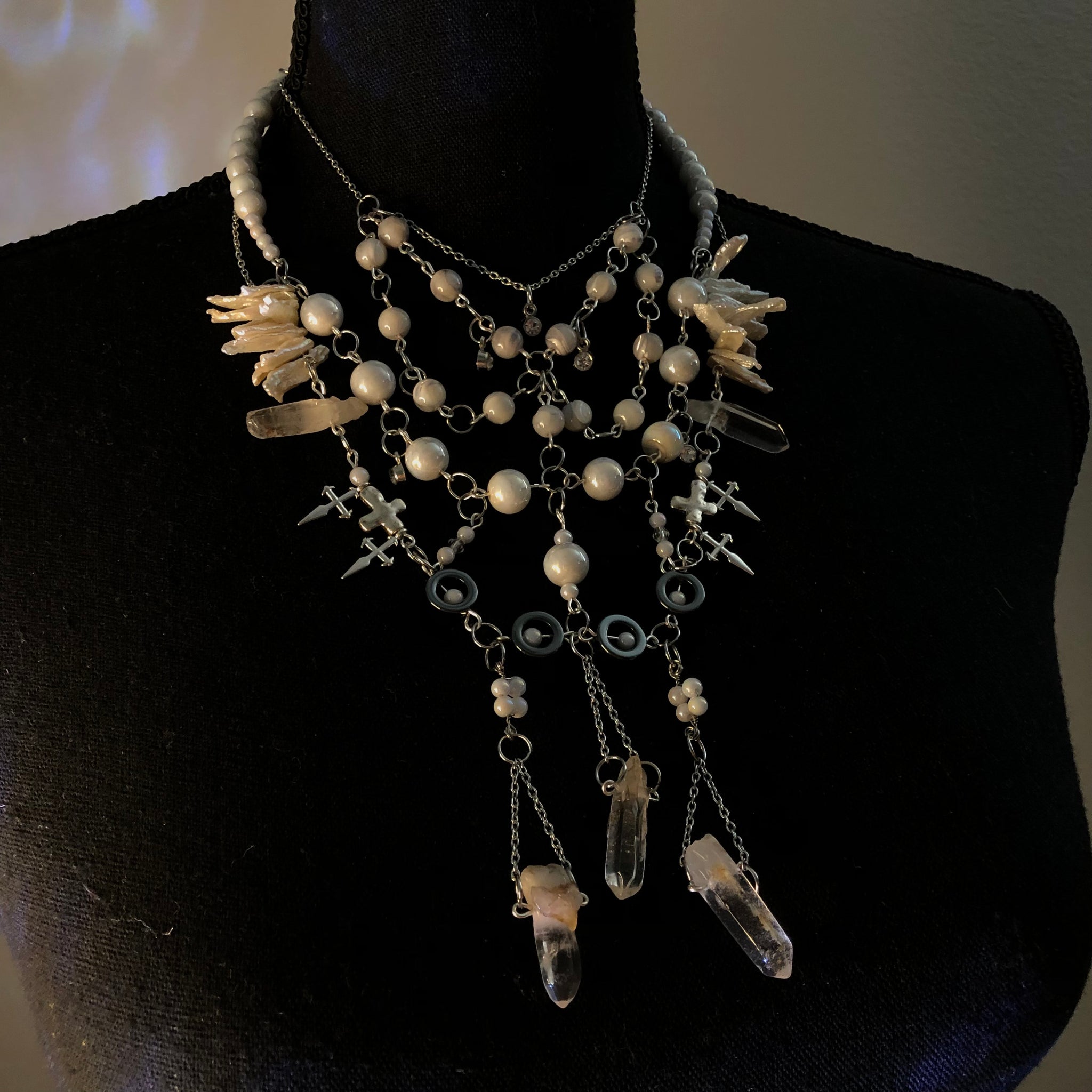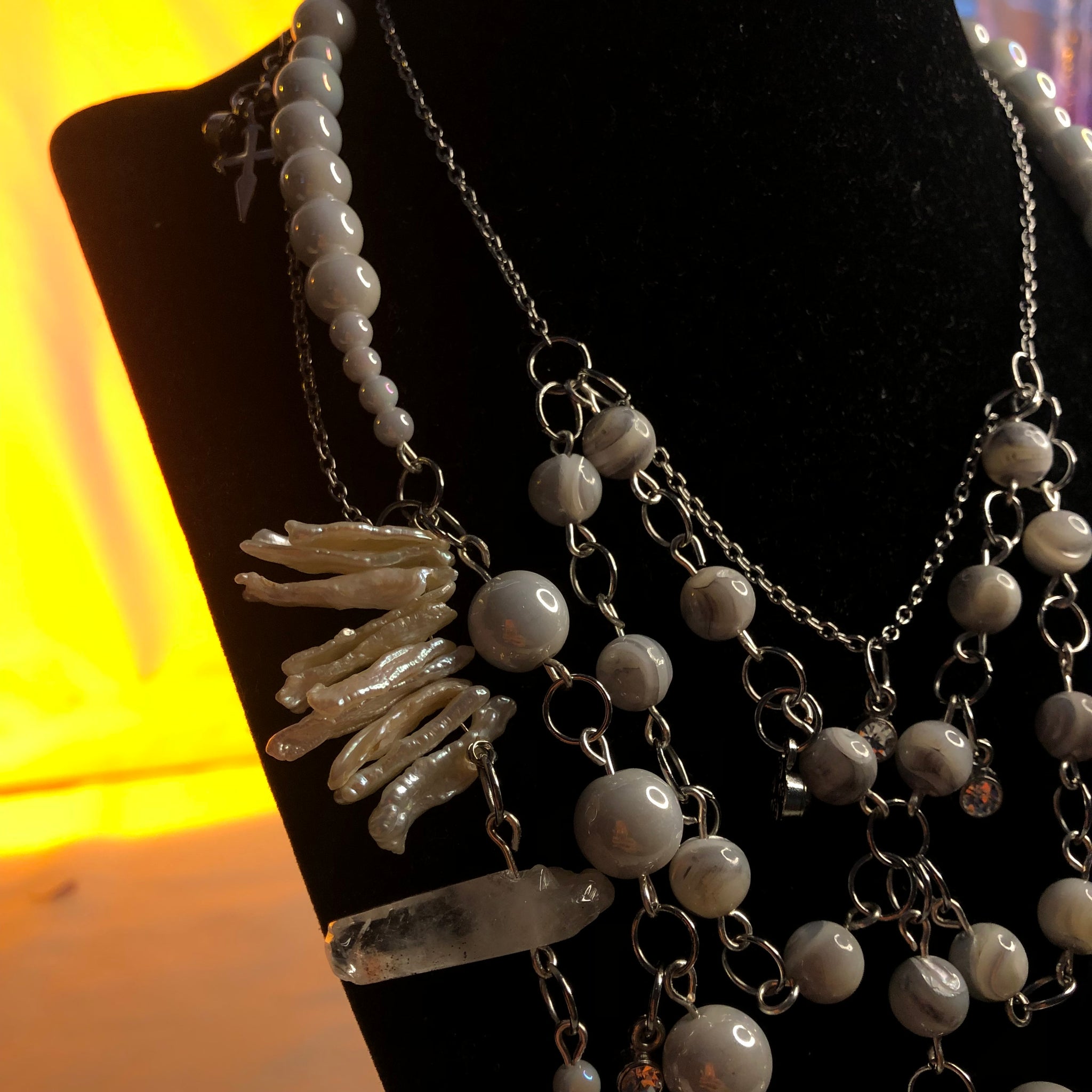 Stainless Steel chain made with Marble Pearls, White Mother of Pearls, Amphibole Angel Phantom Quartz, White Biwa Pearls, Metal crosses and swords.