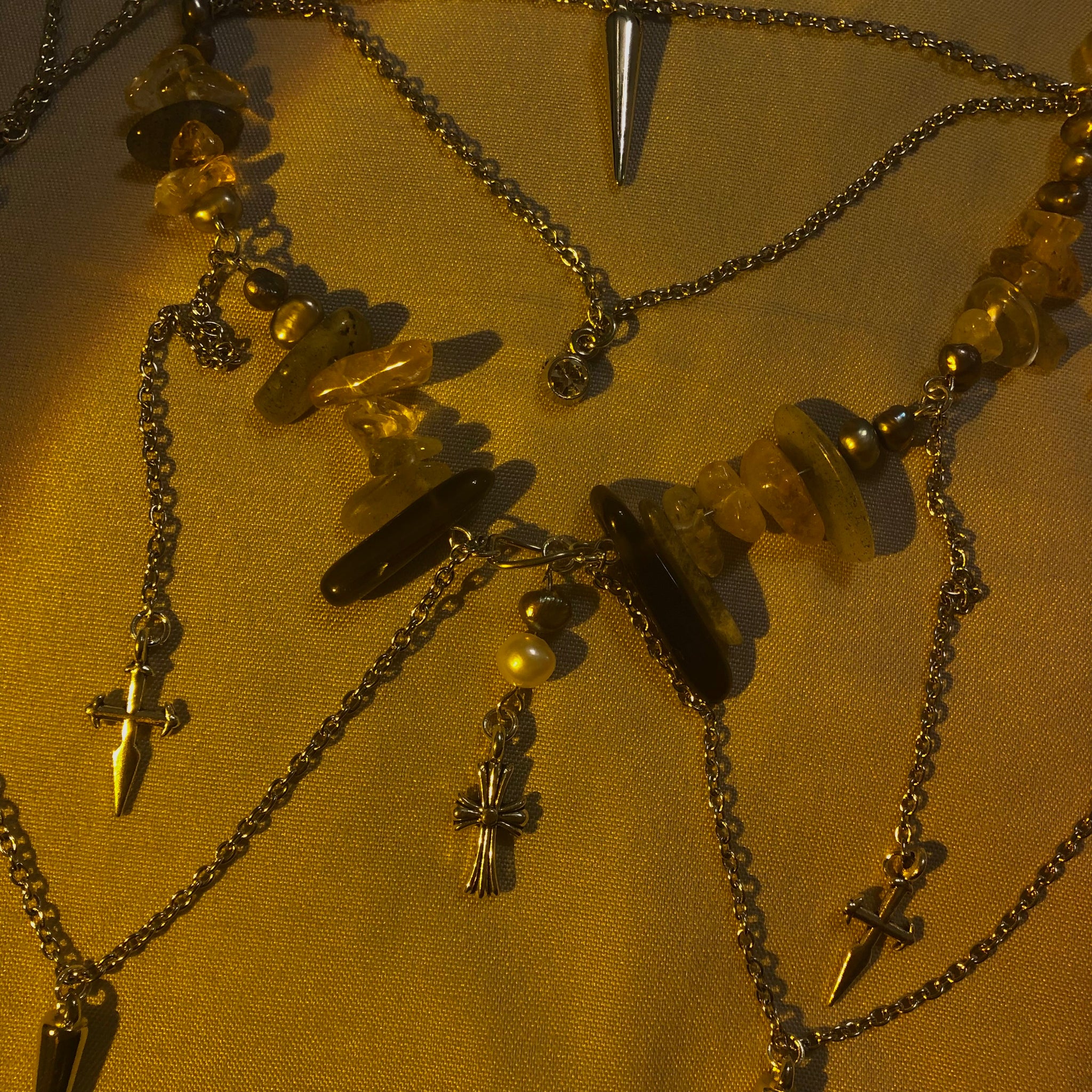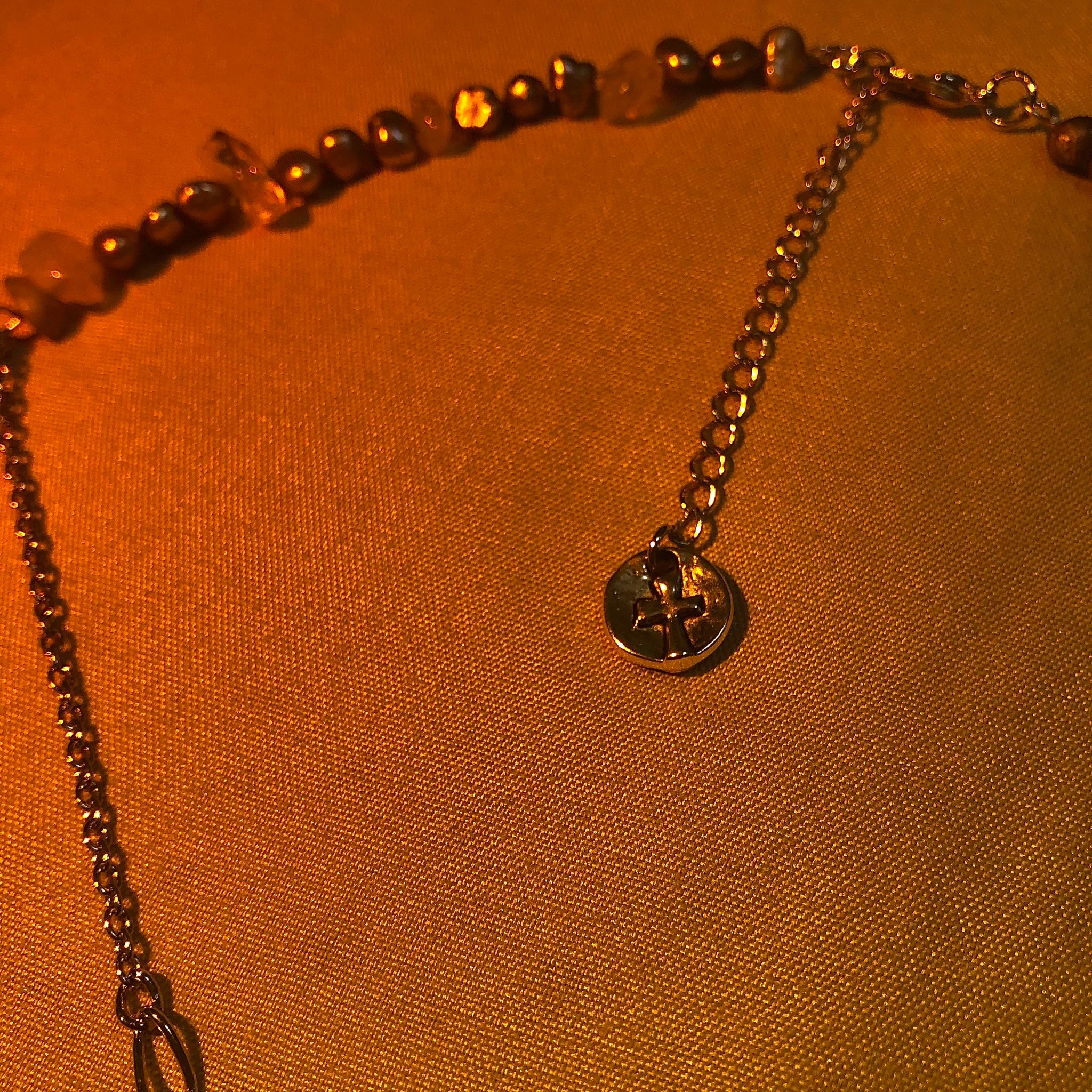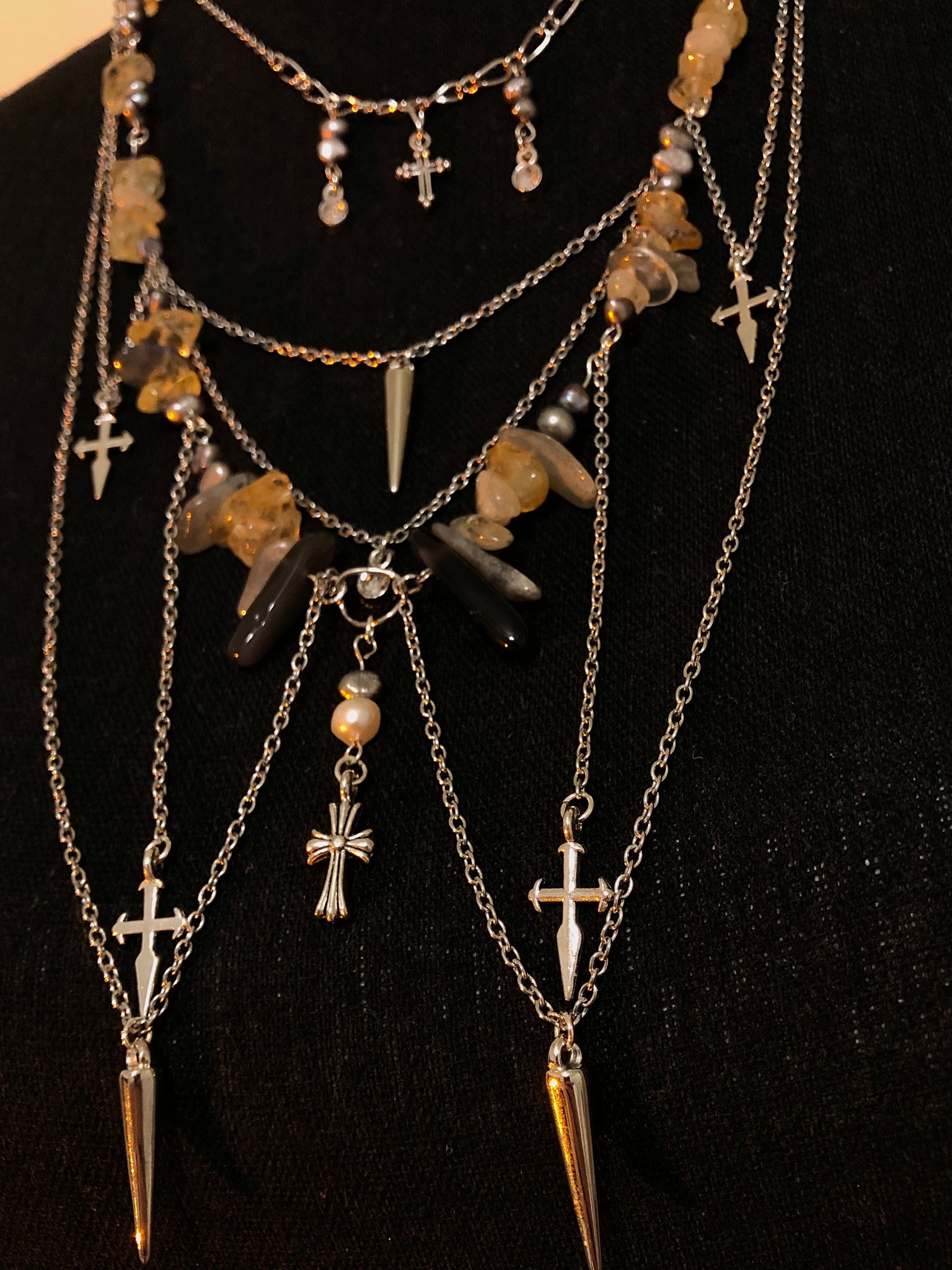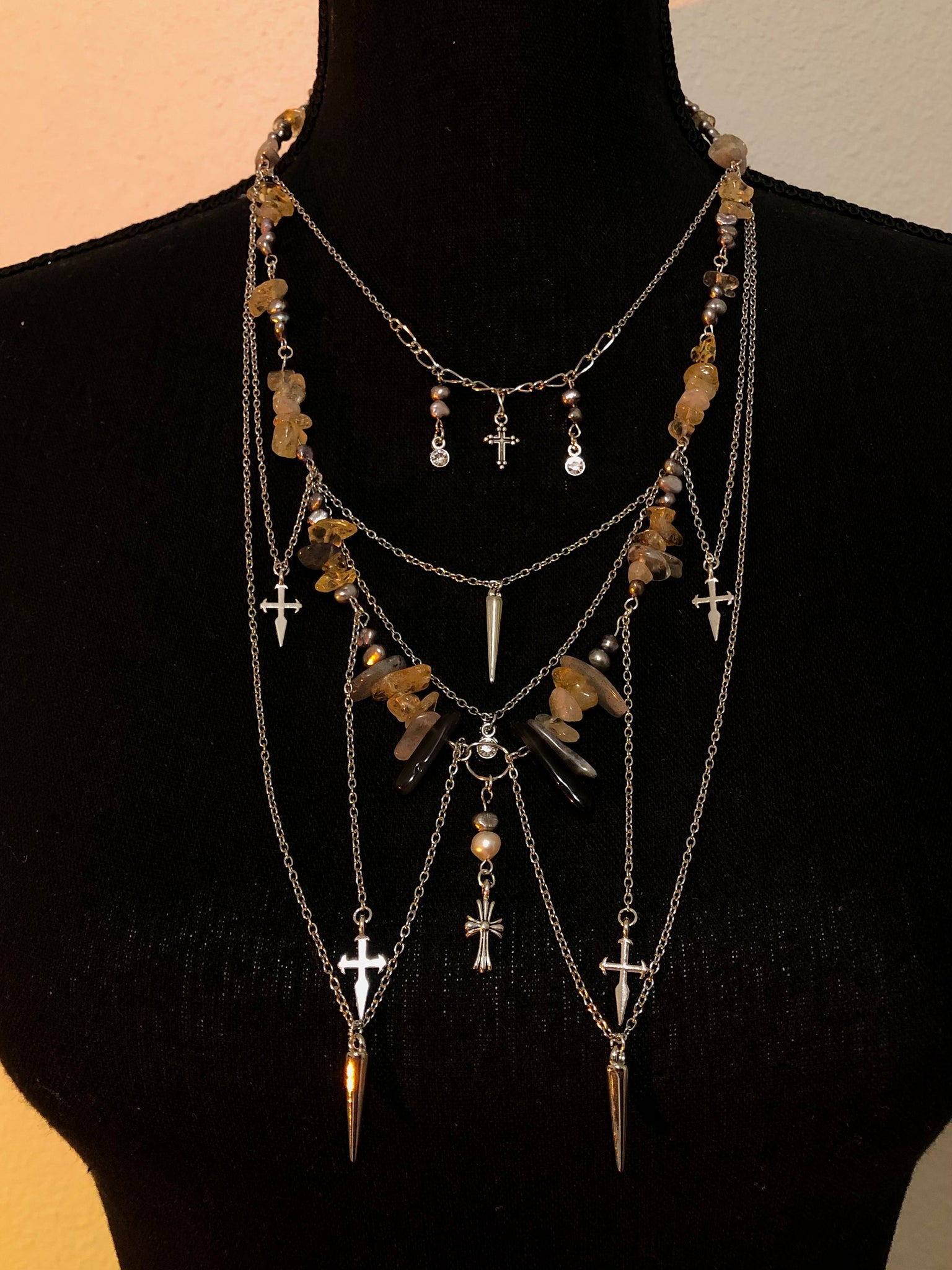 Crystals: Labradorite, Citrine, Gold R. Quartz, Black Obsidian, White and Grey water Pearls.