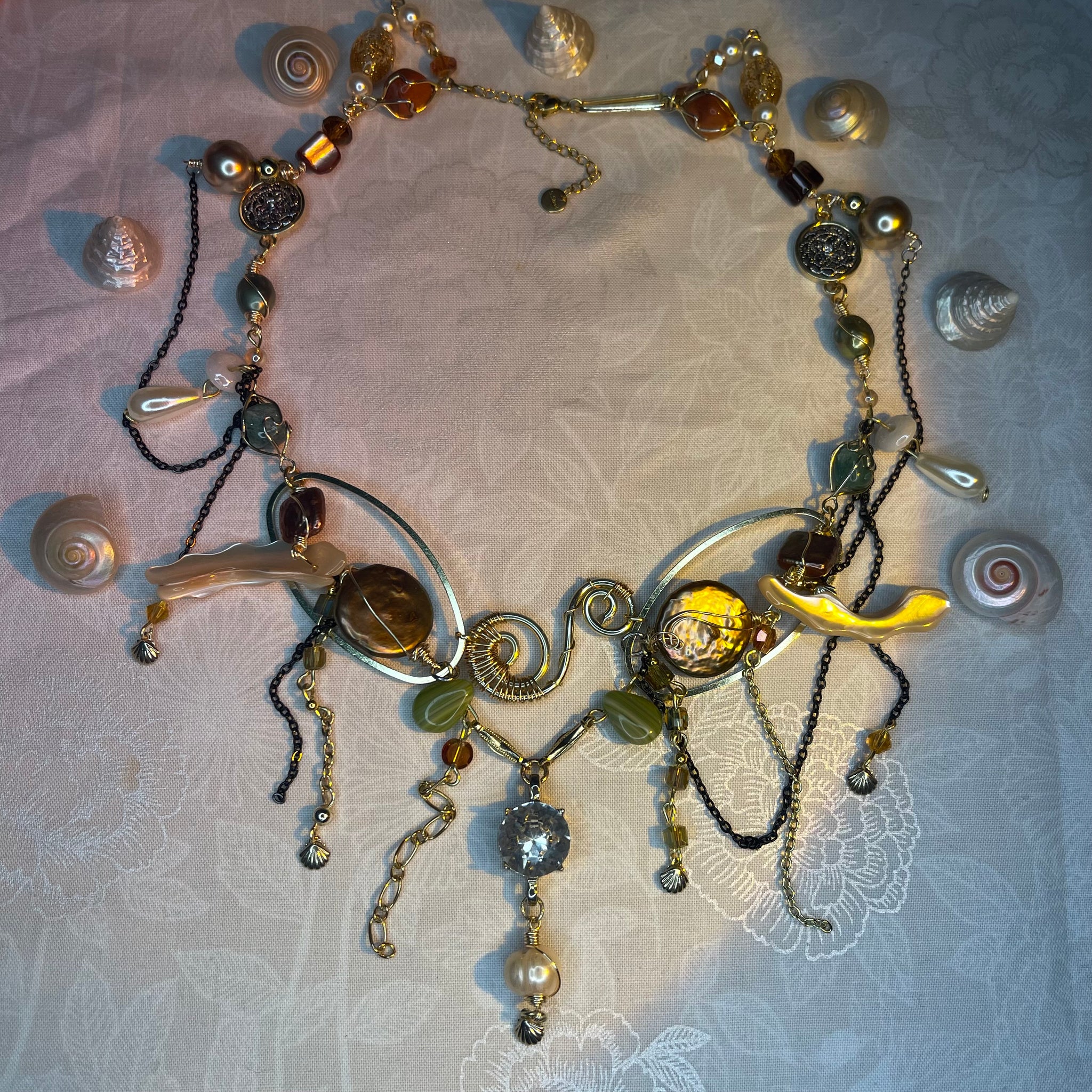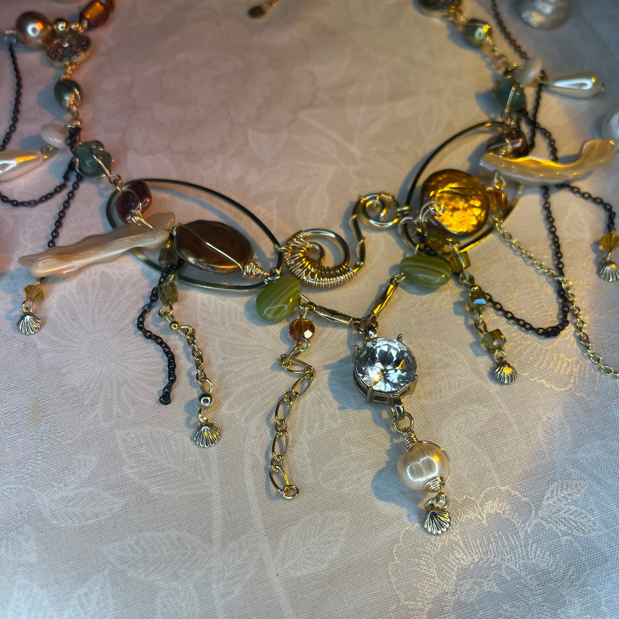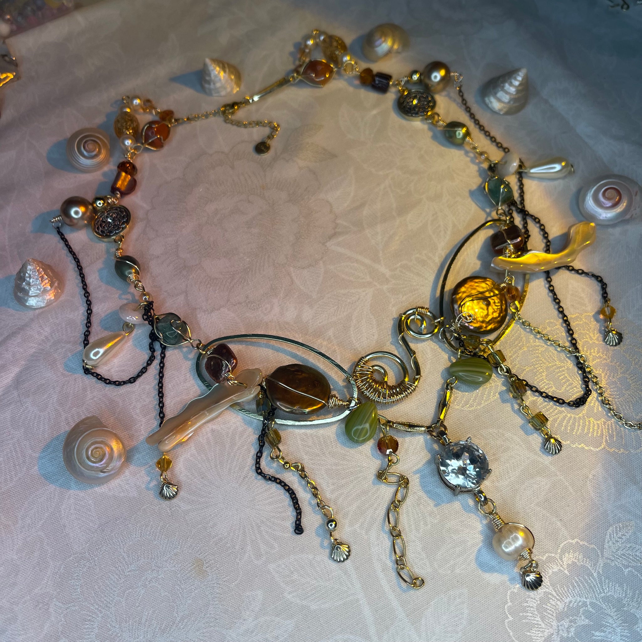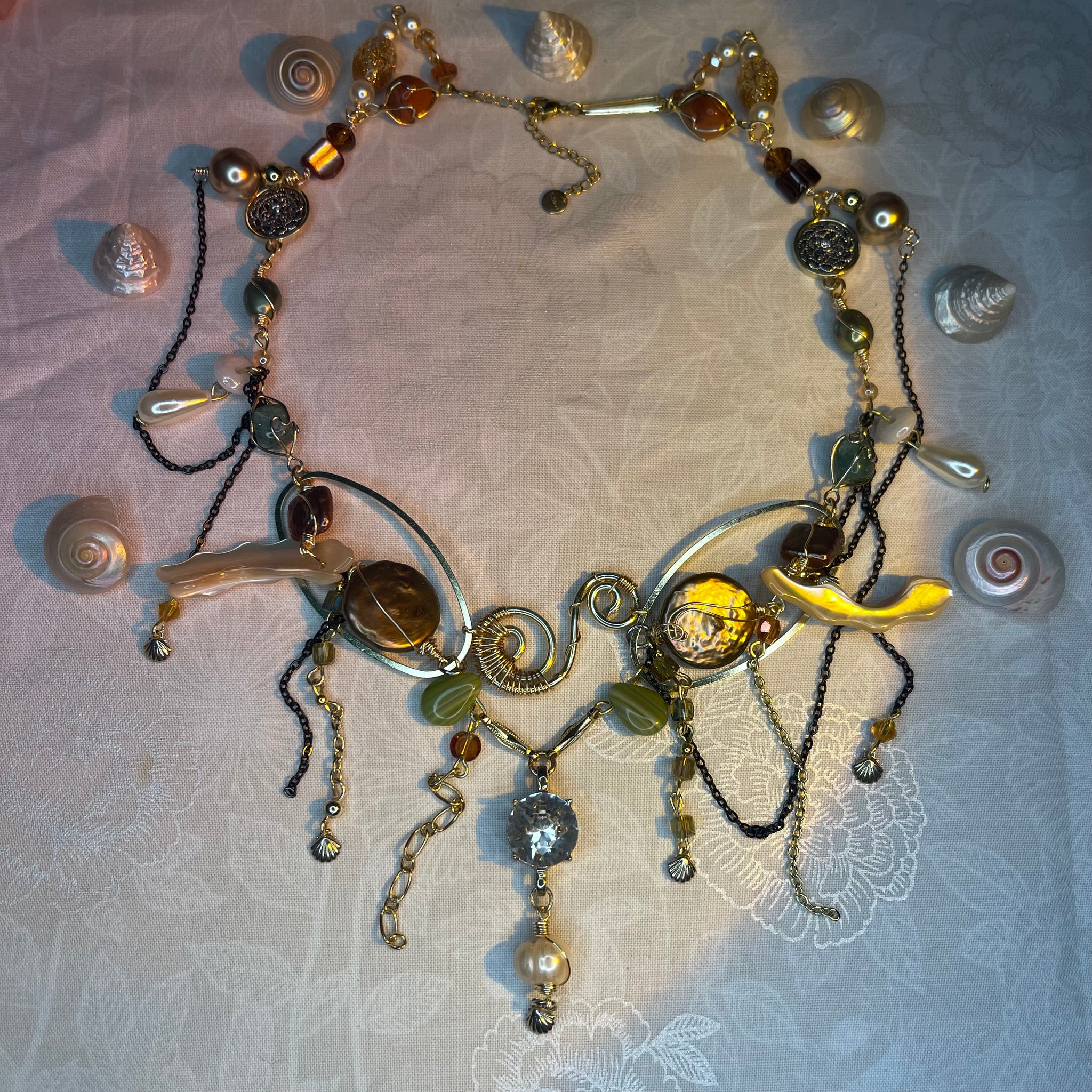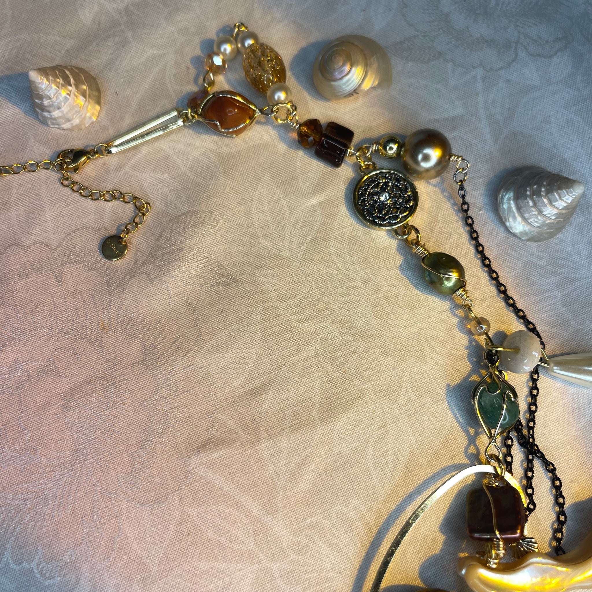 Made with: Diamond, Freshwater pearls, Jasper, Citrine, Glass, Shells, mother of pearls, Stainless steel and aventurine.