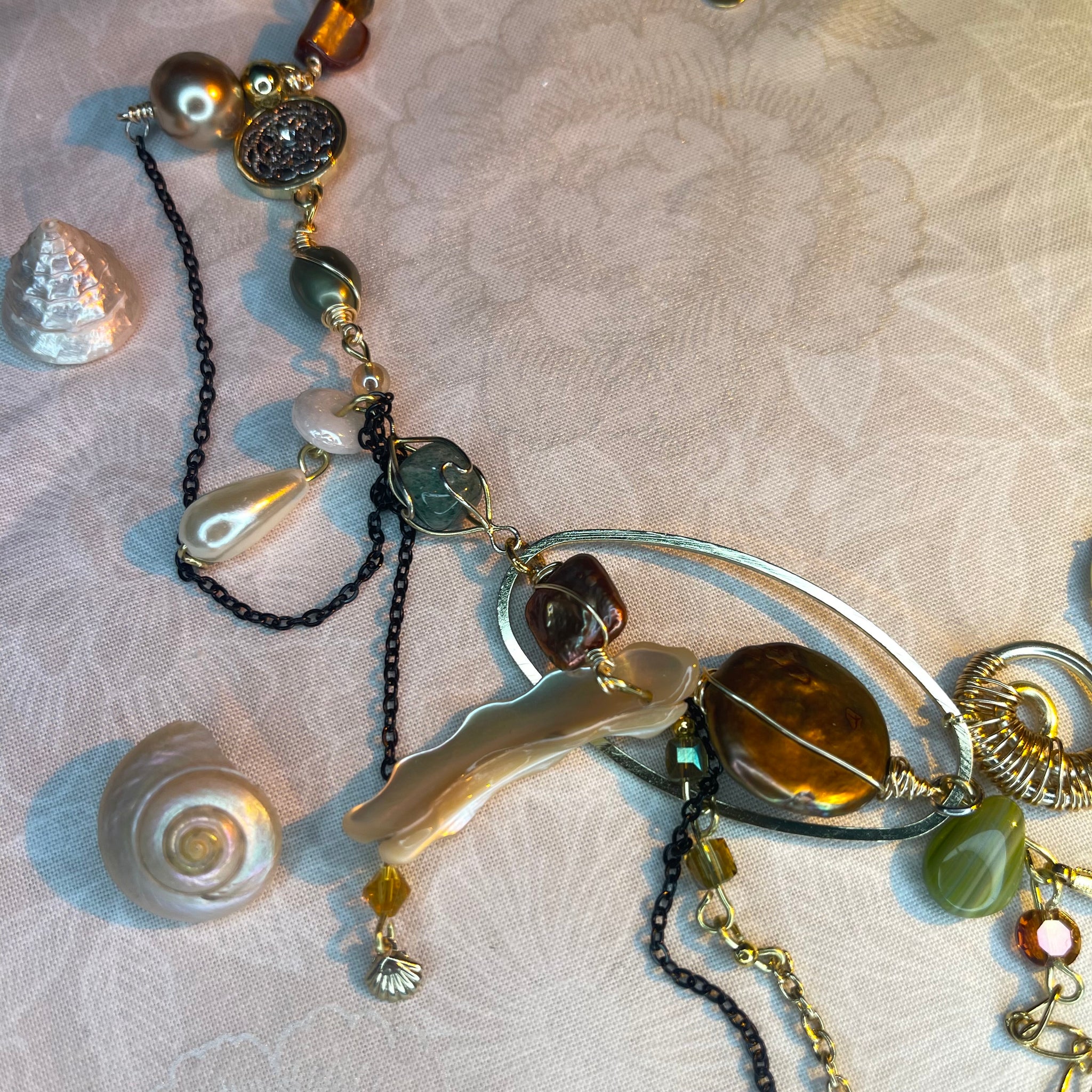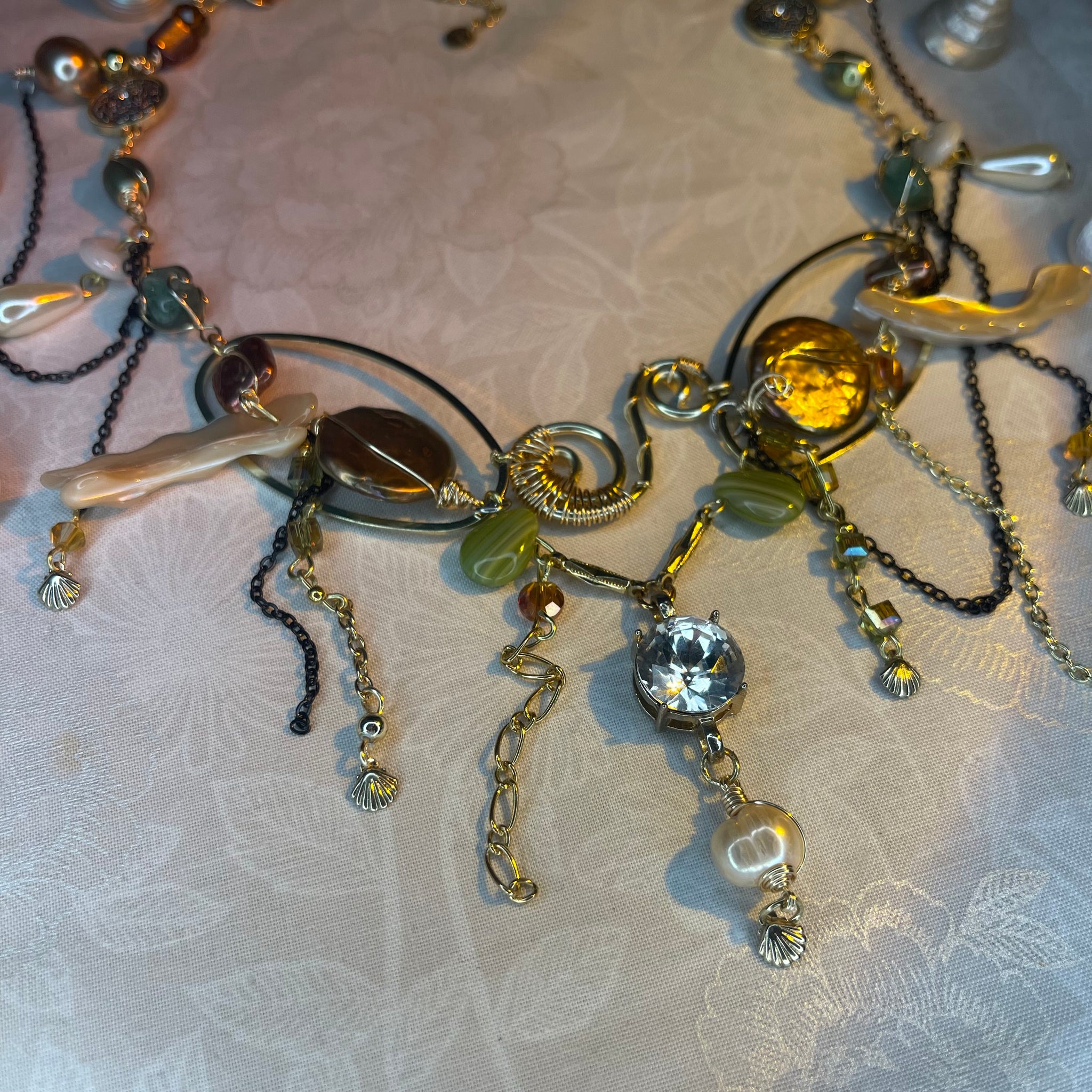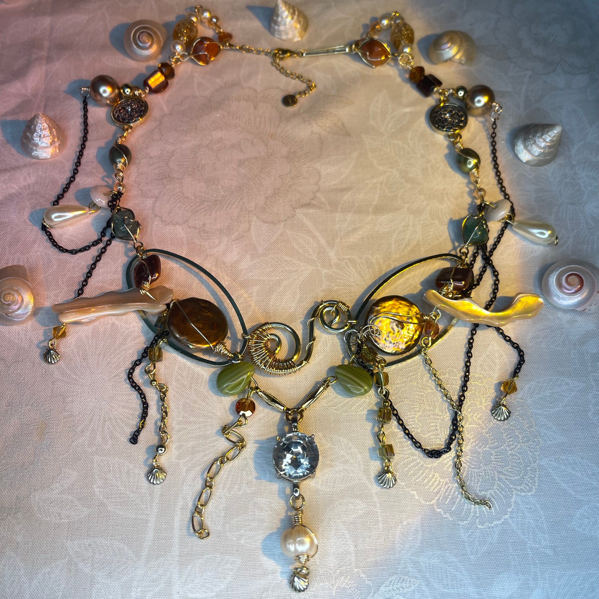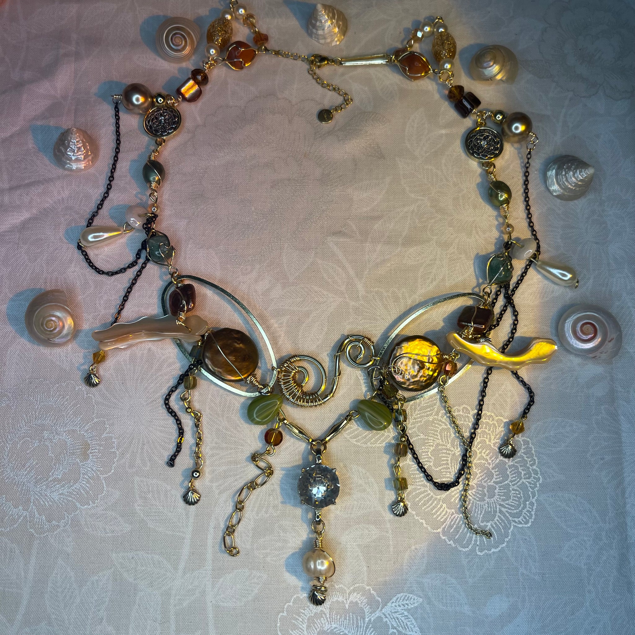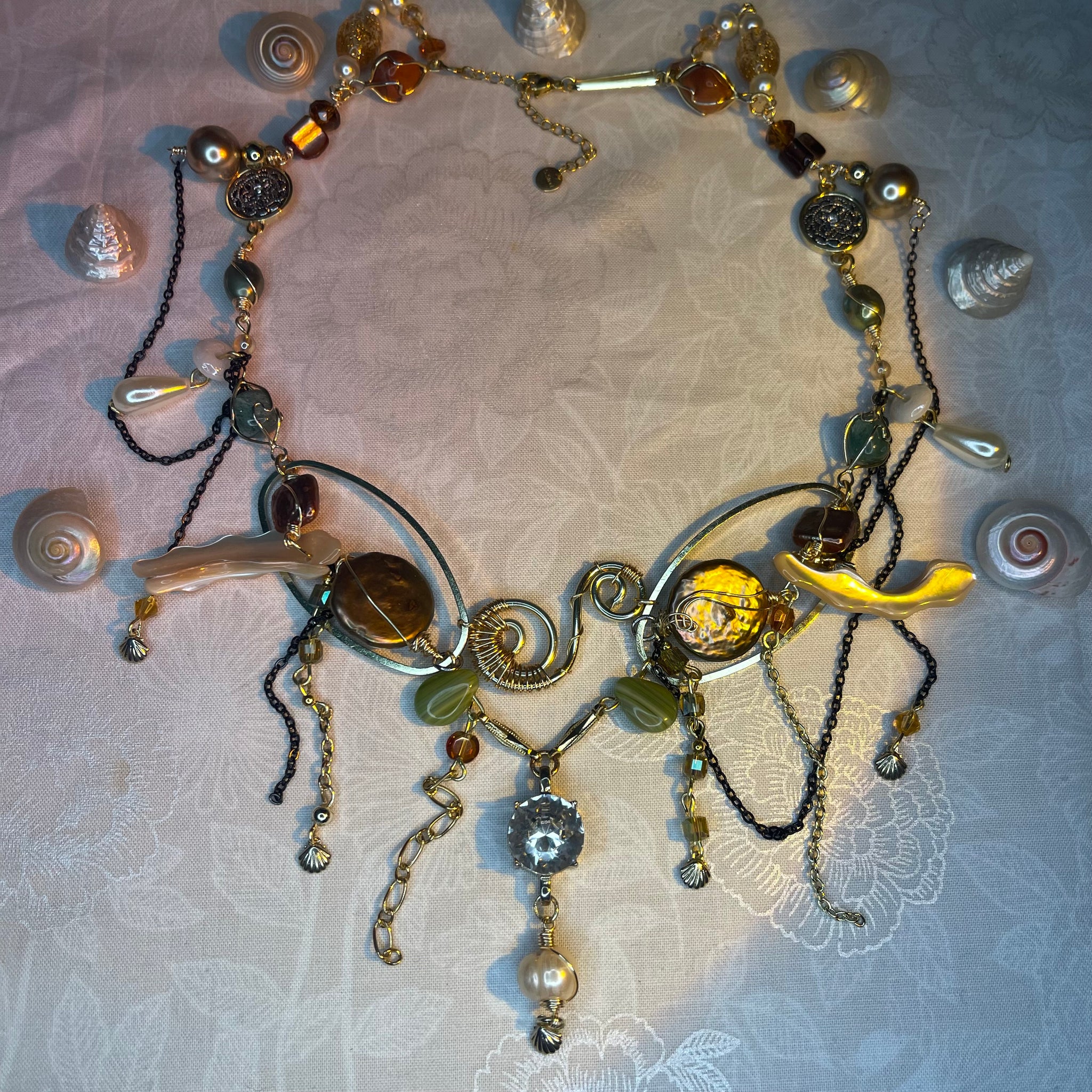 Made with: Diamond, Freshwater pearls, Jasper, Citrine, Glass, Shells, mother of pearls, Stainless steel and aventurine.