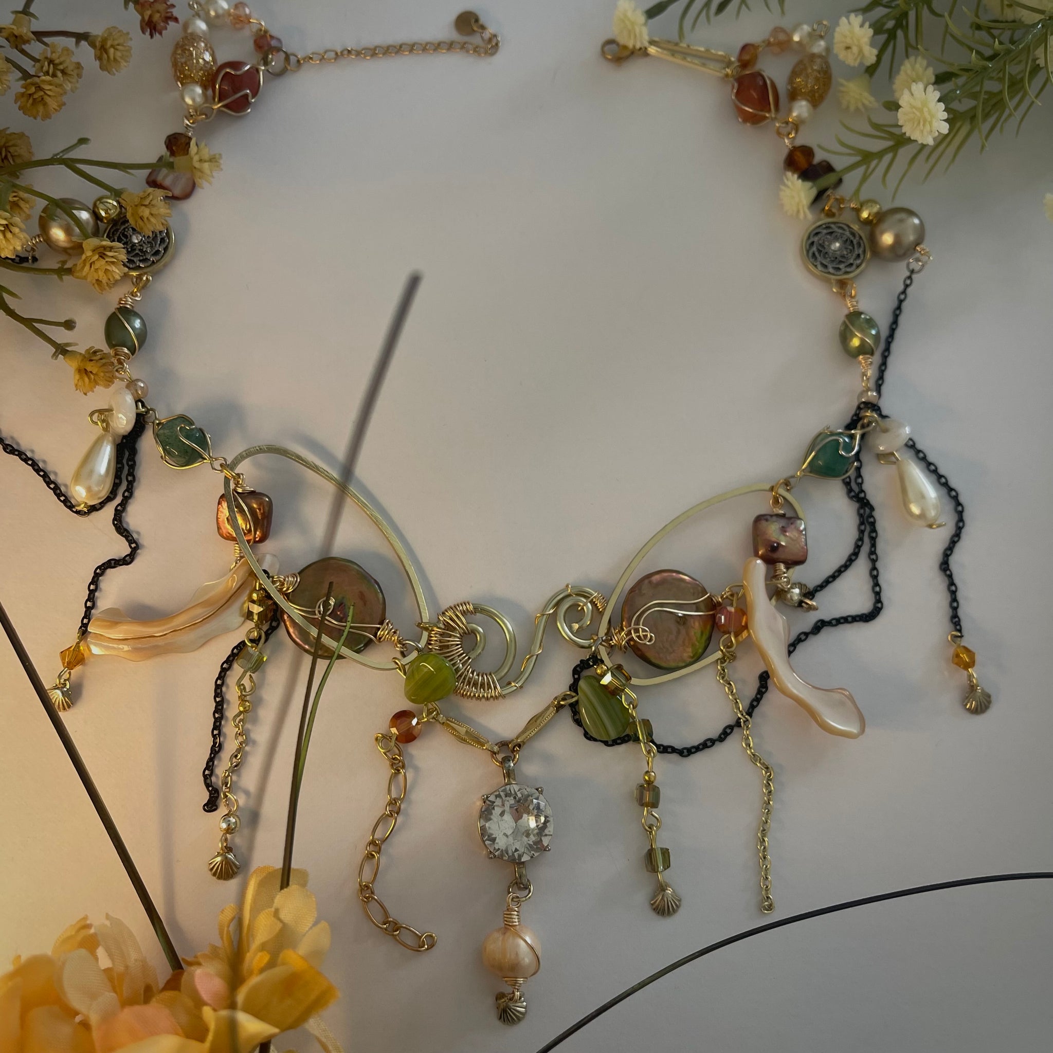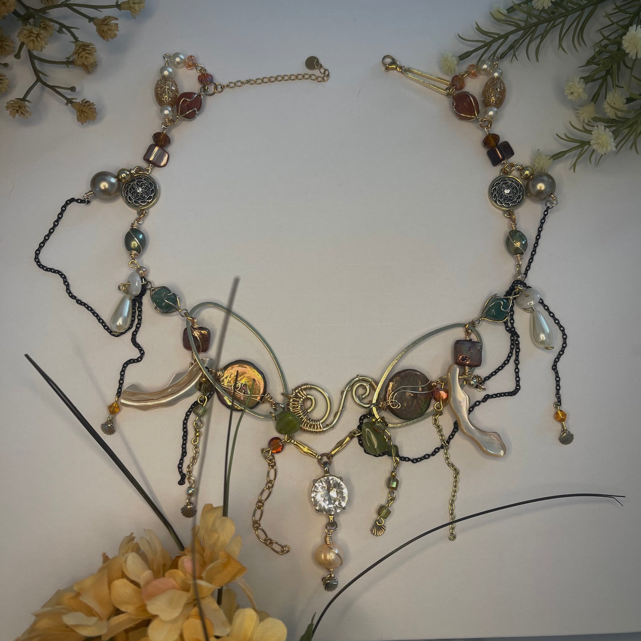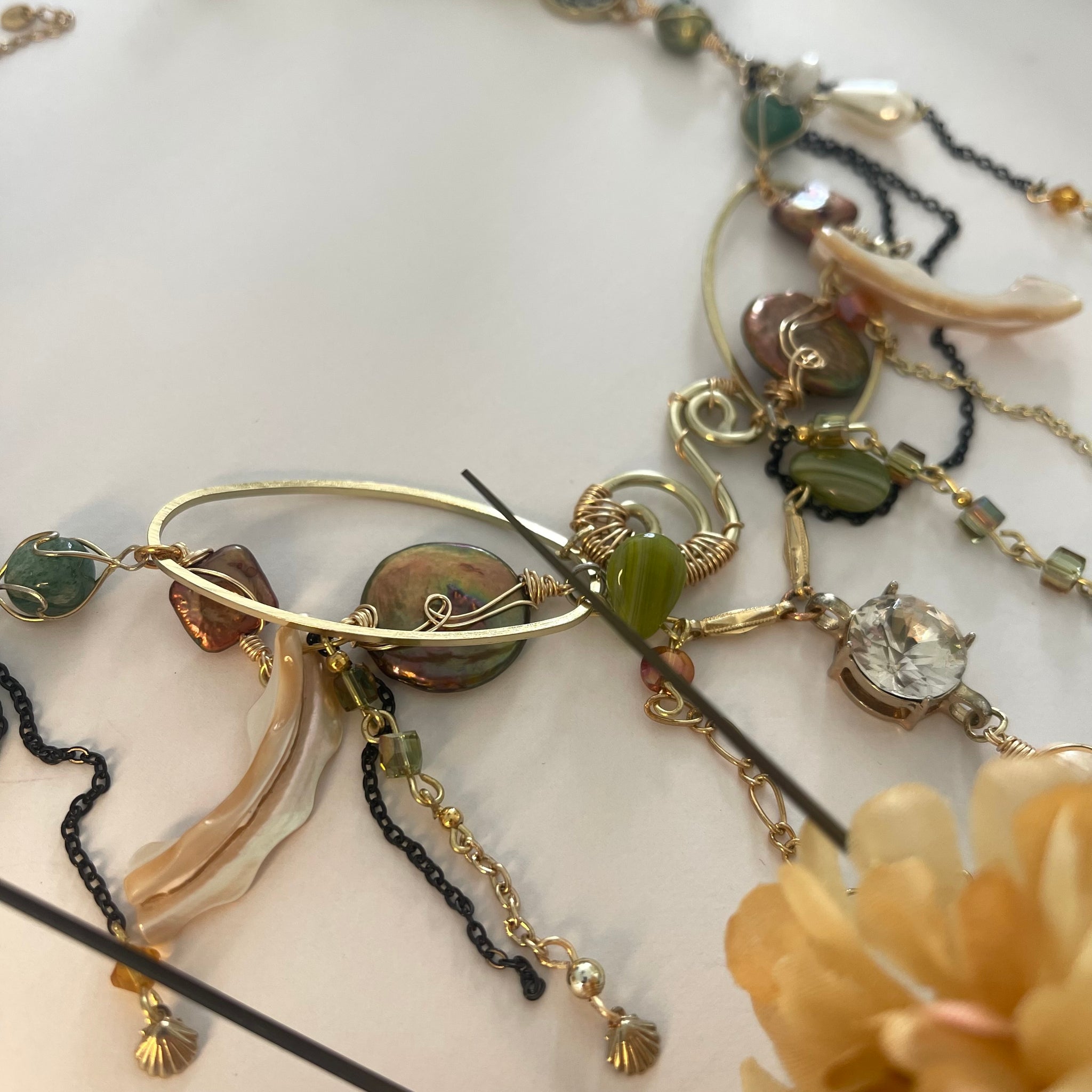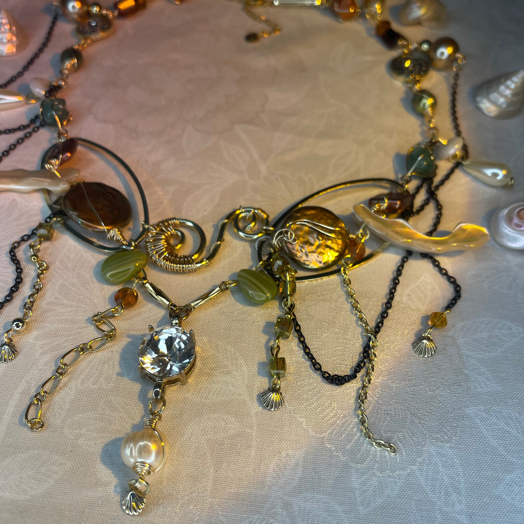 Made with: Diamond, Freshwater pearls, Jasper, Citrine, Glass, Shells, mother of pearls, Stainless steel and aventurine.