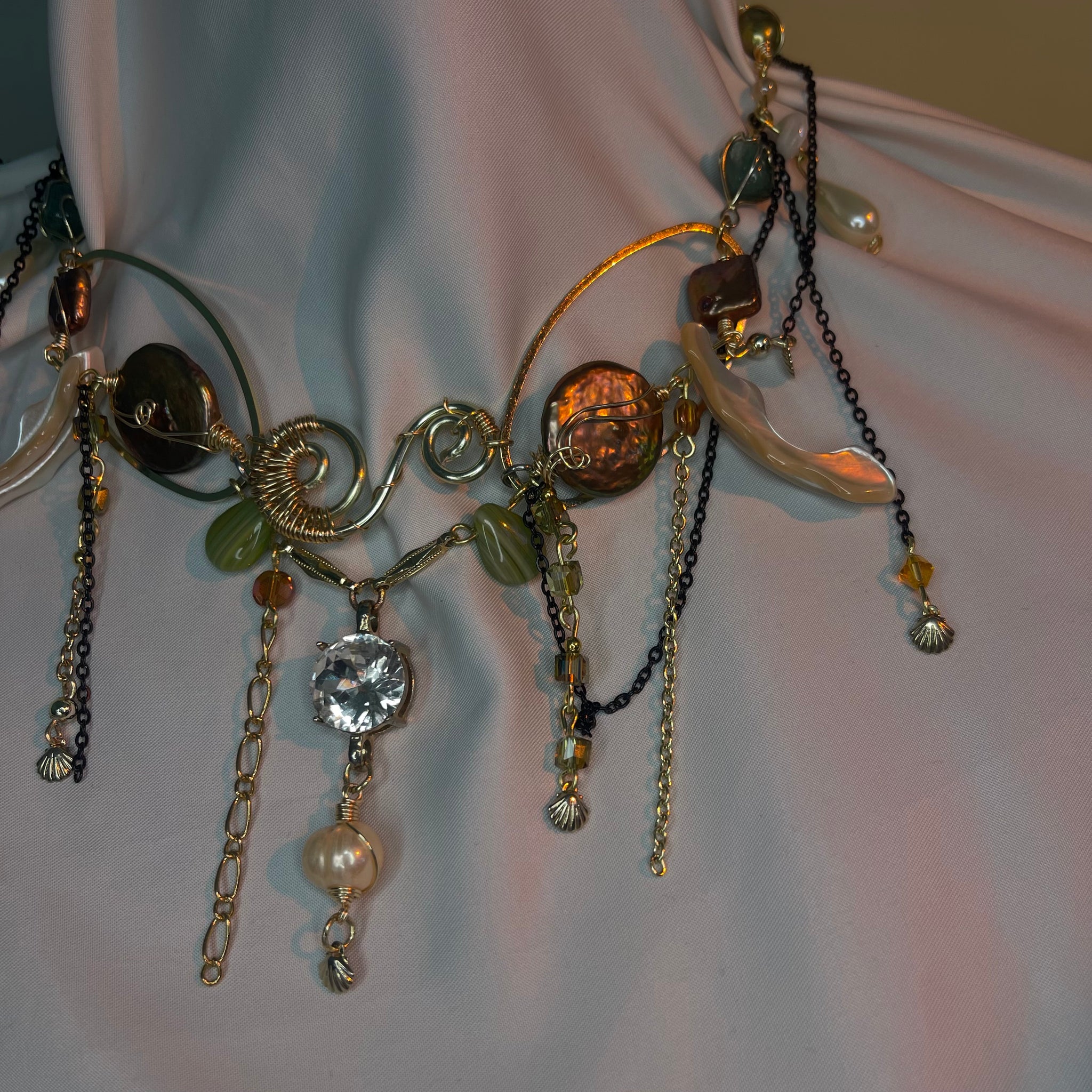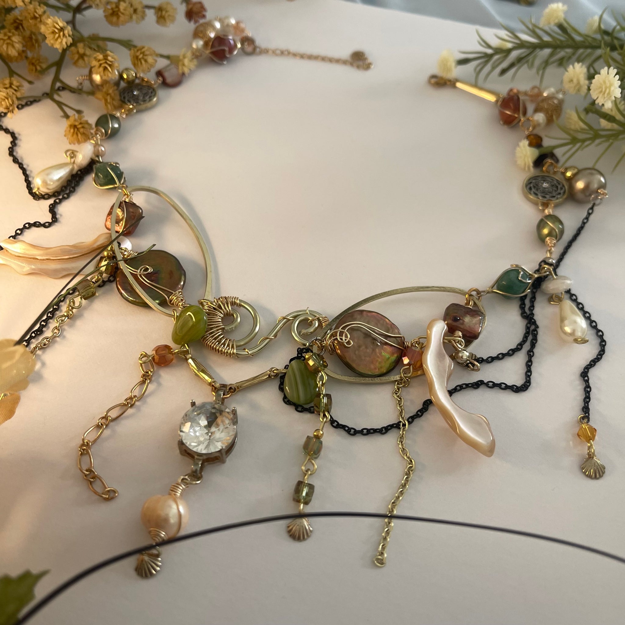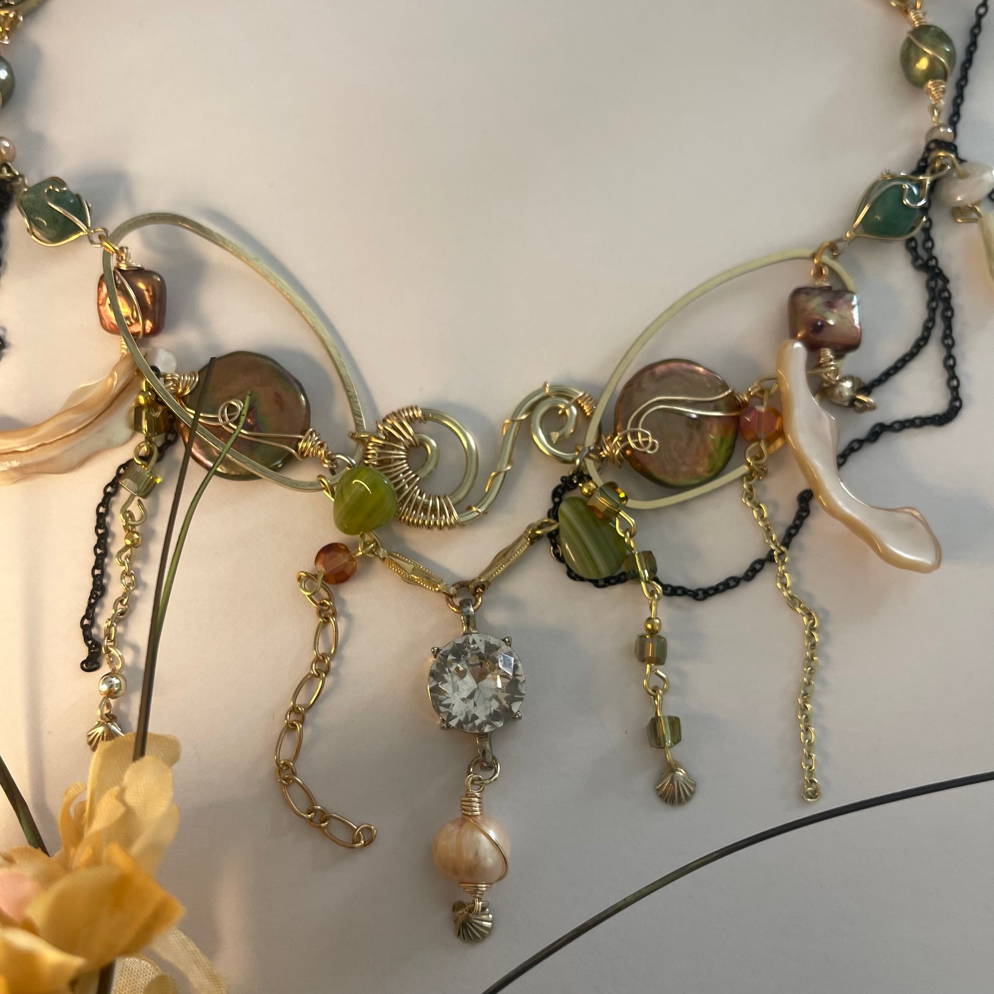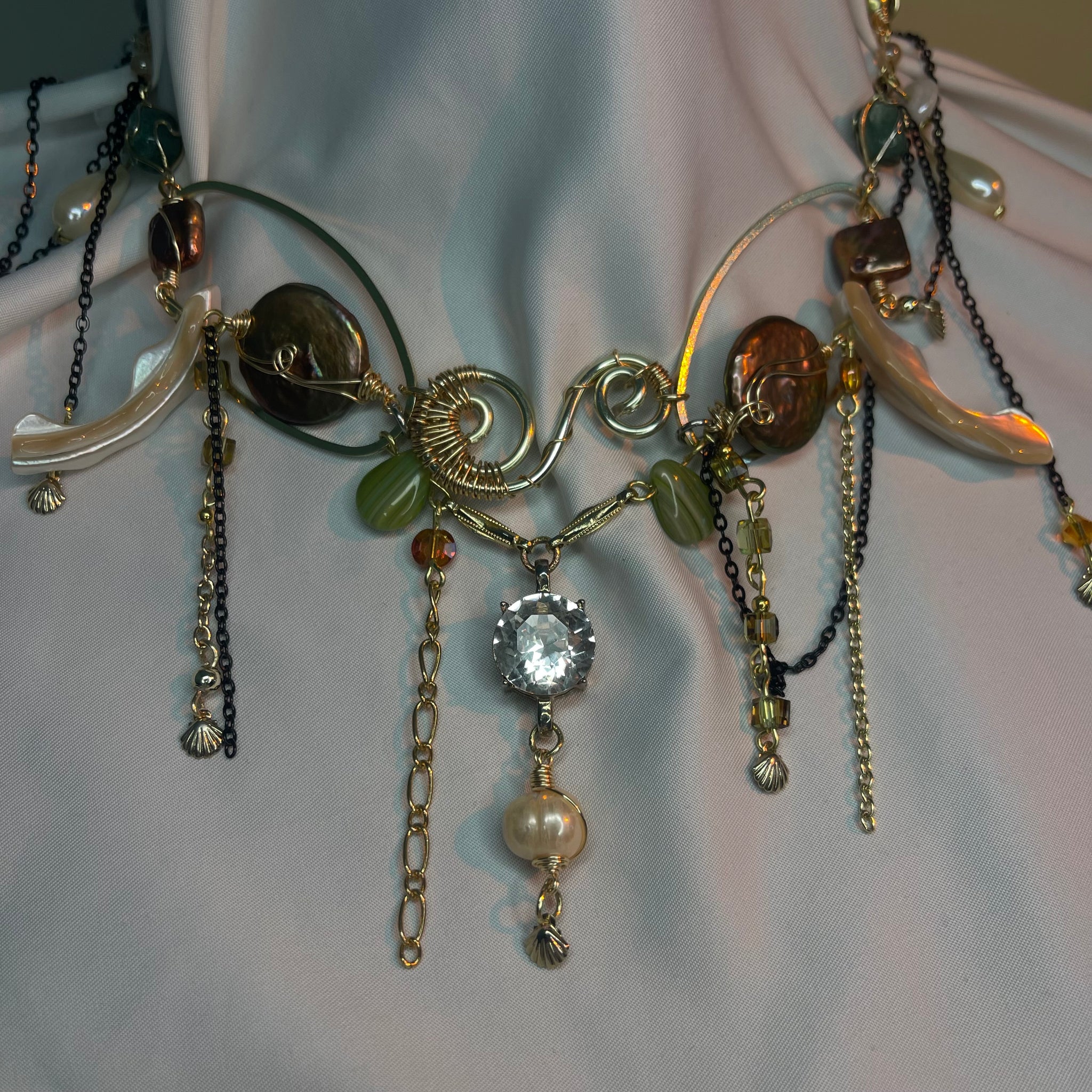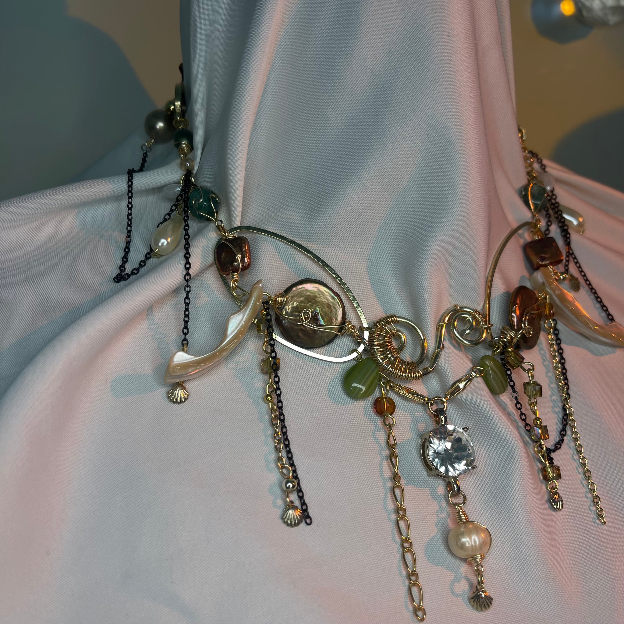 Made with: Diamond, Freshwater pearls, Jasper, Citrine, Glass, Shells, mother of pearls, Stainless steel and aventurine.