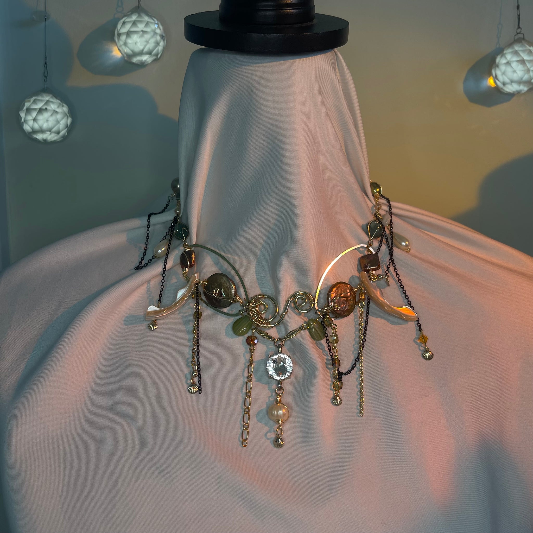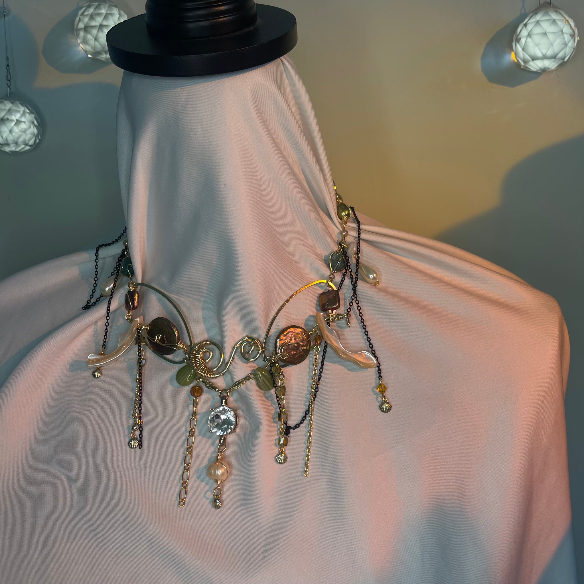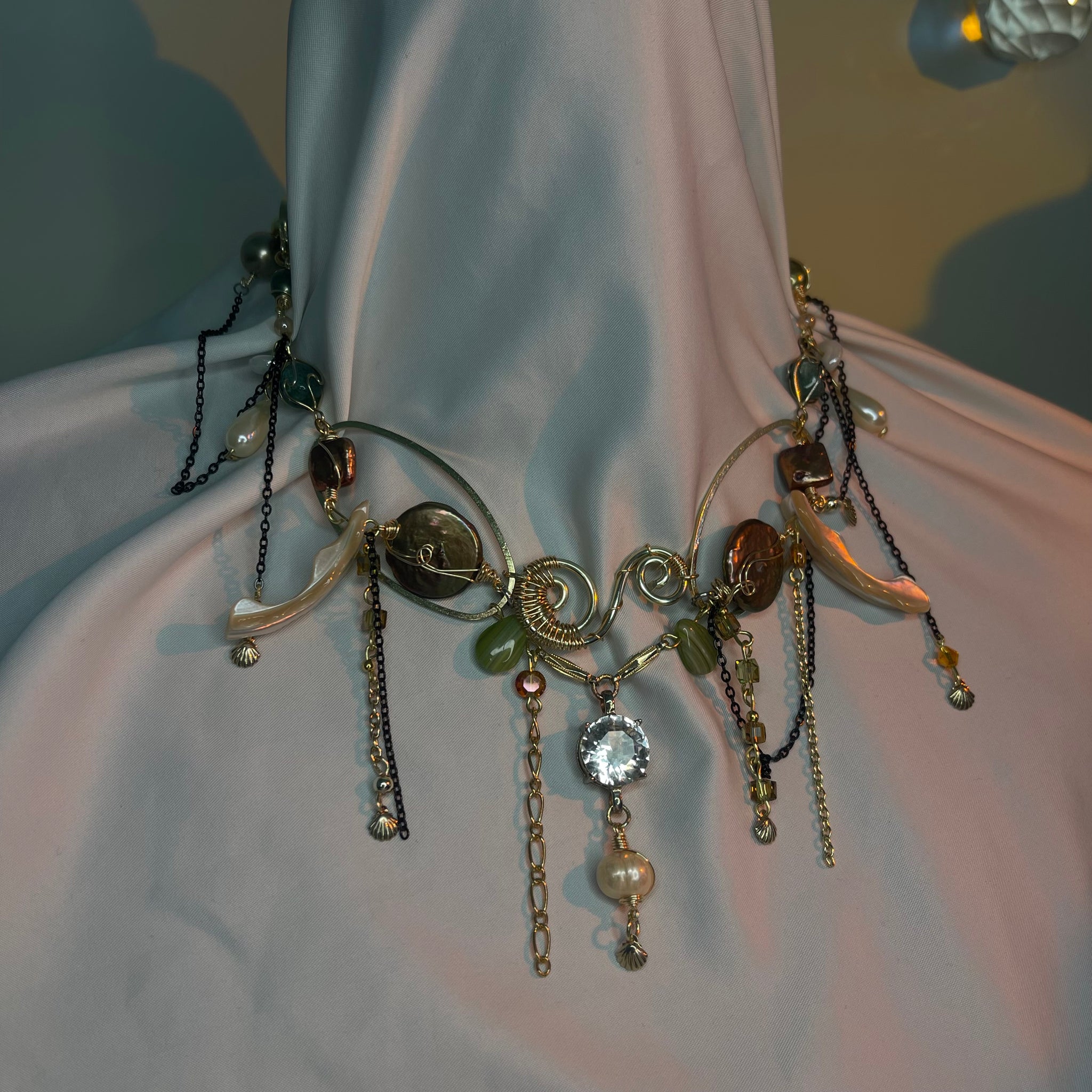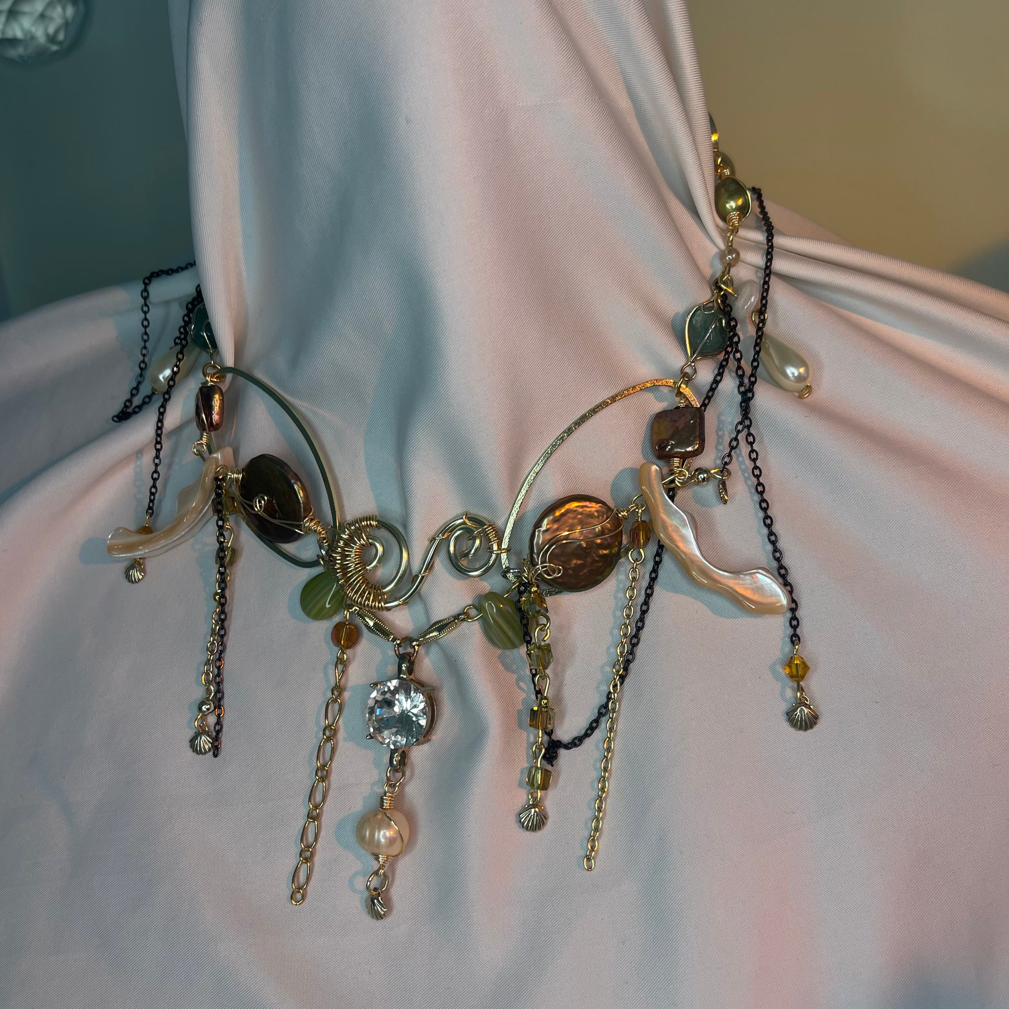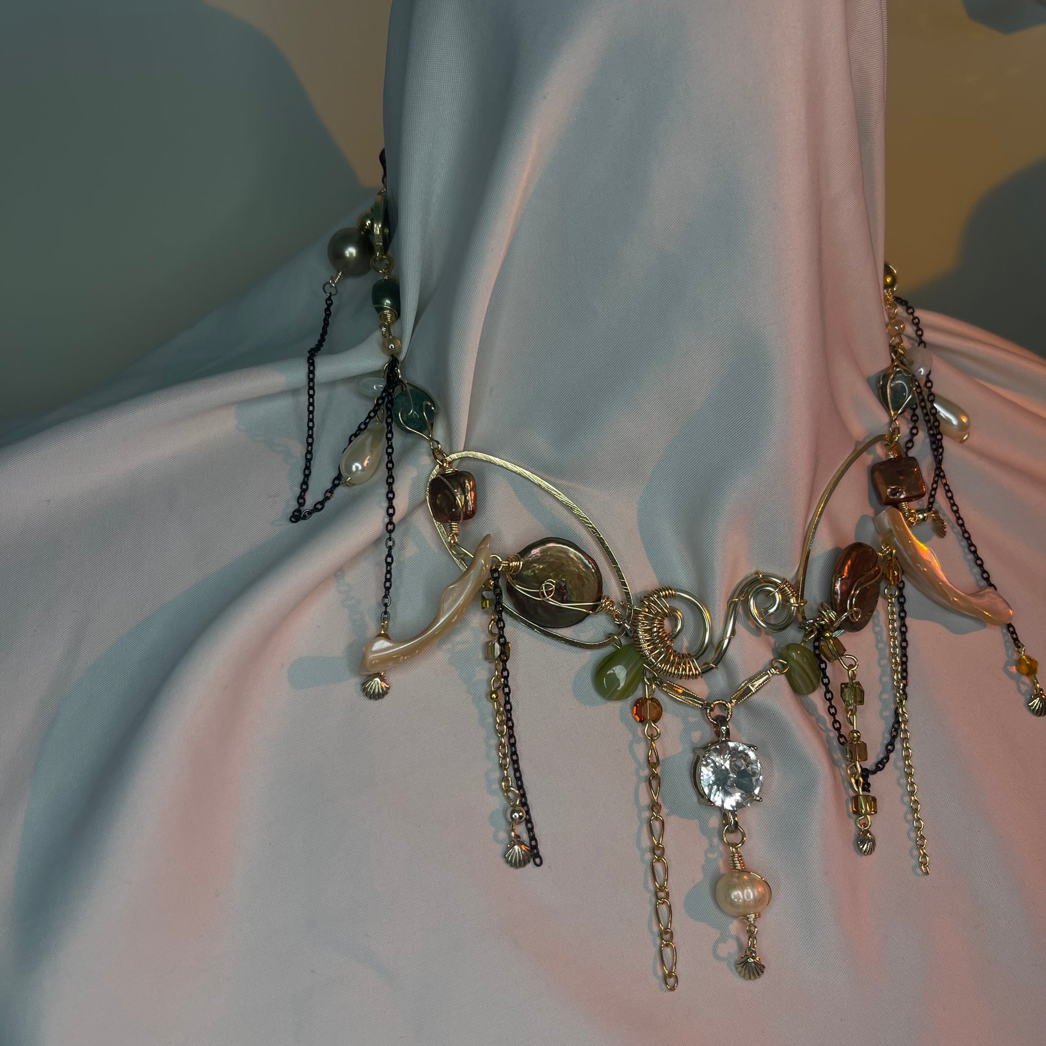 Made with: Diamond, Freshwater pearls, Jasper, Citrine, Glass, Shells, mother of pearls, Stainless steel and aventurine.