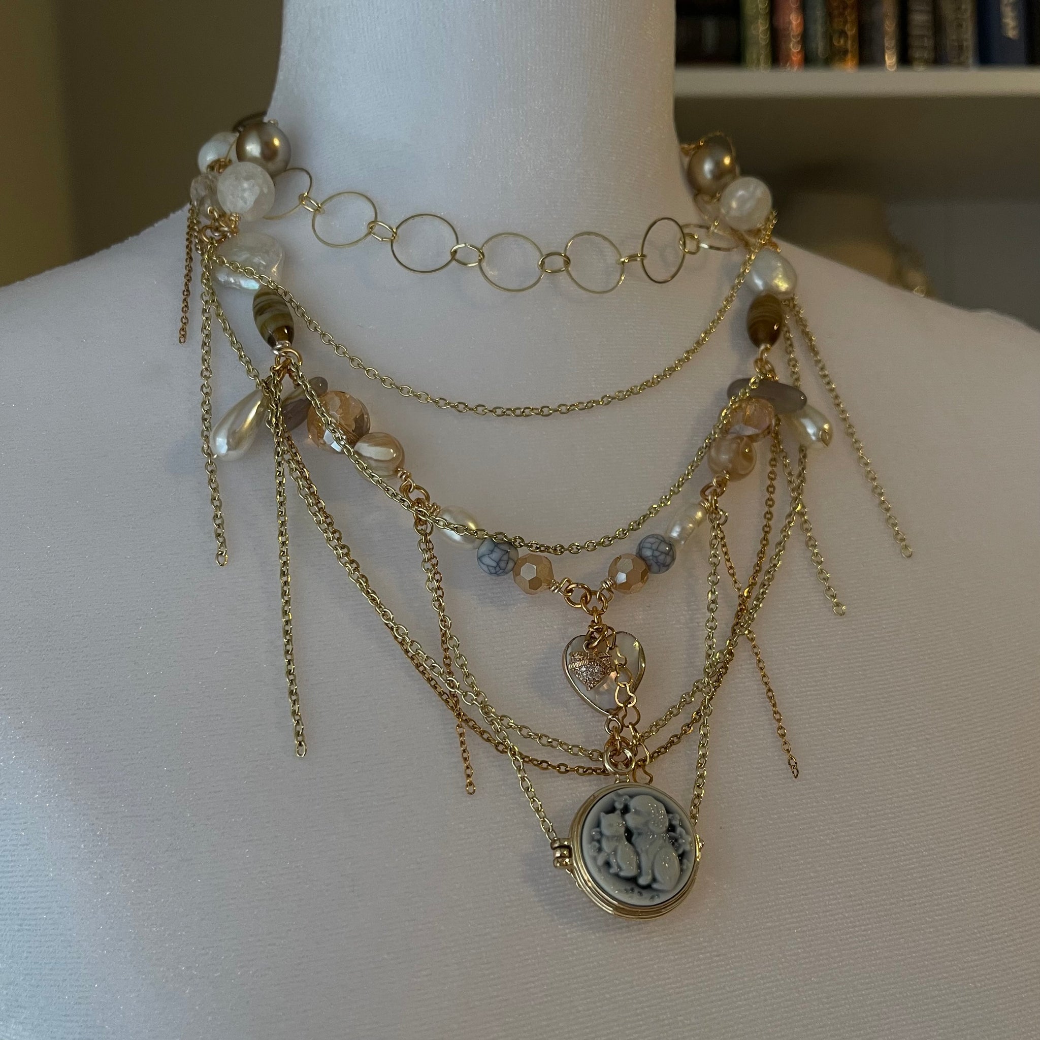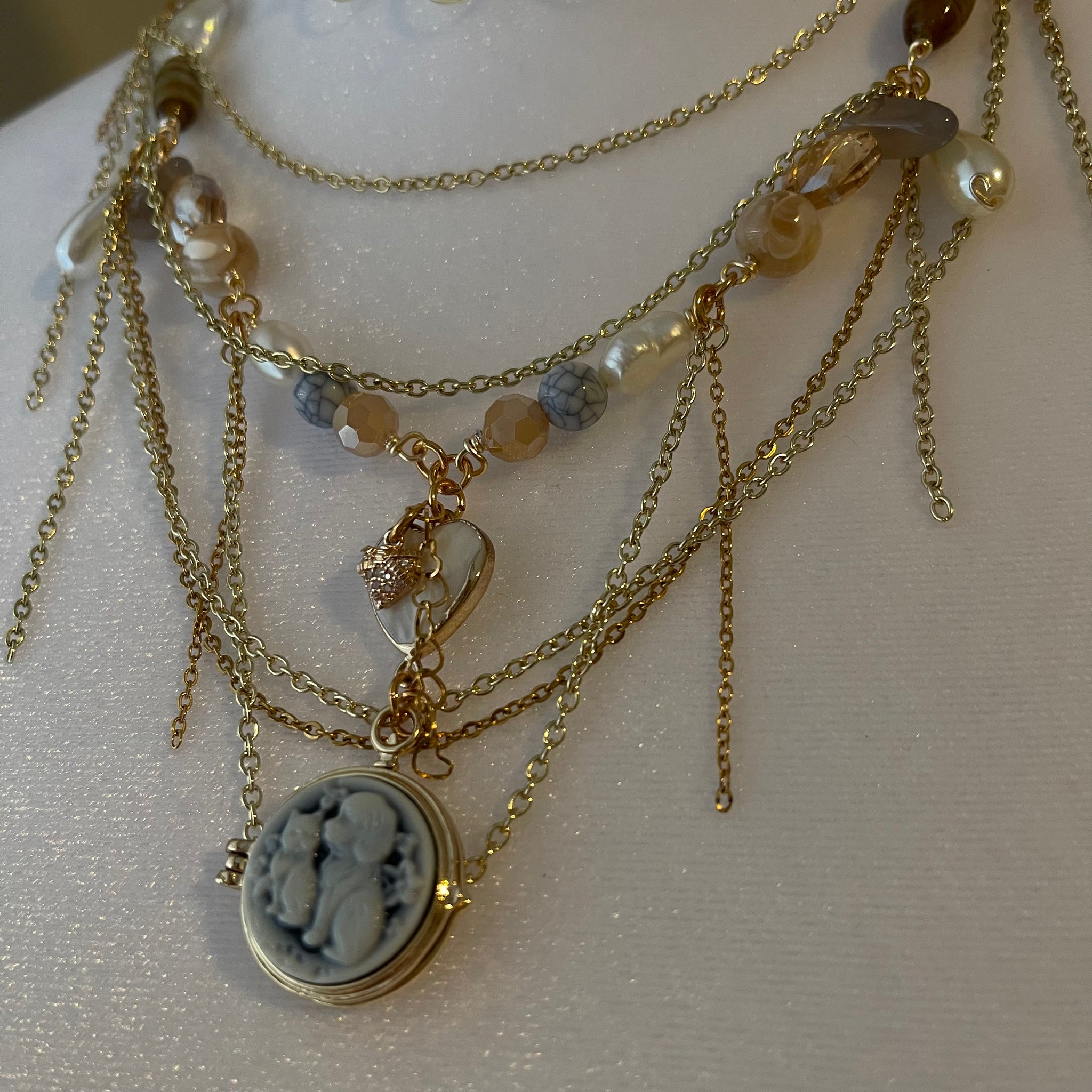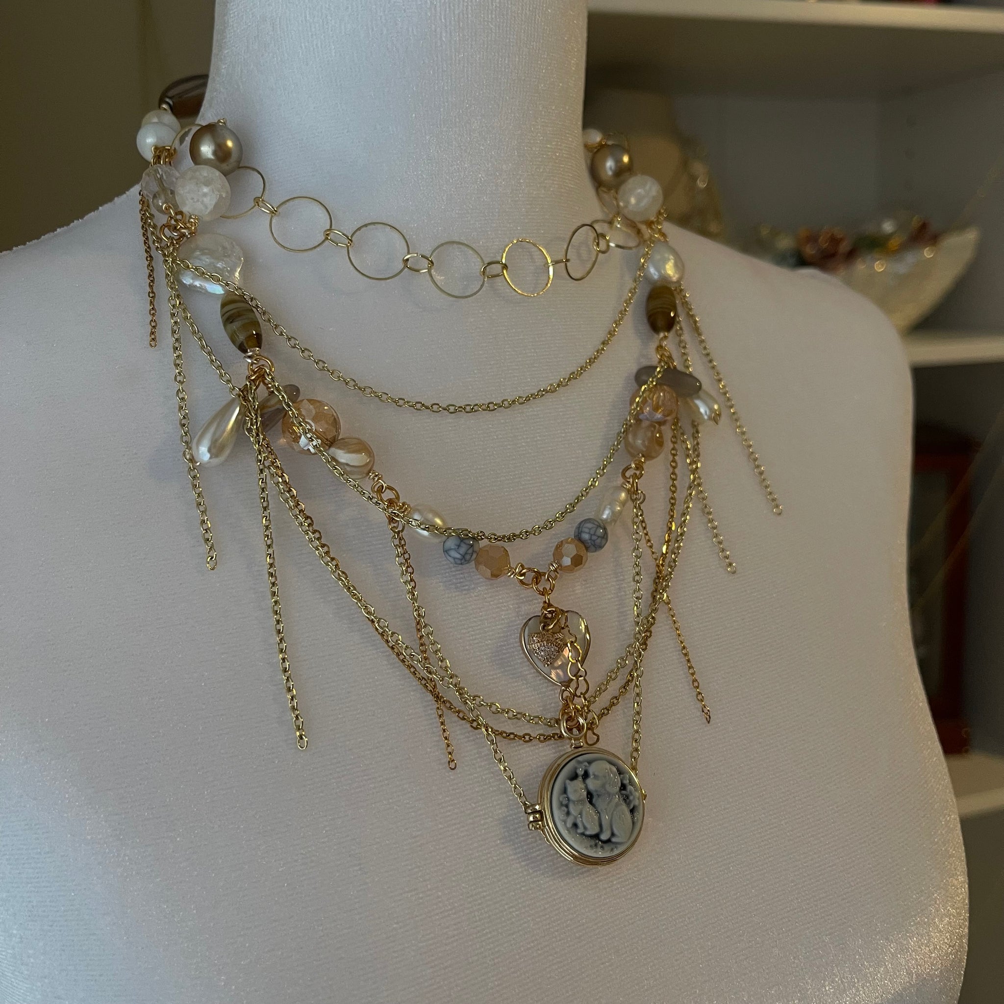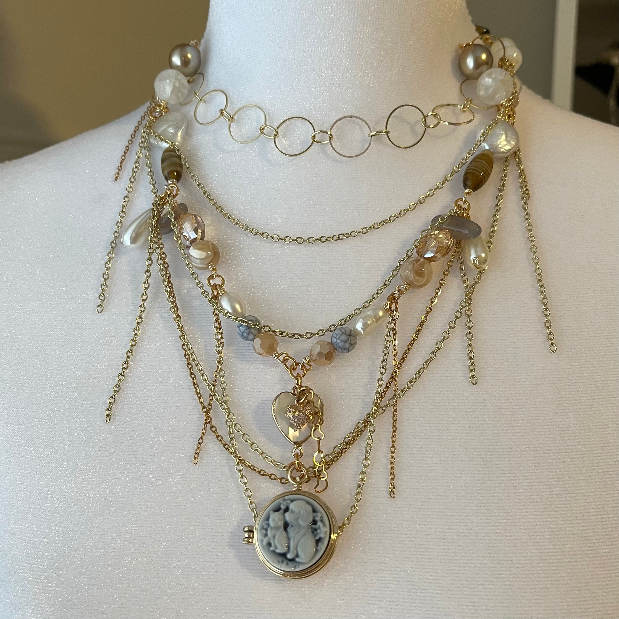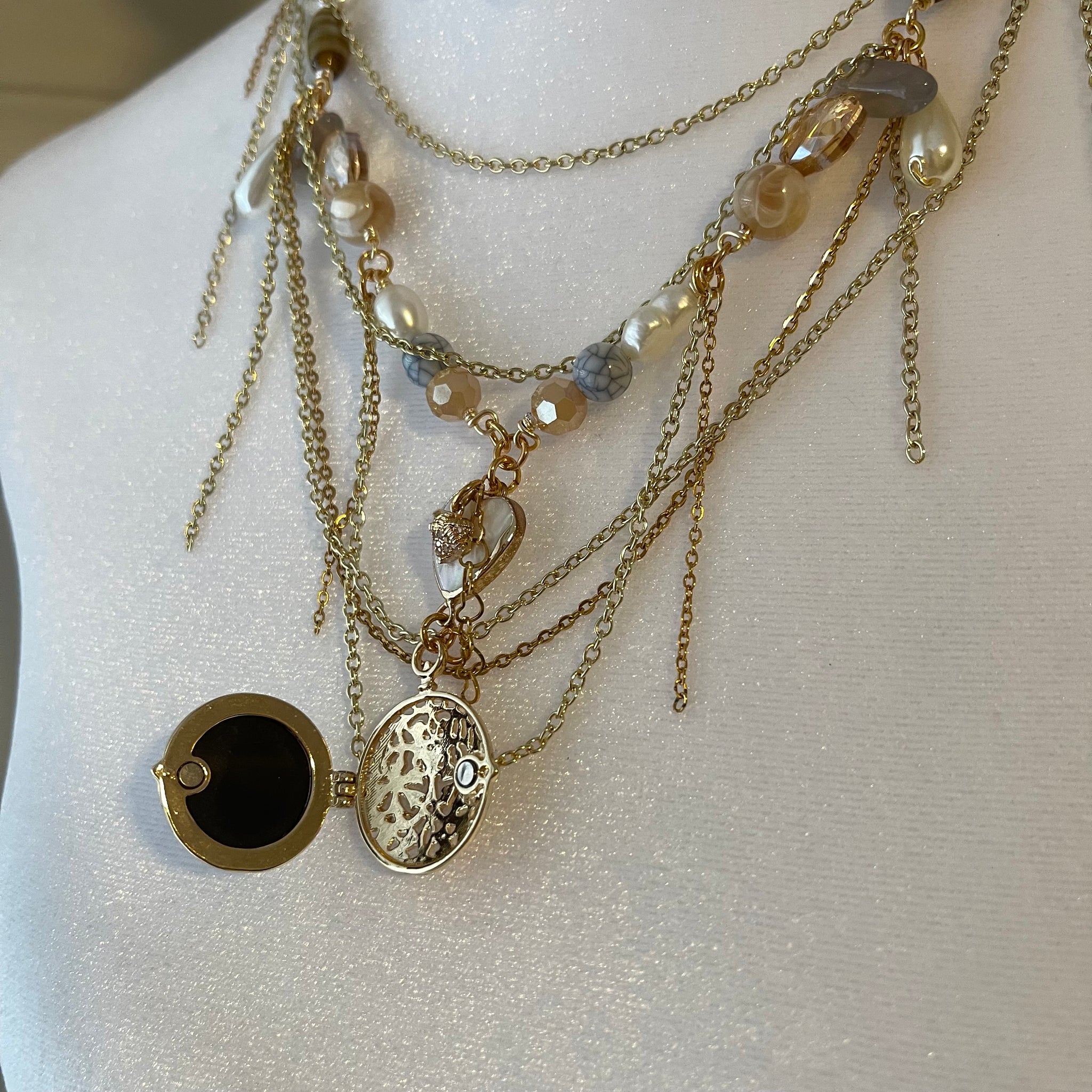 Made with: Glass, cloudy quartz, rhodium, freshwater pearls, mother of pearl heart and locket.