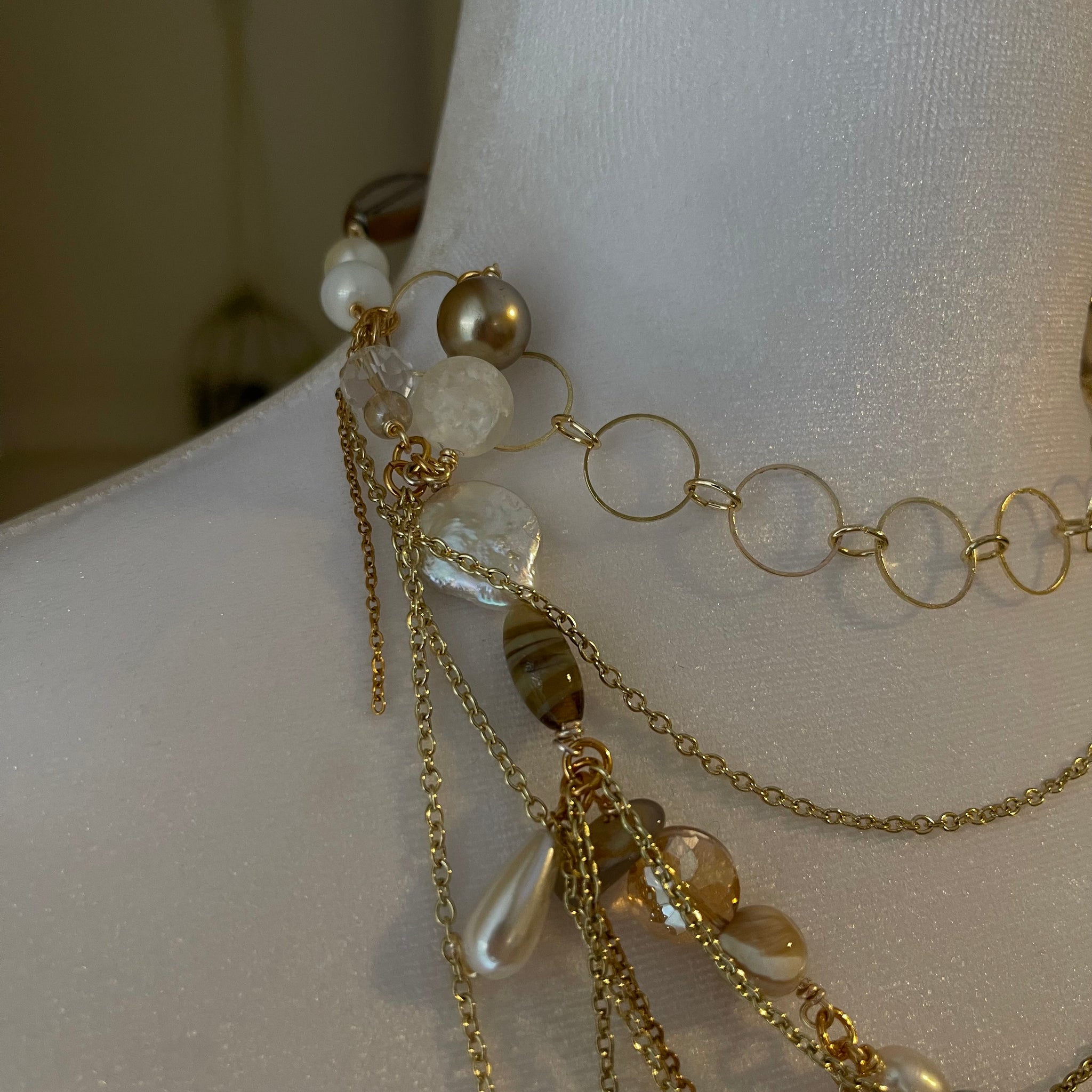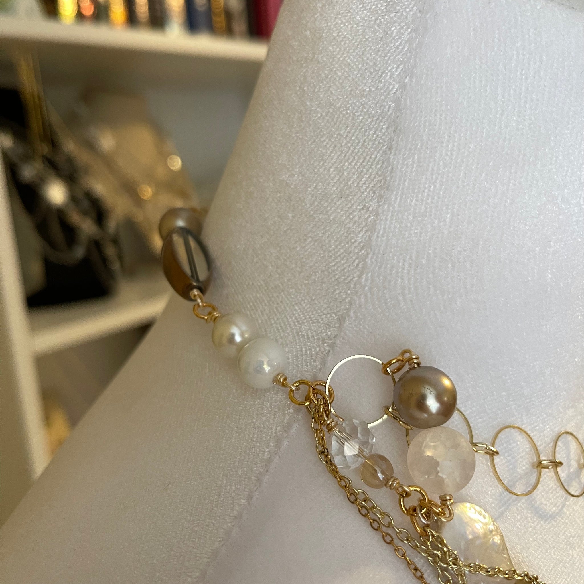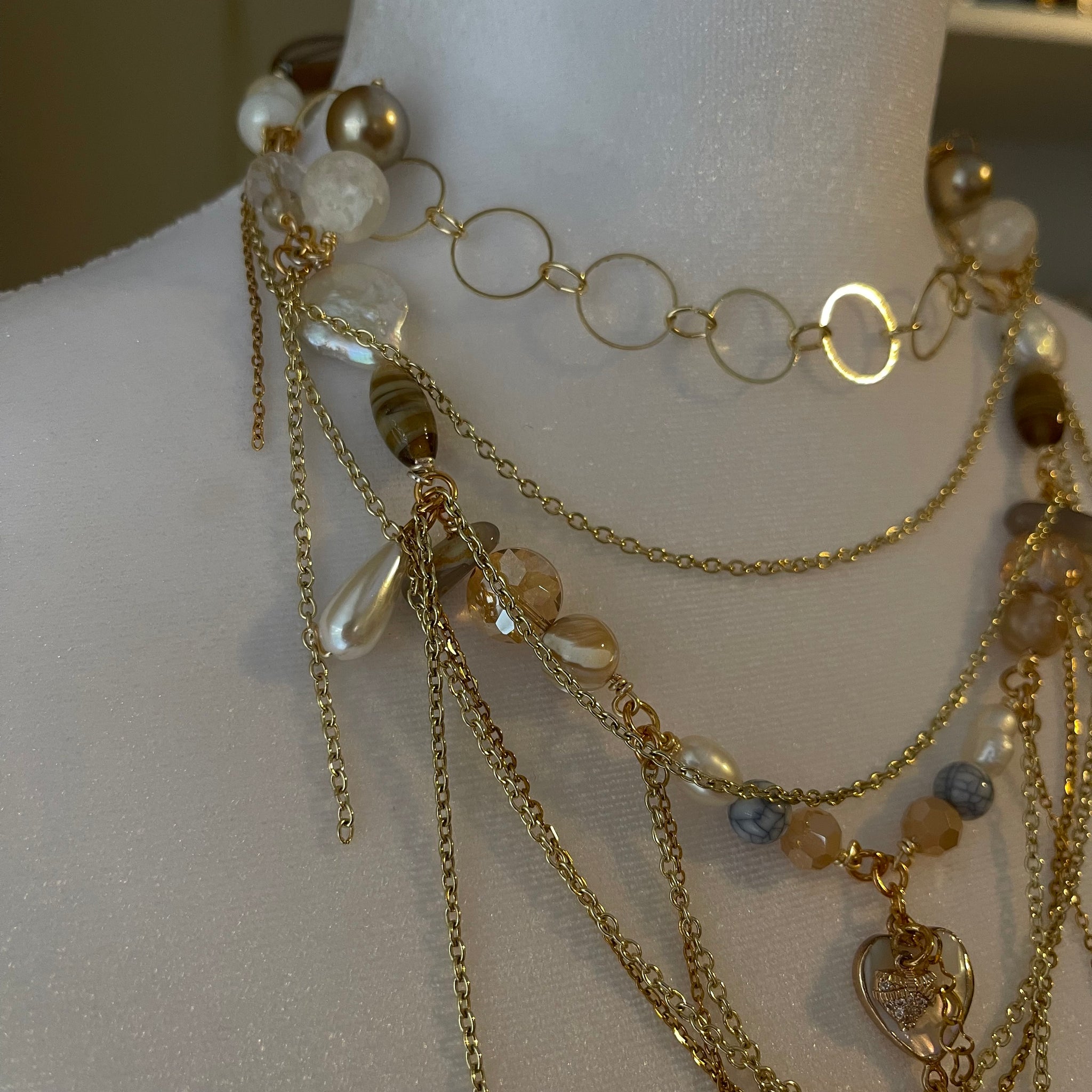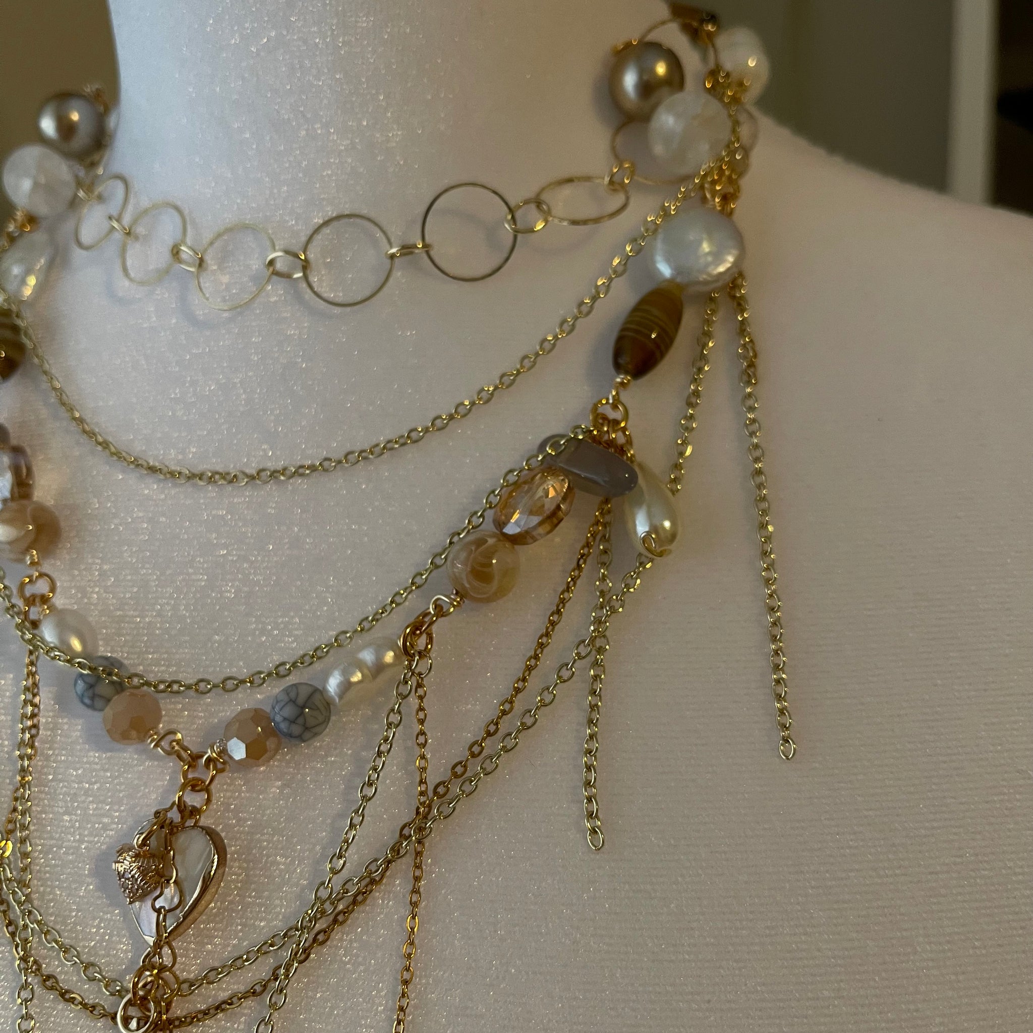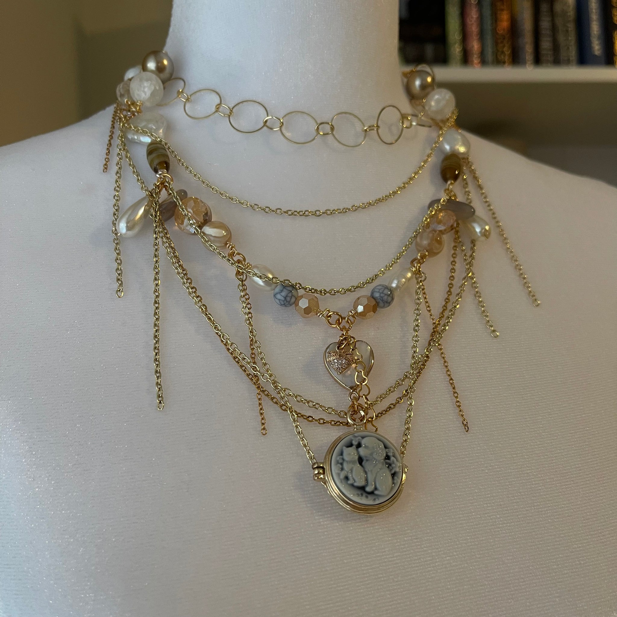 Made with: Glass, cloudy quartz, rhodium, freshwater pearls, mother of pearl heart and locket.