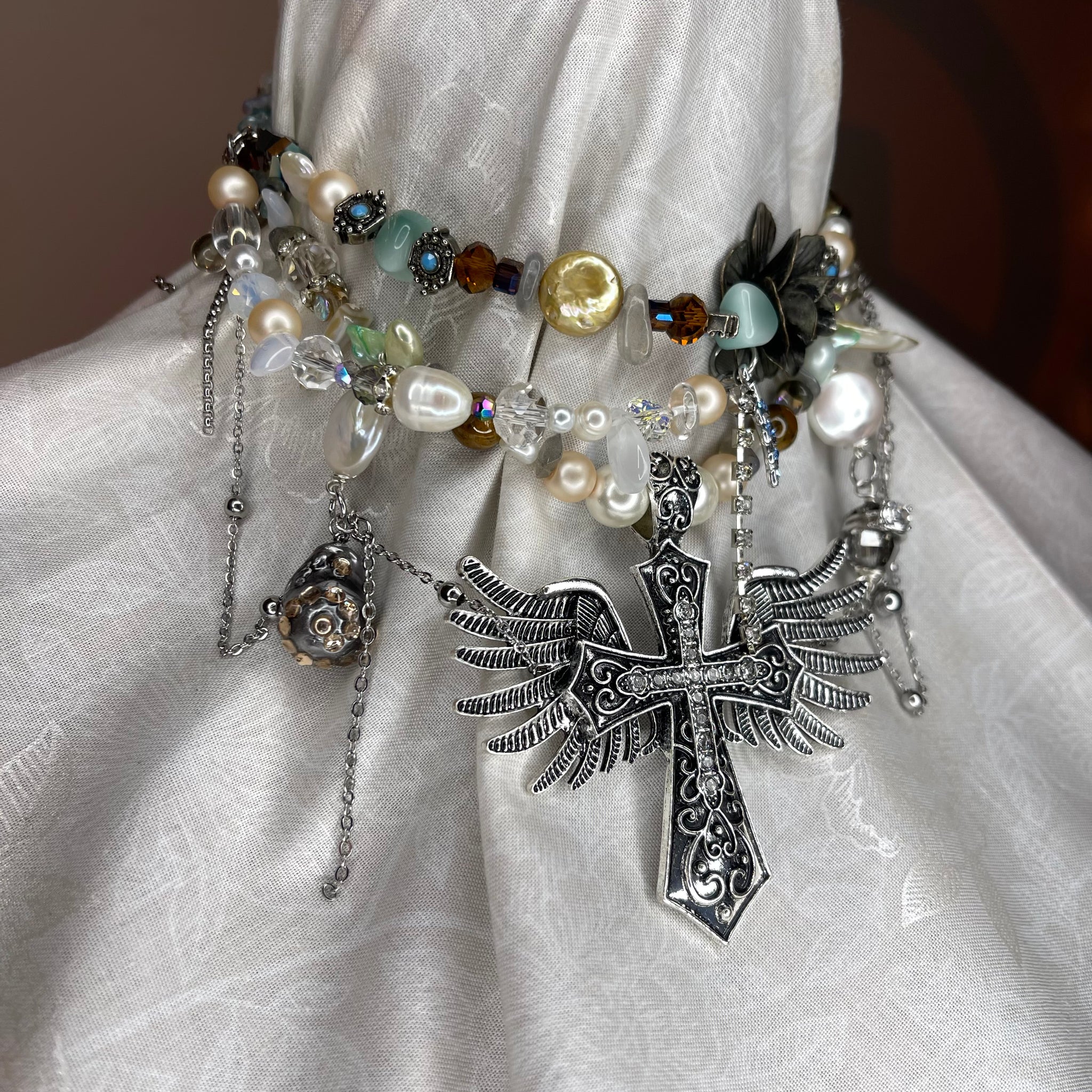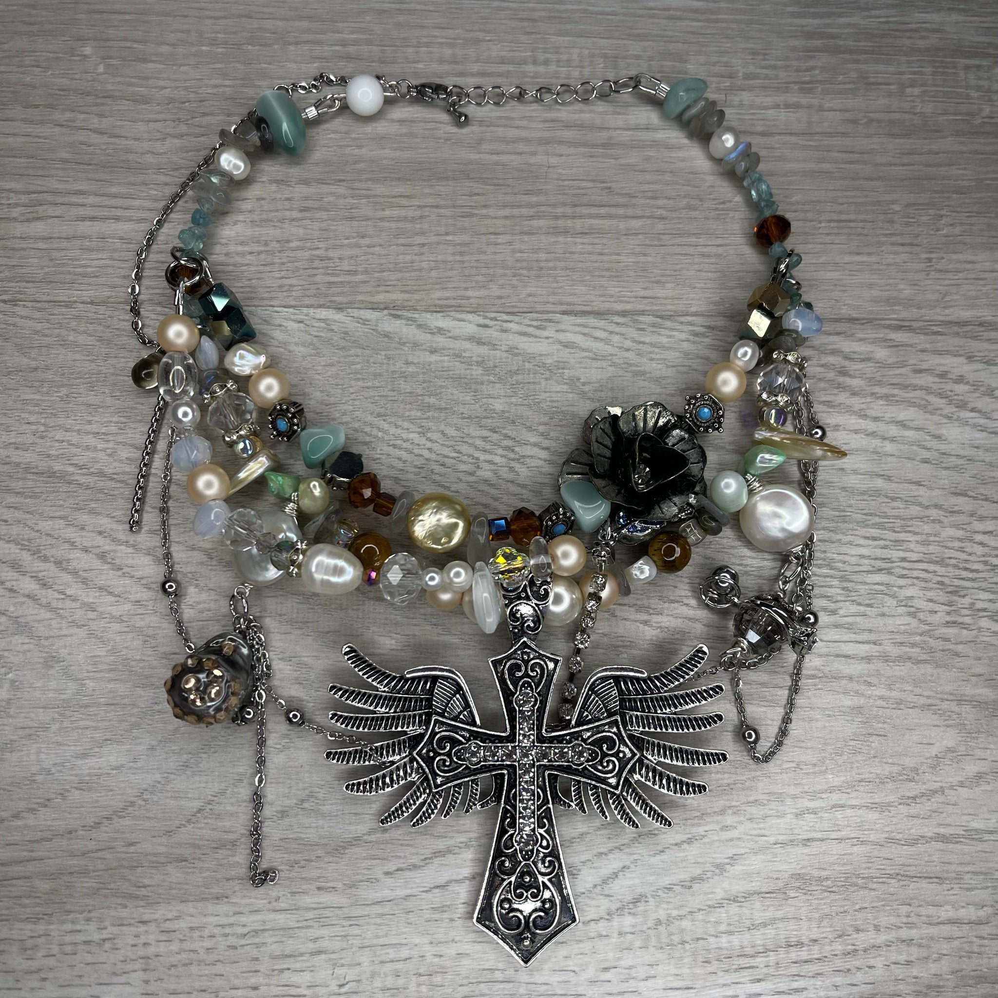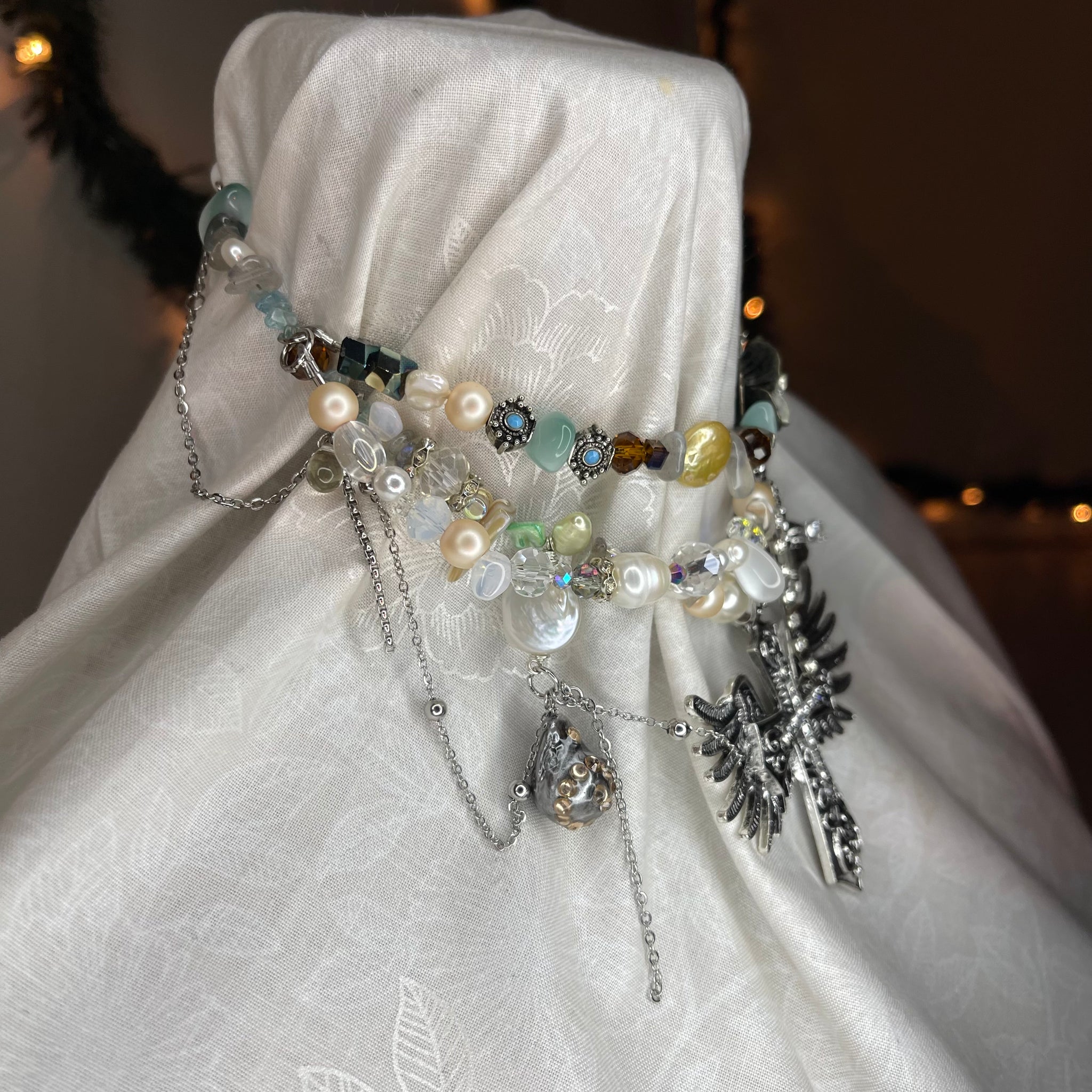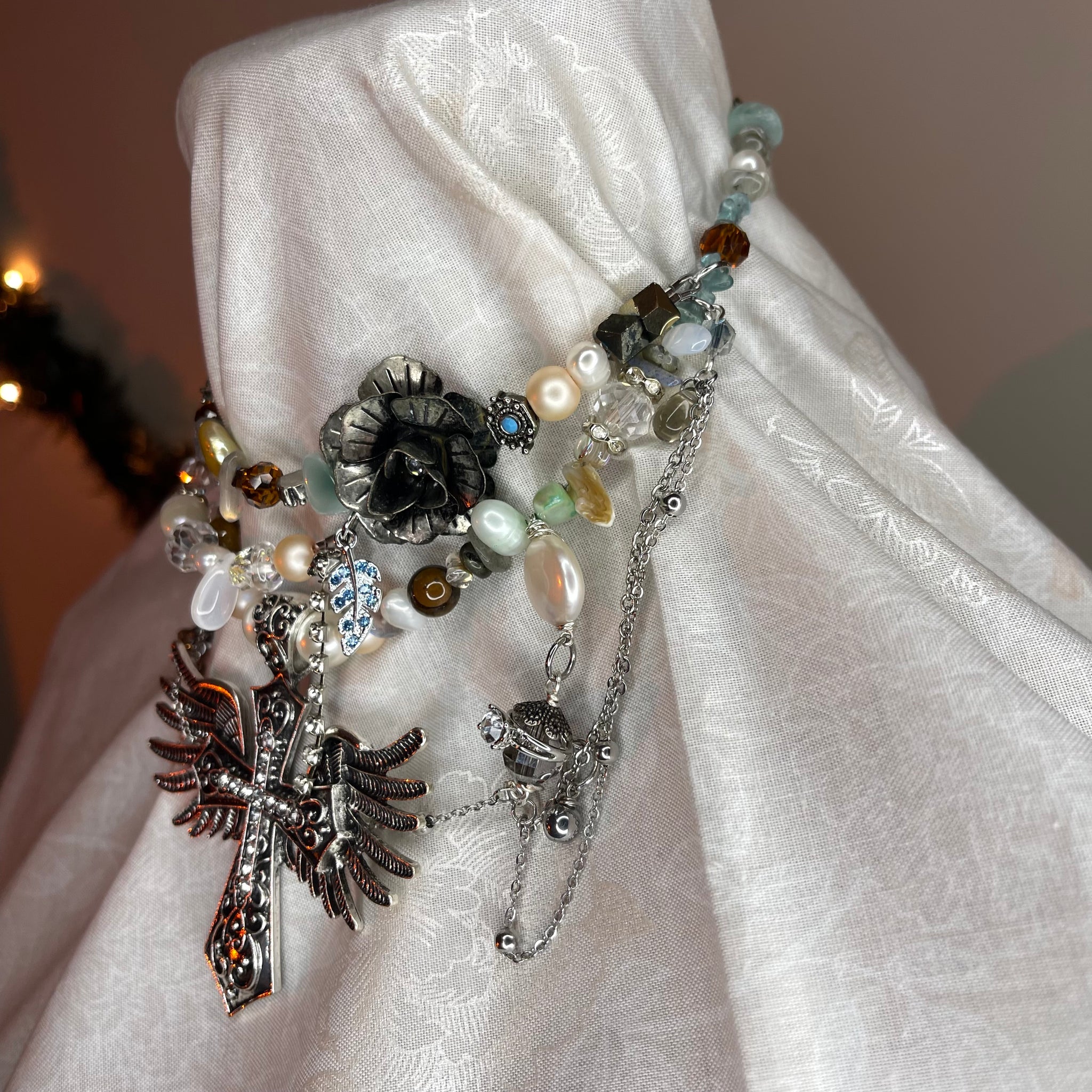 Made with: Freshwater pearls, Glass, Labradorite, Shell, Metals, Baroque pearls, Tigers eye, Coin Pearl, Clear Quartz and stainless steel.