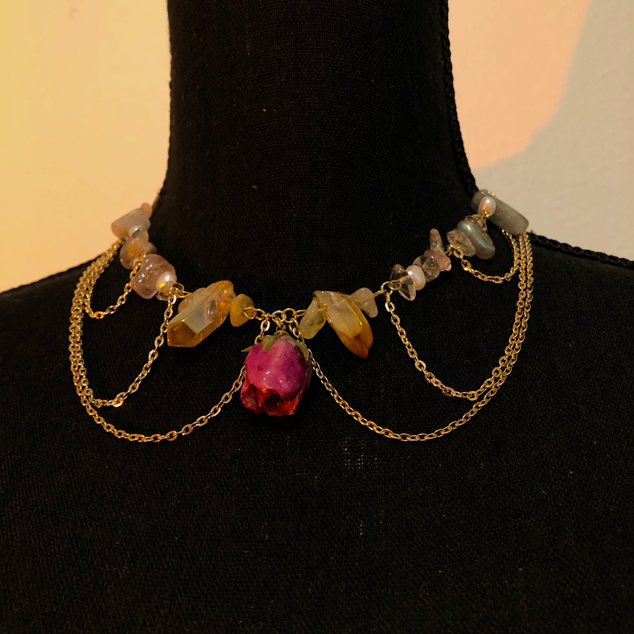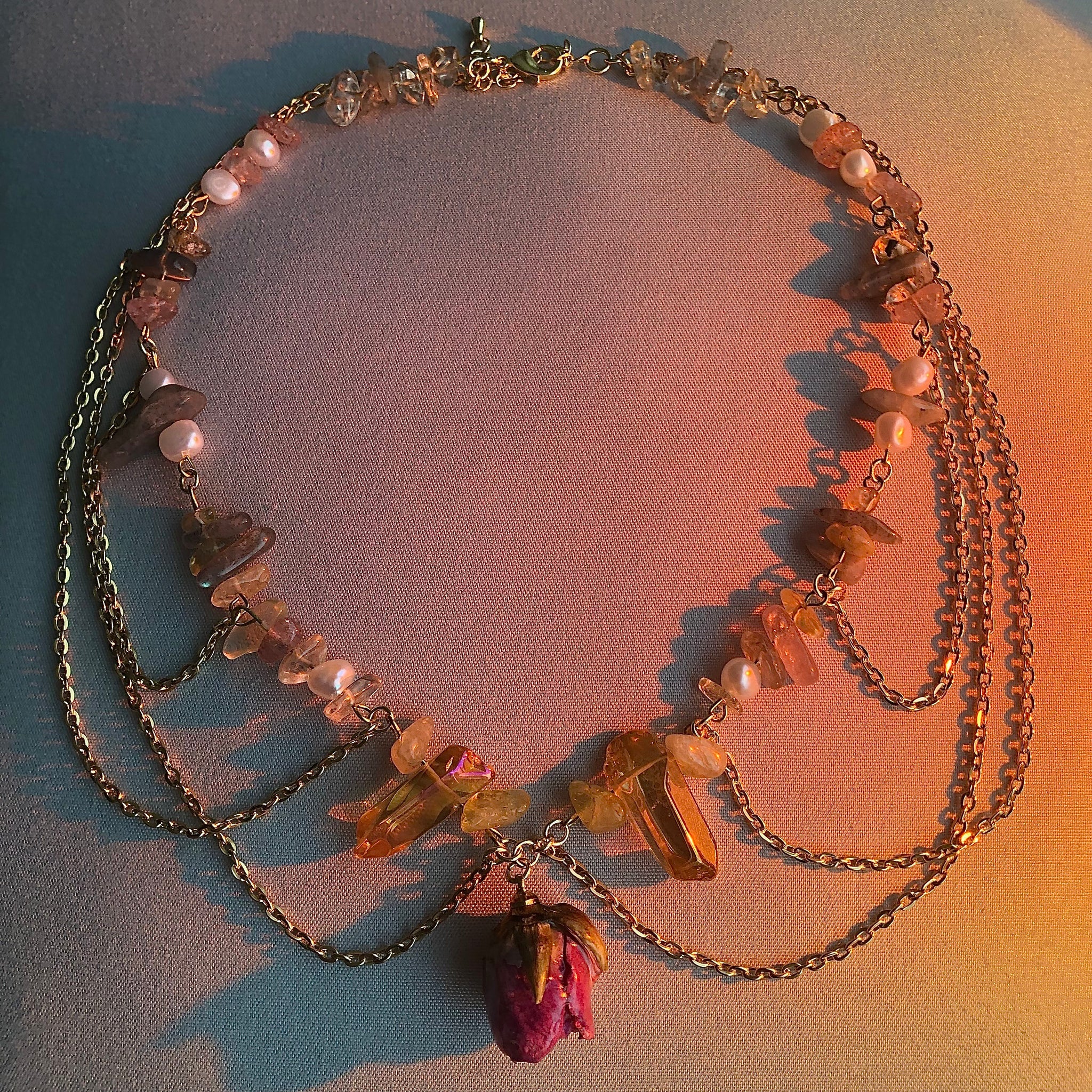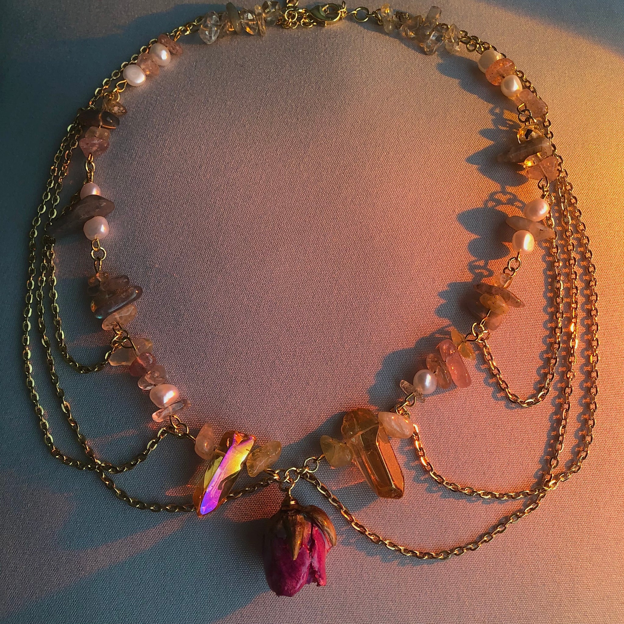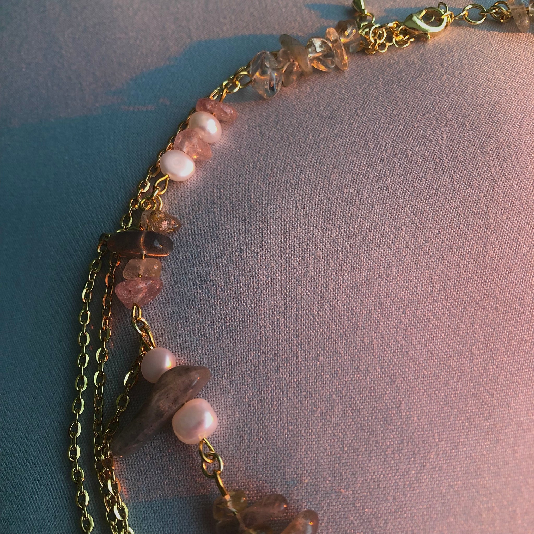 Crystals: Amber stone, Strawberry Quartz, Labradorite, Citrine, and Golden R. Quartz and White water pearls.