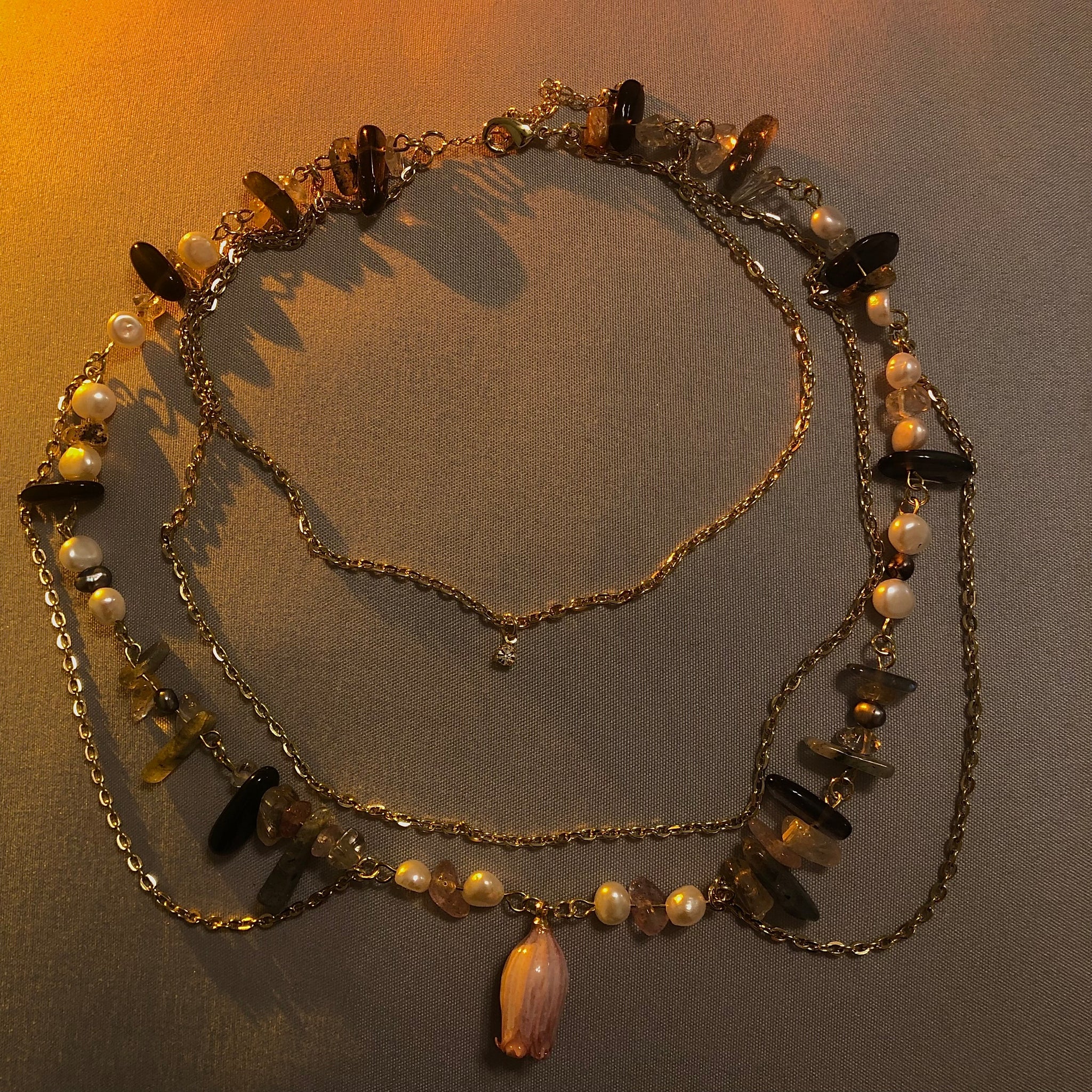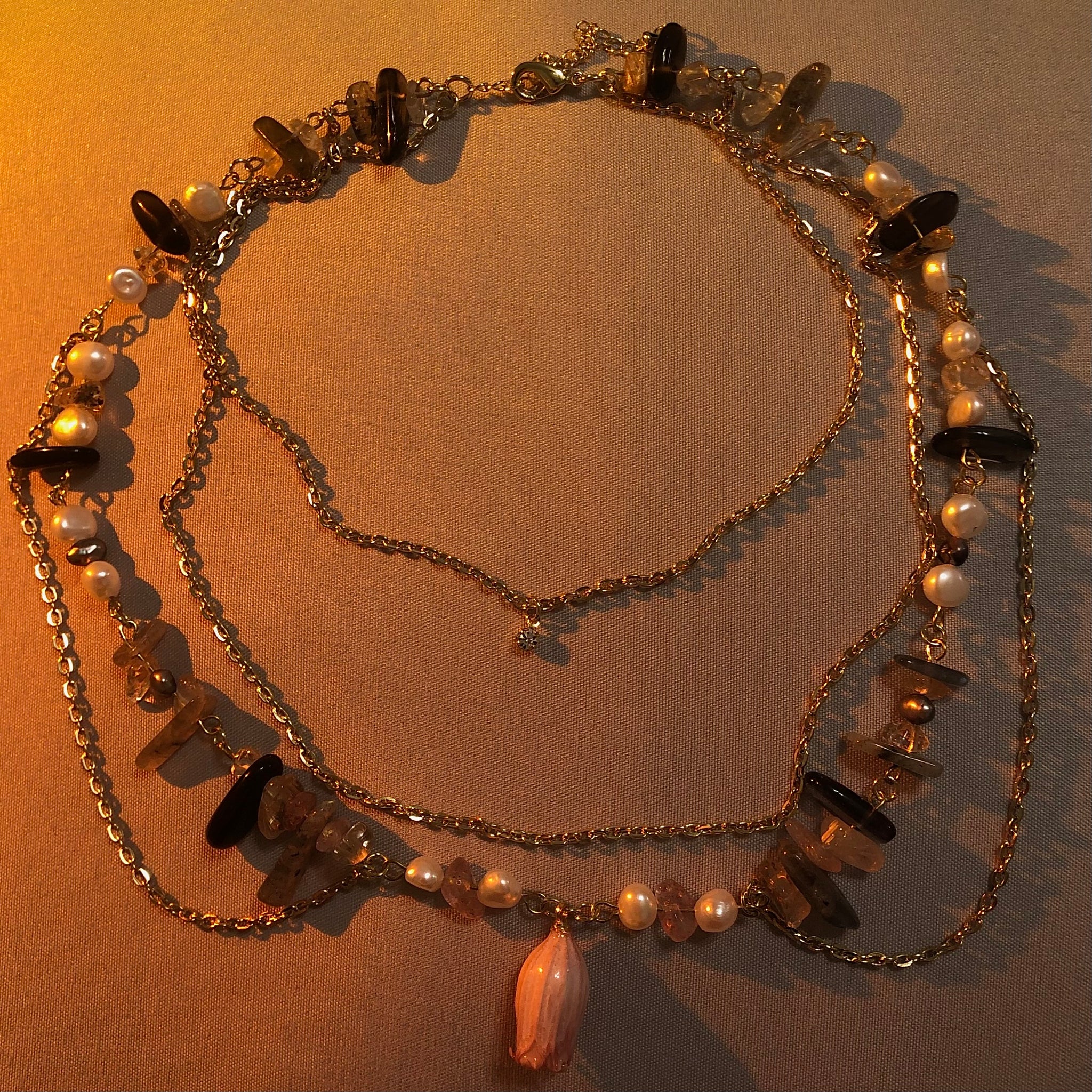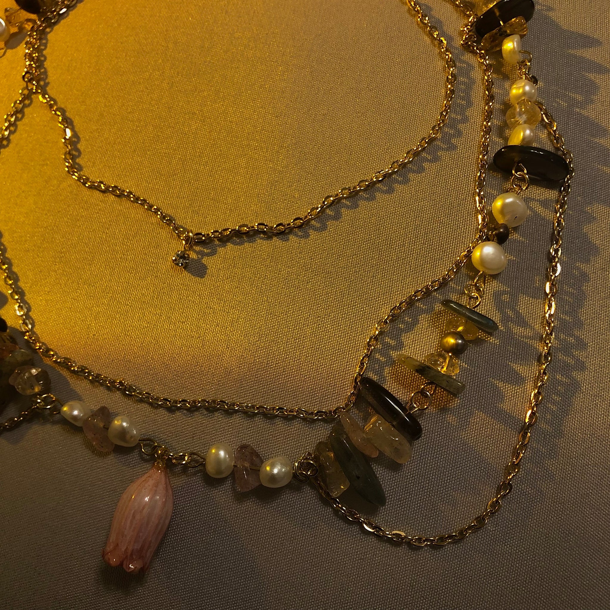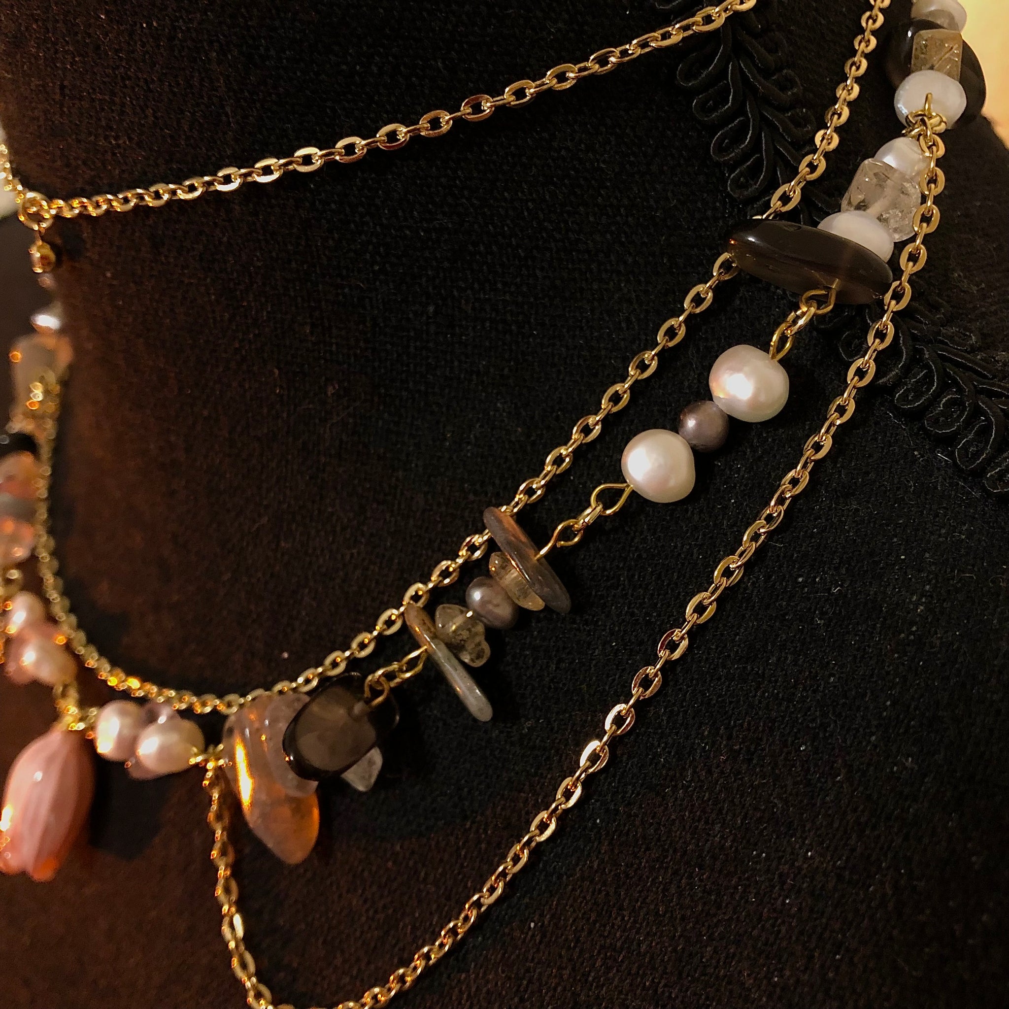 Crystals: Black Obsidian, Strawberry Quartz, Labradorite, Golden R. Quartz, White & Grey water pearls.