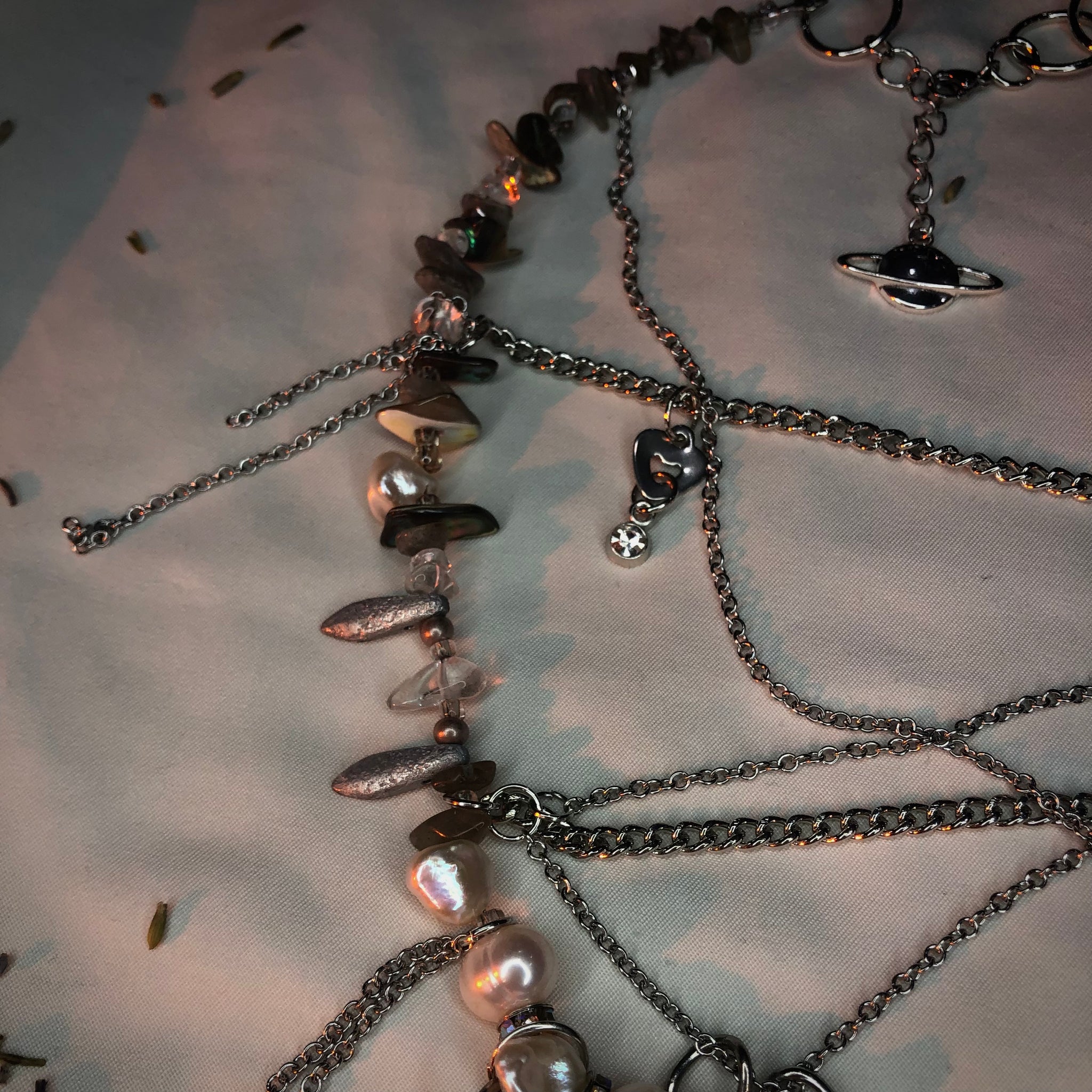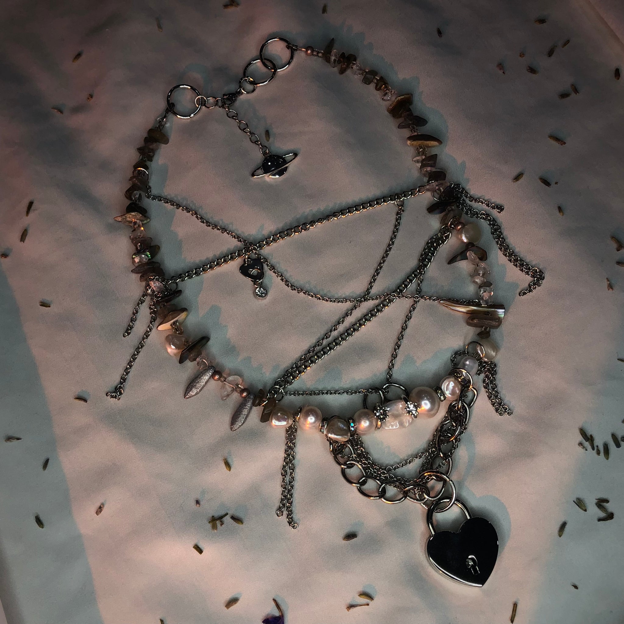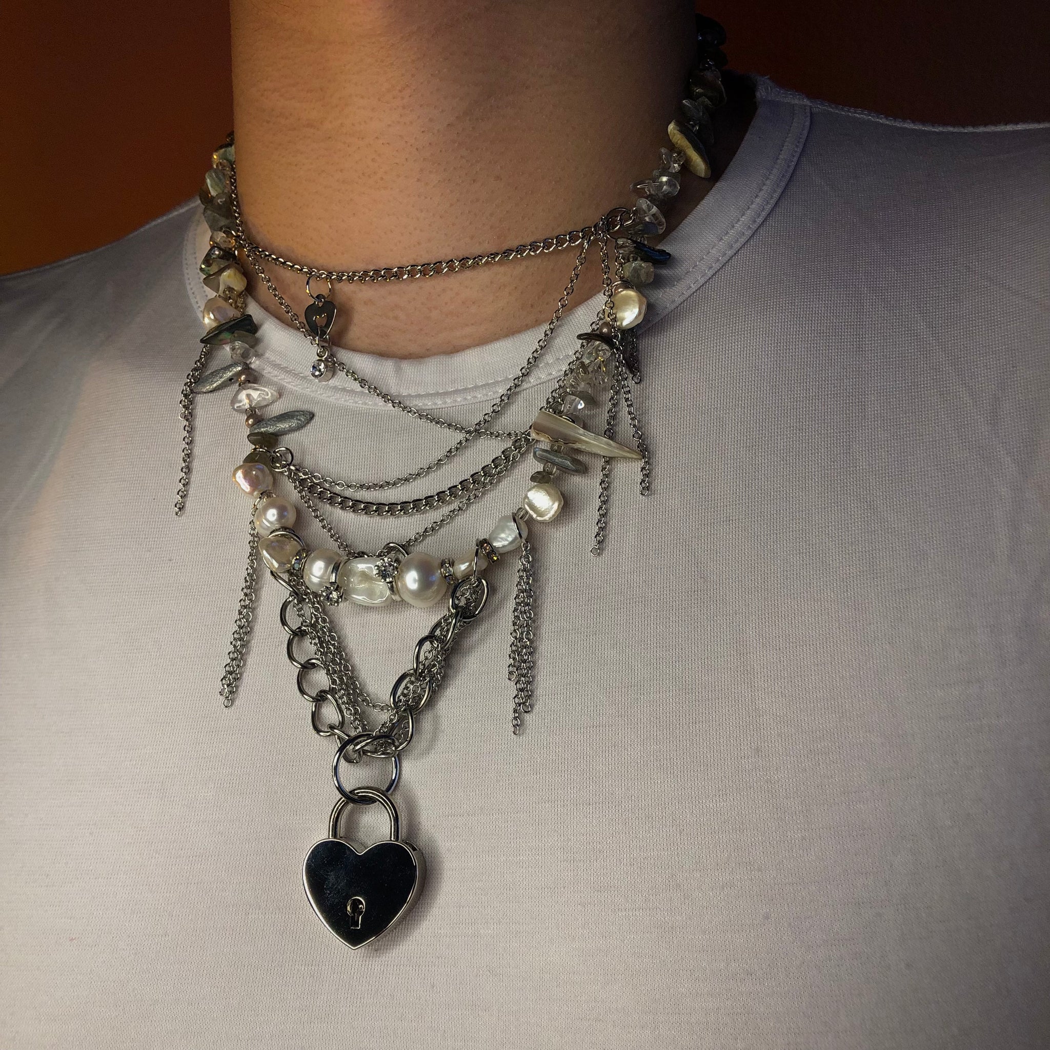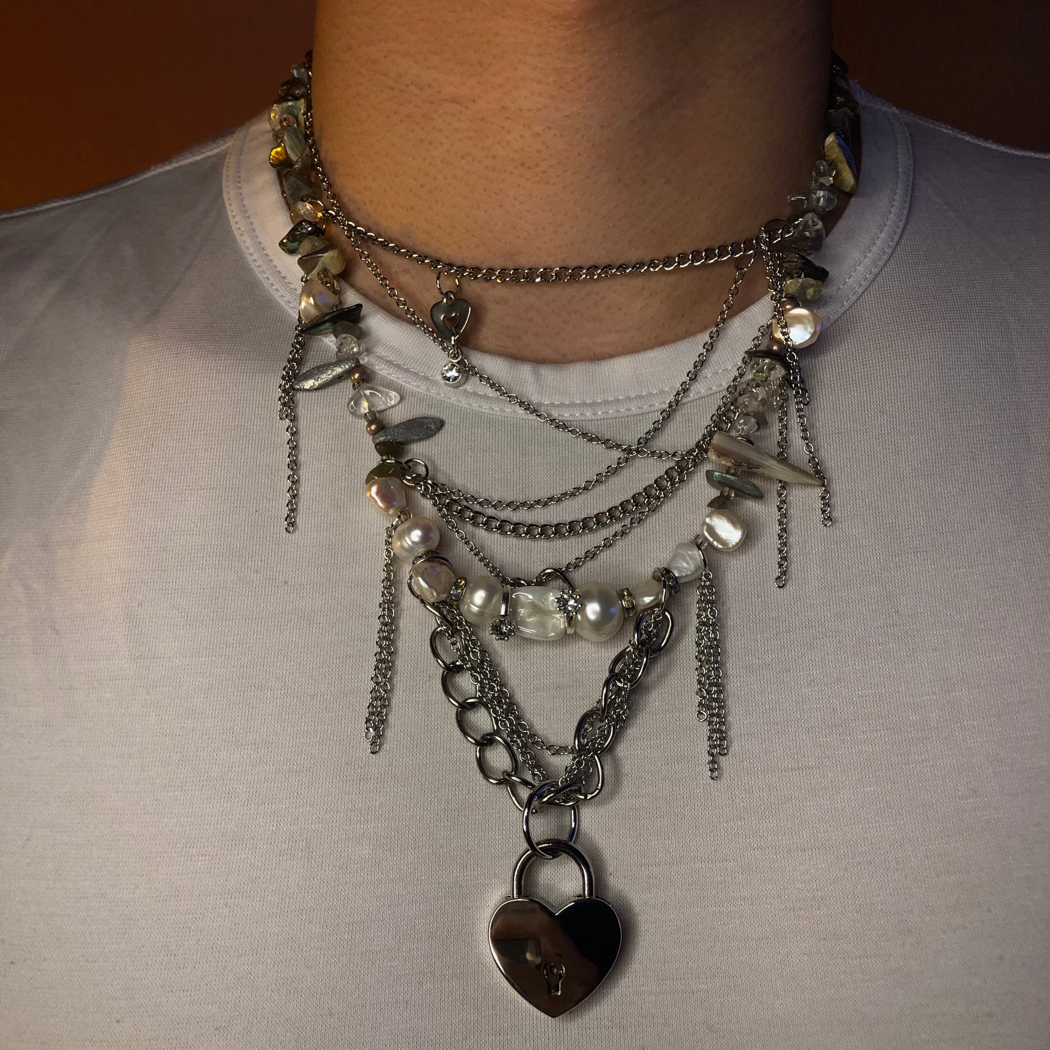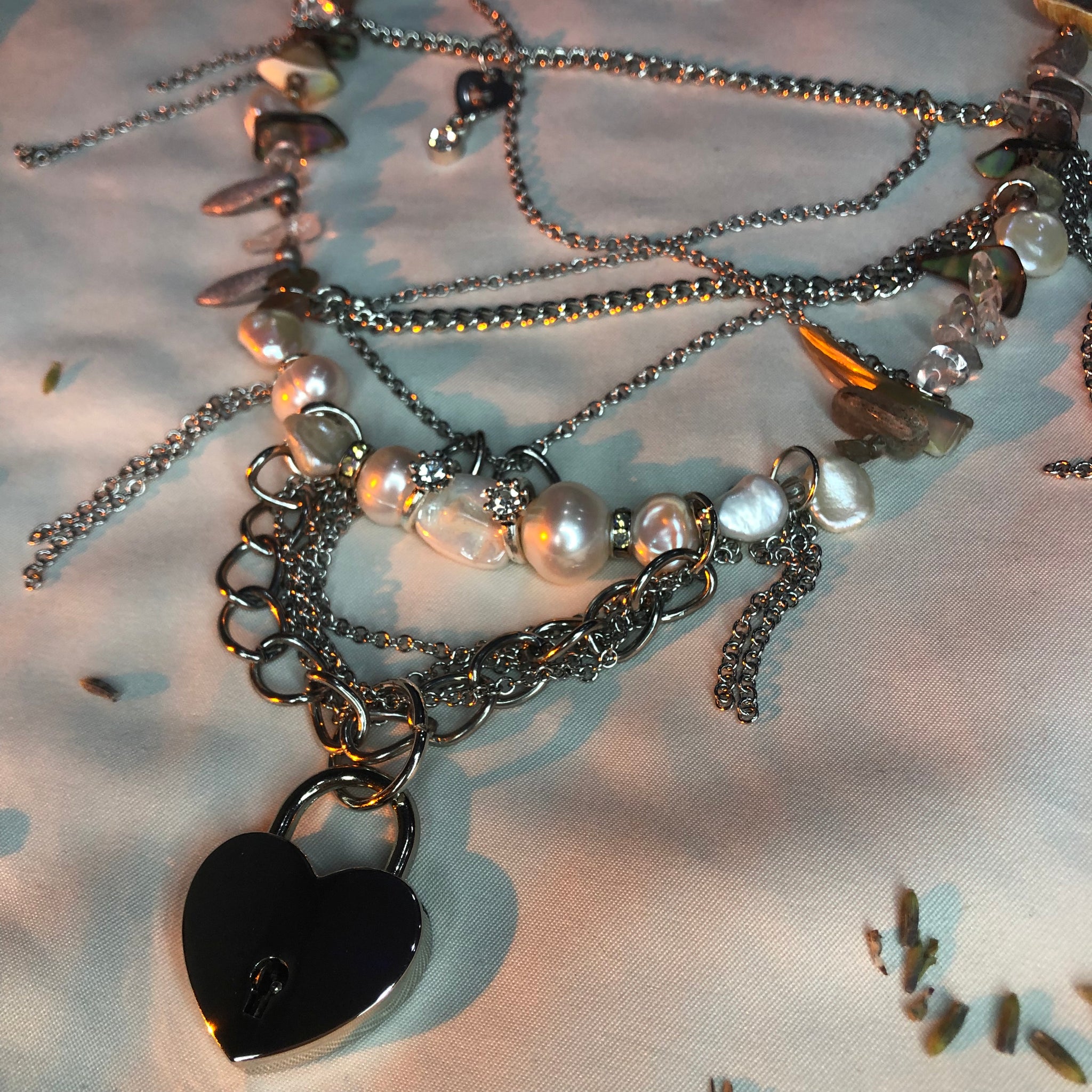 Made with: Freshwater pearls, shell, Labradorite chips, Clear quartz, Abalone chips, Diamond tint beads, Czech beads, Shimmer Taupe beads, Rhinestone beads, Glass beads, Crystal beads, working Heart locket and Sterling silver components.