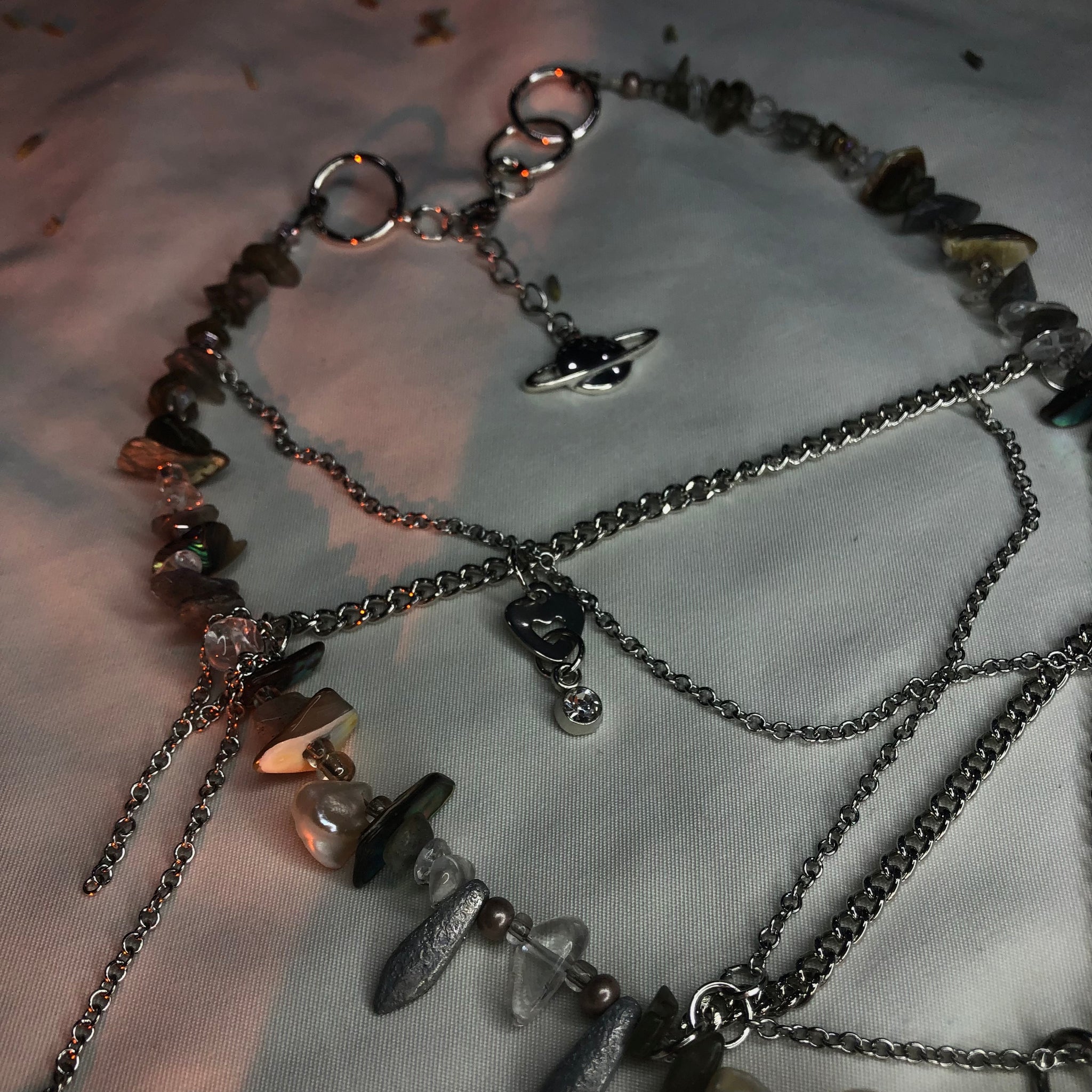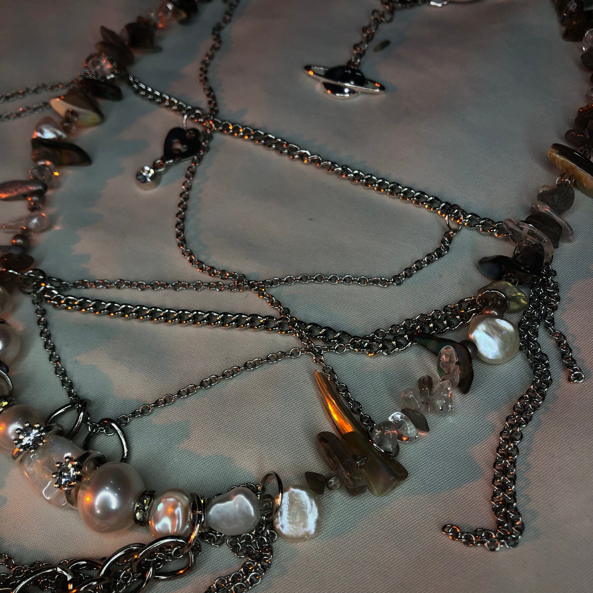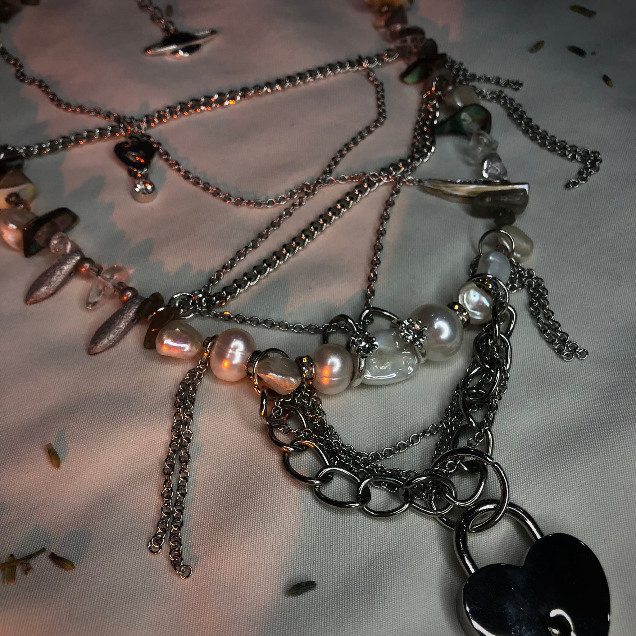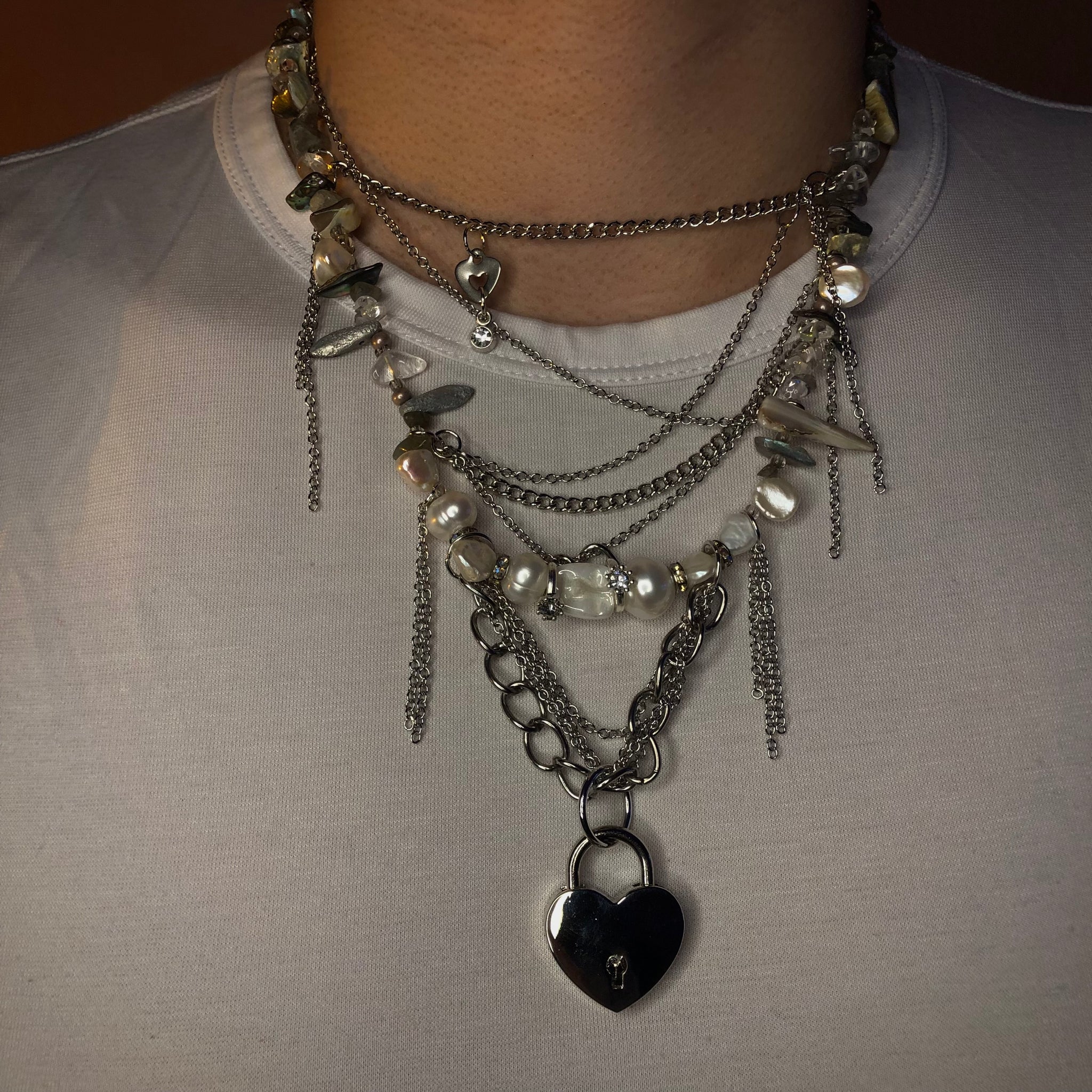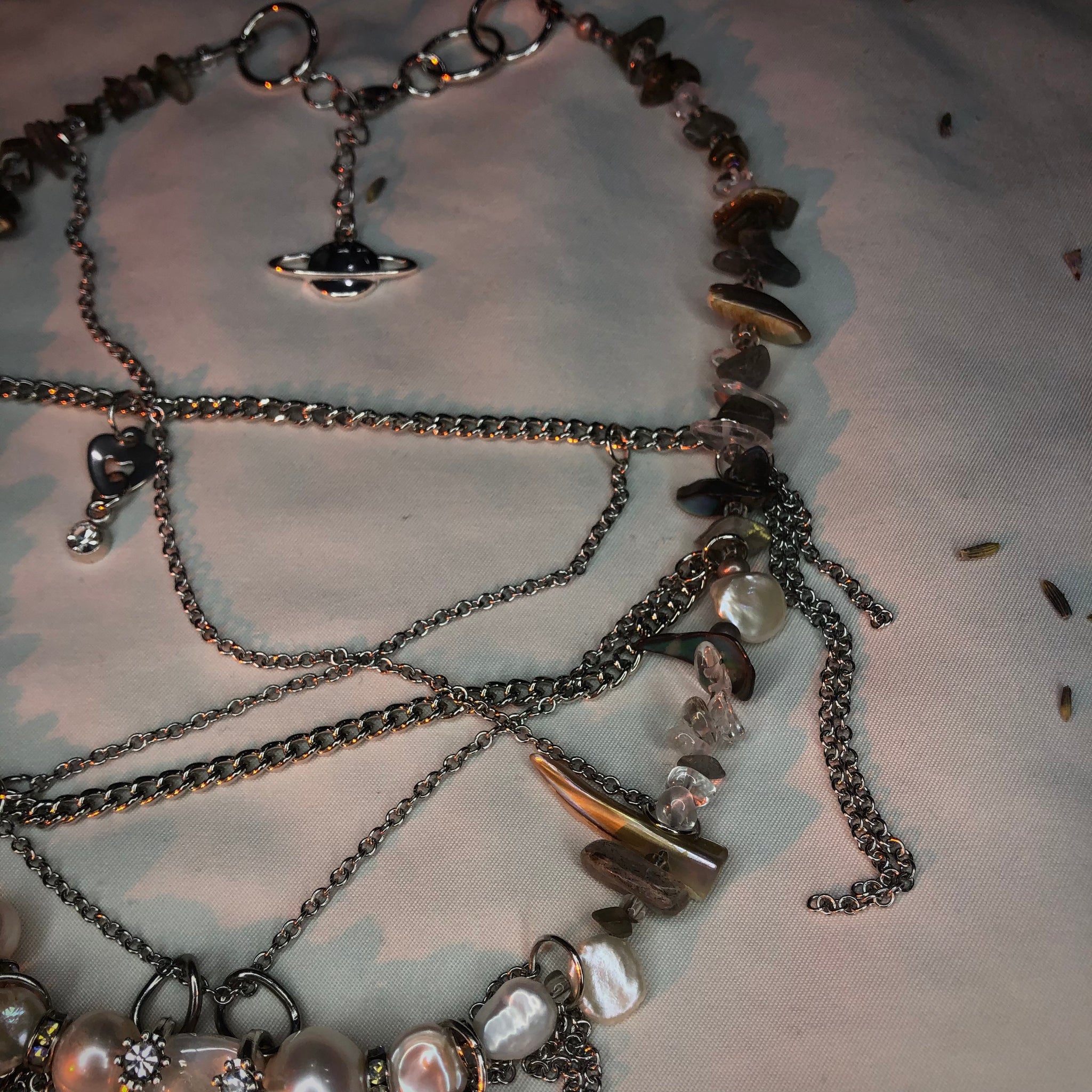 Made with: Freshwater pearls, shell, Labradorite chips, Clear quartz, Abalone chips, Diamond tint beads, Czech beads, Shimmer Taupe beads, Rhinestone beads, Glass beads, Crystal beads, working Heart locket and Sterling silver components.