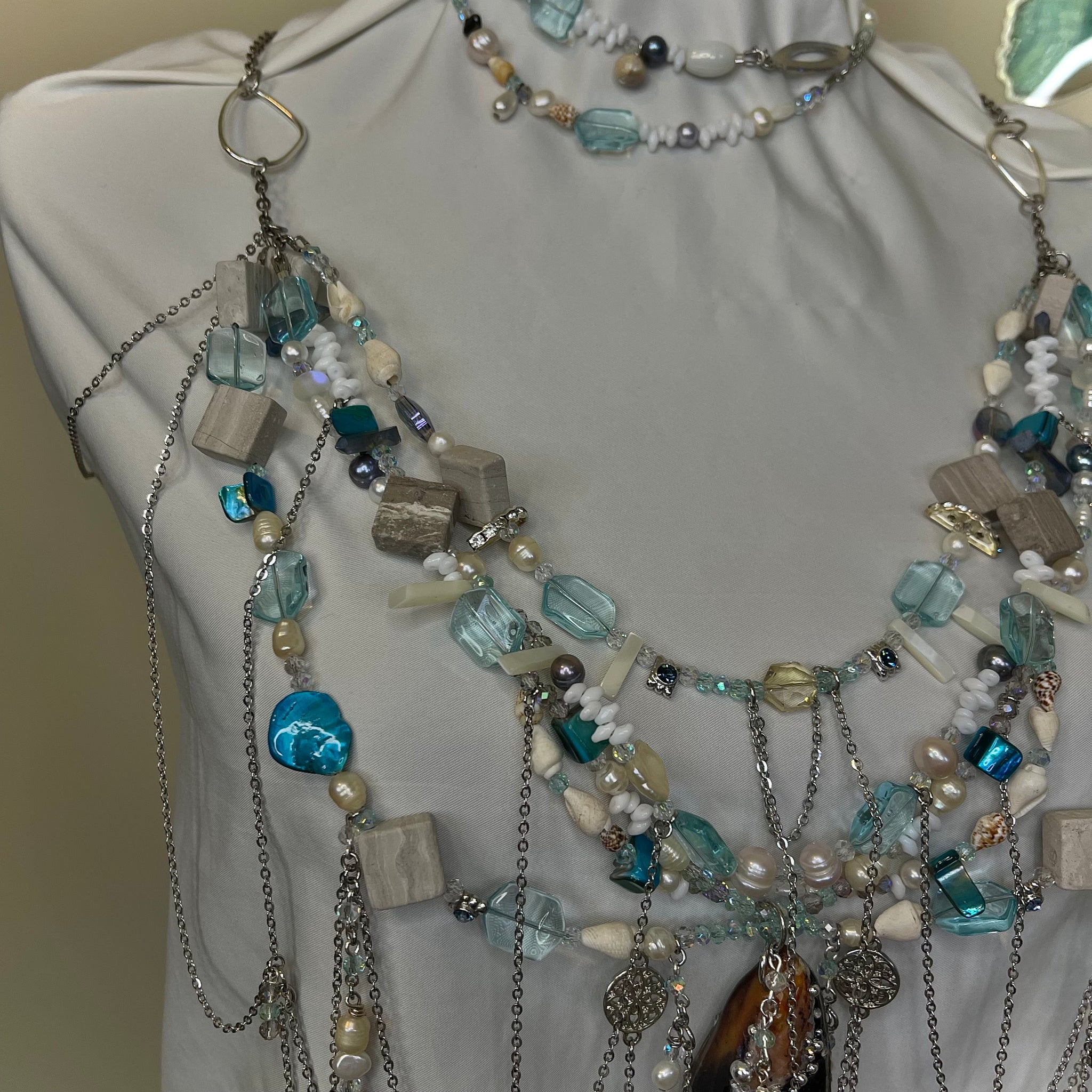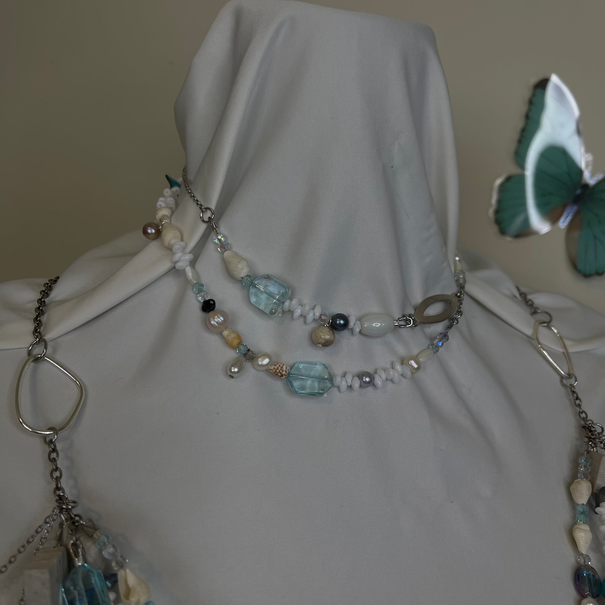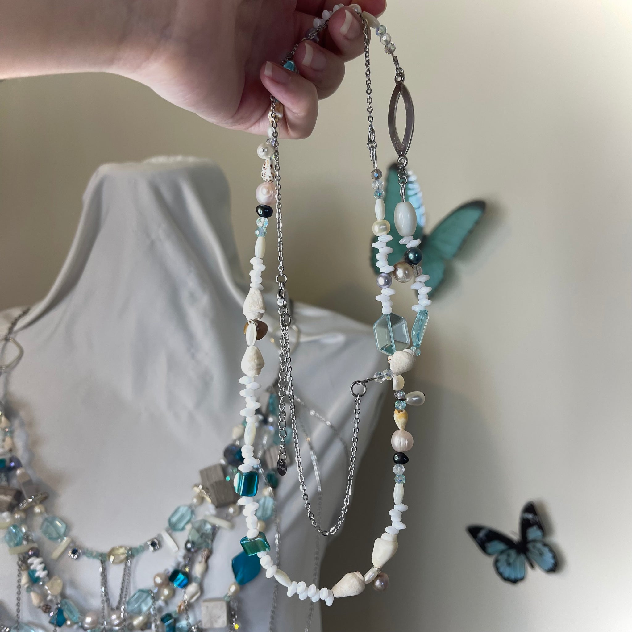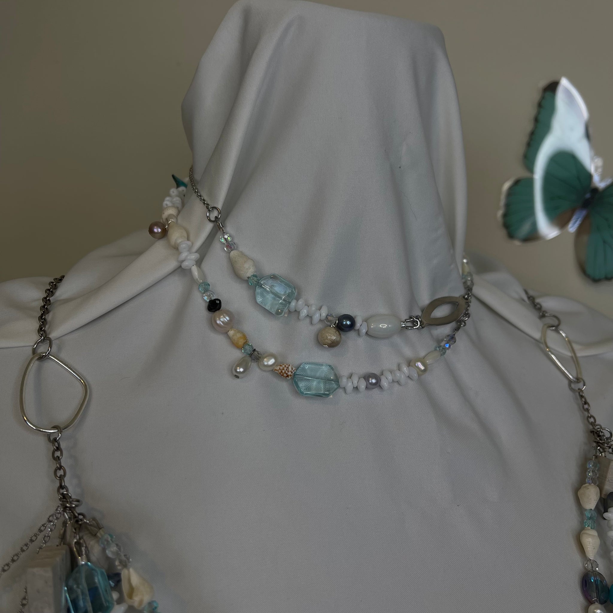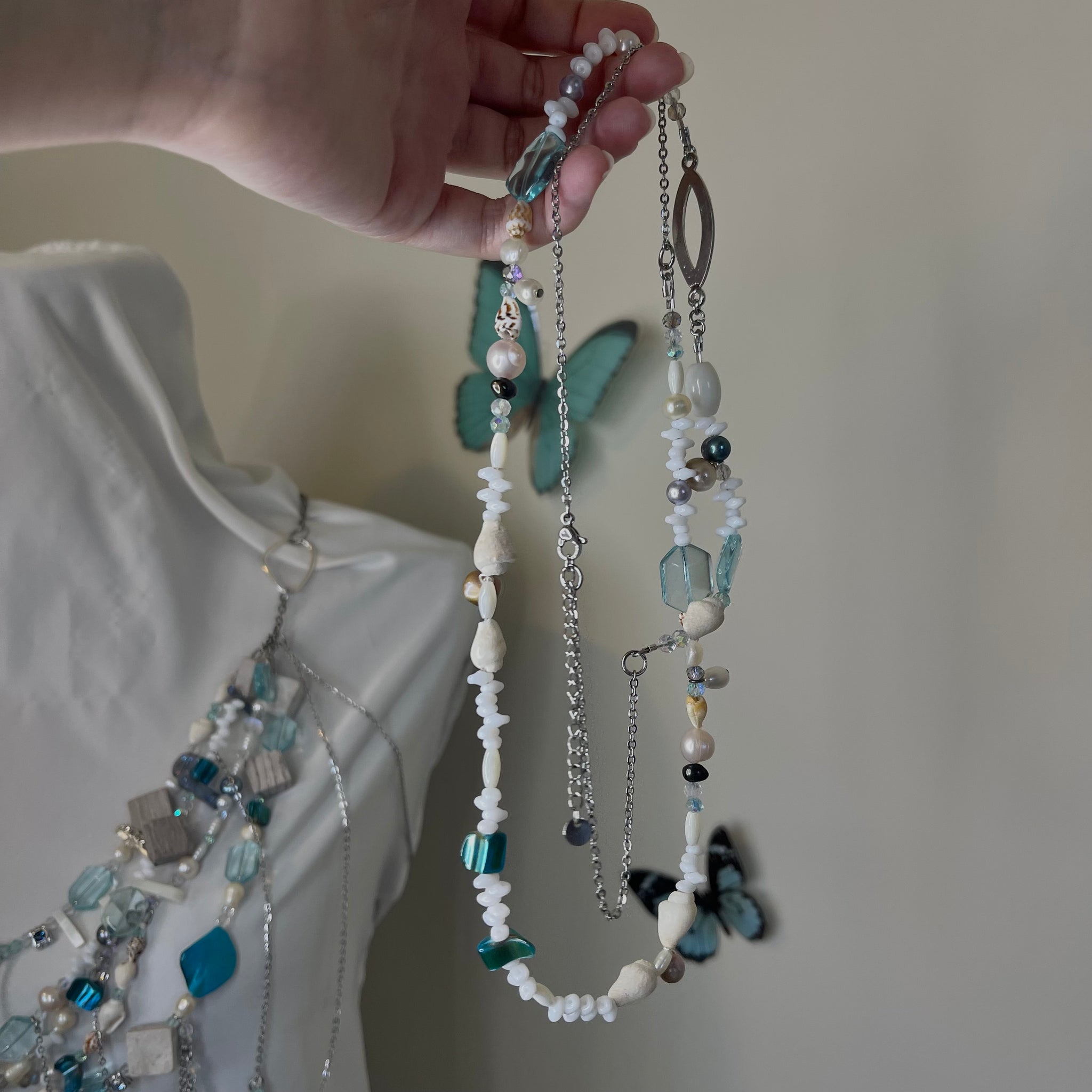 Made with: Glass, Freshwater pearls, Mother of pearl, Shell, Blue luster, Antique Charms, Cream marble and stainless steel