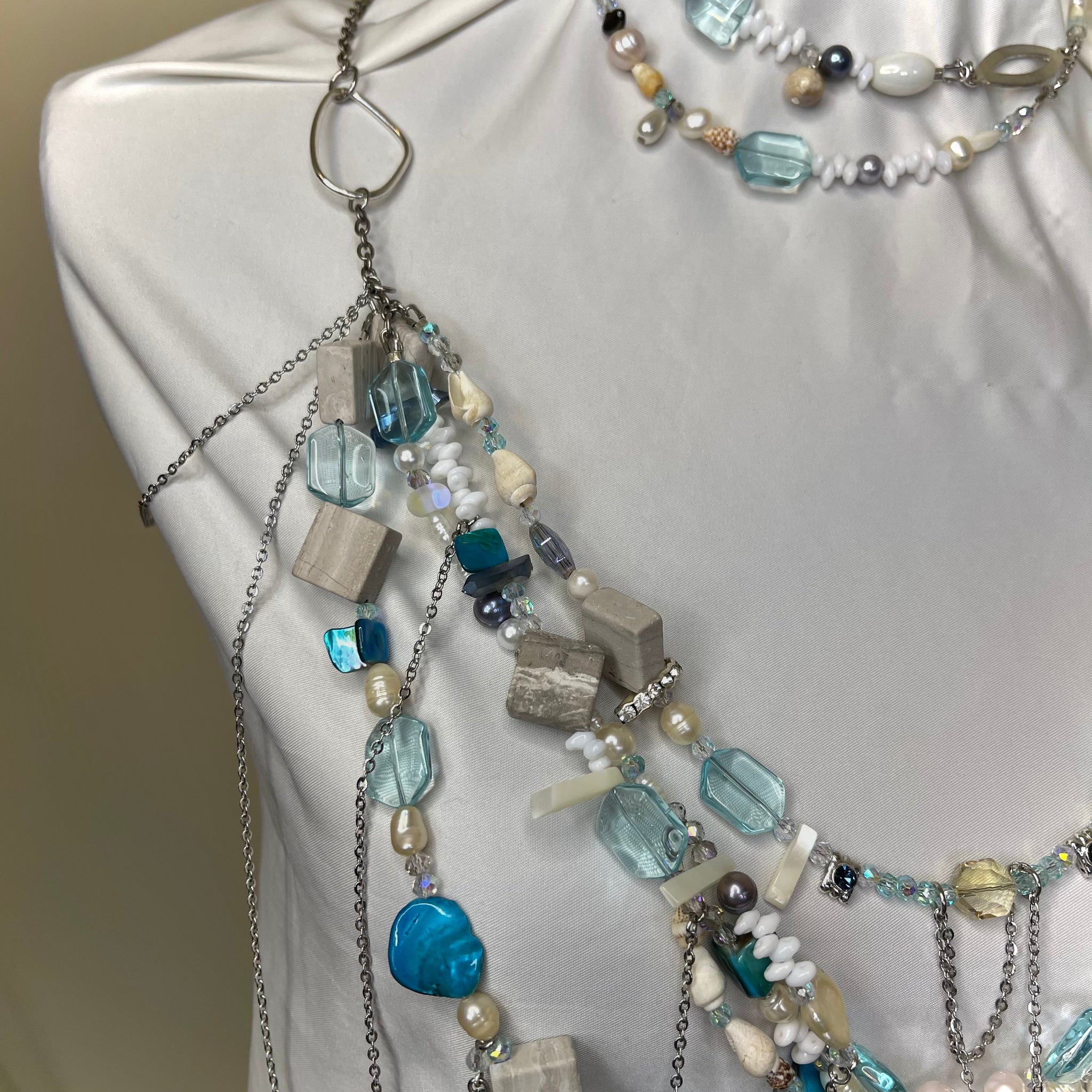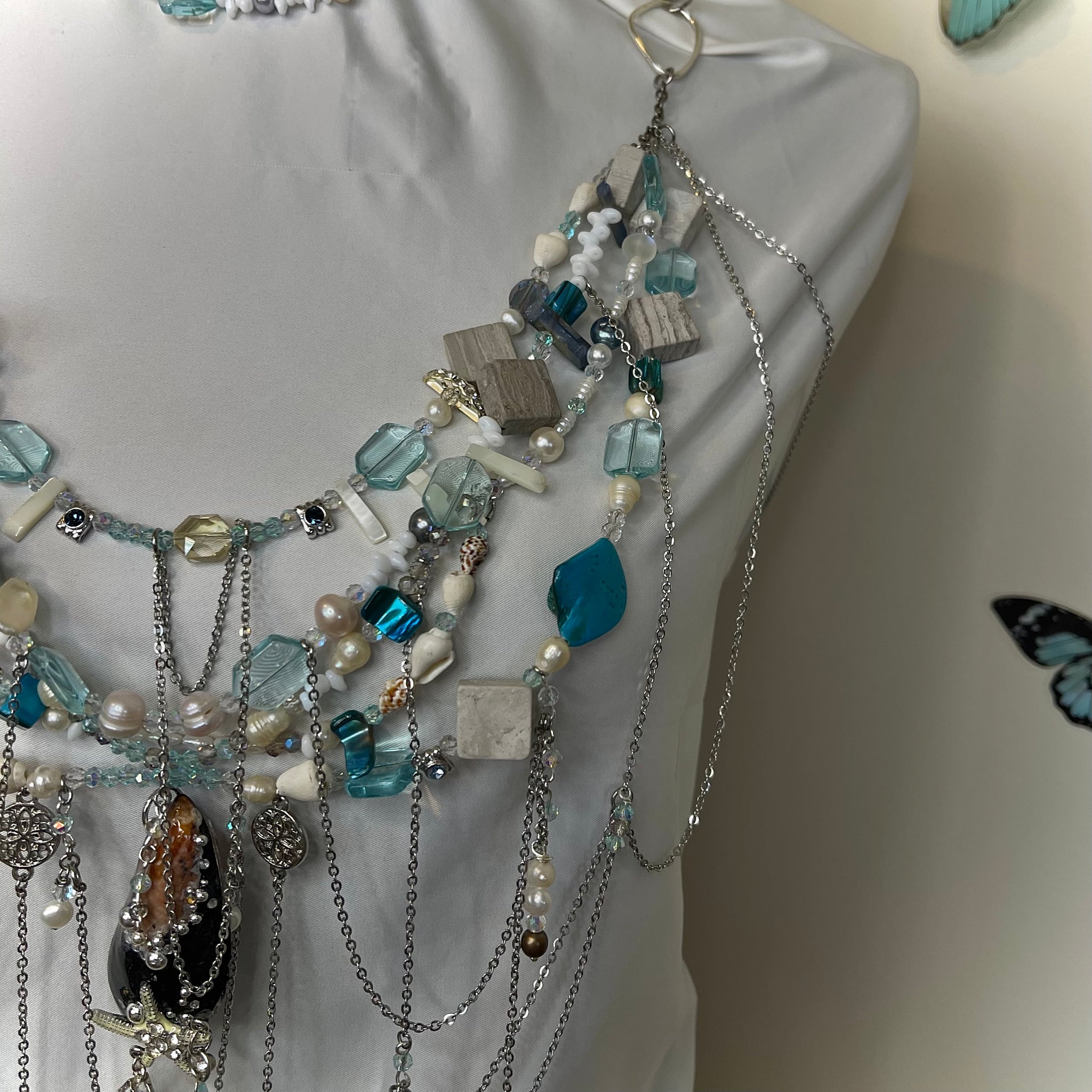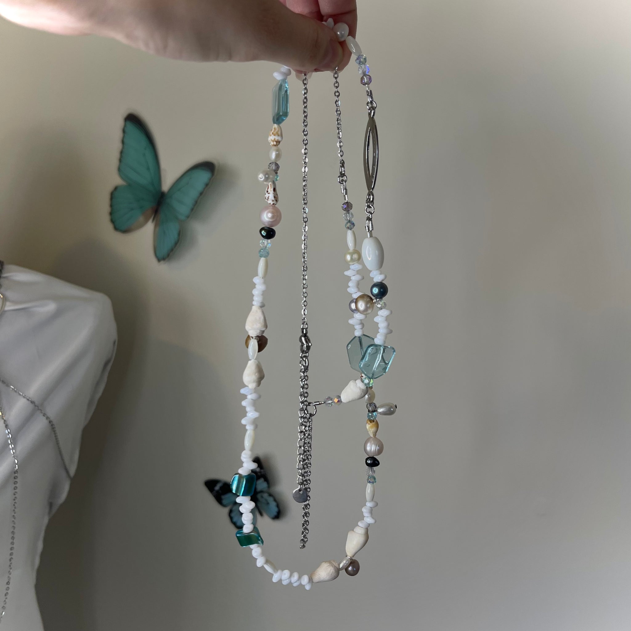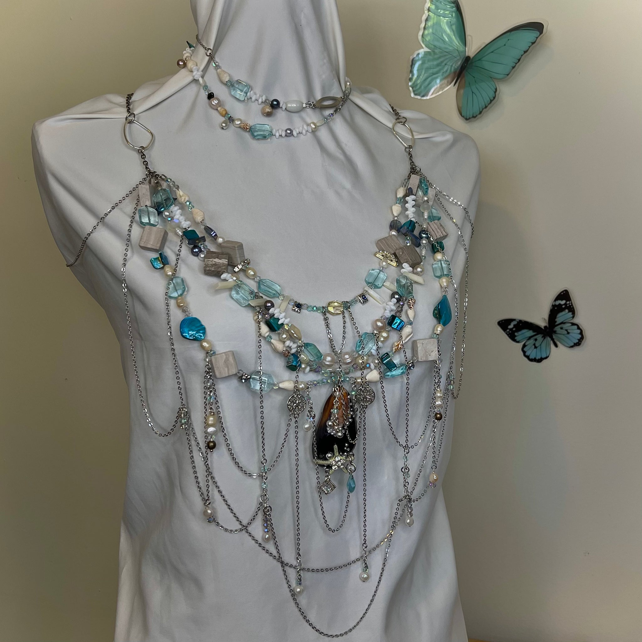 Made with: Glass, Freshwater pearls, Mother of pearl, Shell, Blue luster, Antique Charms, Cream marble and stainless steel