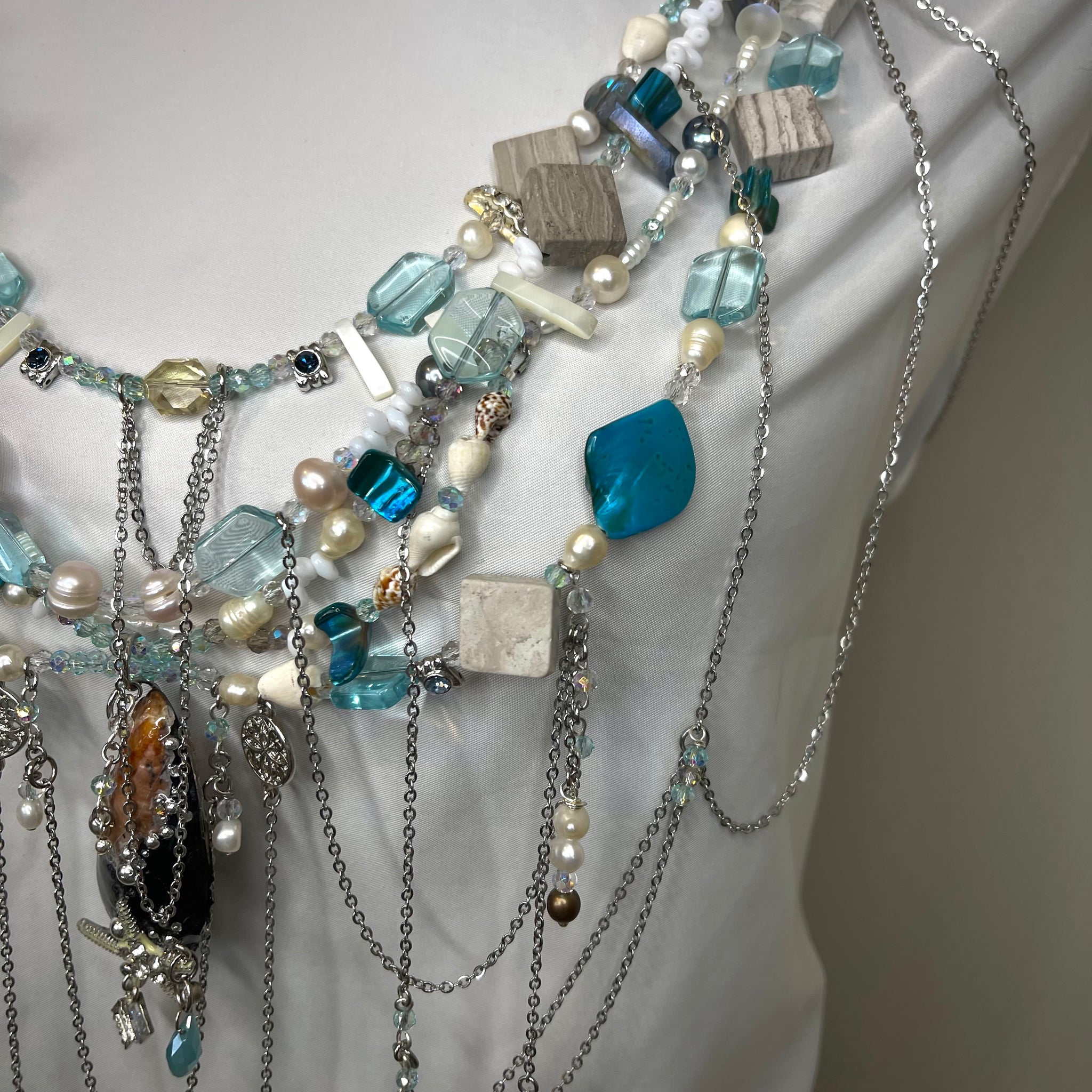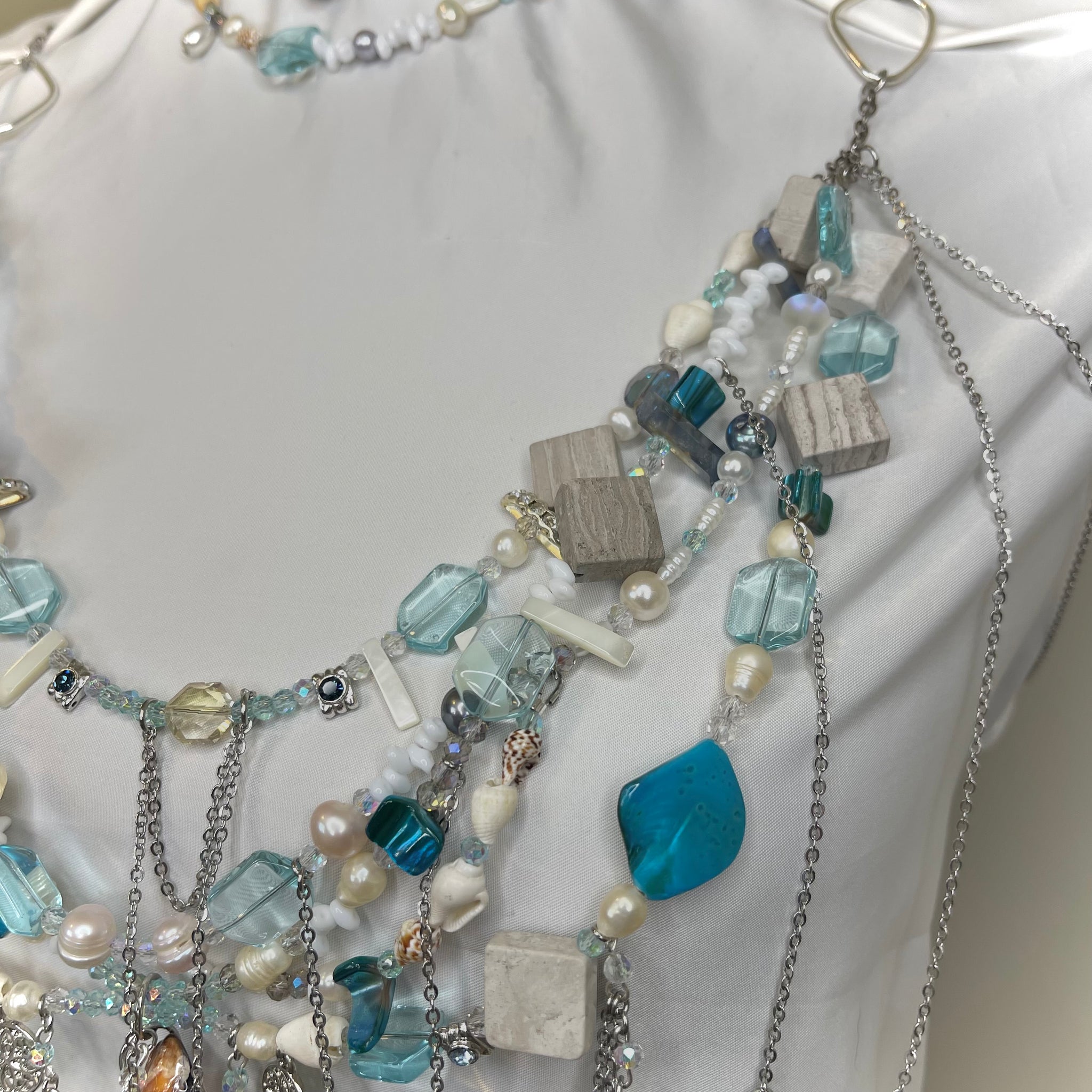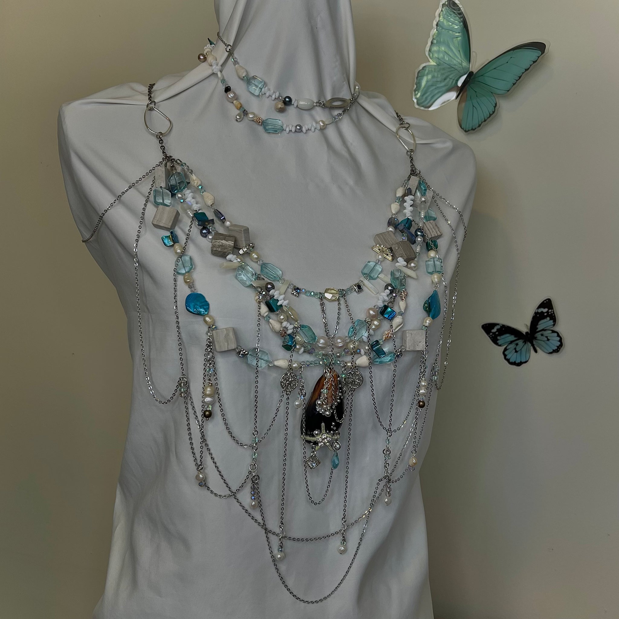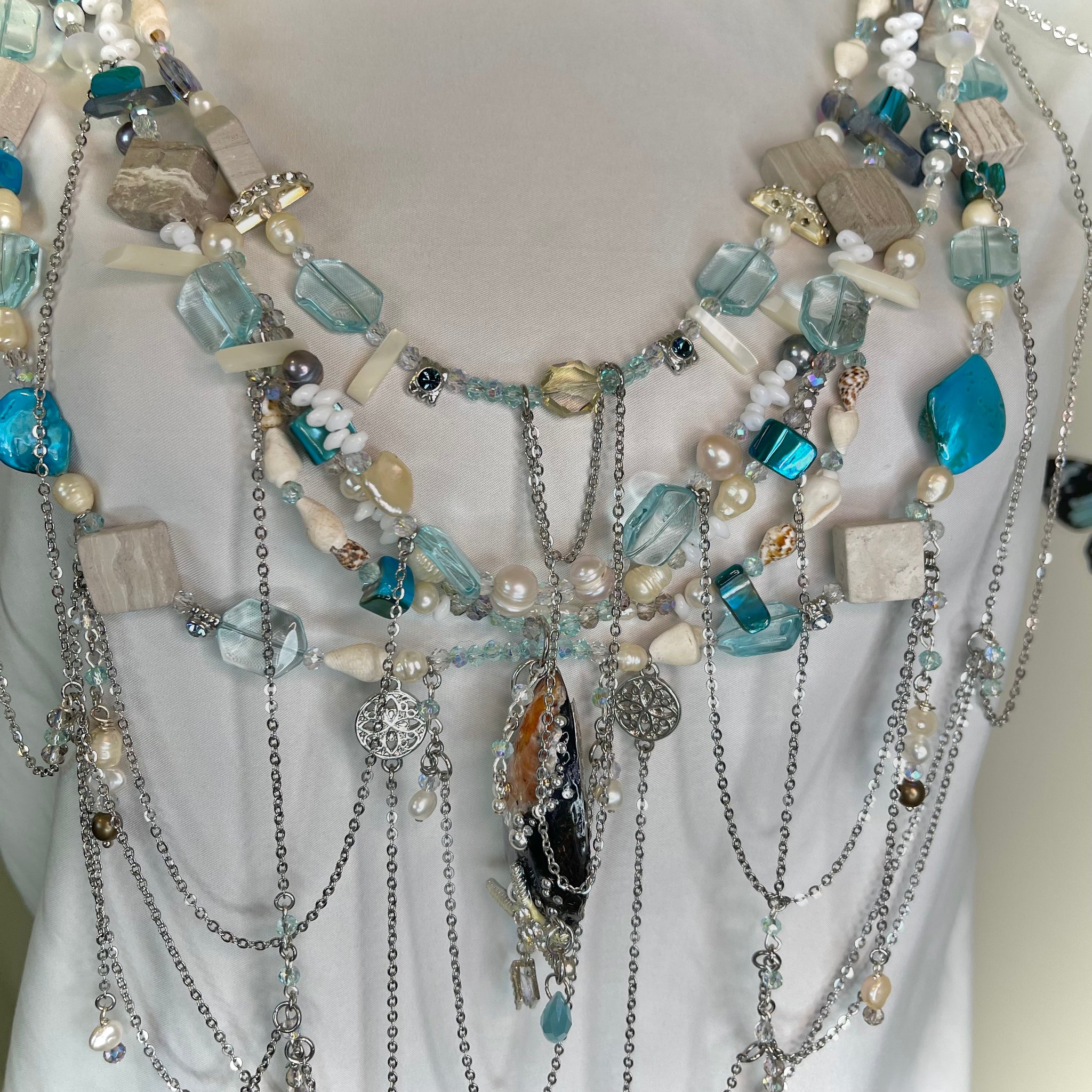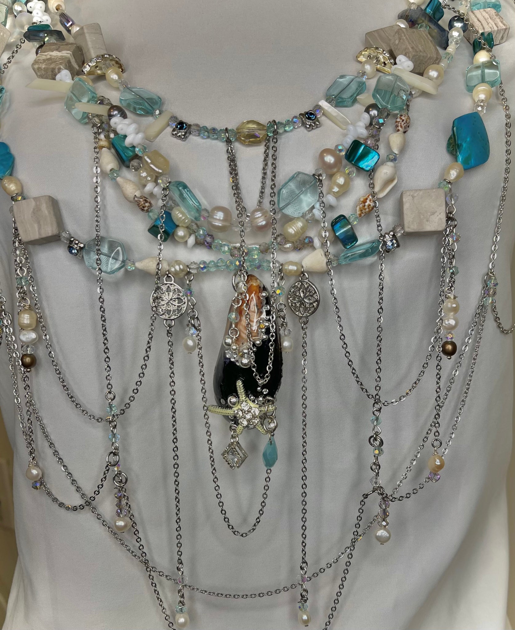 Made with: Glass, Freshwater pearls, Mother of pearl, Shell, Blue luster, Antique Charms, Cream marble and stainless steel