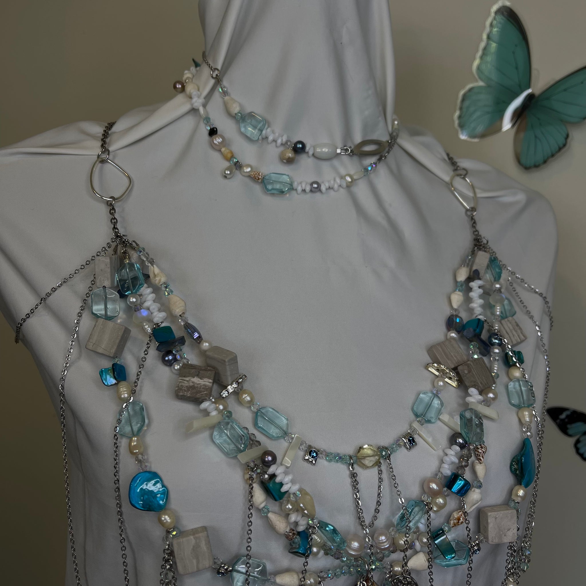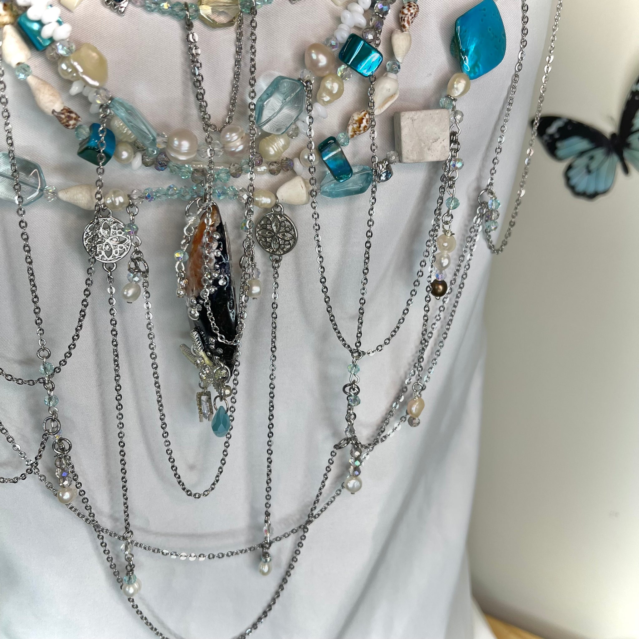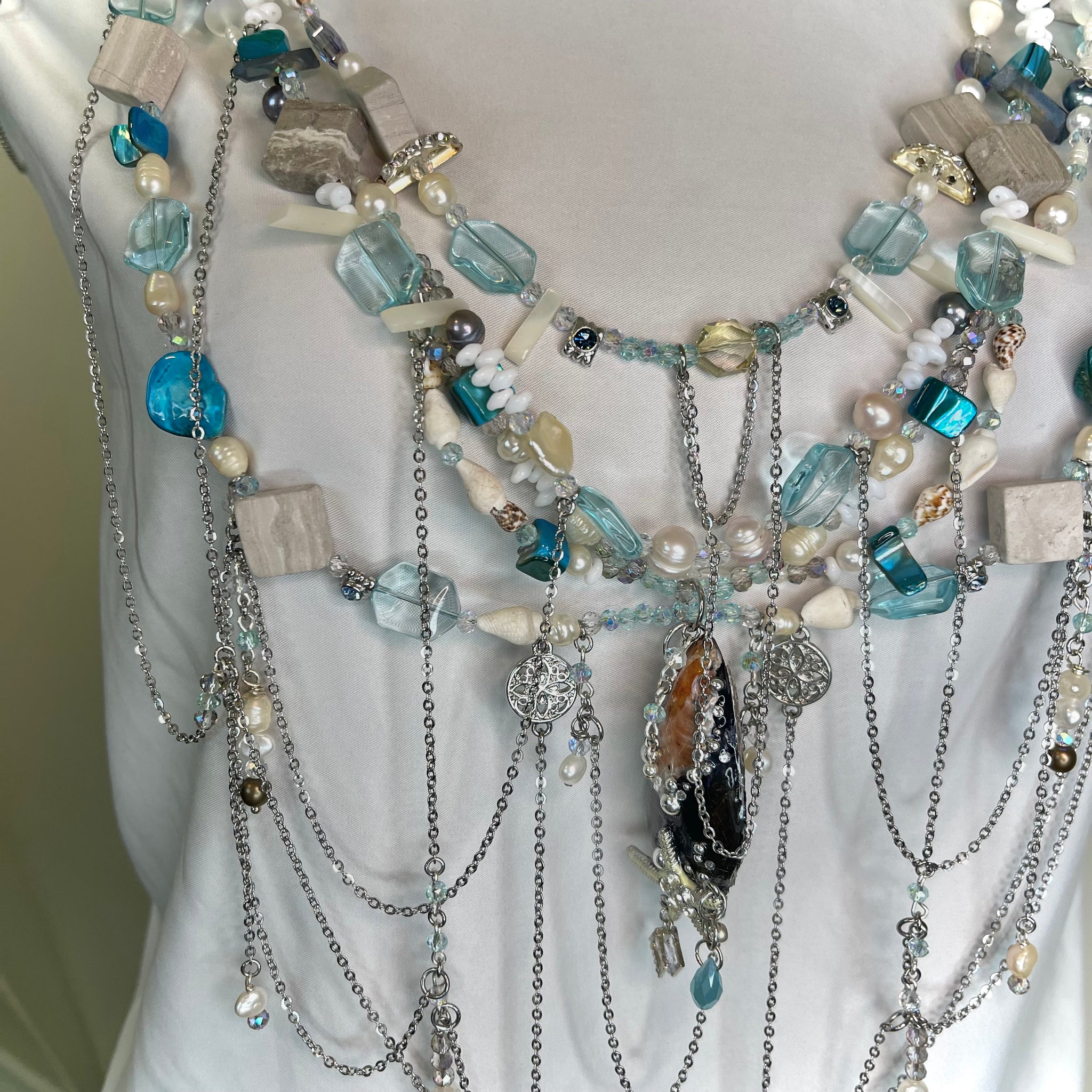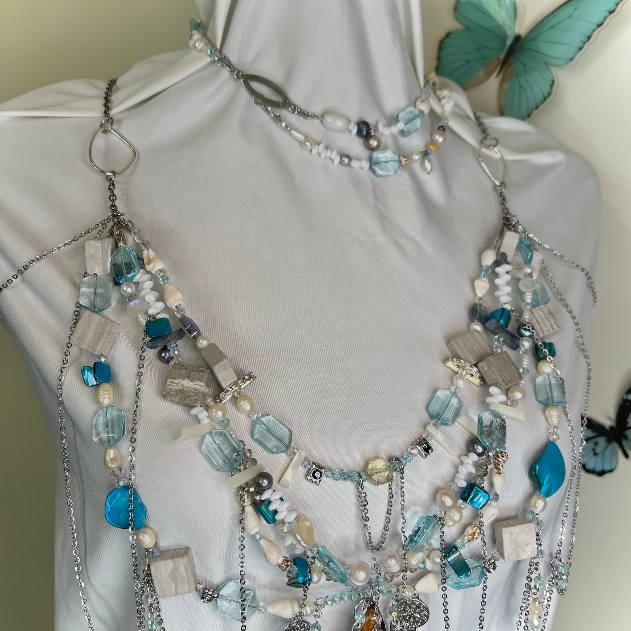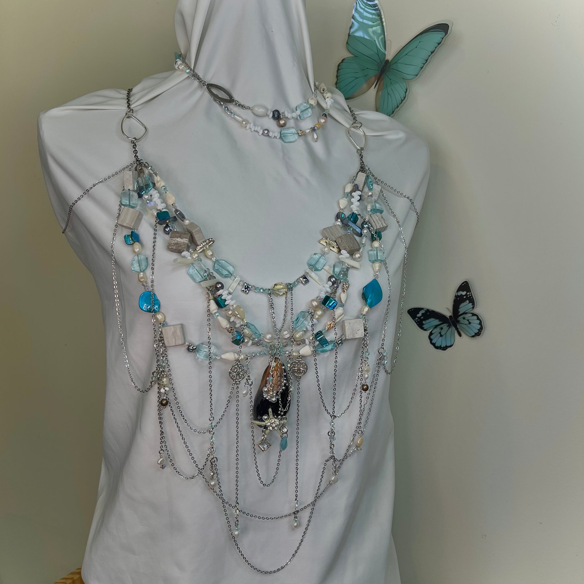 Made with: Glass, Freshwater pearls, Mother of pearl, Shell, Blue luster, Antique Charms, Cream marble and stainless steel