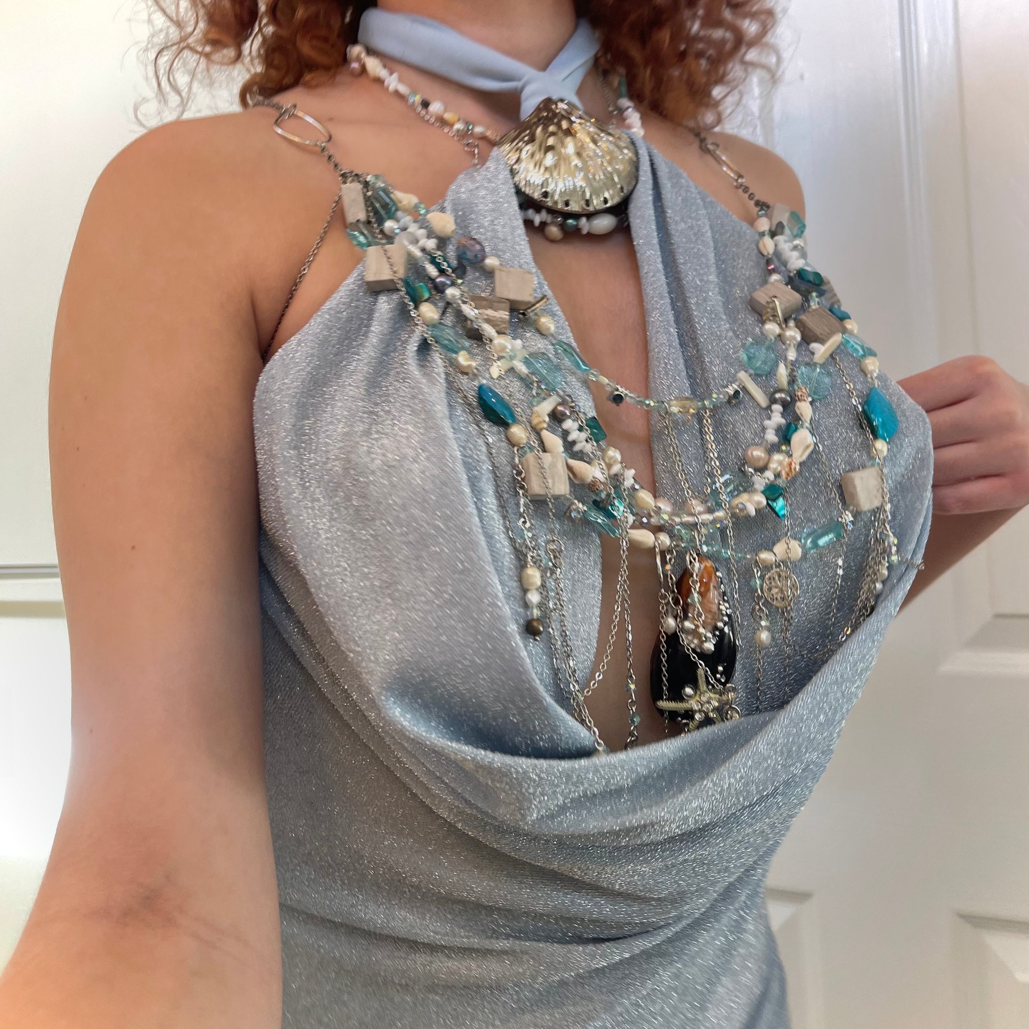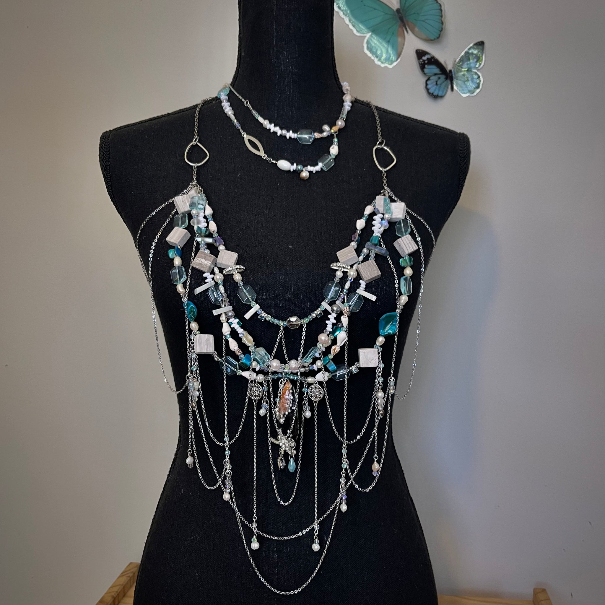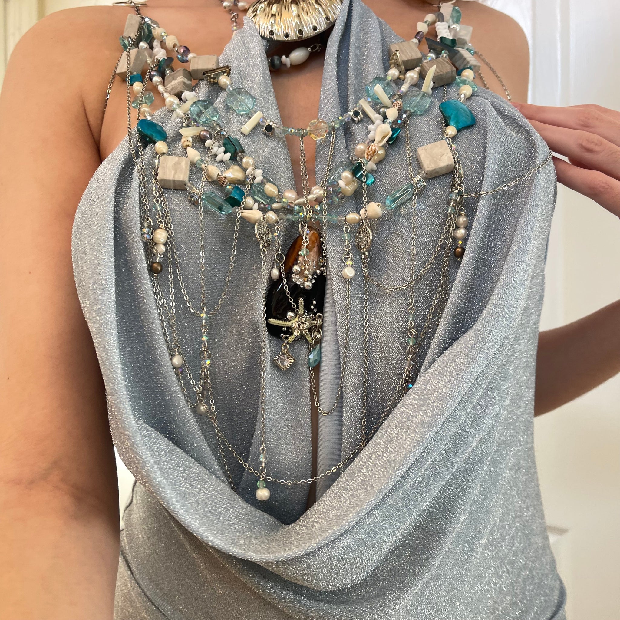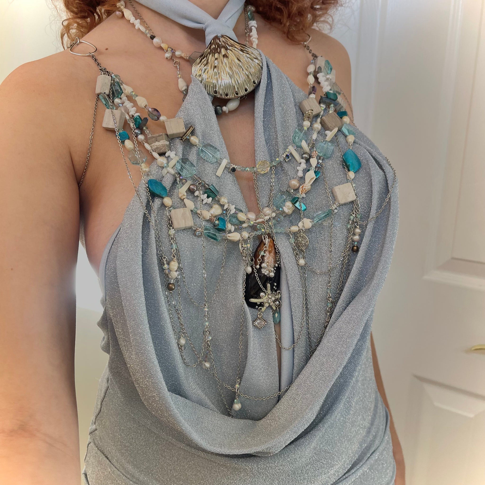 Made with: Glass, Freshwater pearls, Mother of pearl, Shell, Blue luster, Antique Charms, Cream marble and stainless steel
