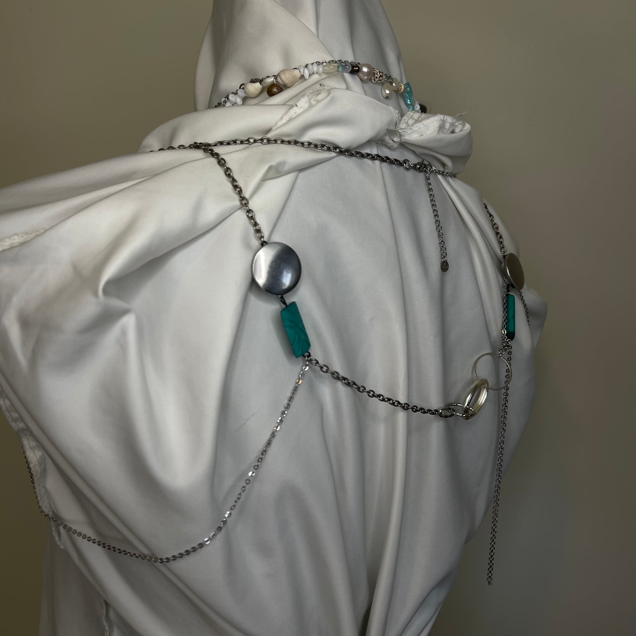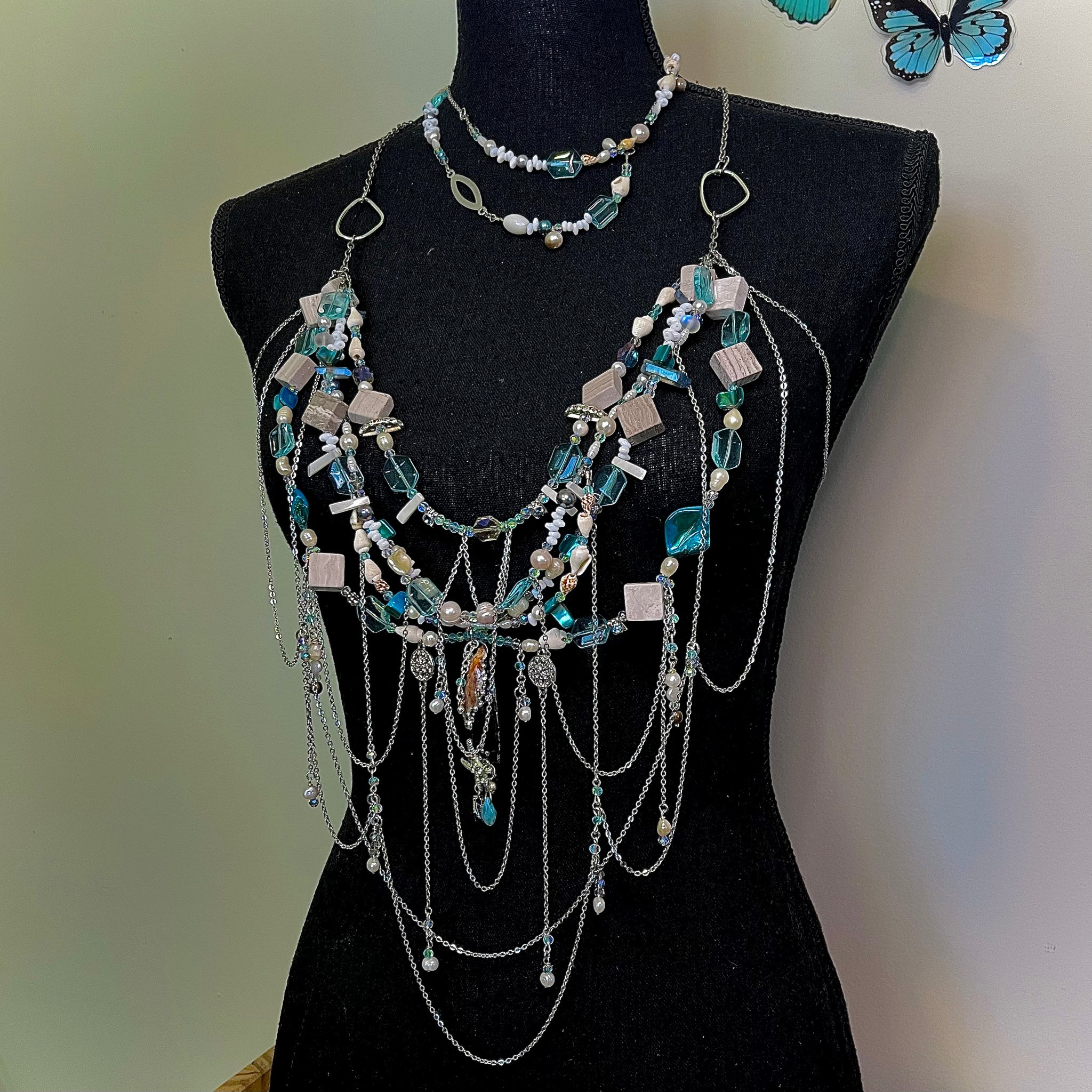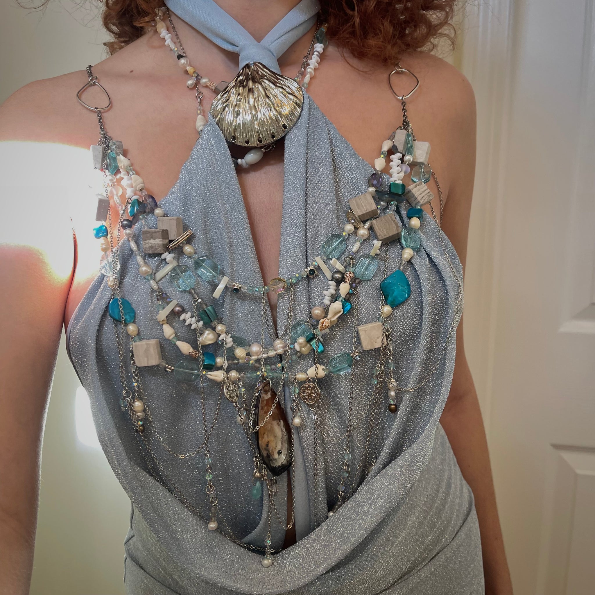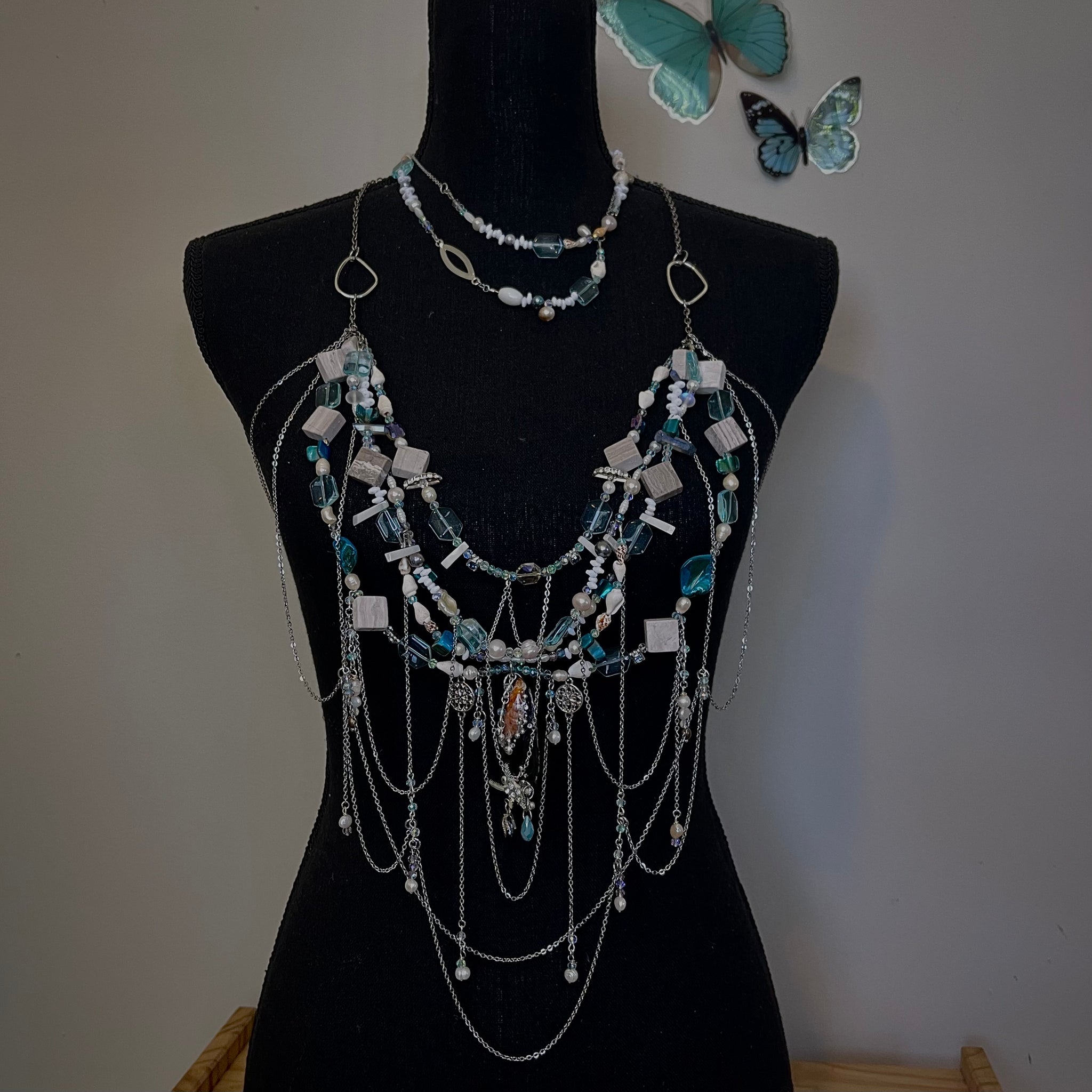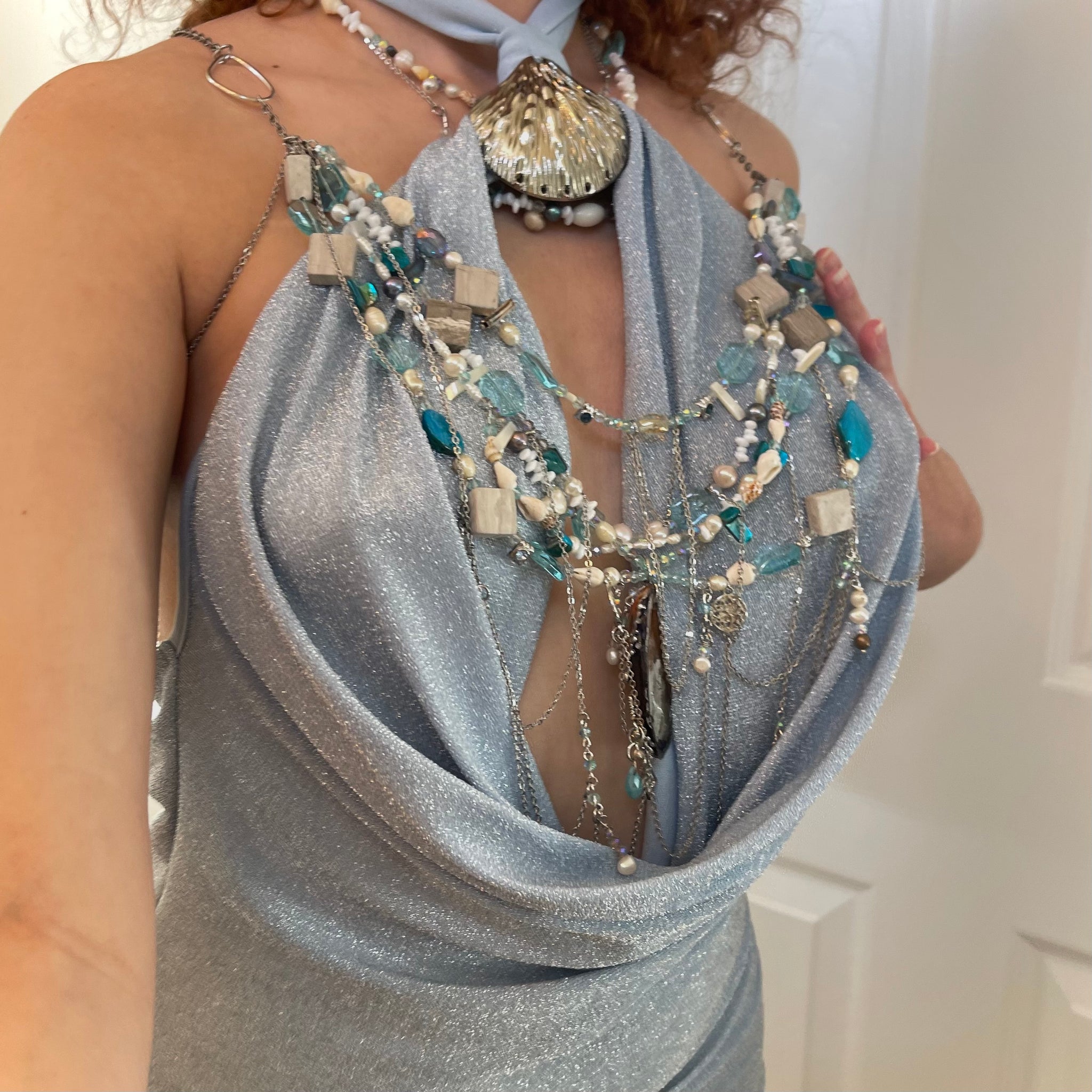 Made with: Glass, Freshwater pearls, Mother of pearl, Shell, Blue luster, Antique Charms, Cream marble and stainless steel