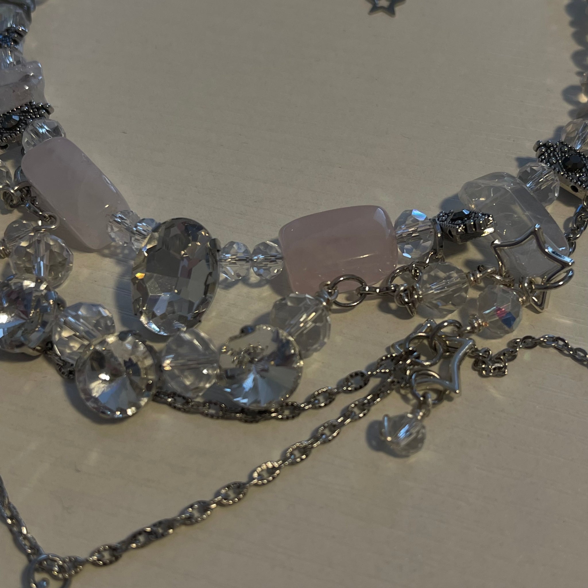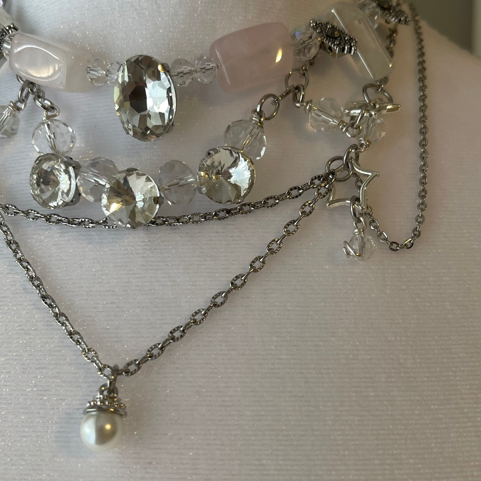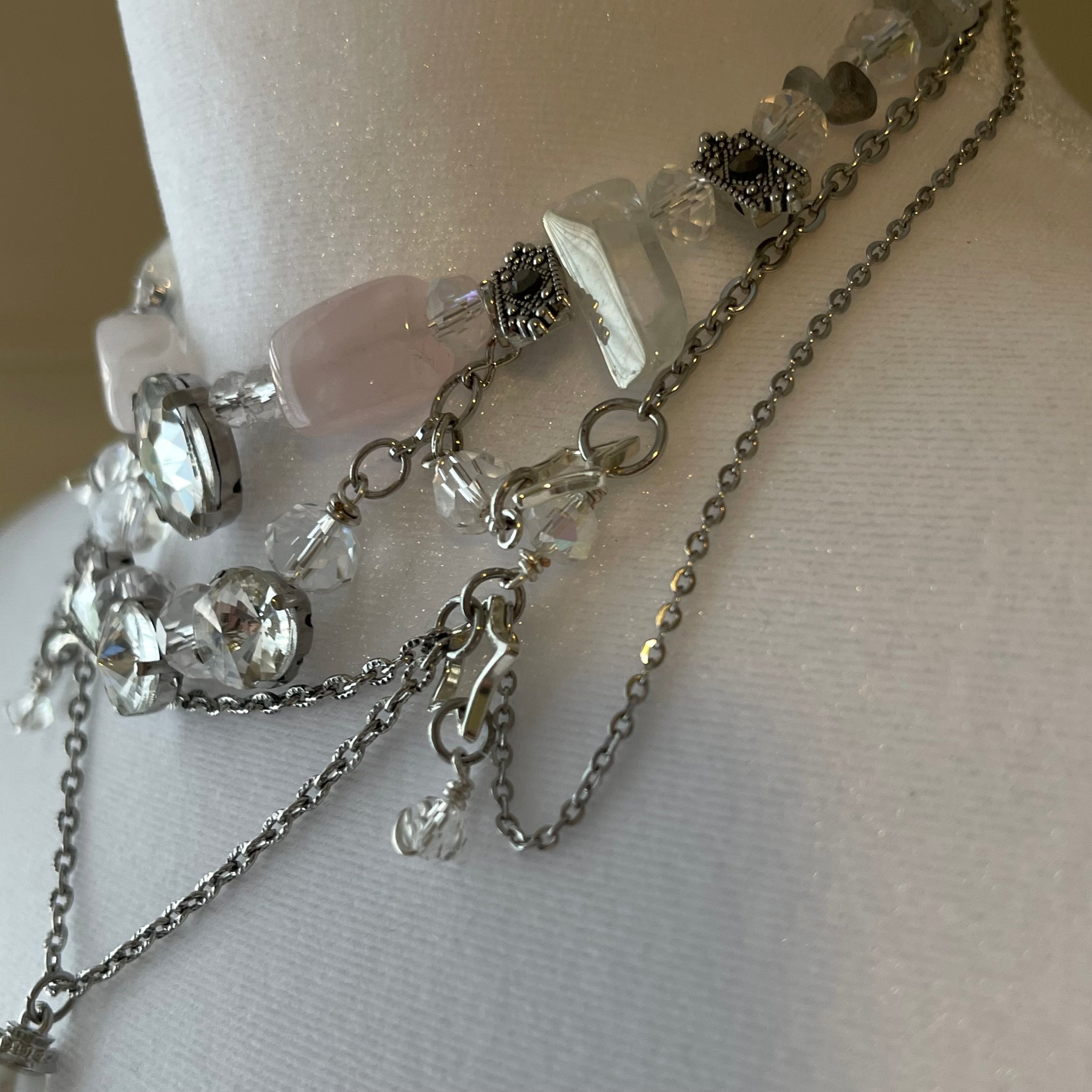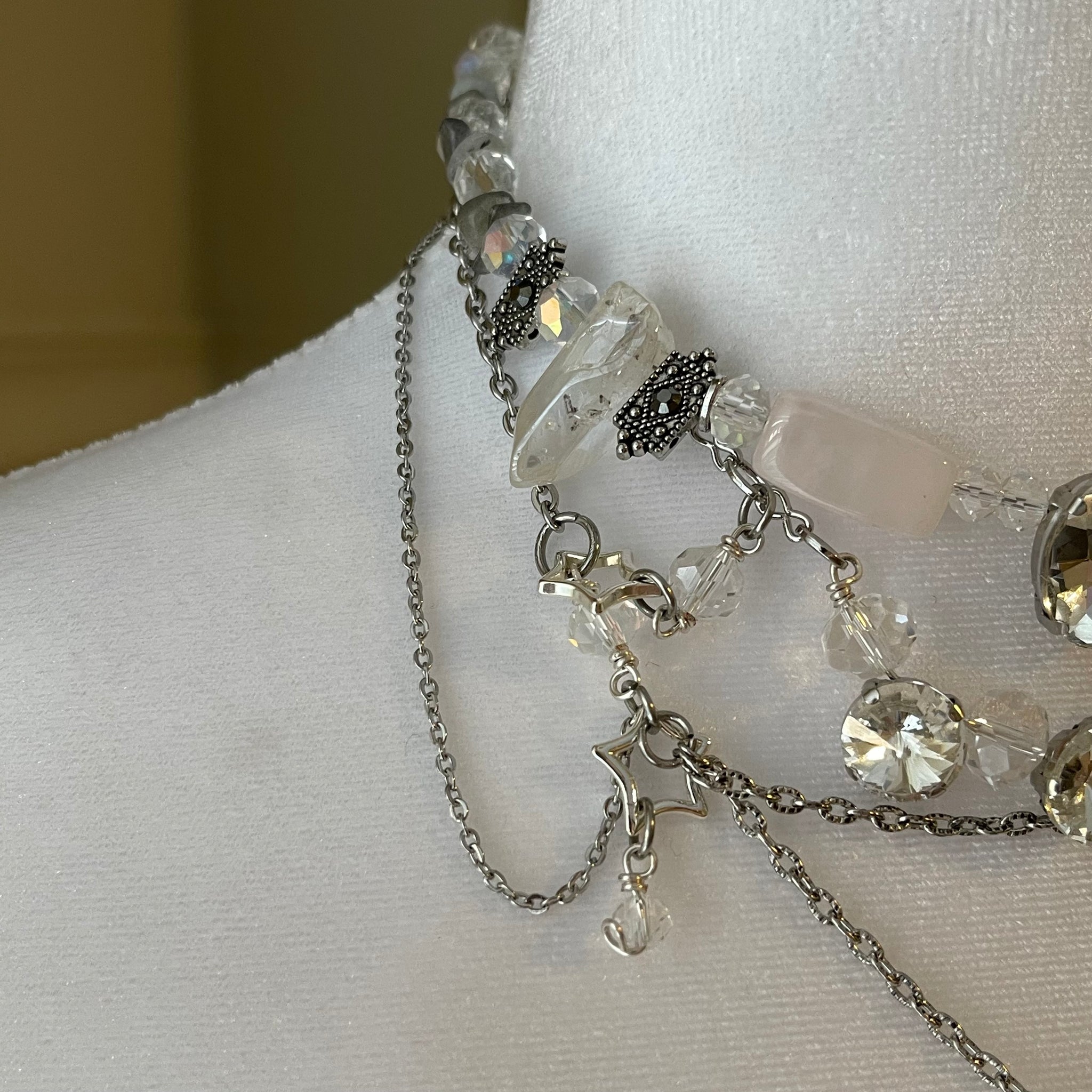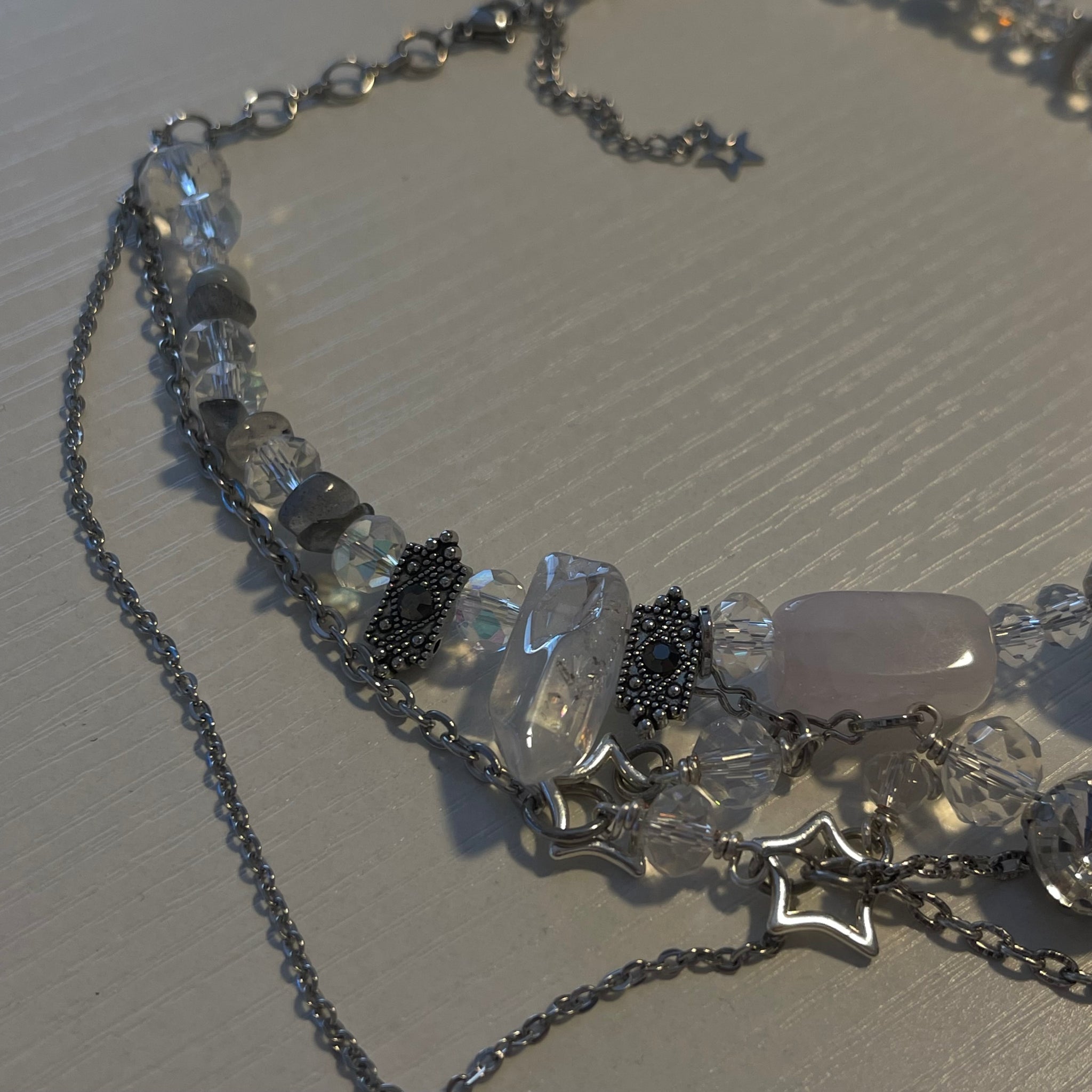 Made with: Glass, Quartz, Stainless steel, labradorite, metal charms.