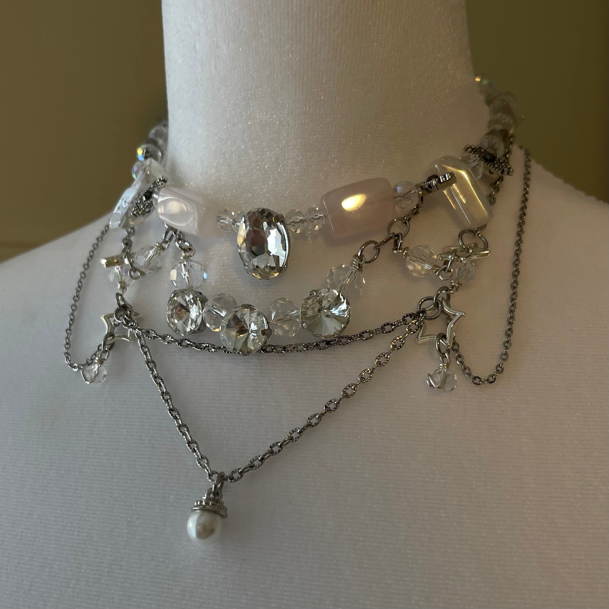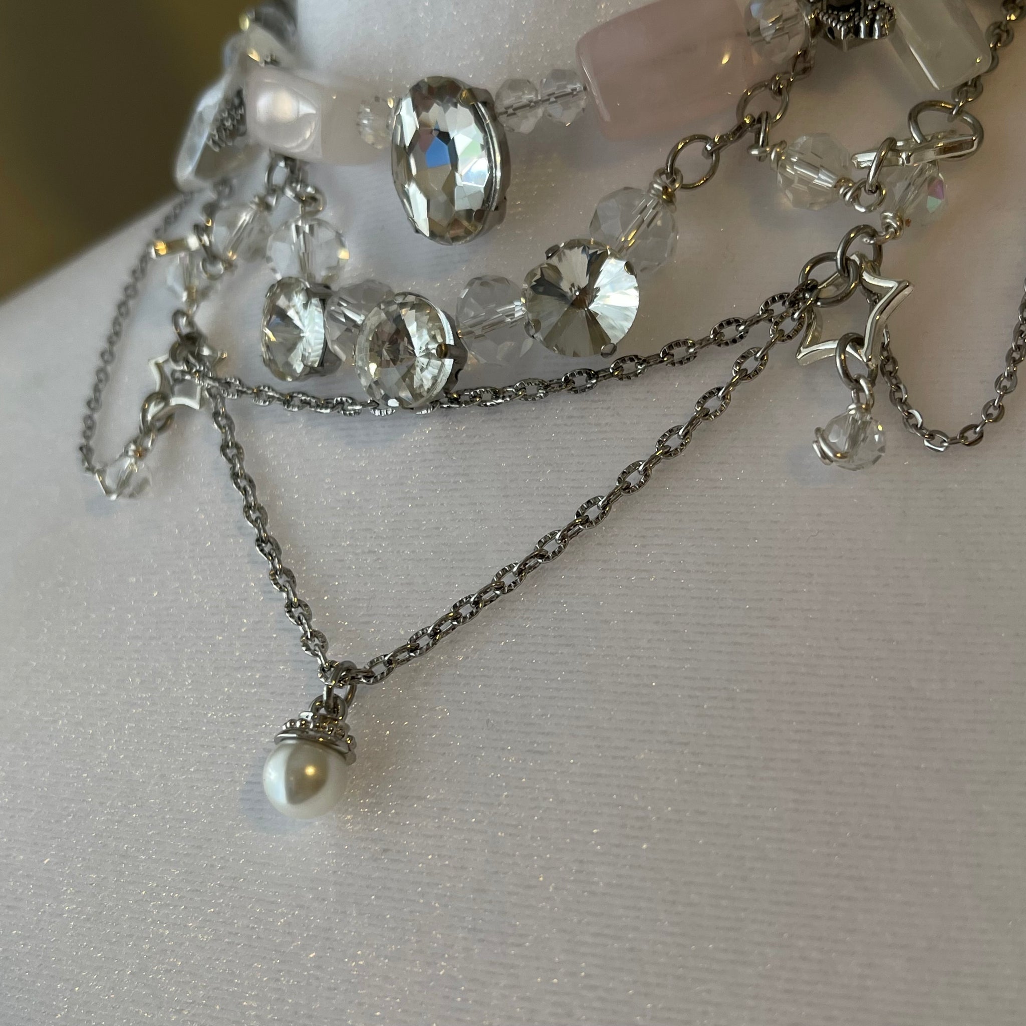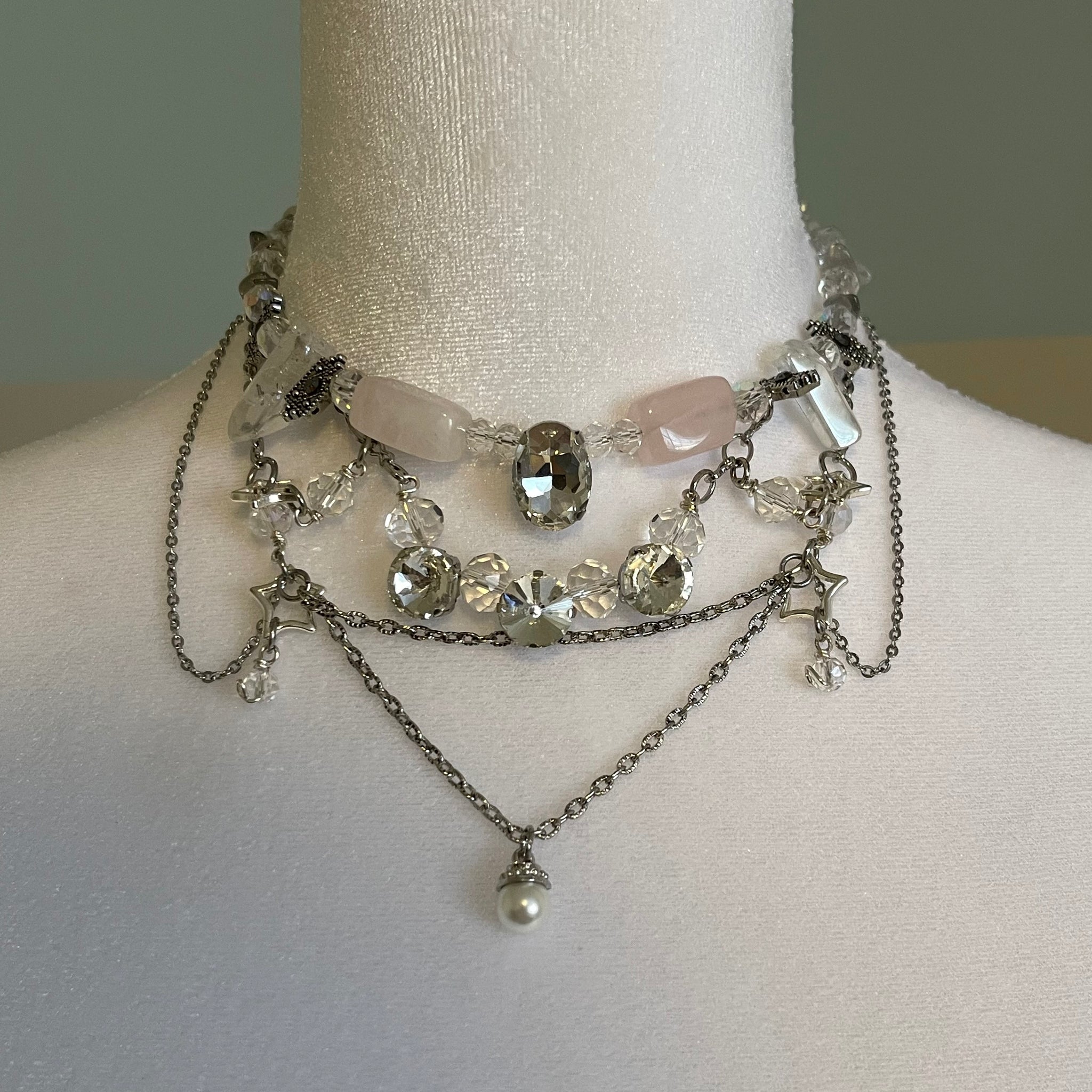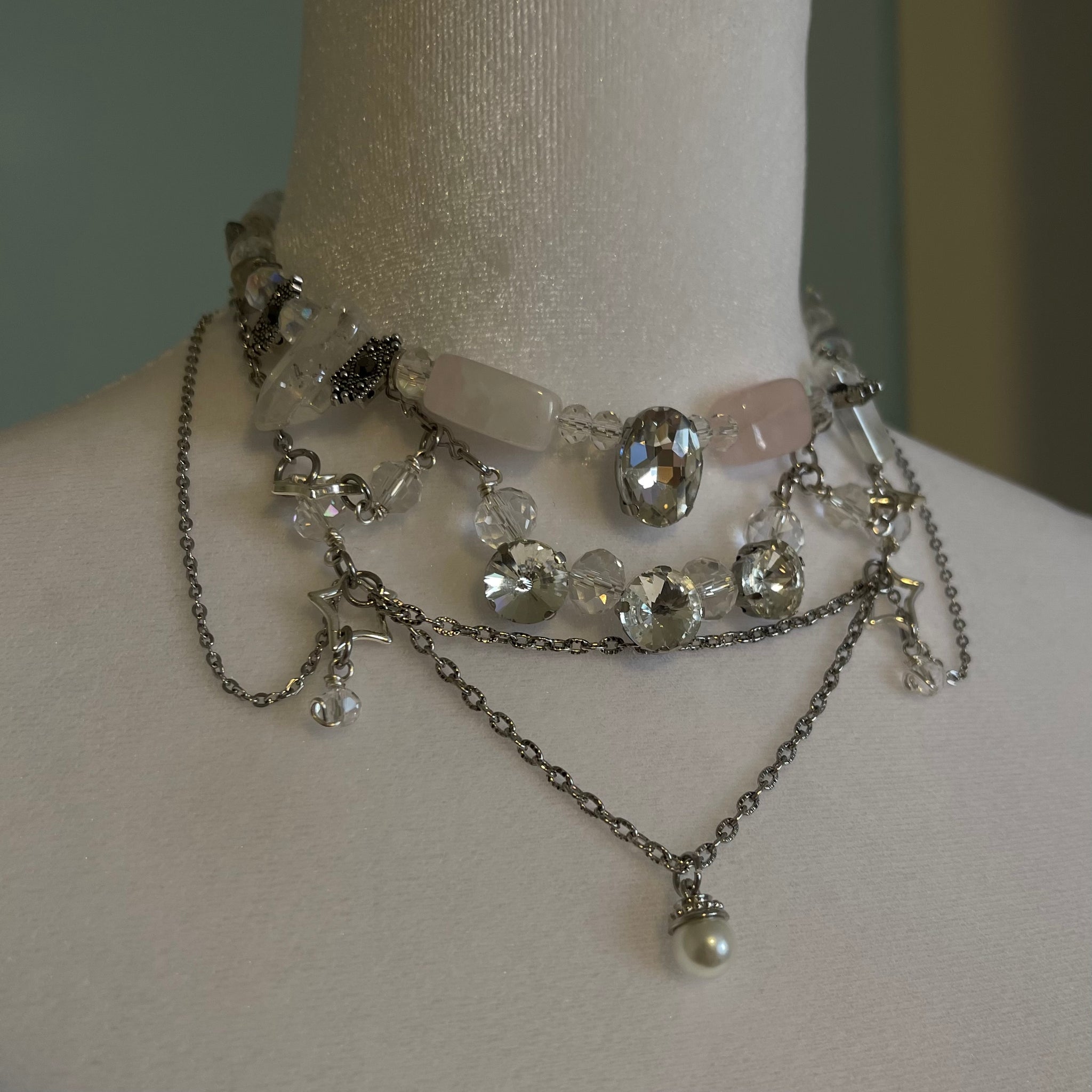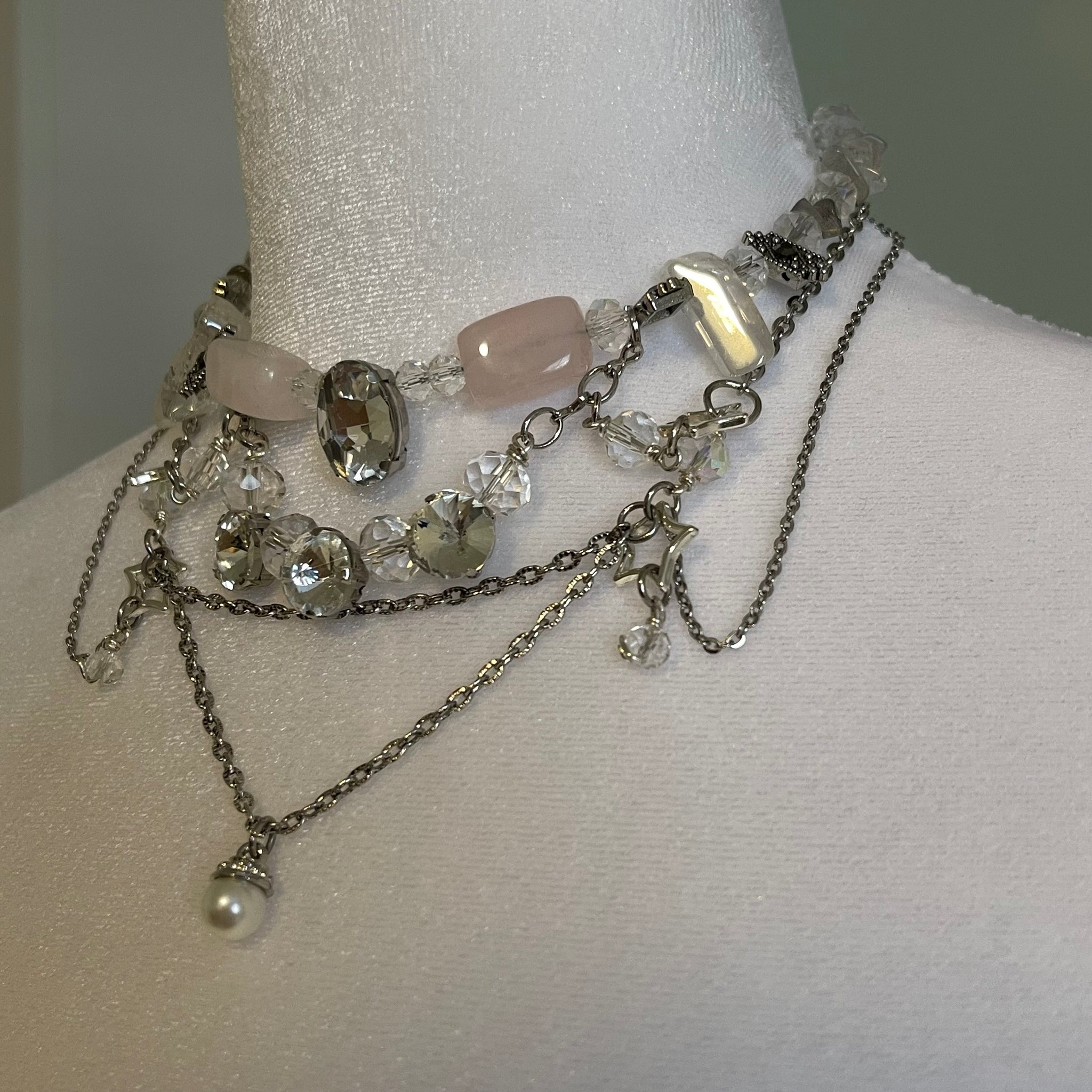 Made with: Glass, Quartz, Stainless steel, labradorite, metal charms.