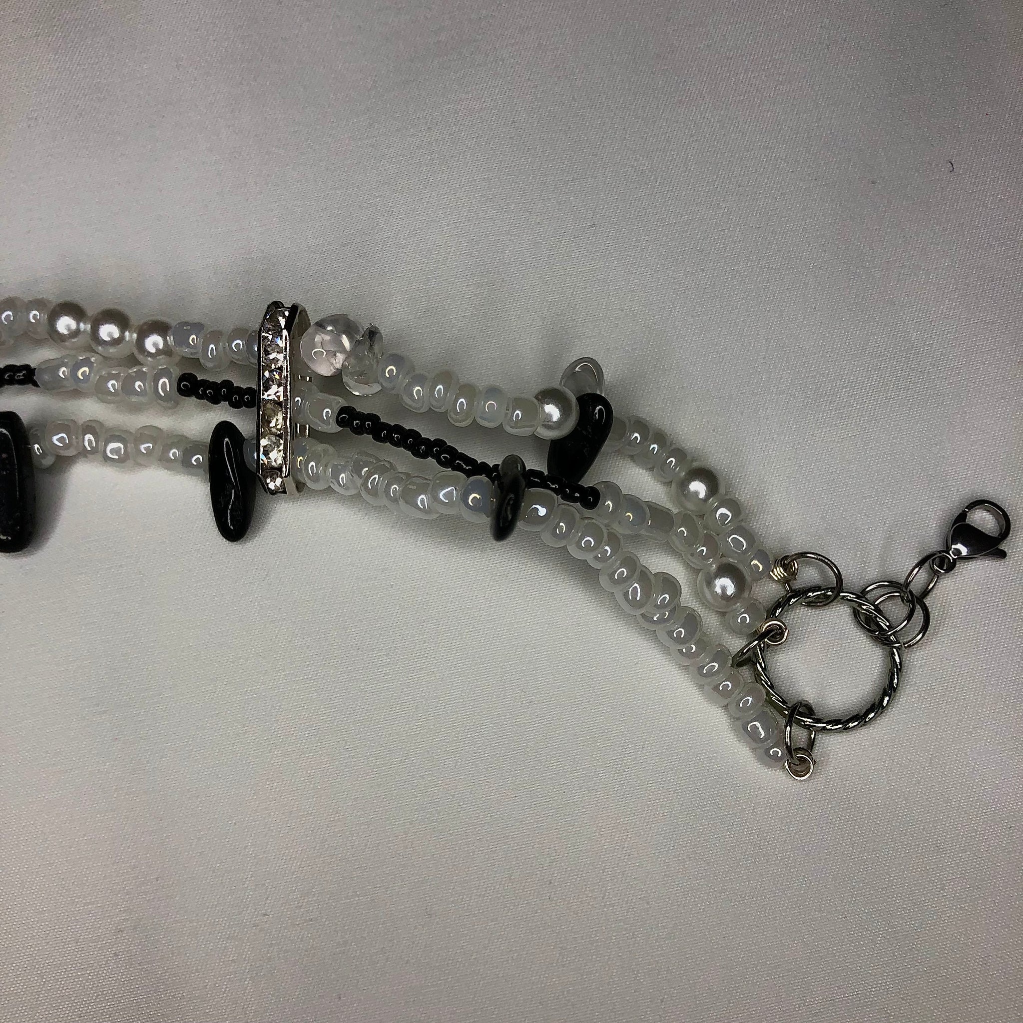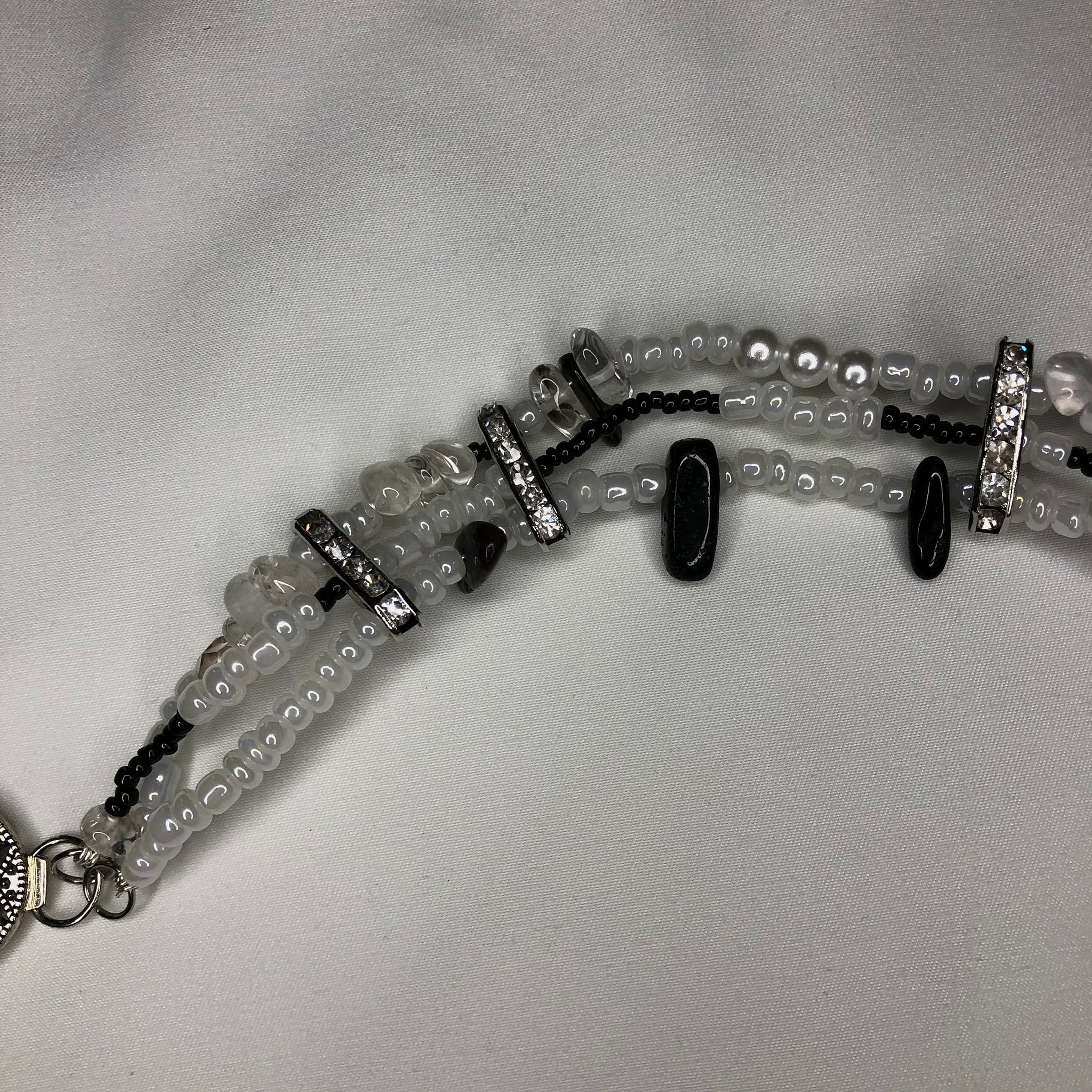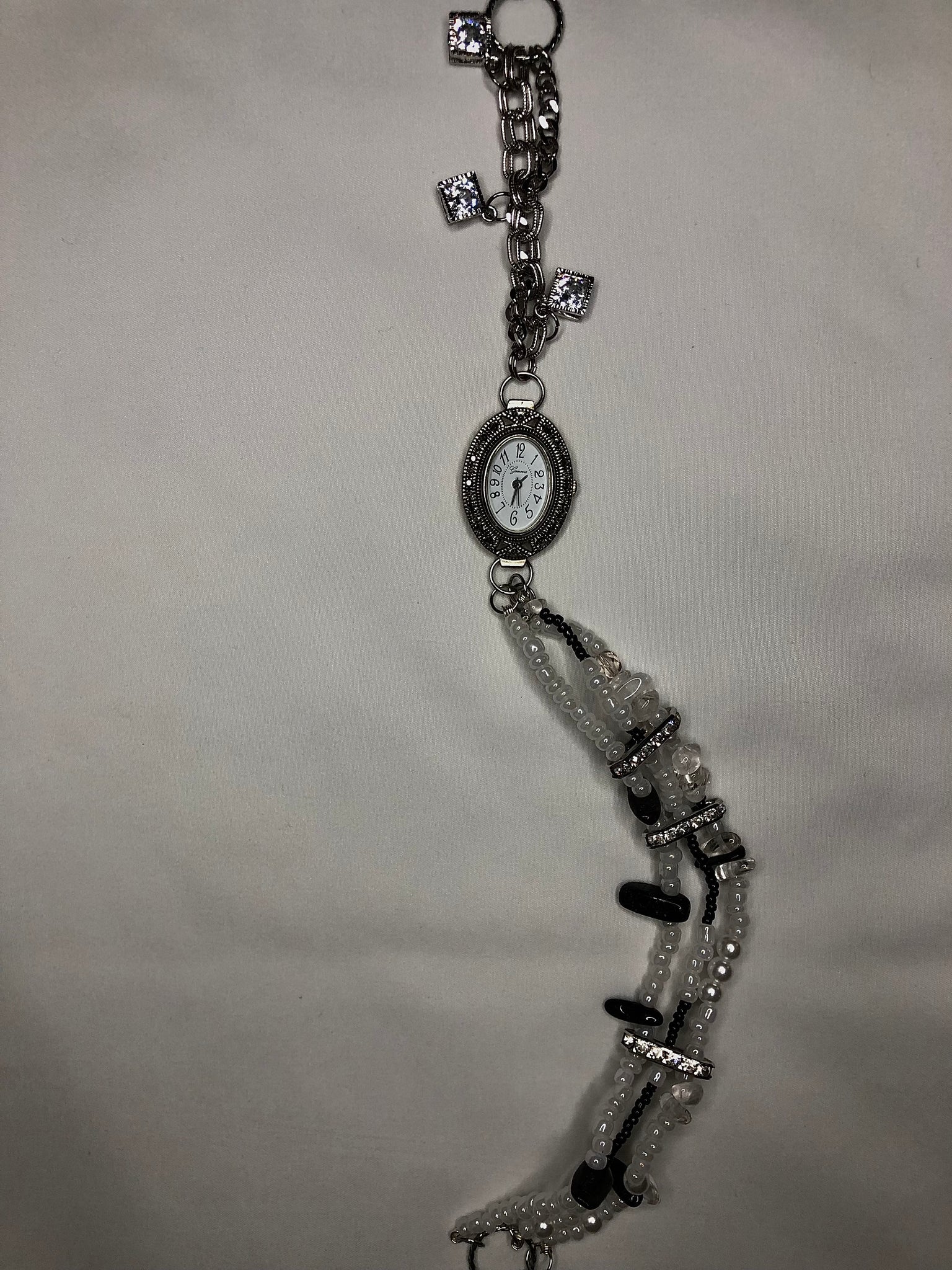 Made with Black Tourmaline, White Seed Beads, Zirconia, Clear Quartz, Stainless Steel, and a Geneva Watch Face.