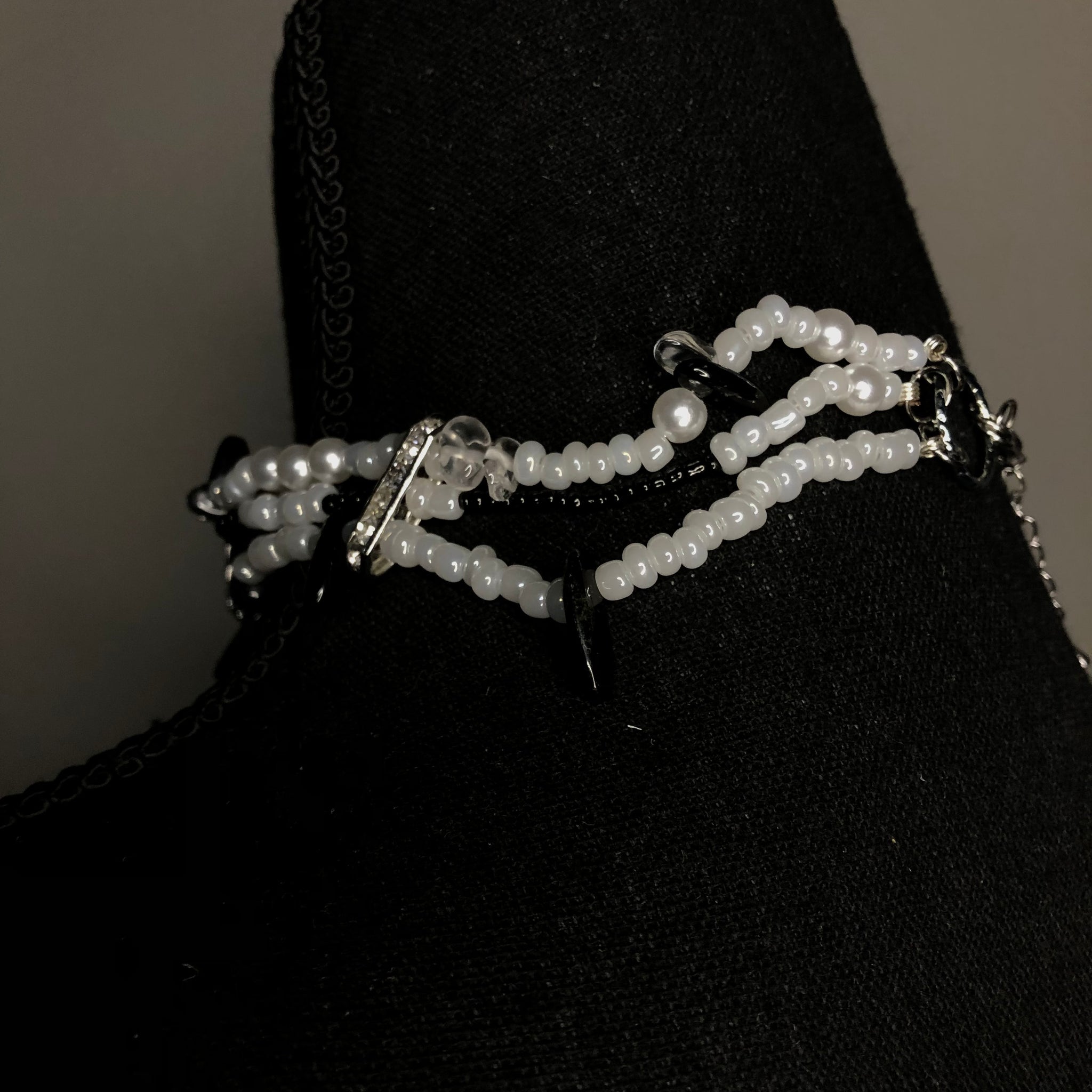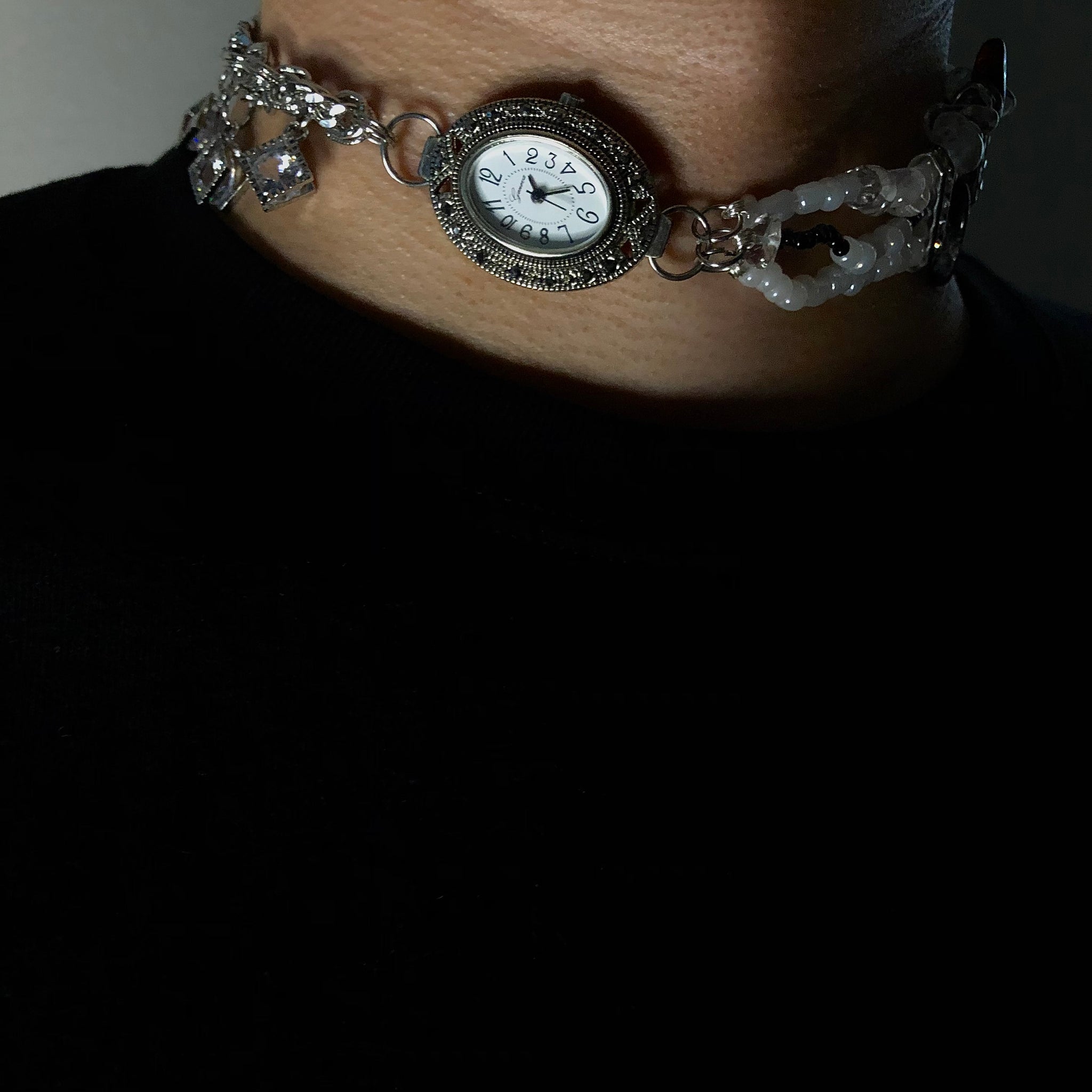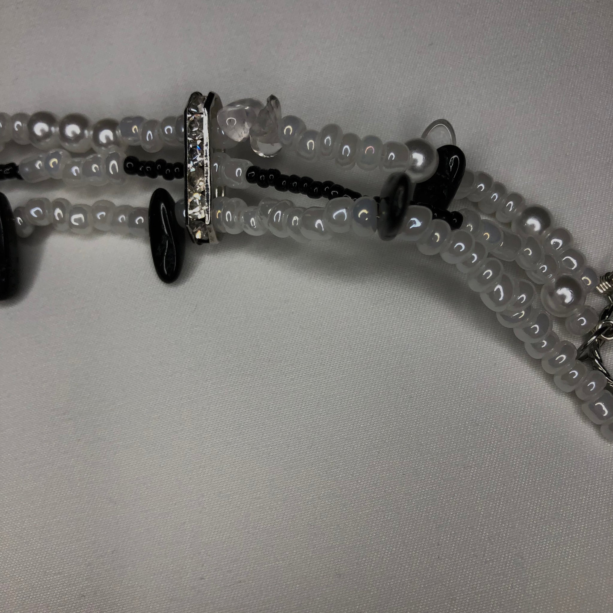 Made with Black Tourmaline, White Seed Beads, Zirconia, Clear Quartz, Stainless Steel, and a Geneva Watch Face.