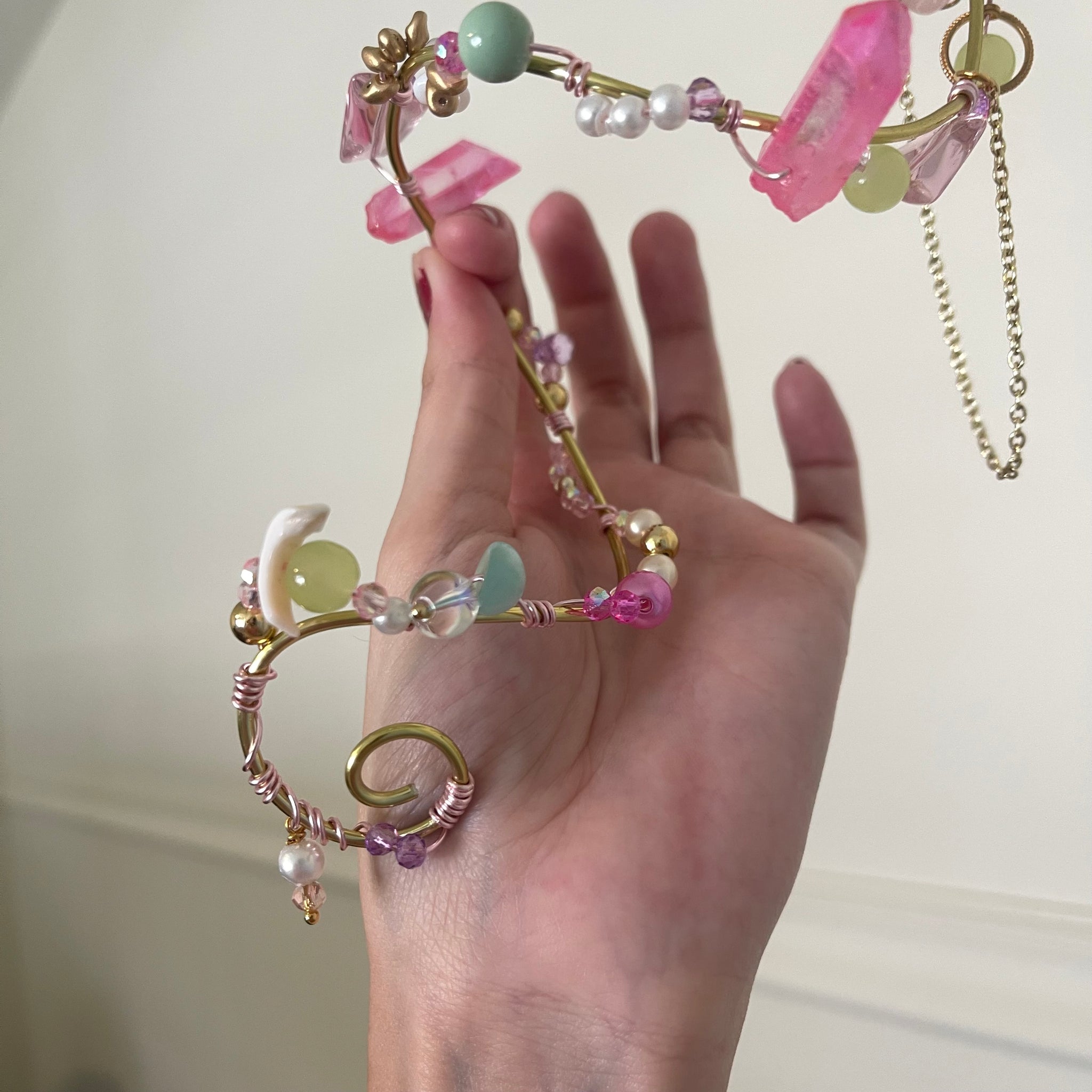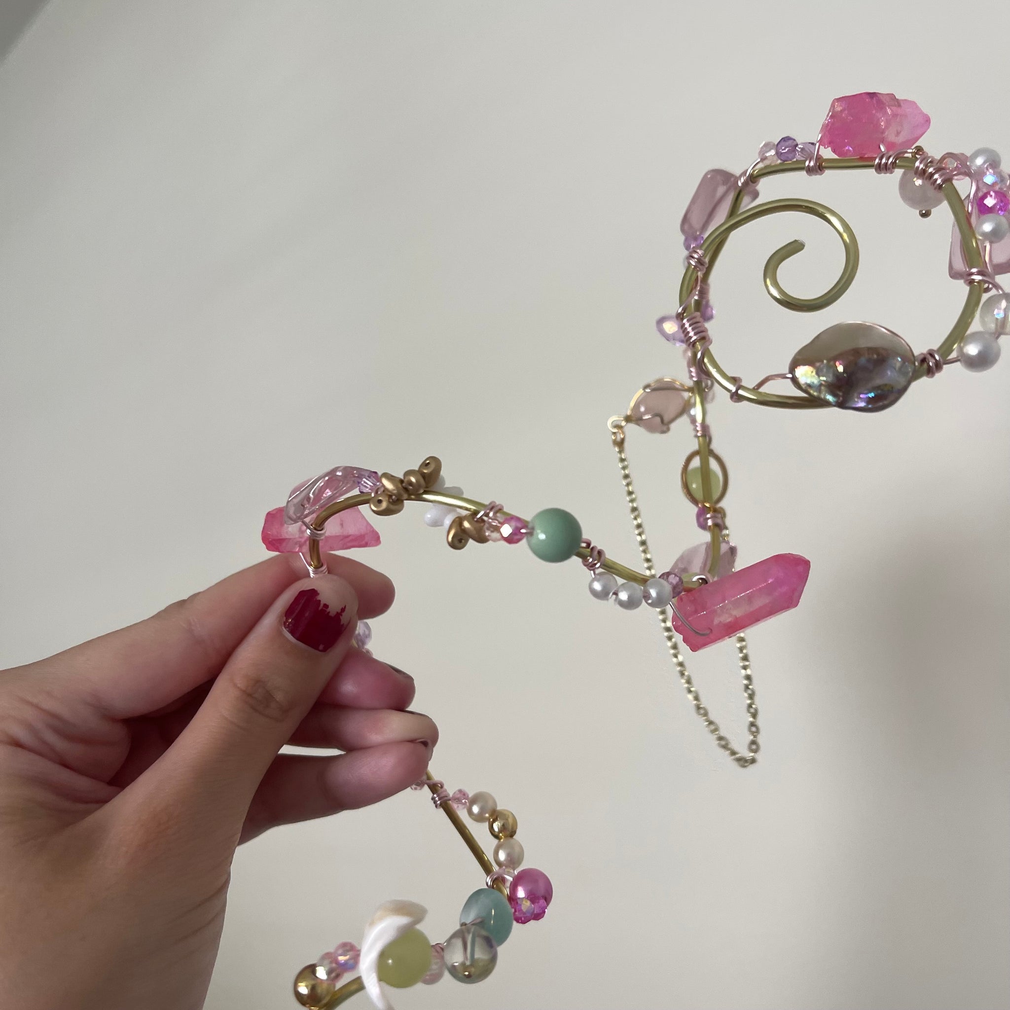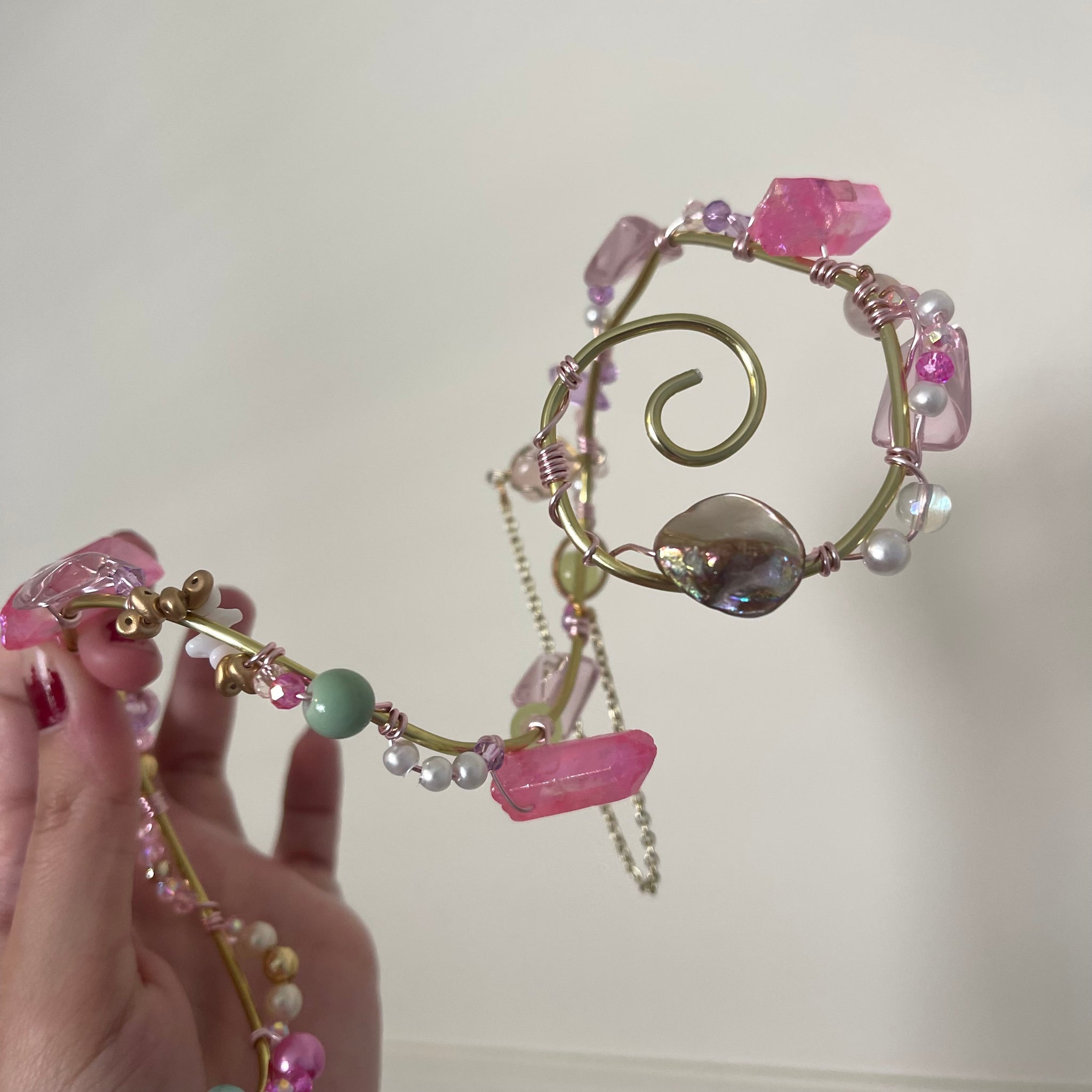 Made with: Shell, Glass, Rose quartz, Rhodium, Stainless steel chain, Pink luster.