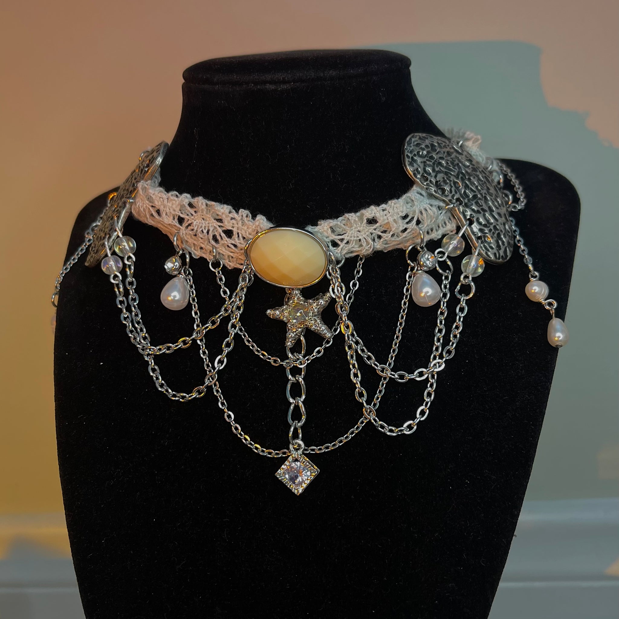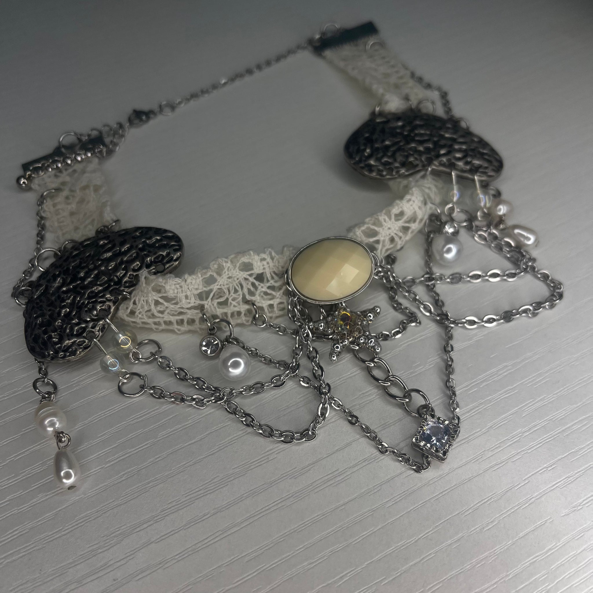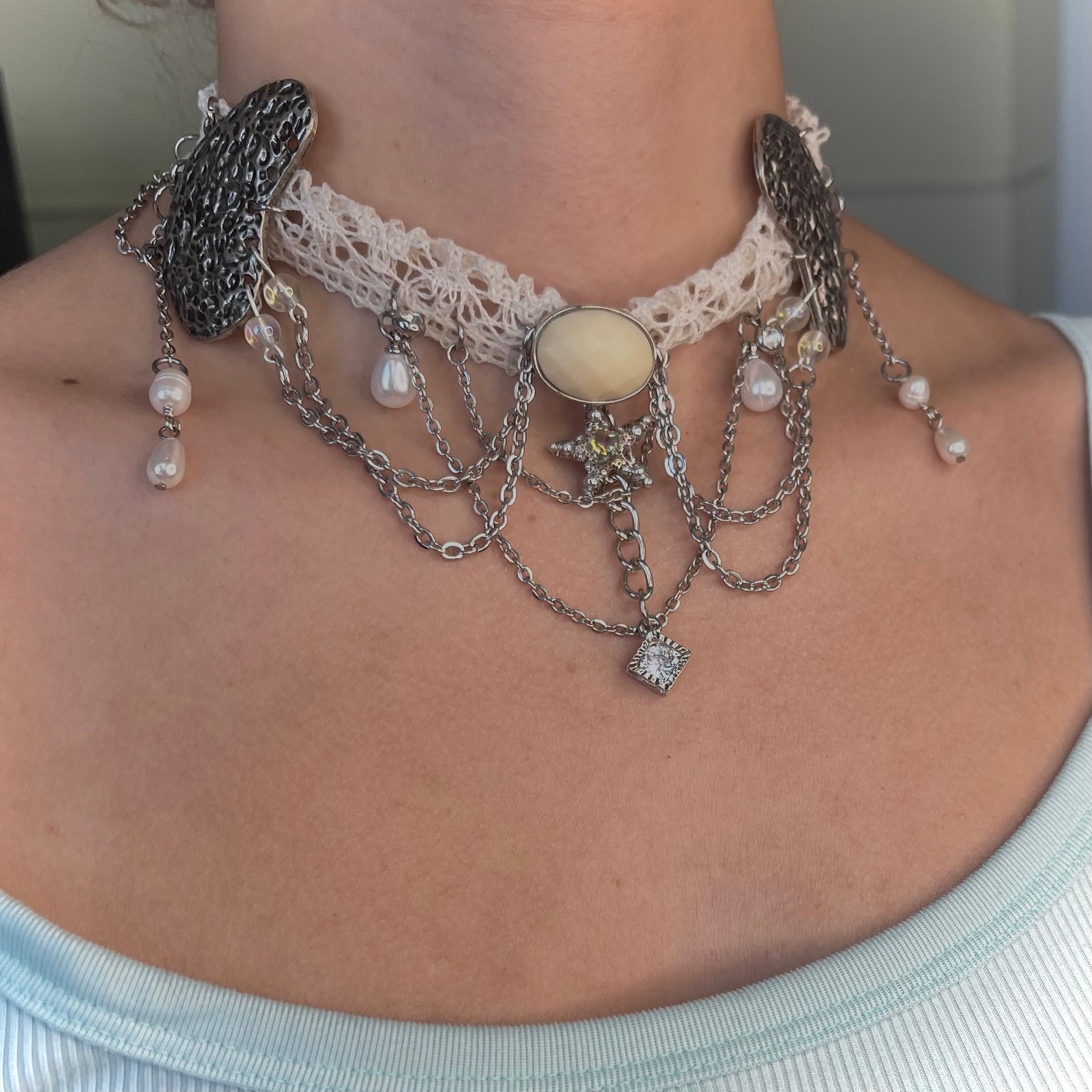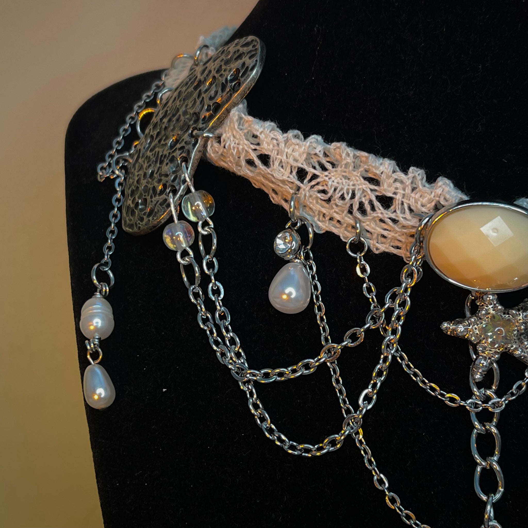 Made with: Resined charm, cloth, stainless steel, rhodium and freshwater pearls