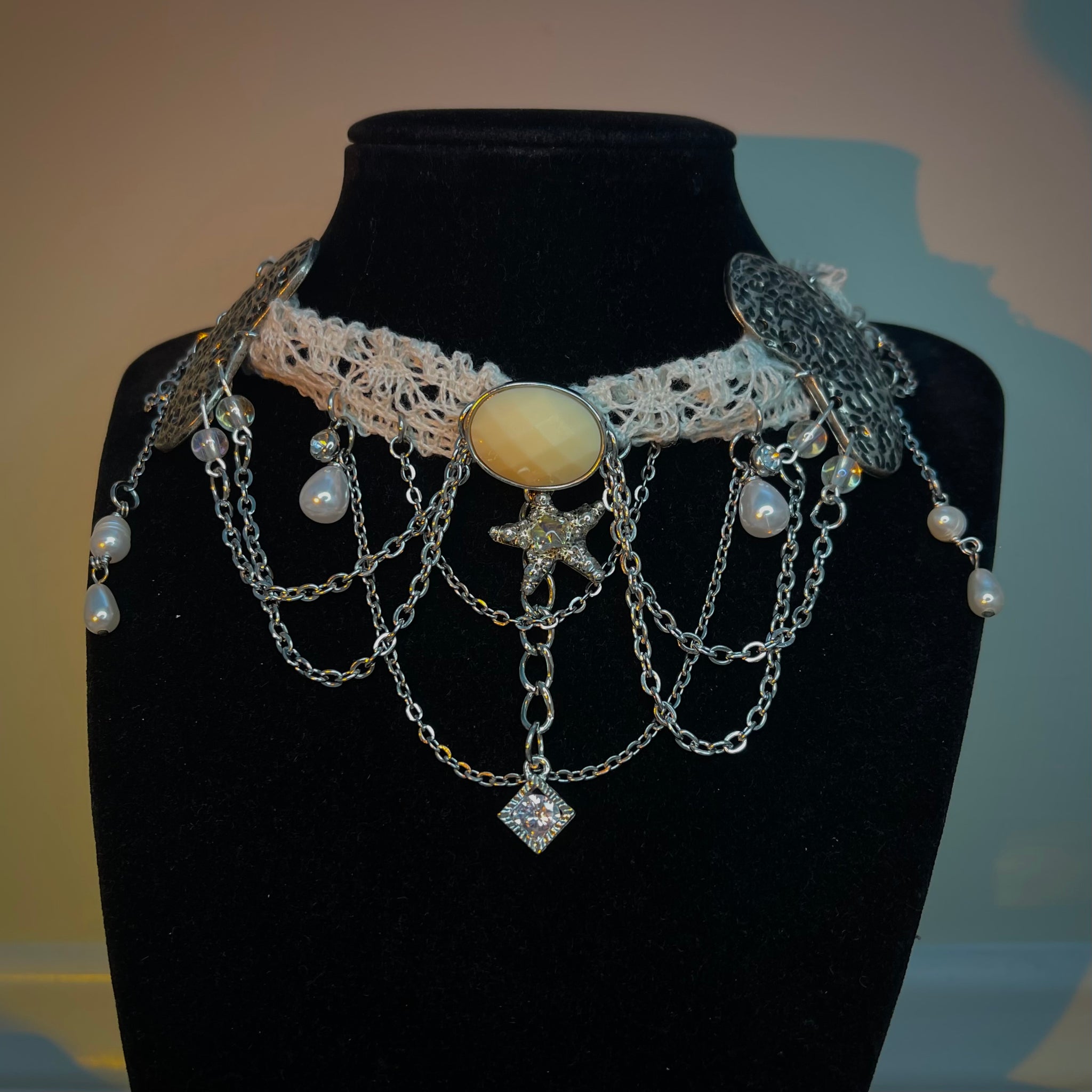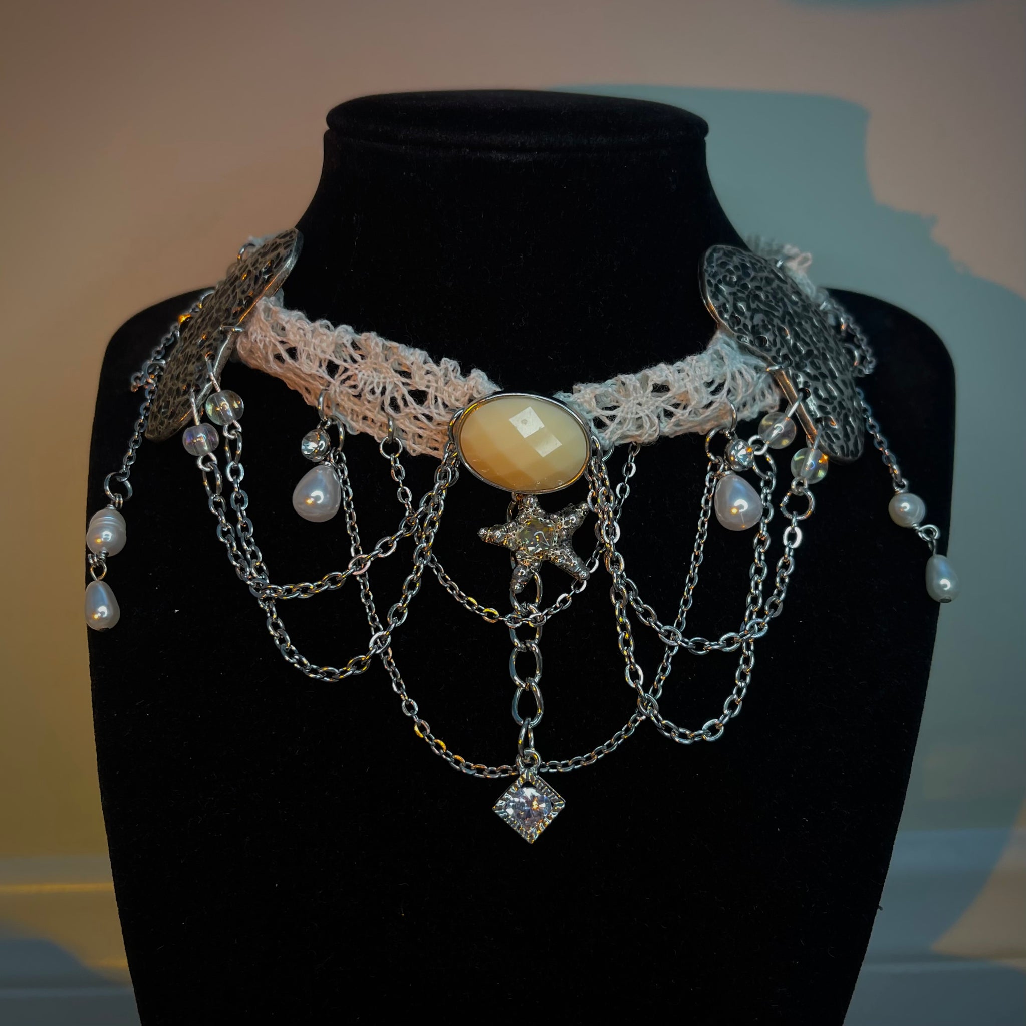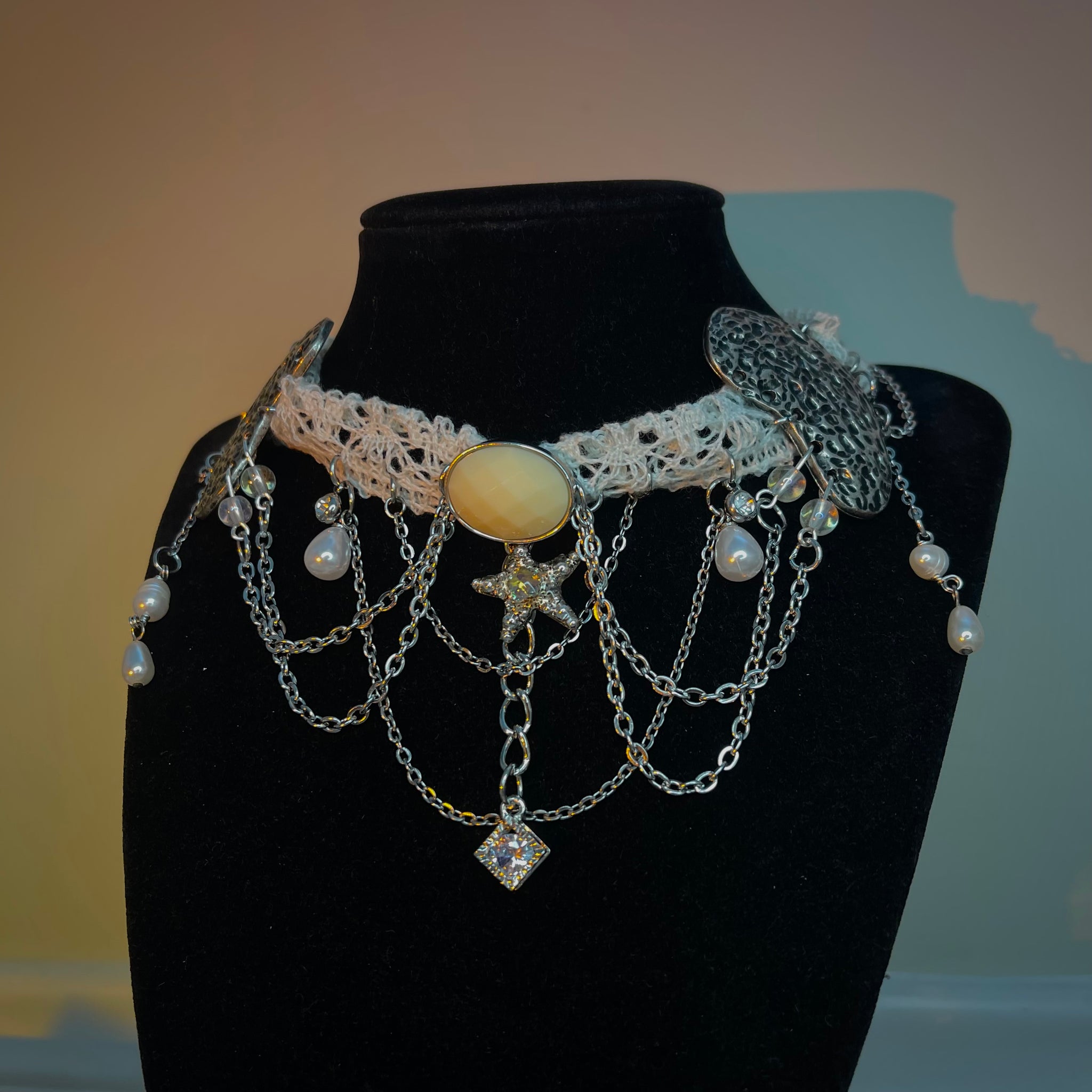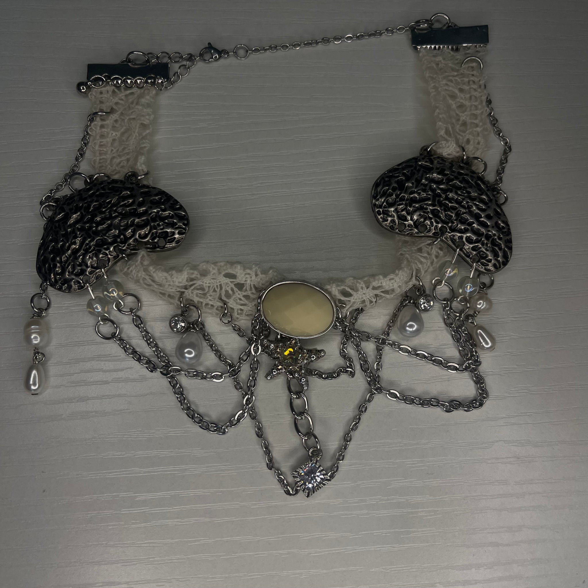 Made with: Resined charm, cloth, stainless steel, rhodium and freshwater pearls
