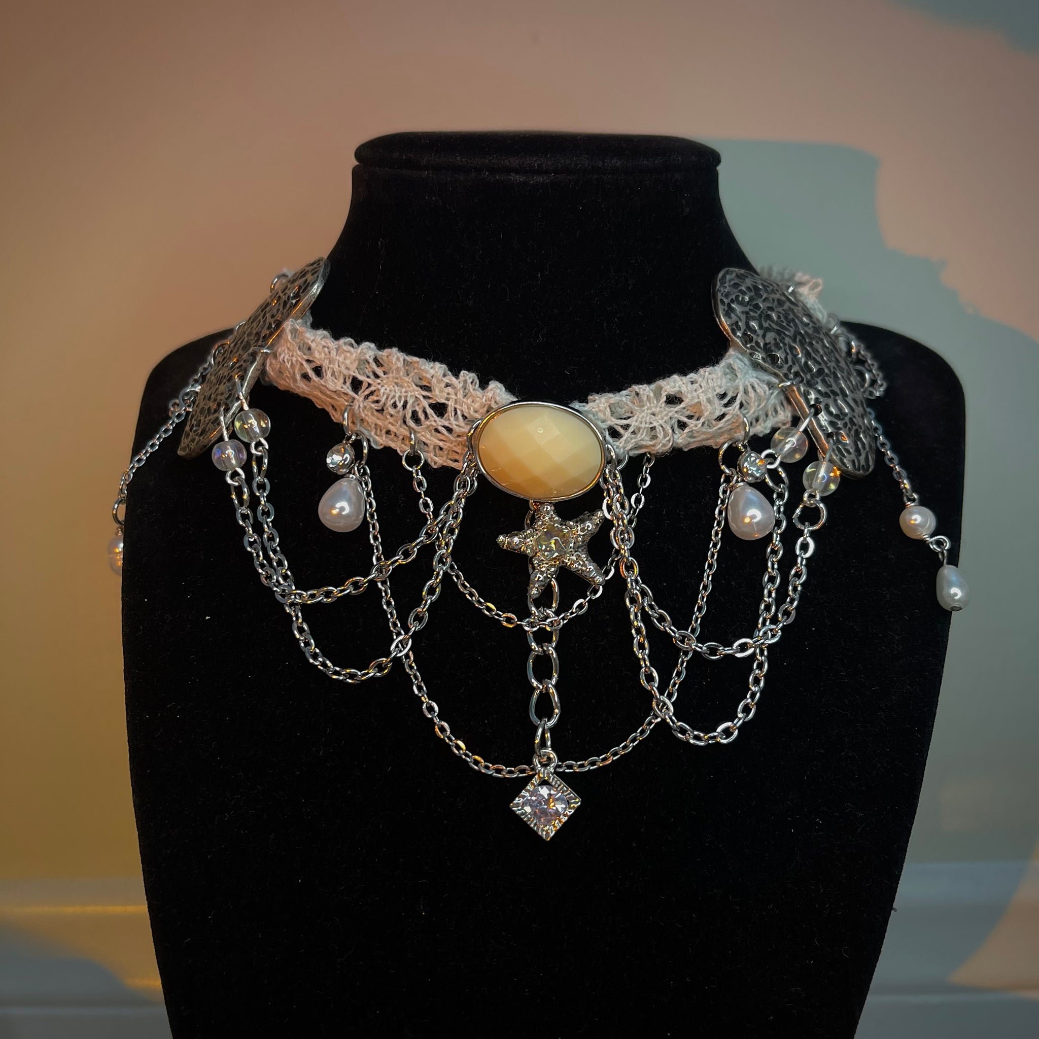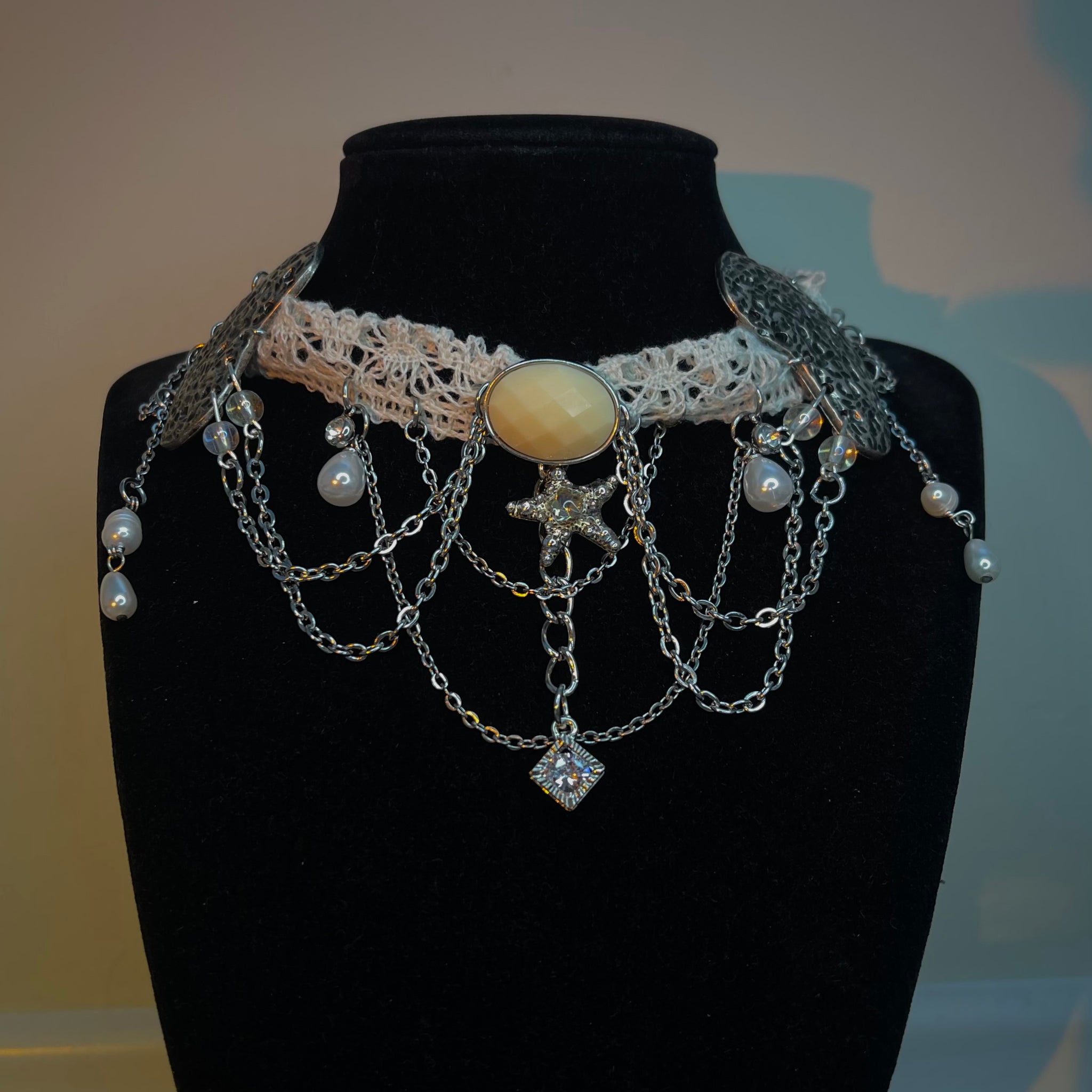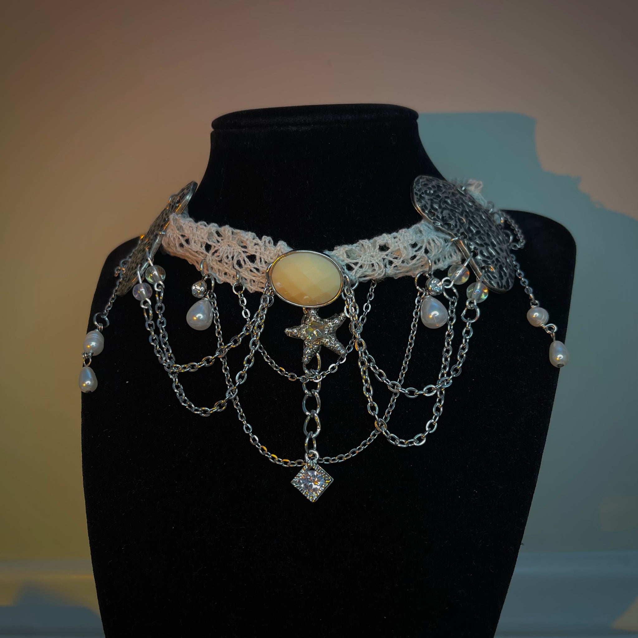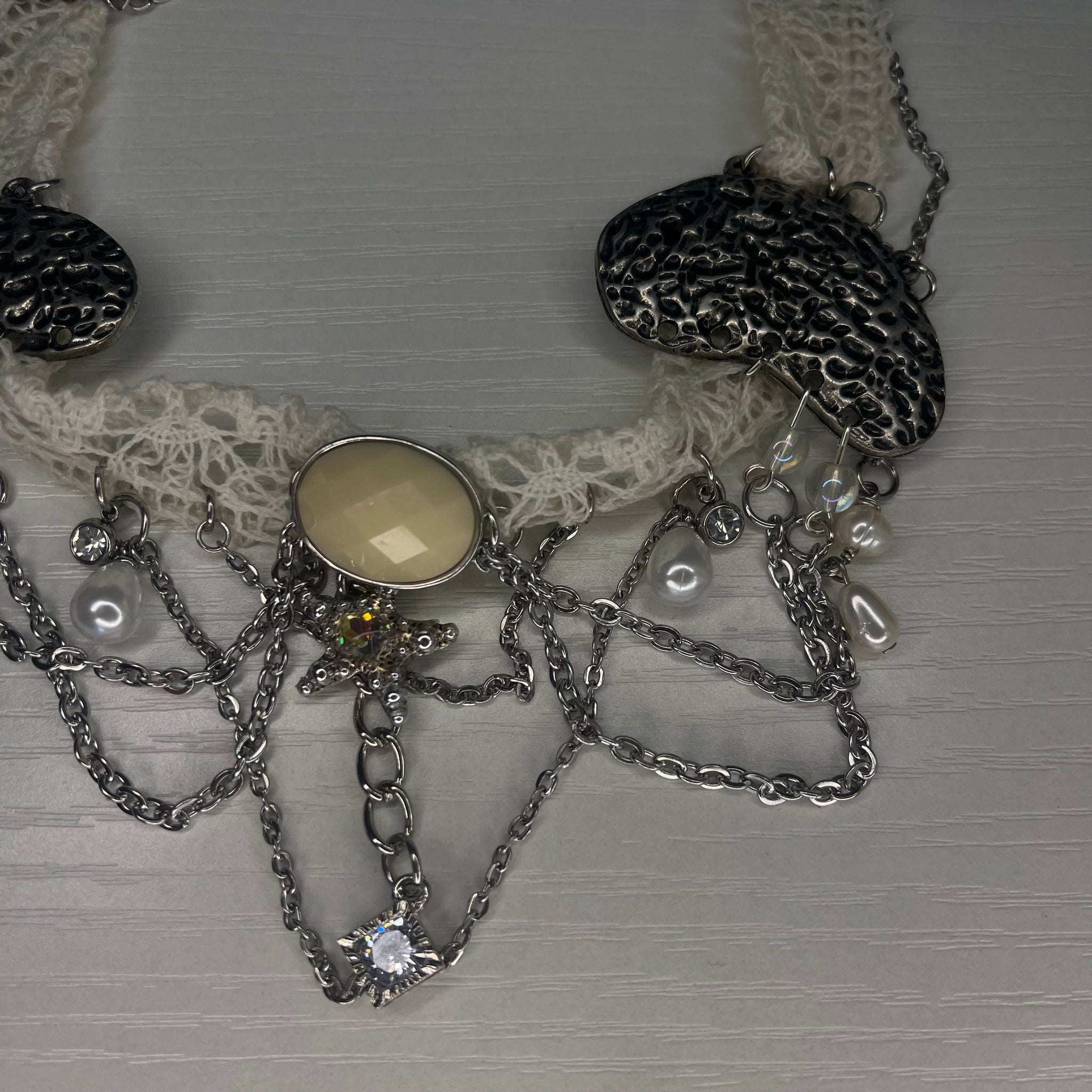 Made with: Resined charm, cloth, stainless steel, rhodium and freshwater pearls