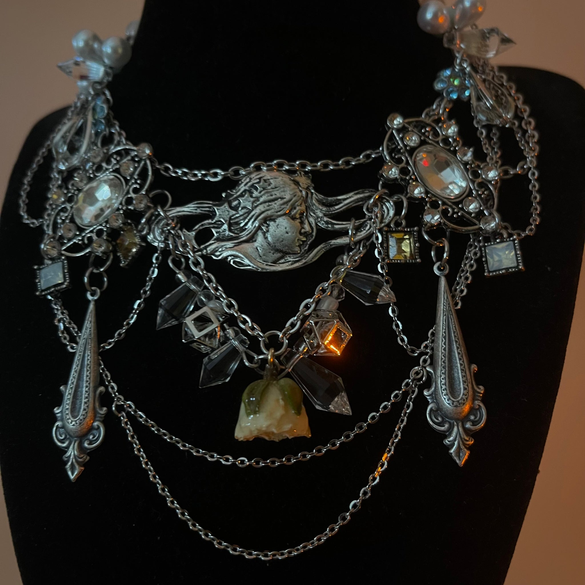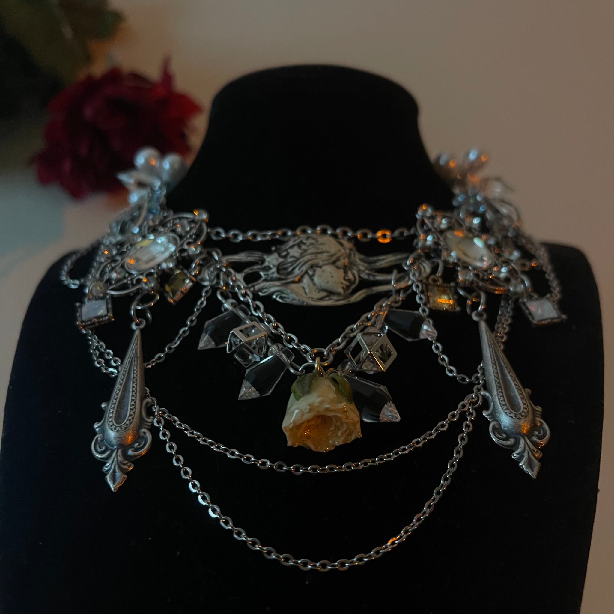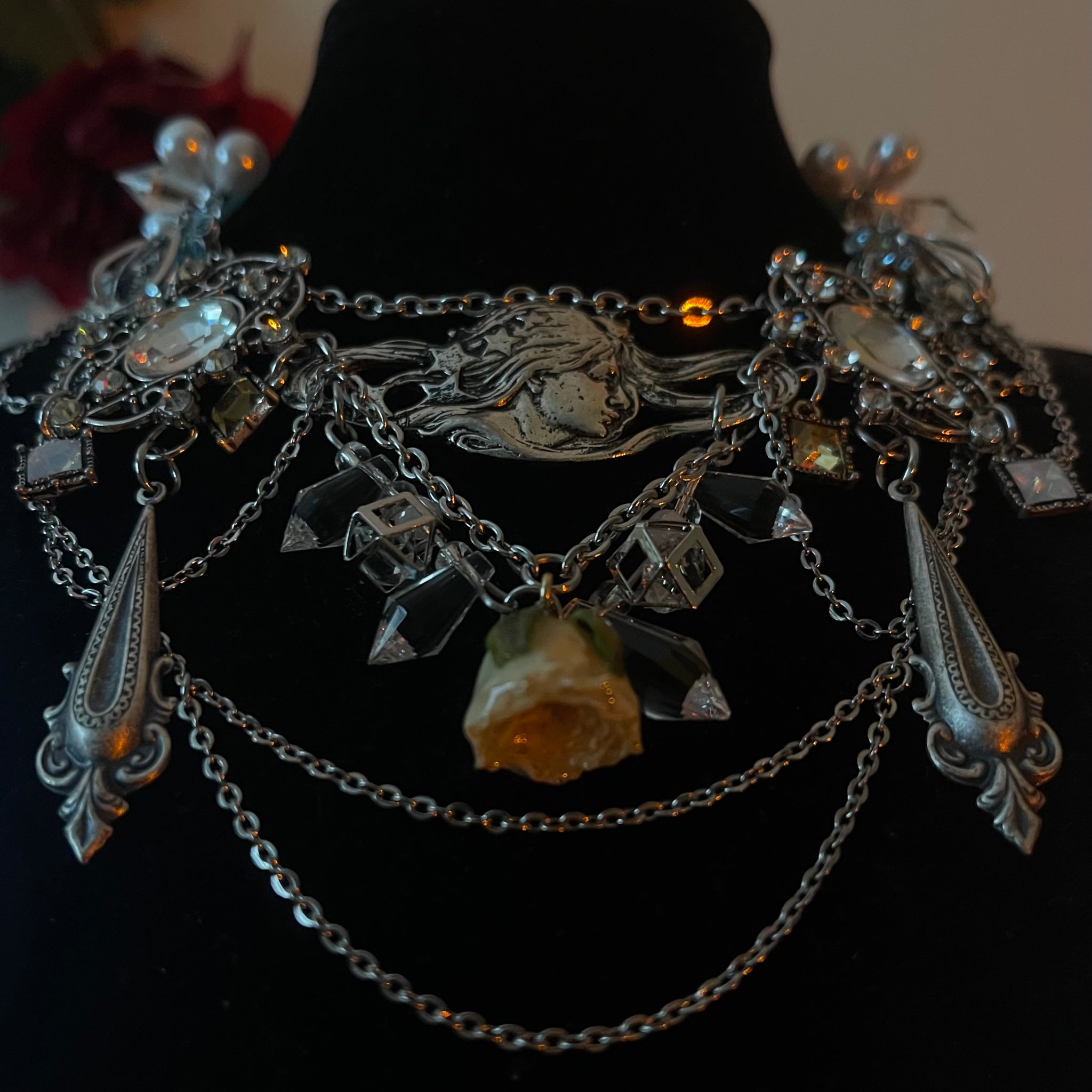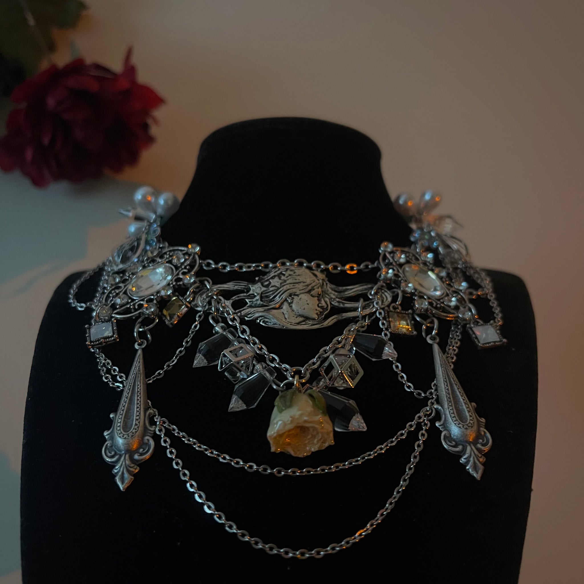 Made with: Stainless steel, Antique charms, Clear Quartz, Glass, Real Flower, Rose Quartz, Hematite and Moonstone.