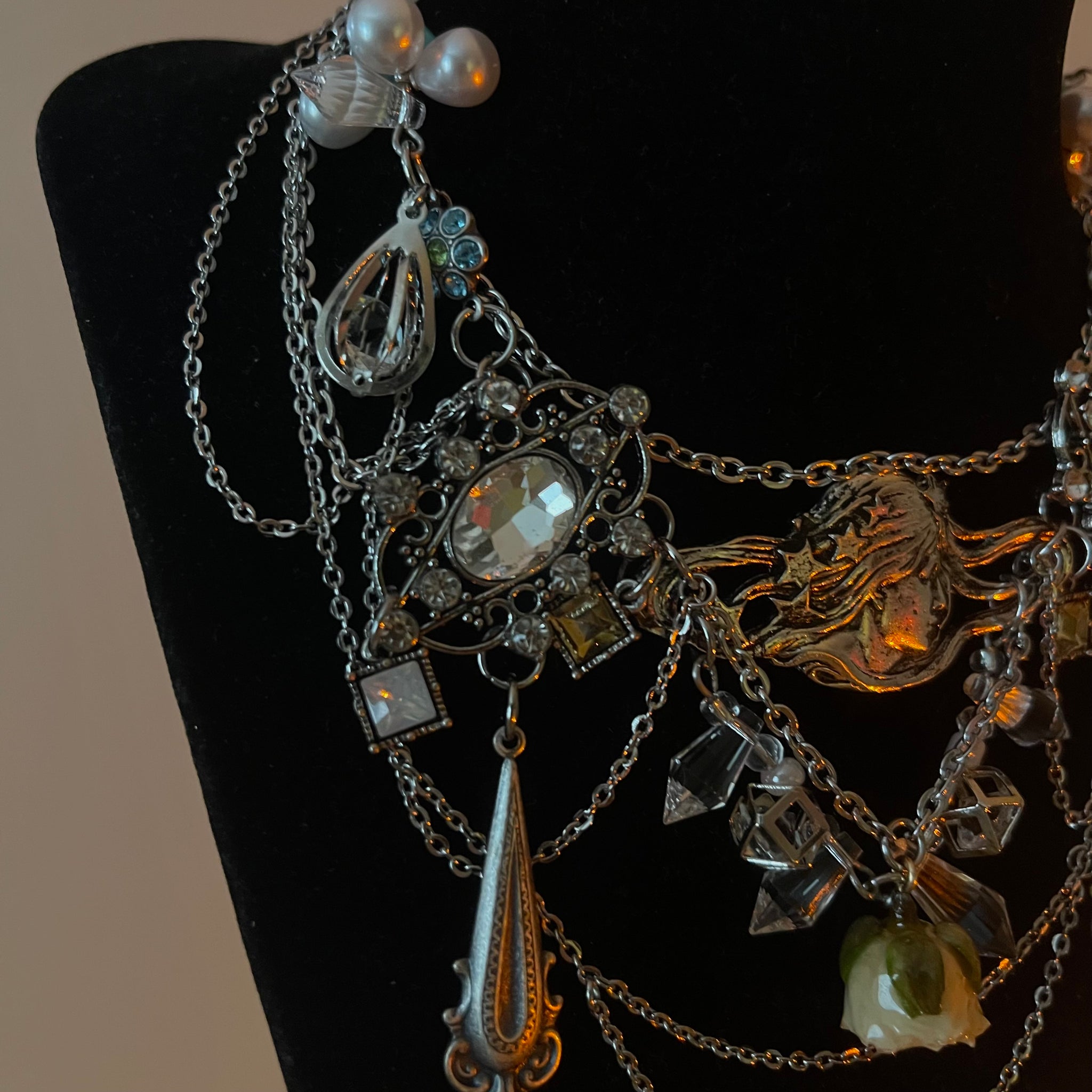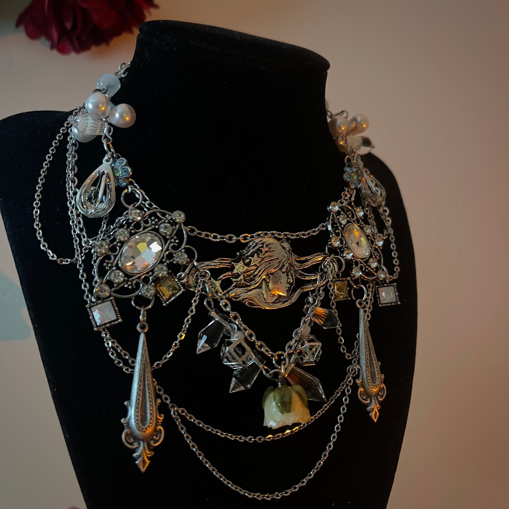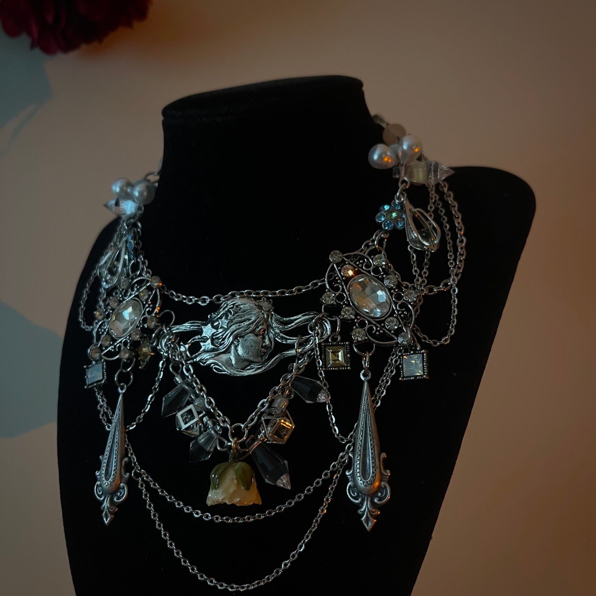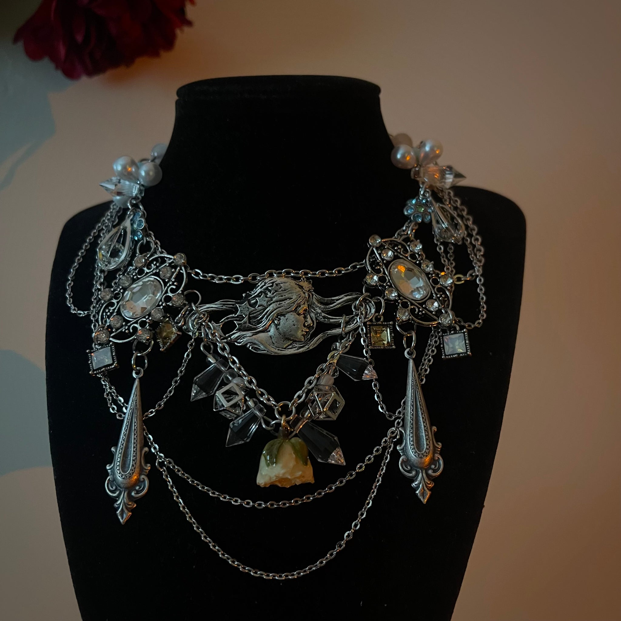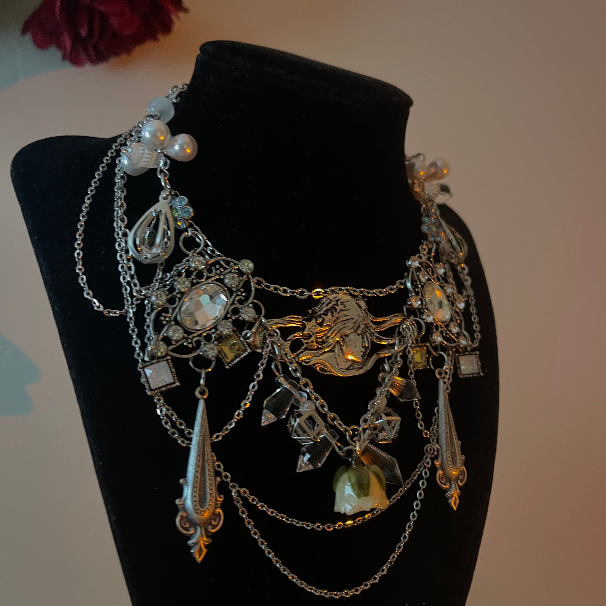 Made with: Stainless steel, Antique charms, Clear Quartz, Glass, Real Flower, Rose Quartz, Hematite and Moonstone.