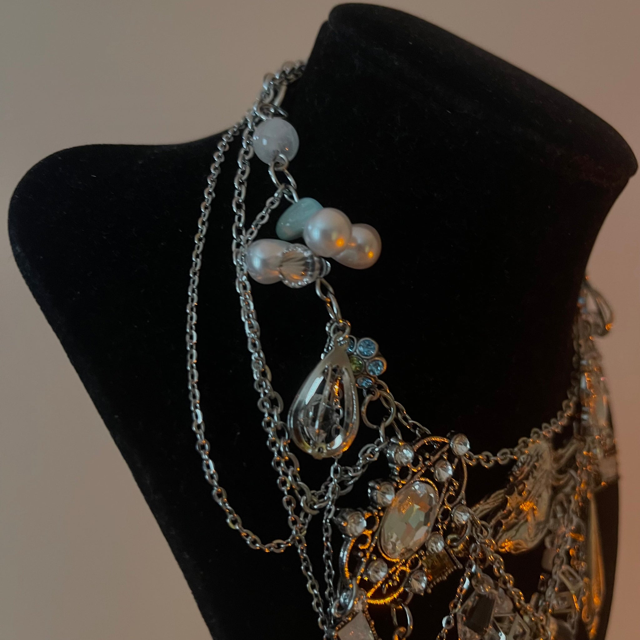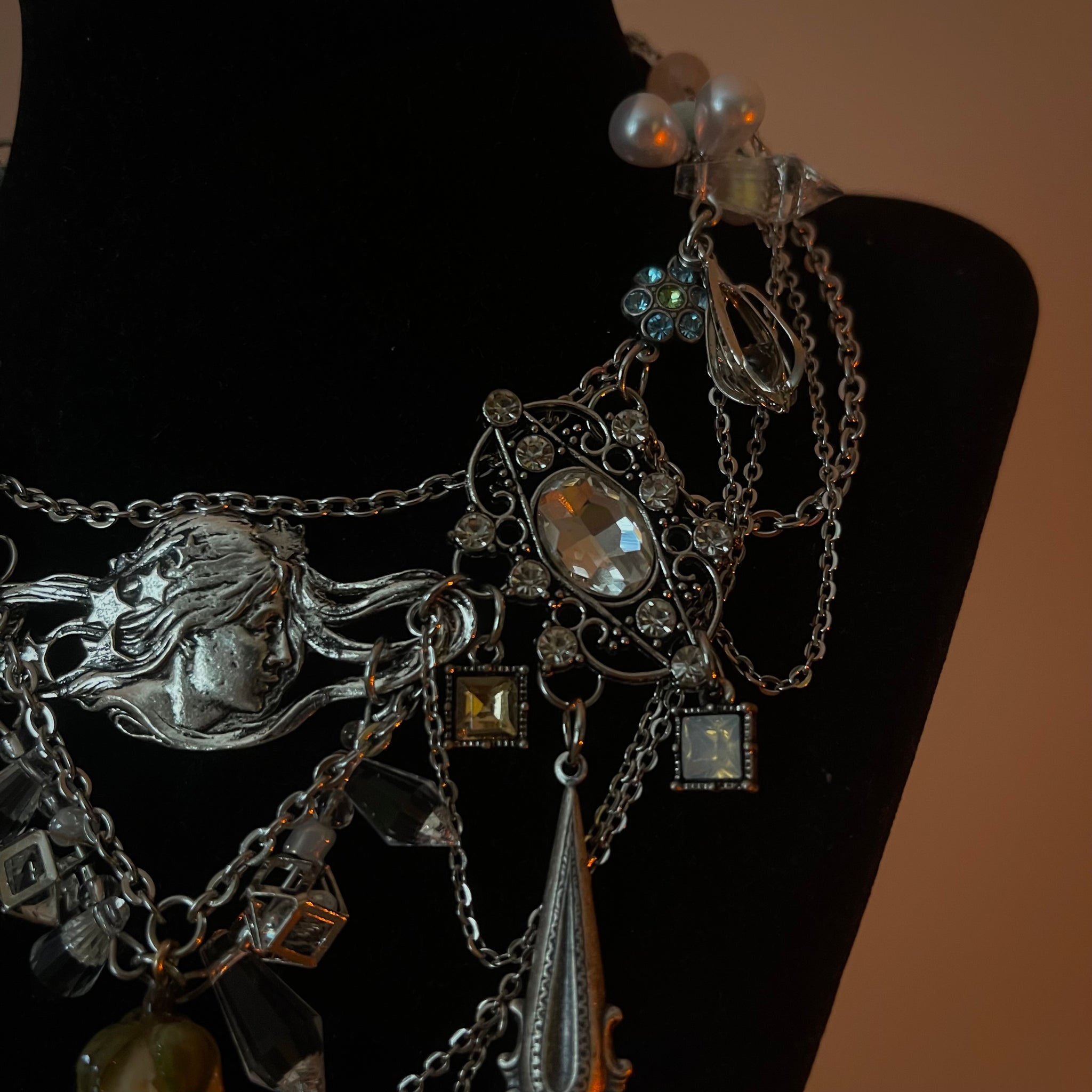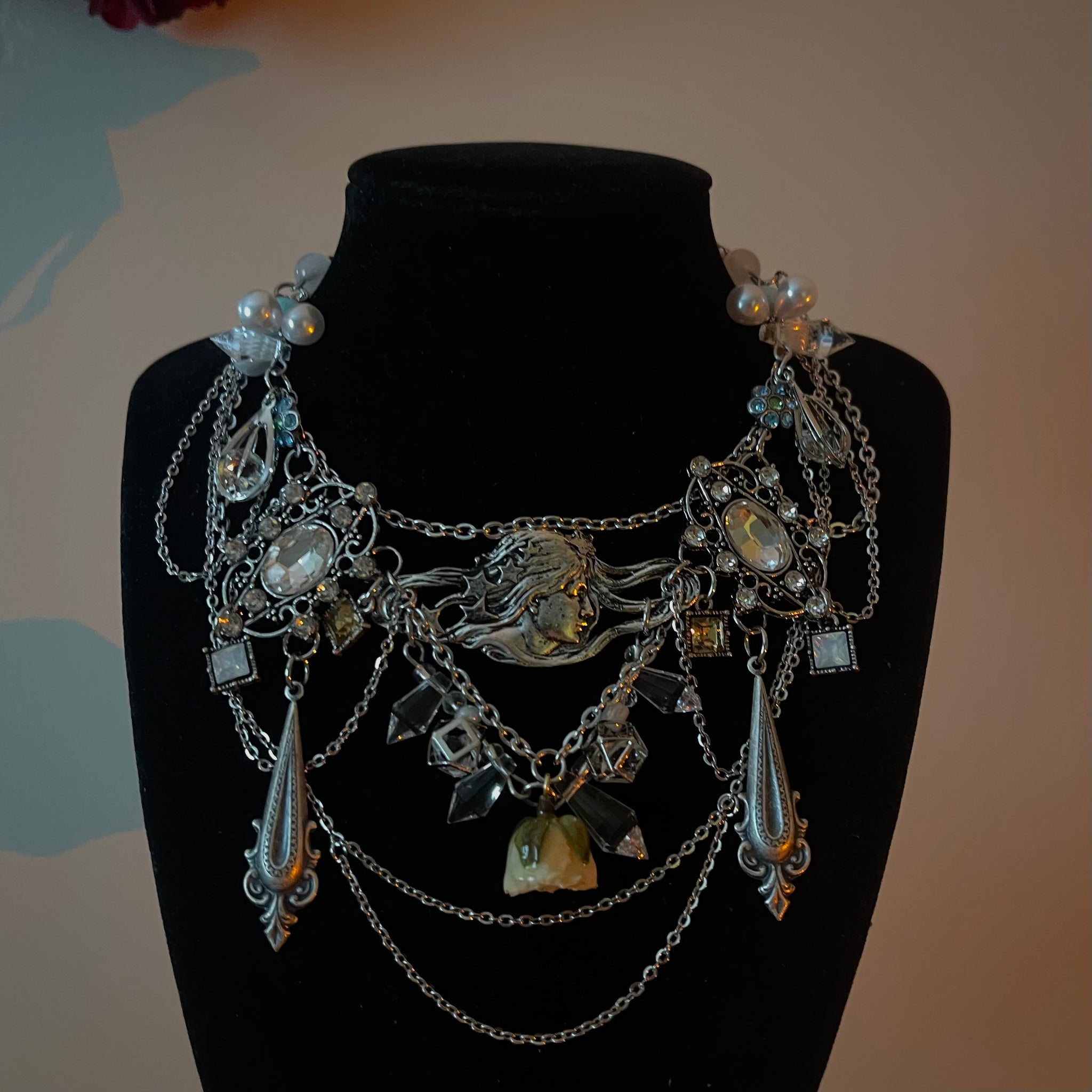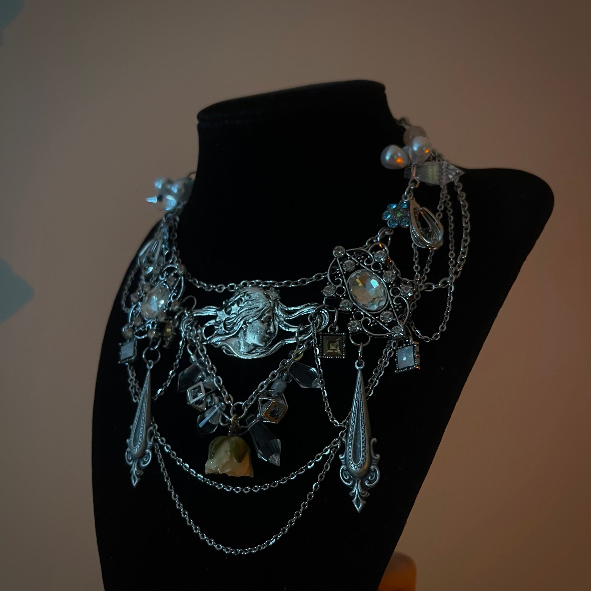 Made with: Stainless steel, Antique charms, Clear Quartz, Glass, Real Flower, Rose Quartz, Hematite and Moonstone.