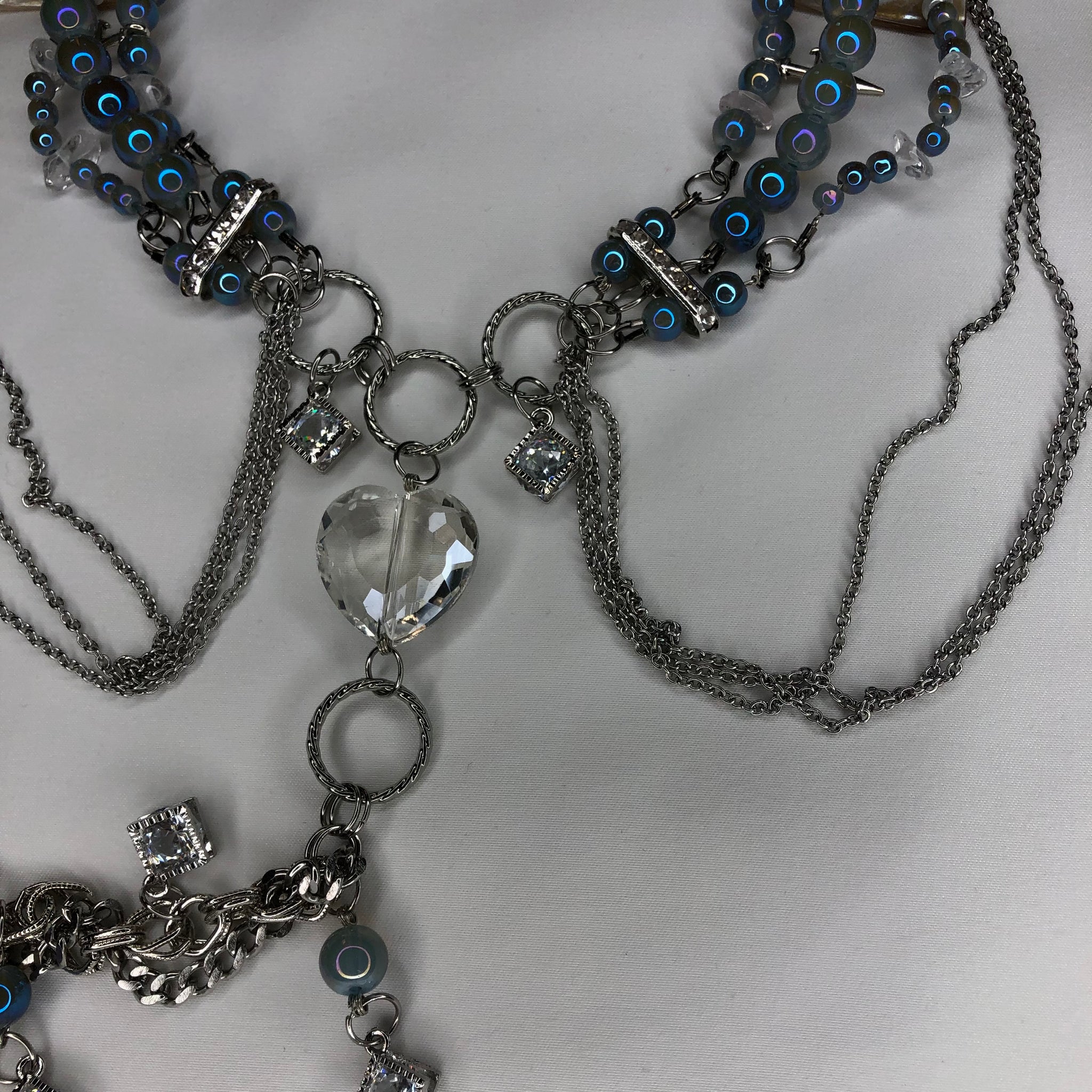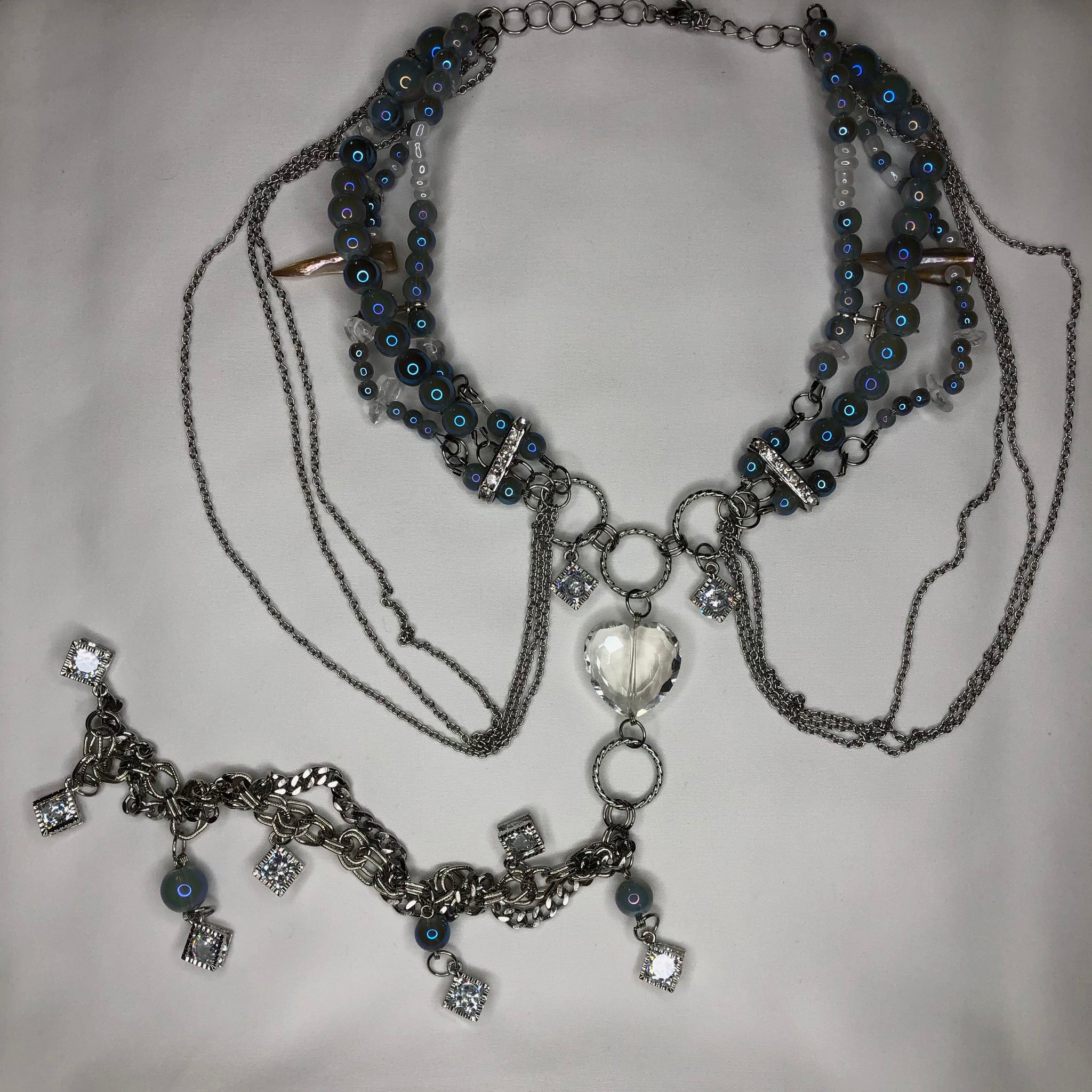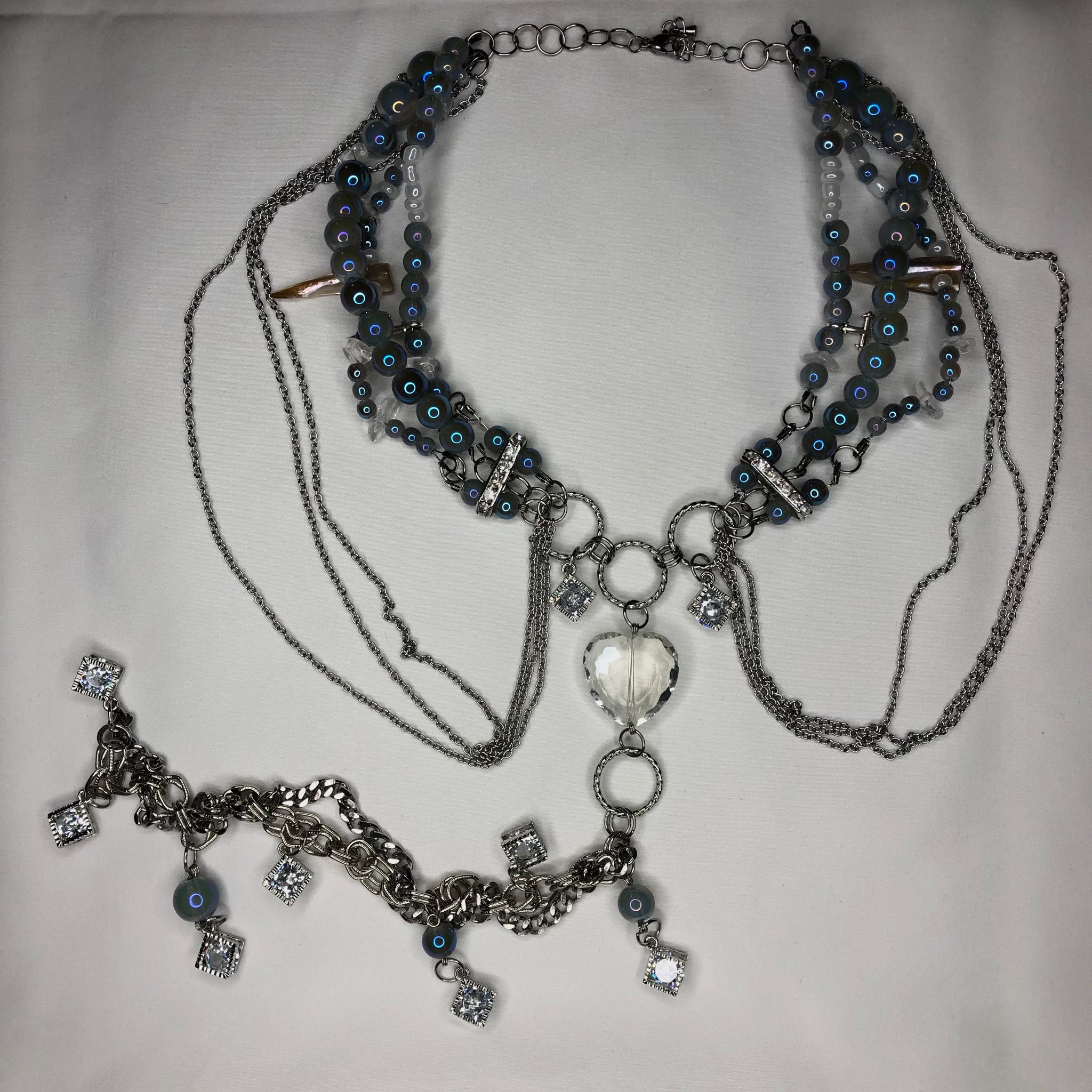Made with: Sapphire Glass, Clear Quartz, Shell, White seed beads, Zirconia, Glass Heart, Stainless Steel chain.