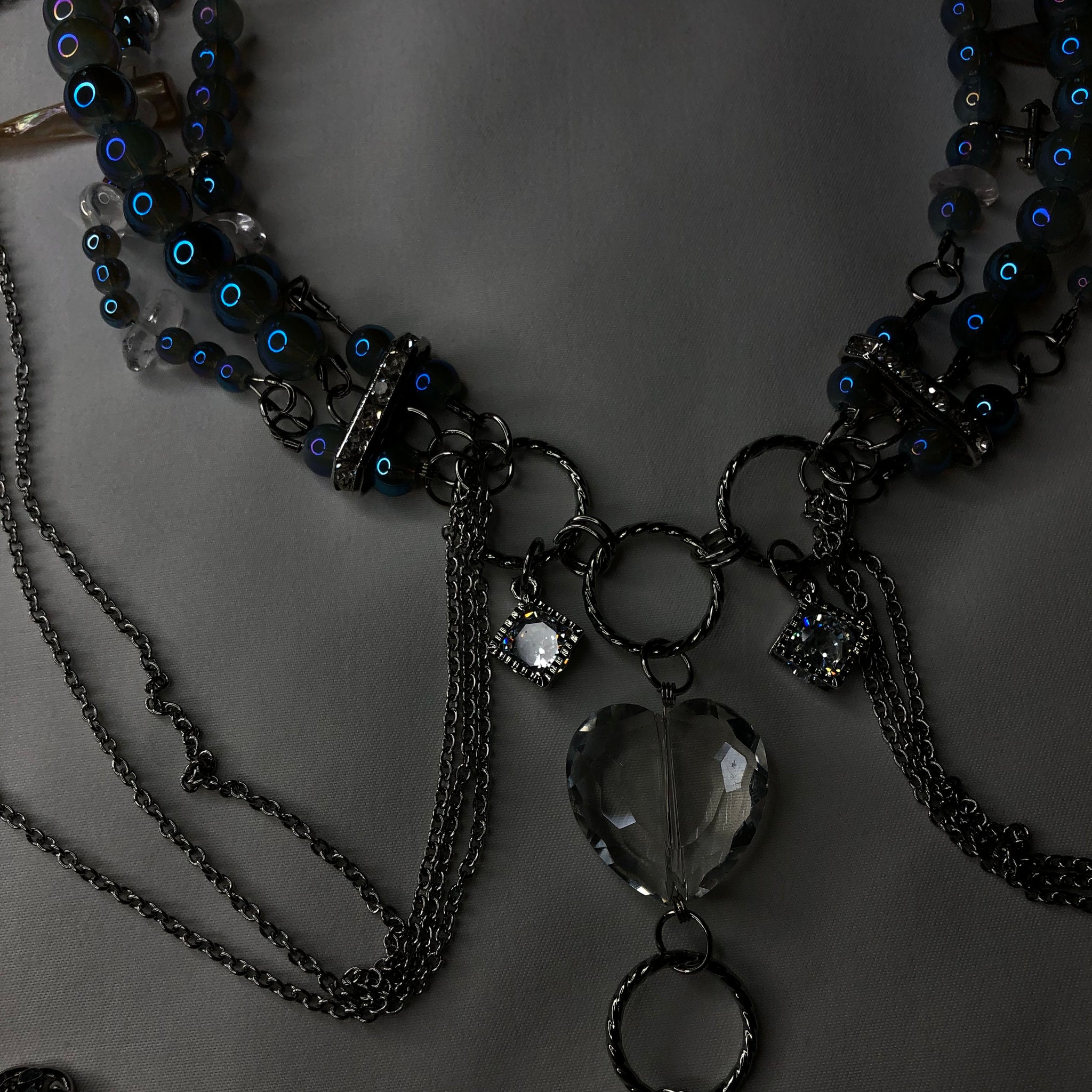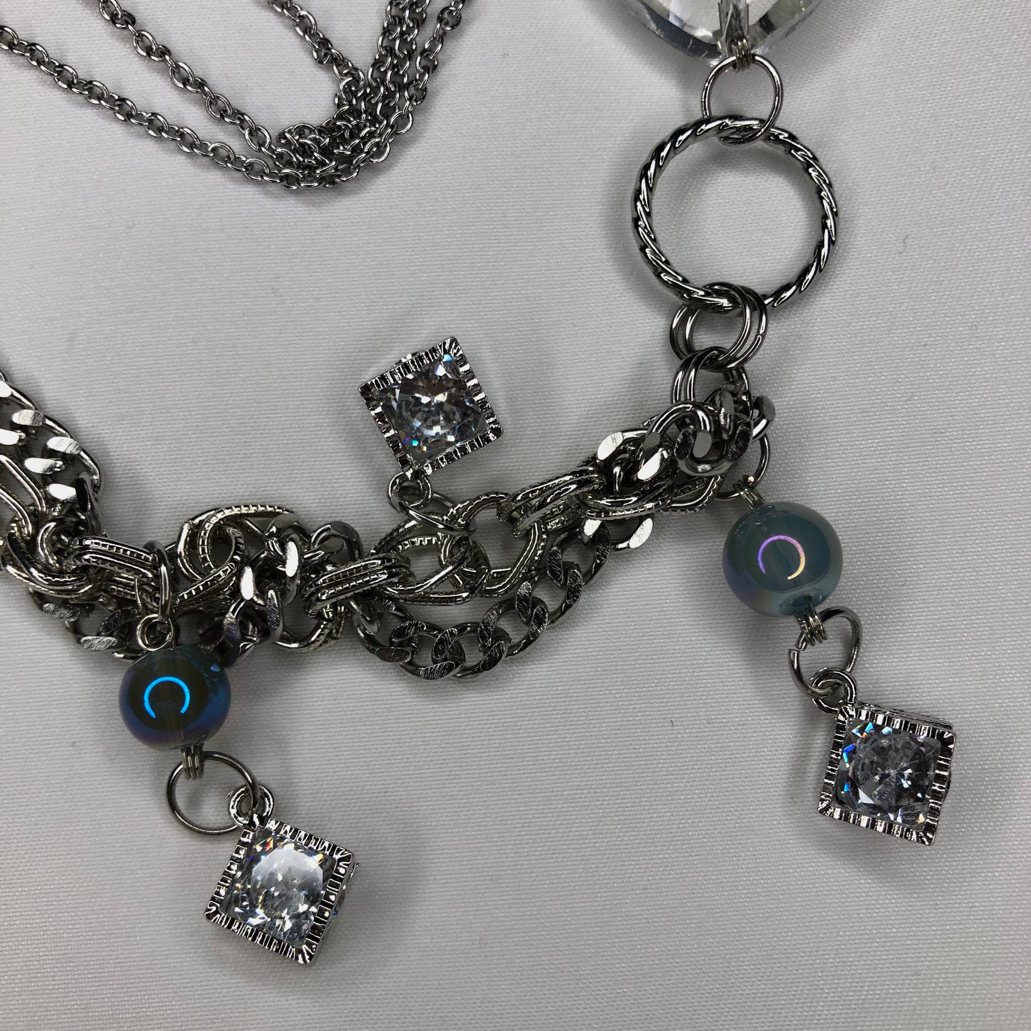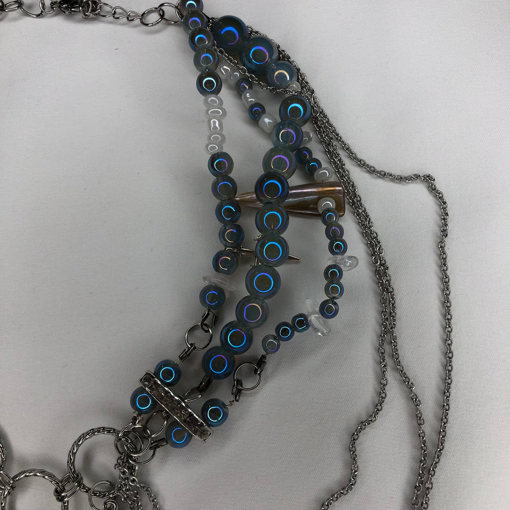 Made with: Sapphire Glass, Clear Quartz, Shell, White seed beads, Zirconia, Glass Heart, Stainless Steel chain.