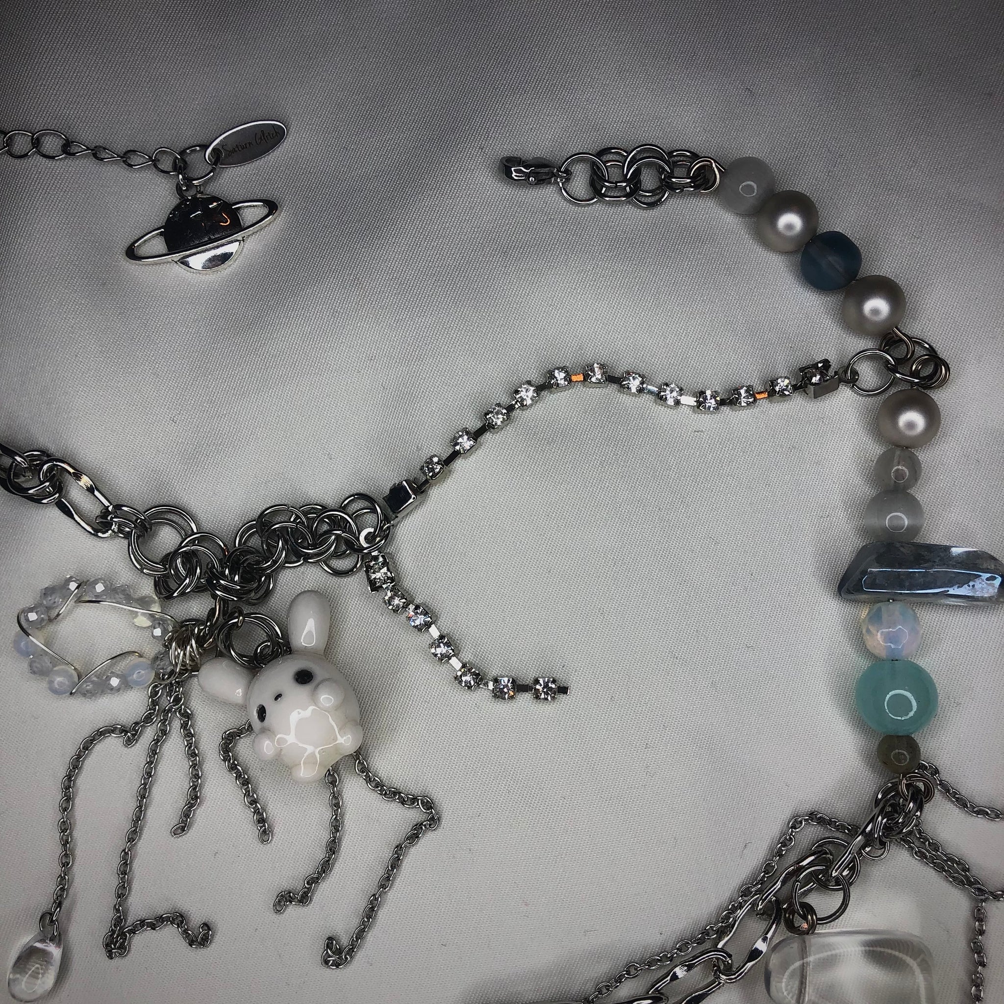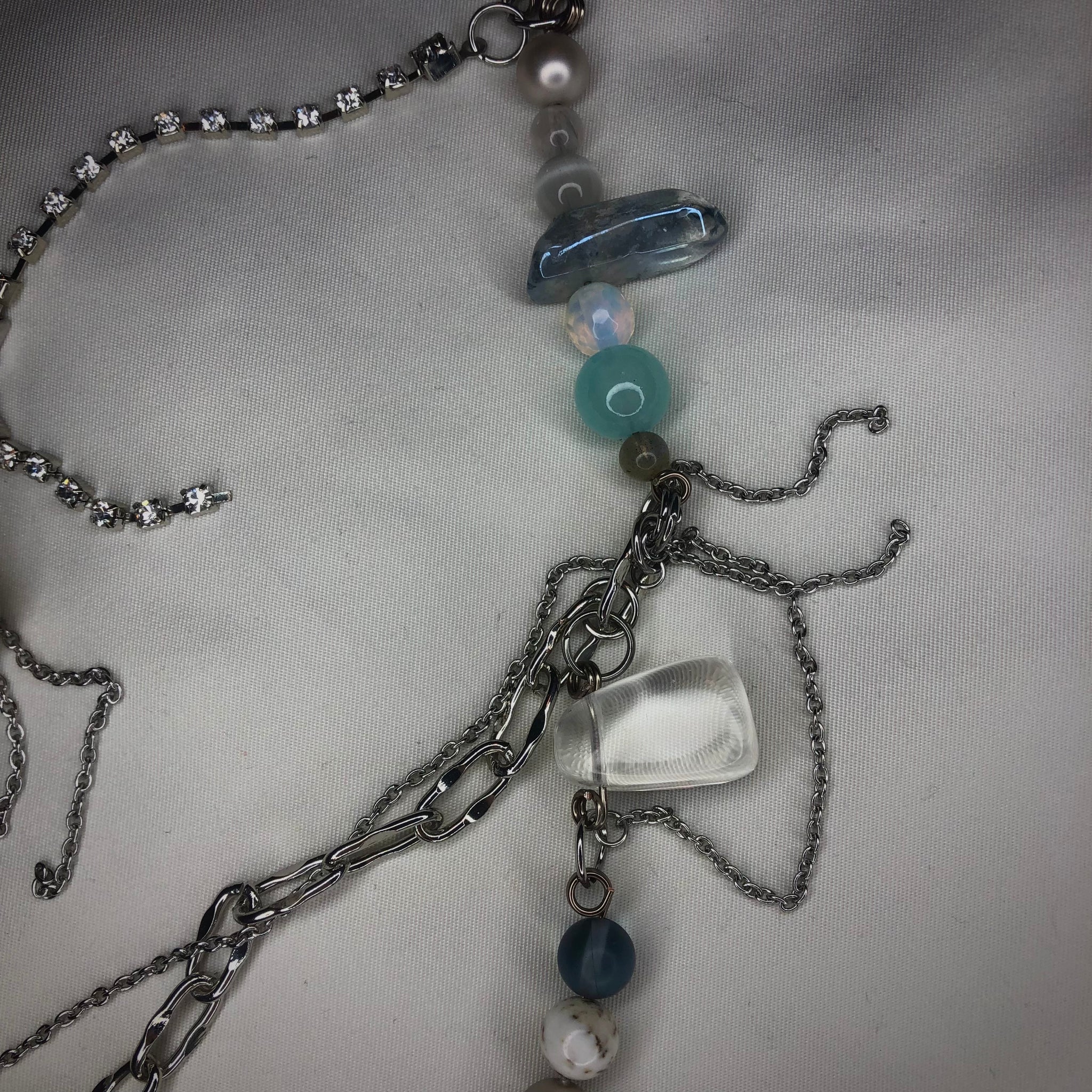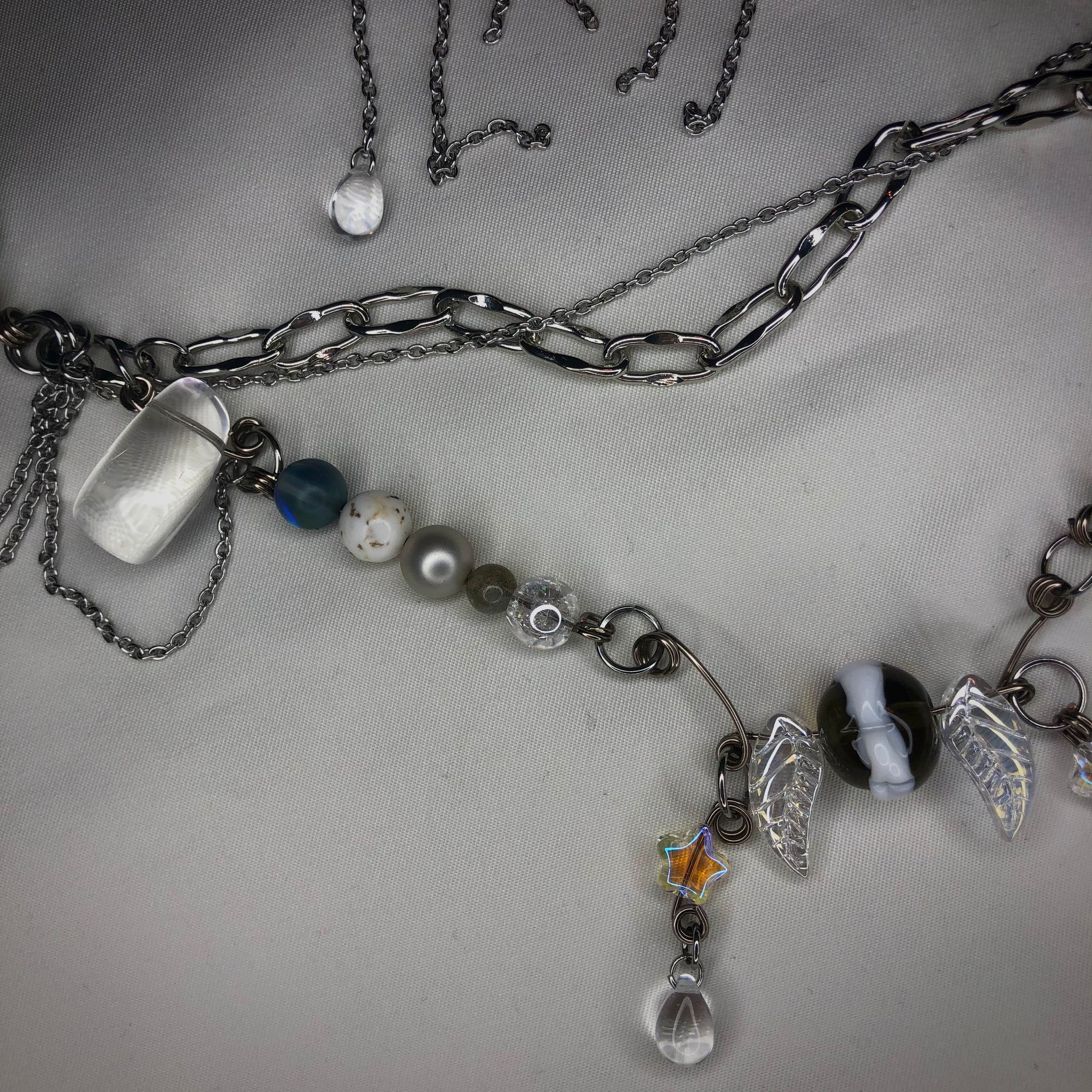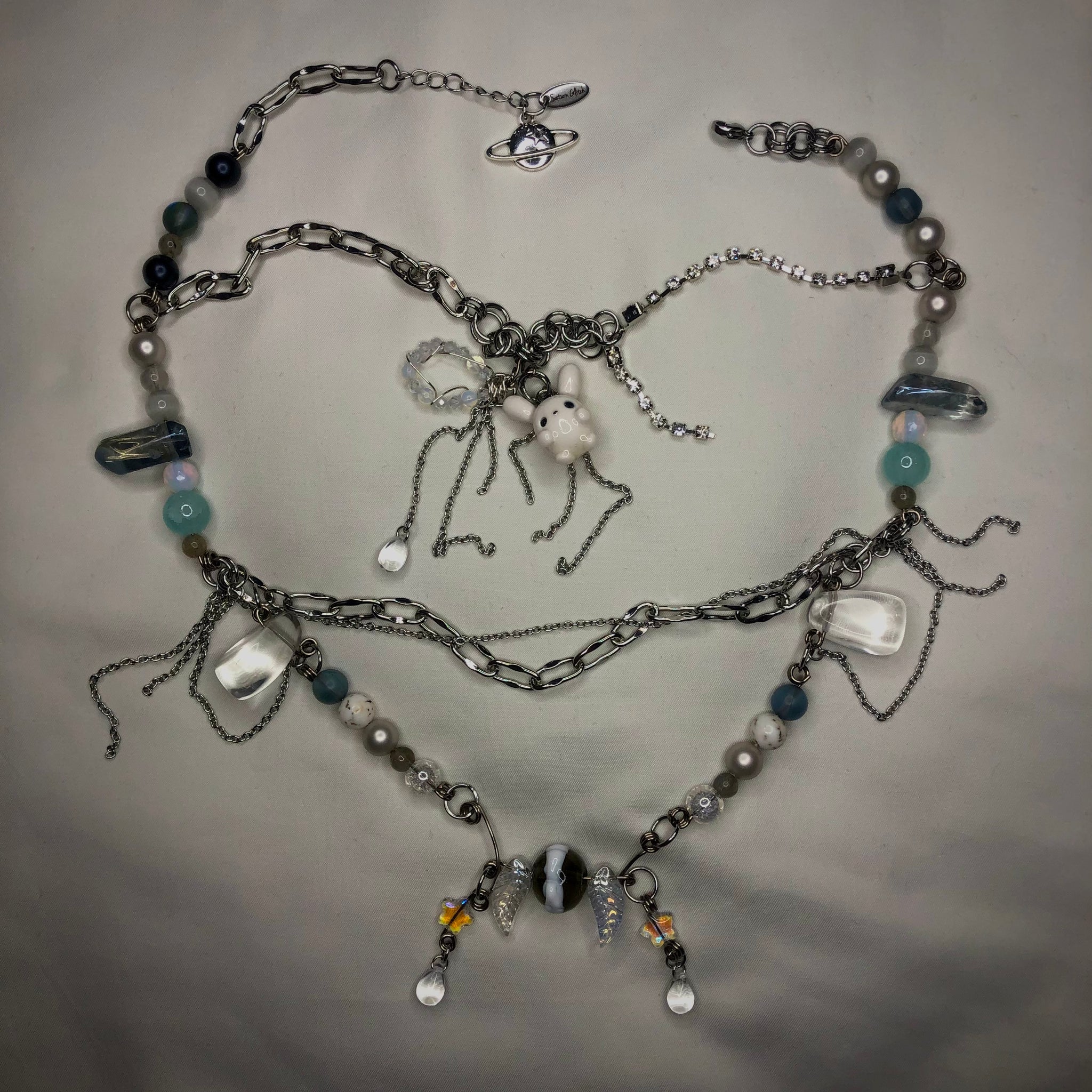 Made with: Blue luster, Clear quartz, zirconia beads, agate, bunny made my @Mcutedesignz , glass stars, glass drops, glass, matte grey quartz, lampwork beads, Opals, smoky quartz and cloudy quartz.