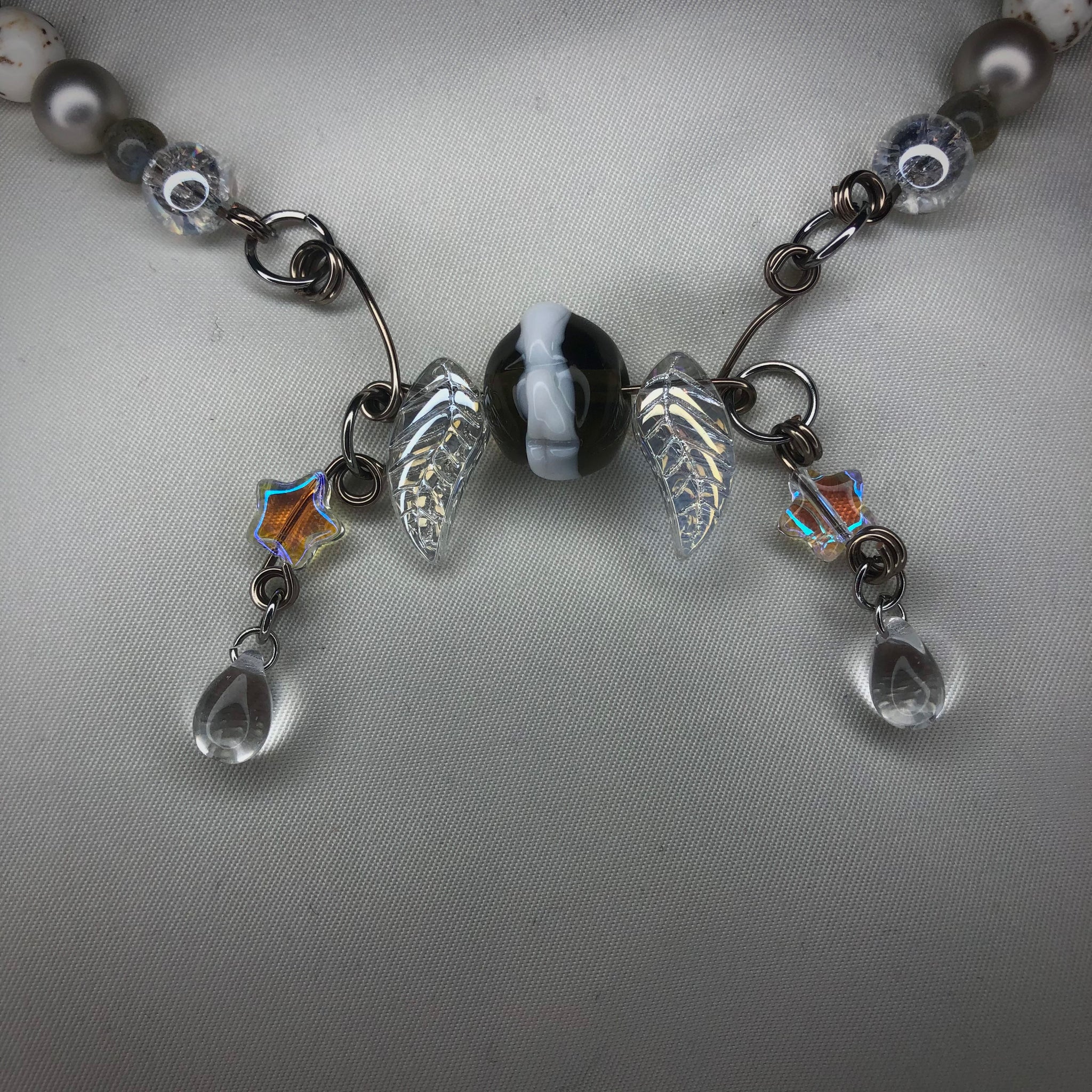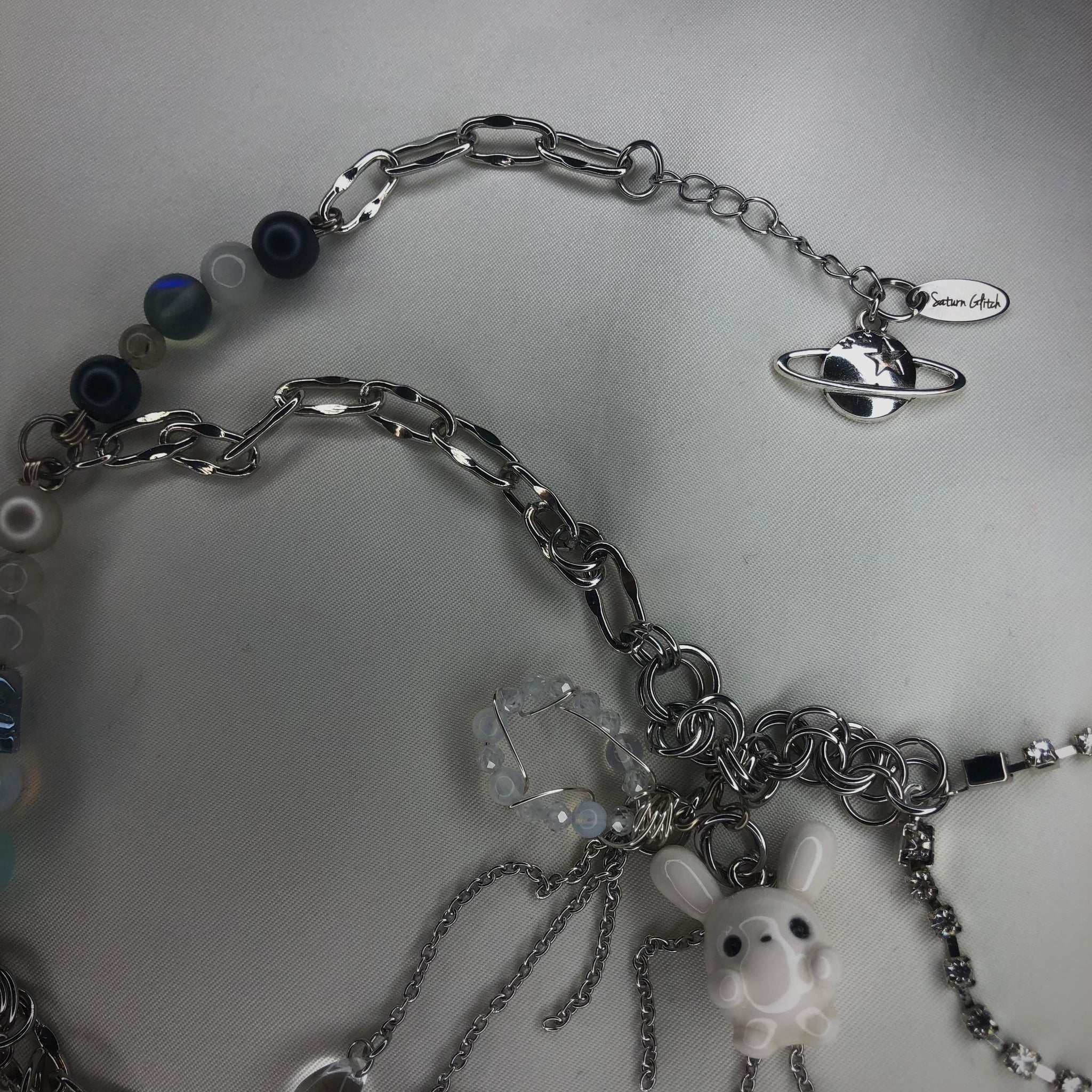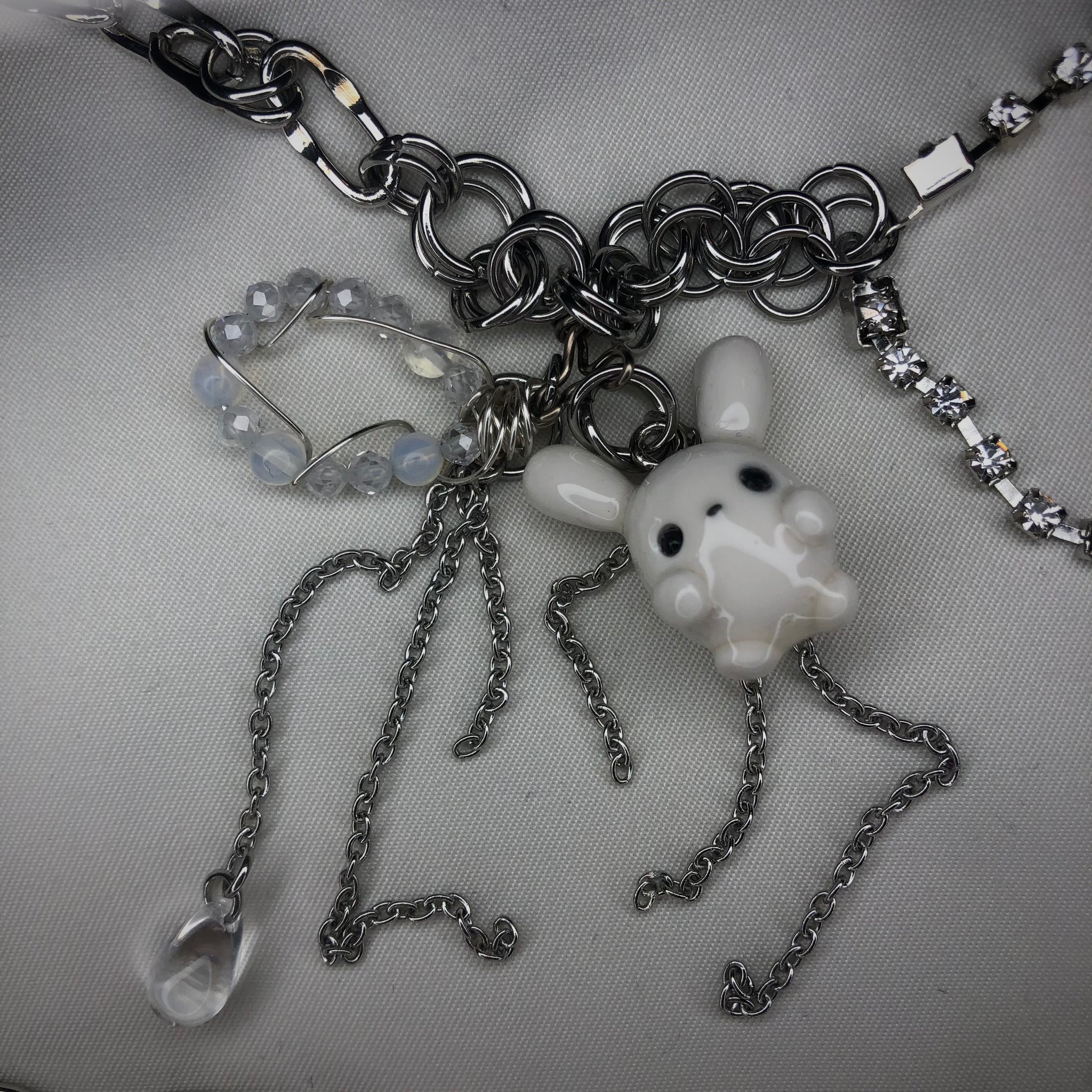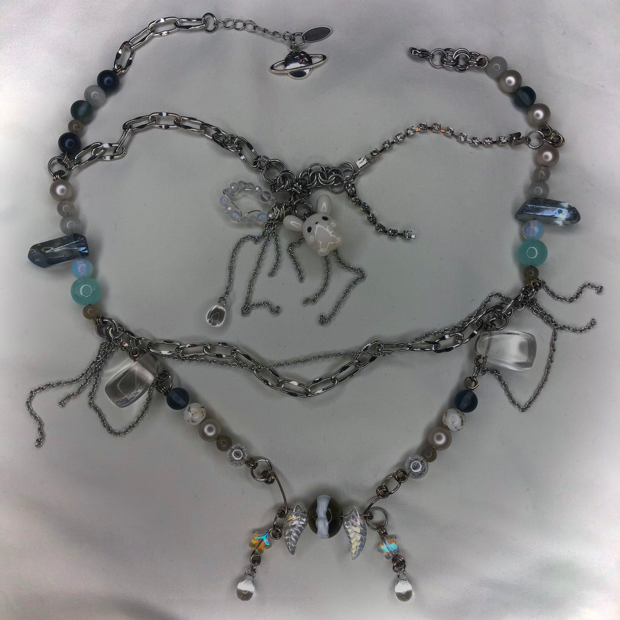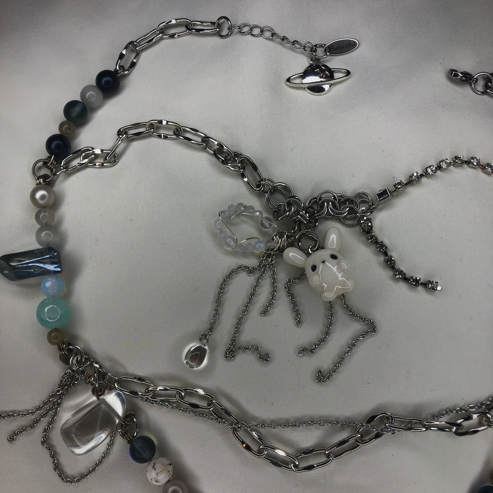 Made with: Blue luster, Clear quartz, zirconia beads, agate, bunny made my @Mcutedesignz , glass stars, glass drops, glass, matte grey quartz, lampwork beads, Opals, smoky quartz and cloudy quartz.
