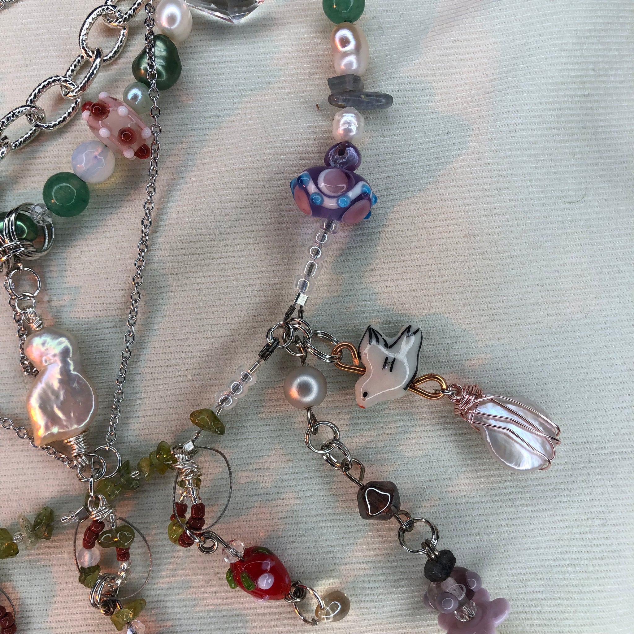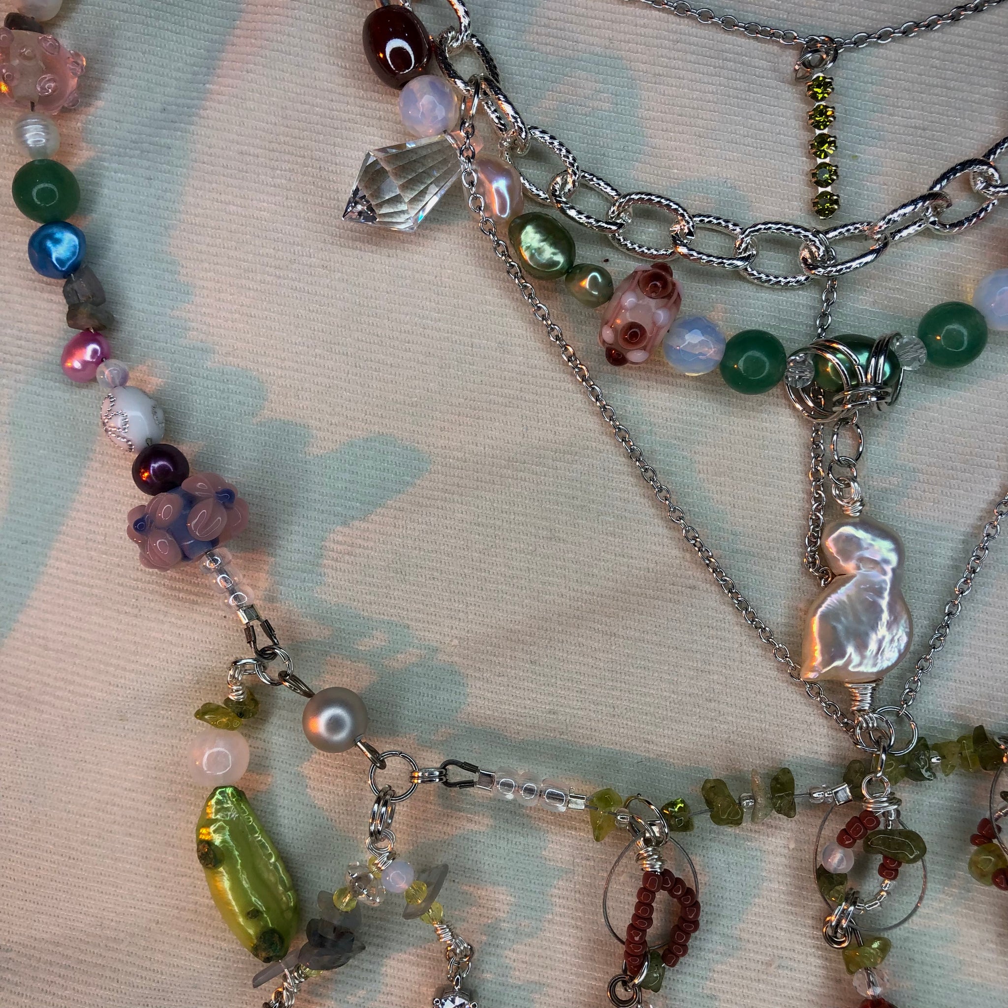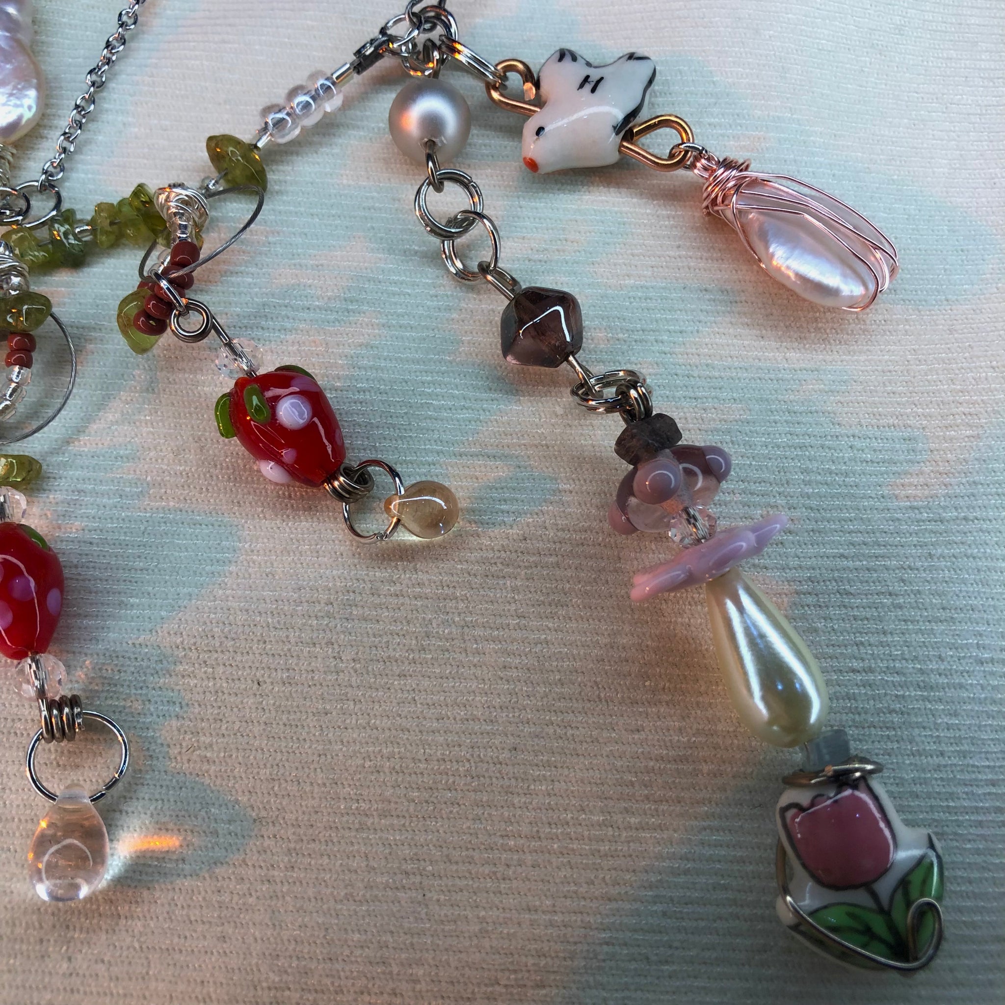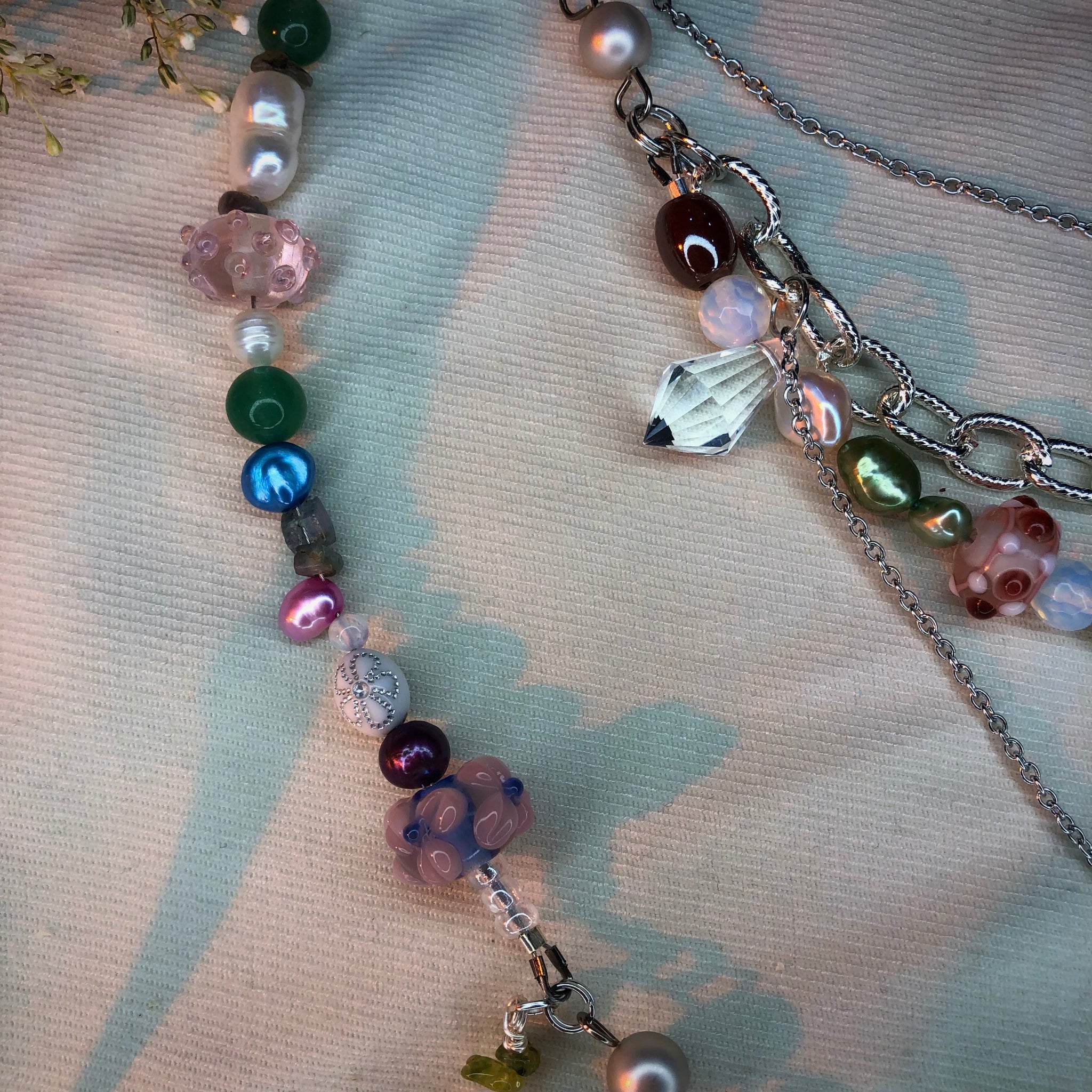 Made with: Lampwork beads, Peridot, Freshwater pearls, ceramic beads, Labradorite, Saturns, Zirconia, Opal, Agate, Sandstone, Glass, Antiques, Czech beads, Chandelier glass.