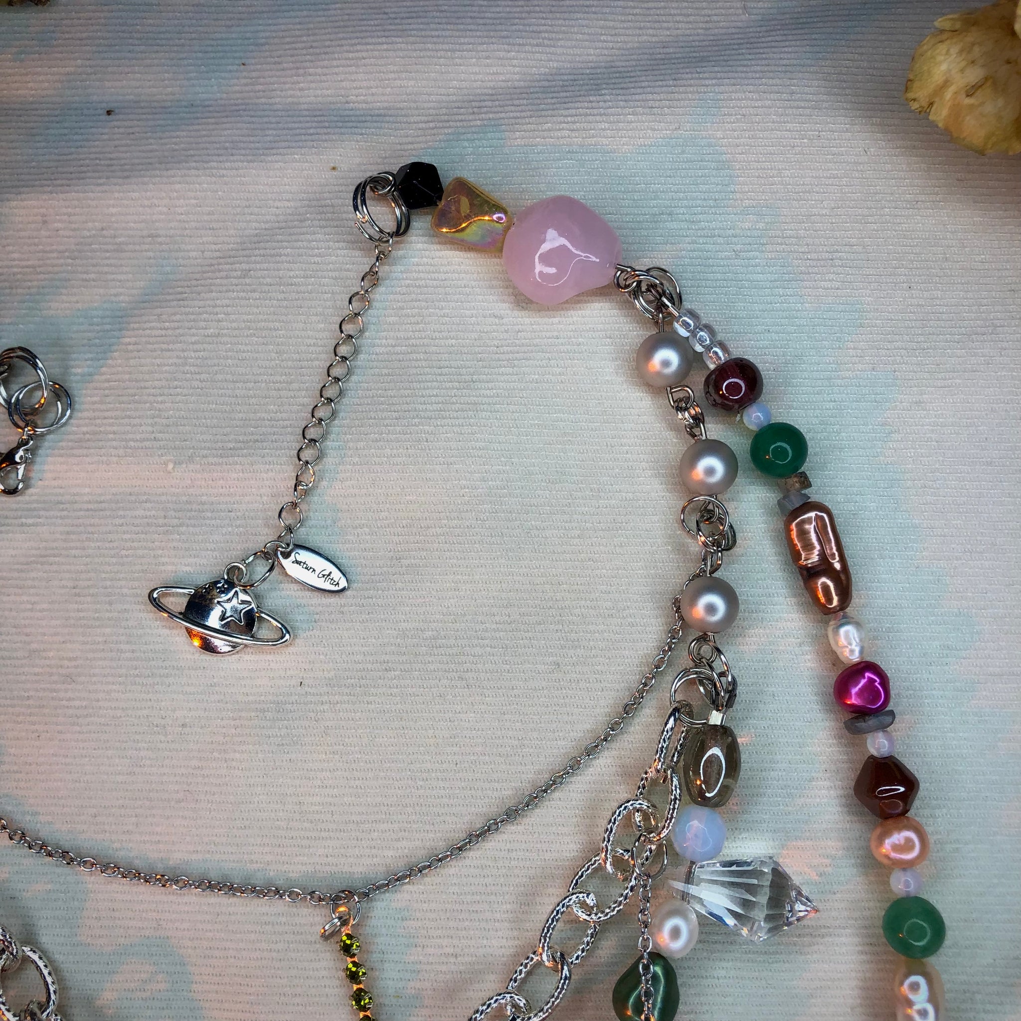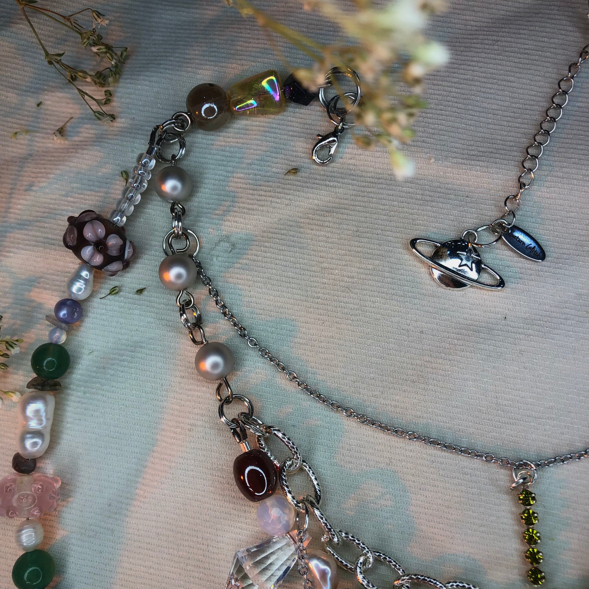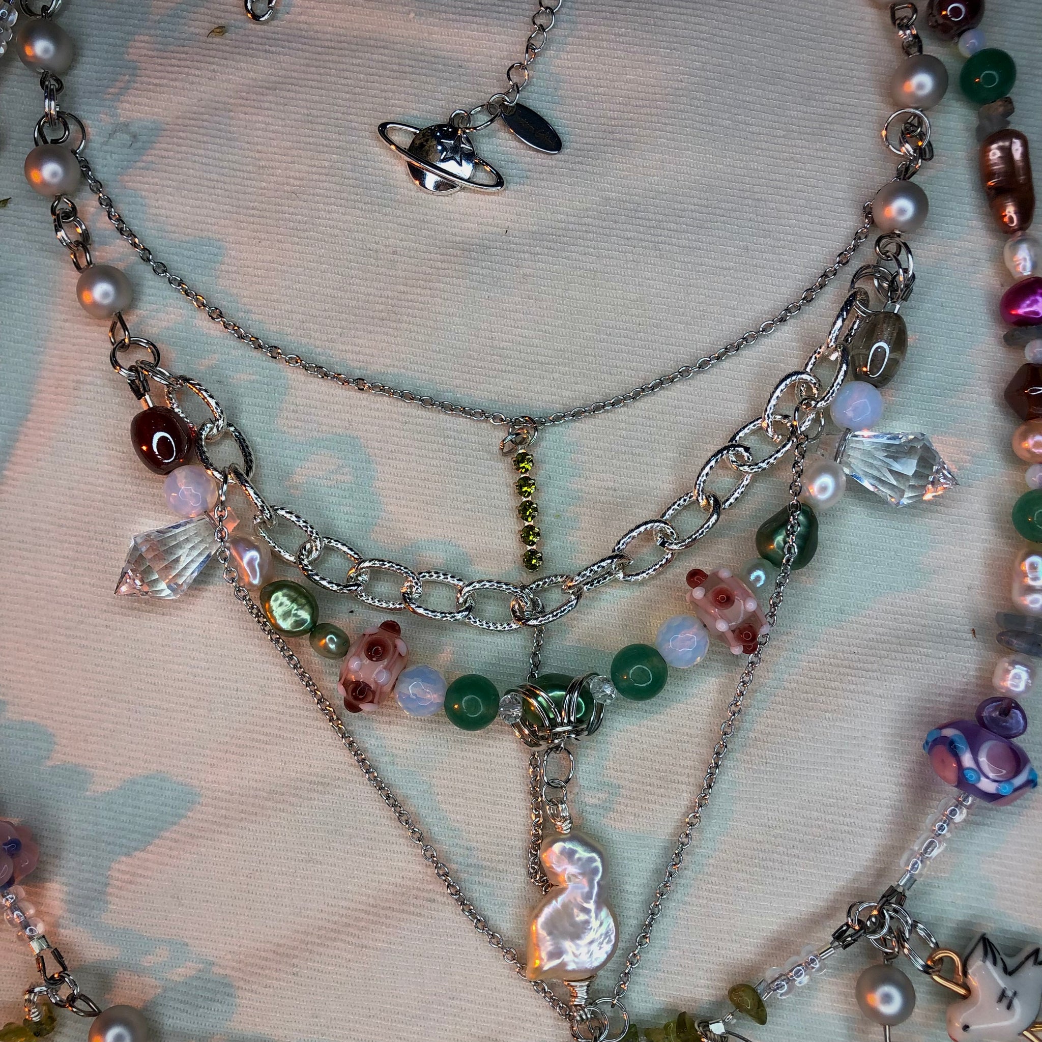 Made with: Lampwork beads, Peridot, Freshwater pearls, ceramic beads, Labradorite, Saturns, Zirconia, Opal, Agate, Sandstone, Glass, Antiques, Czech beads, Chandelier glass.