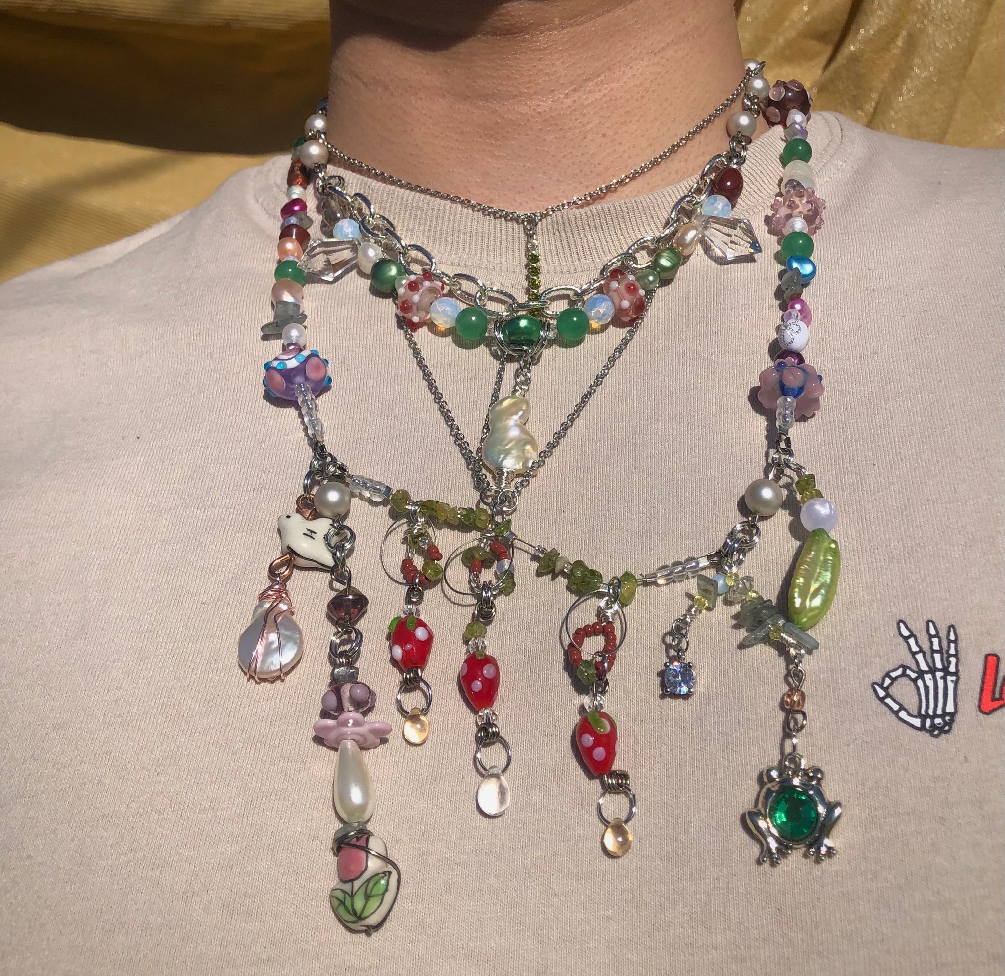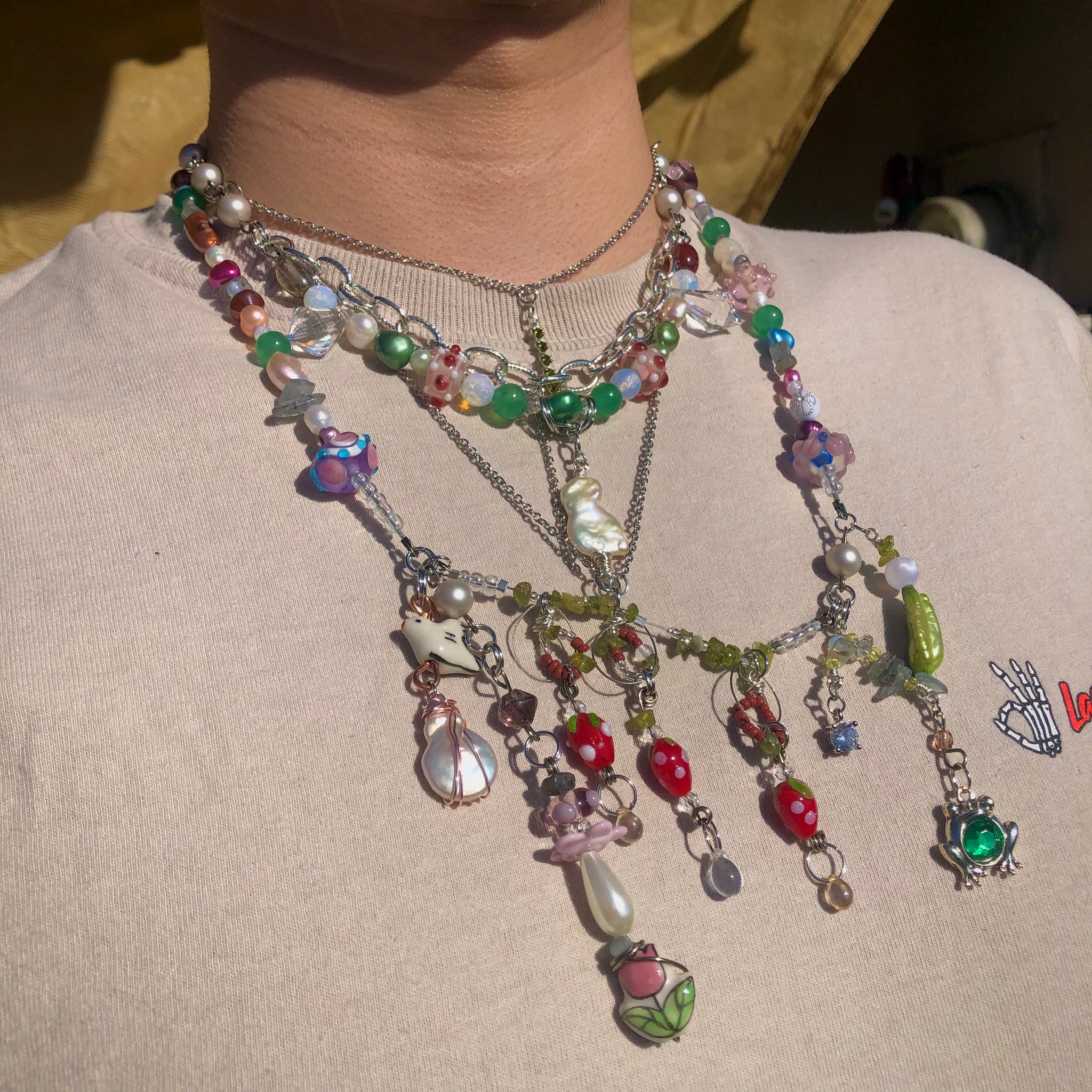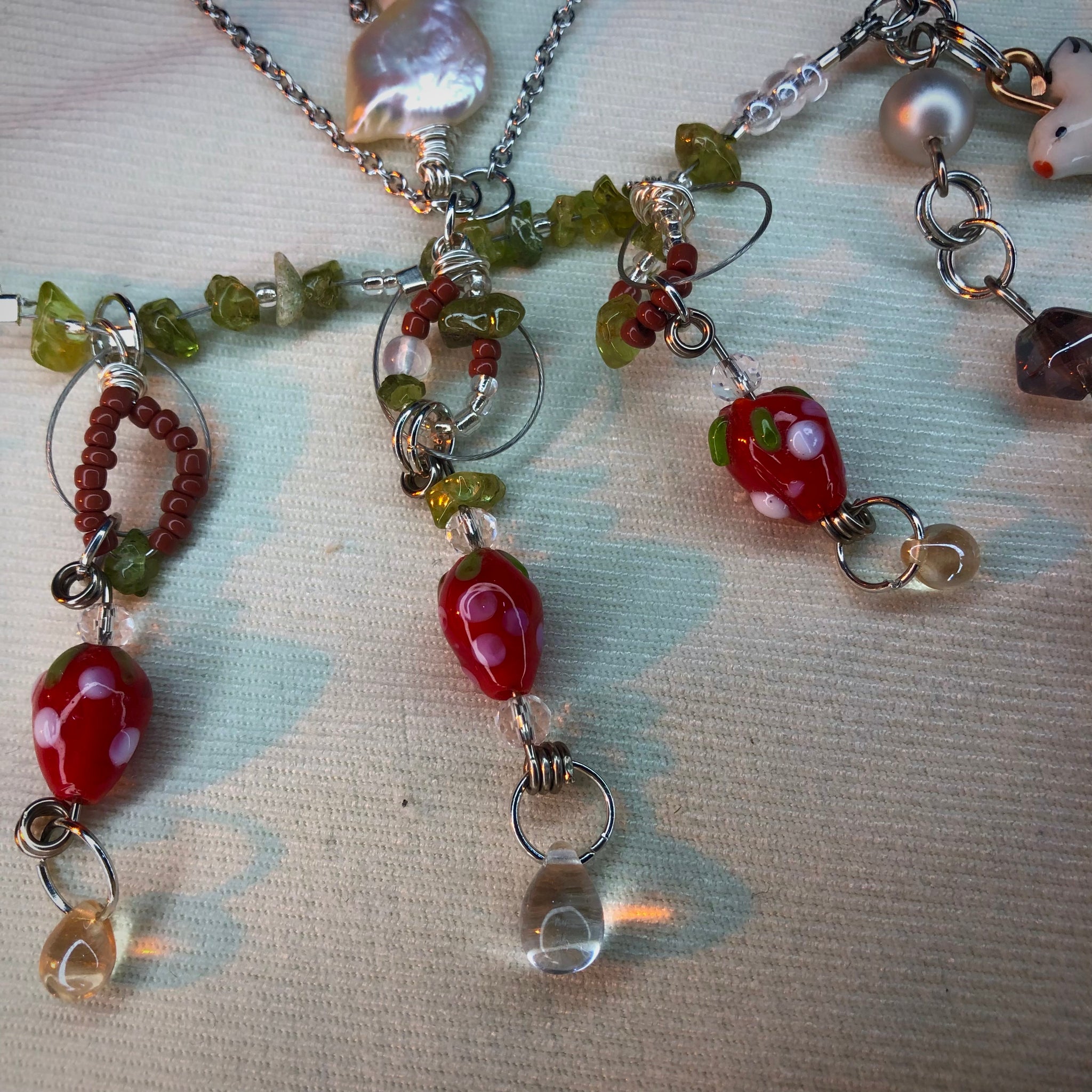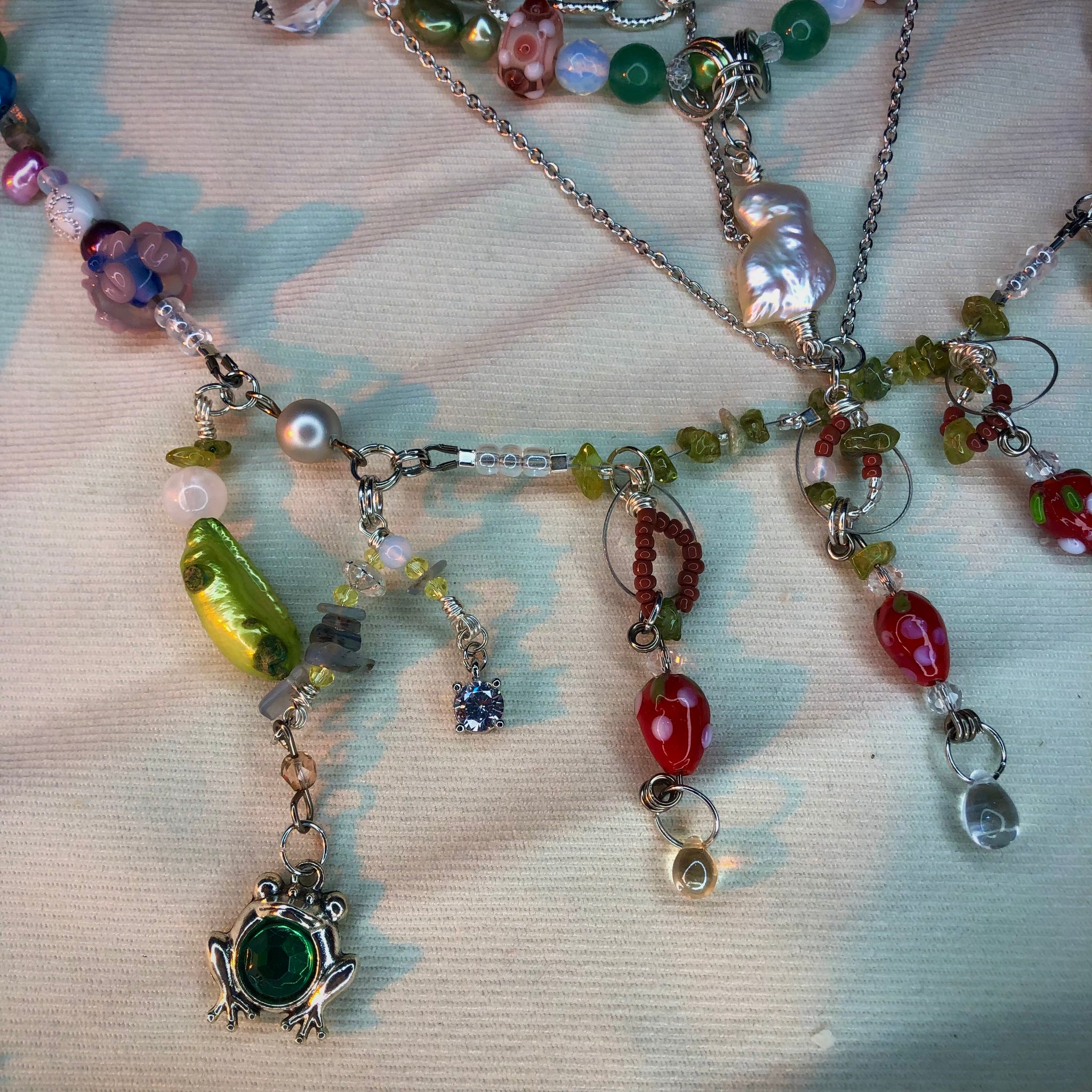 Made with: Lampwork beads, Peridot, Freshwater pearls, ceramic beads, Labradorite, Saturns, Zirconia, Opal, Agate, Sandstone, Glass, Antiques, Czech beads, Chandelier glass.