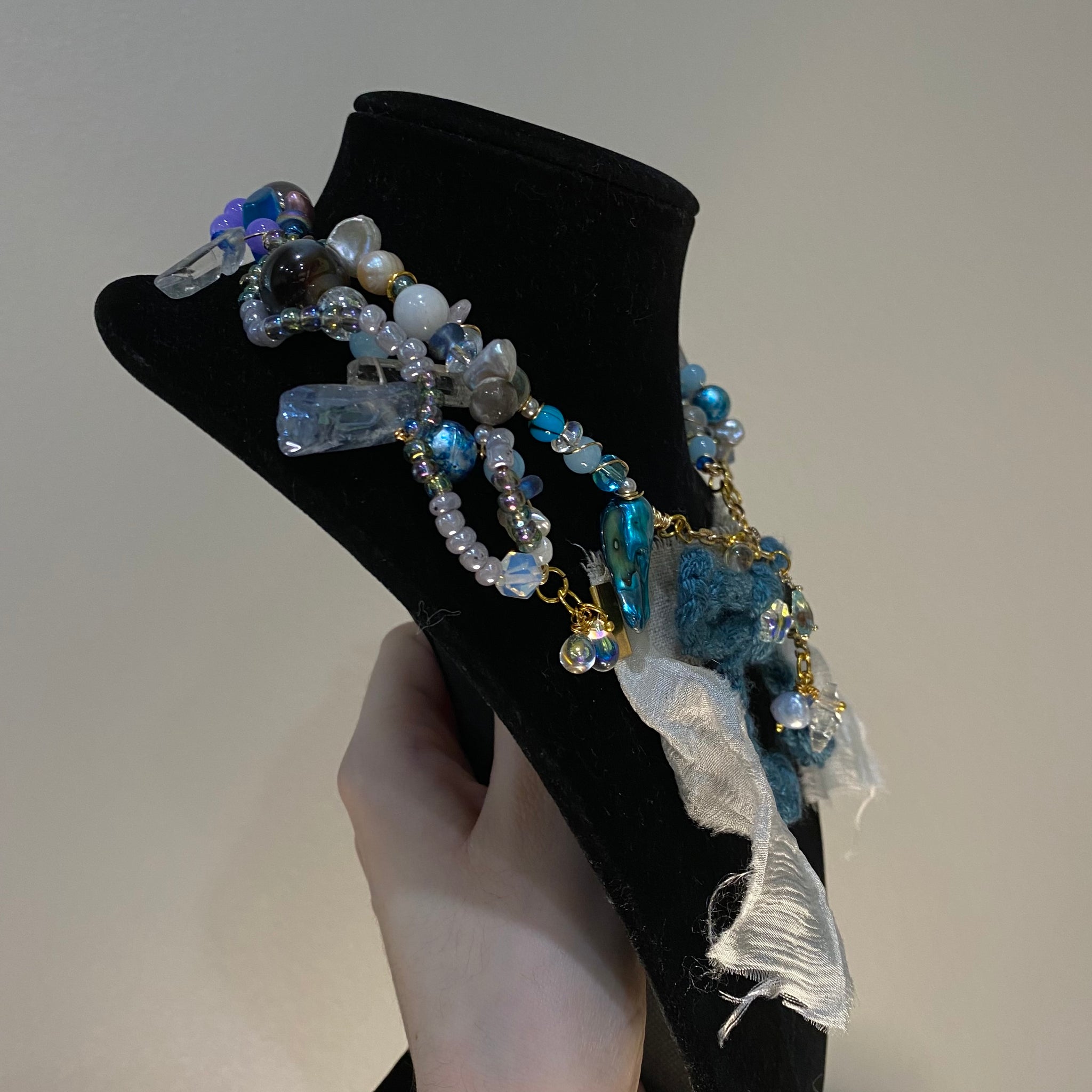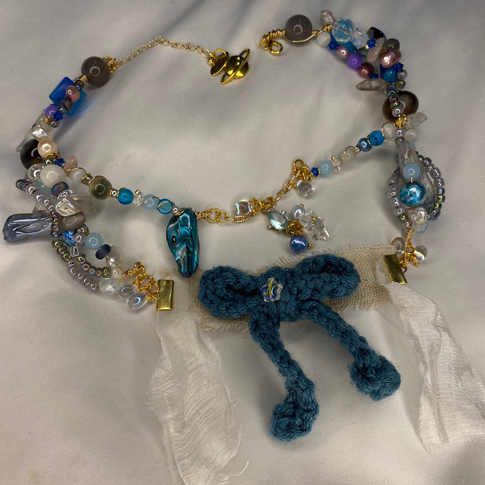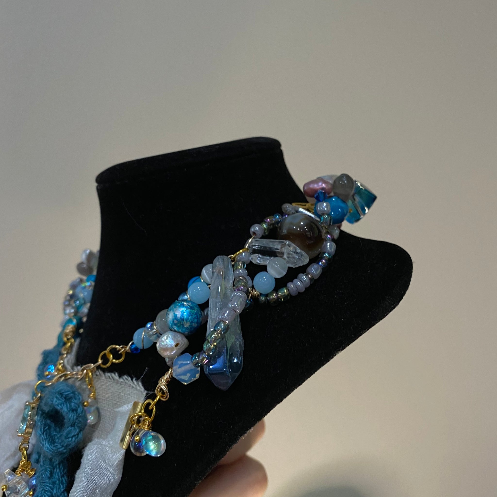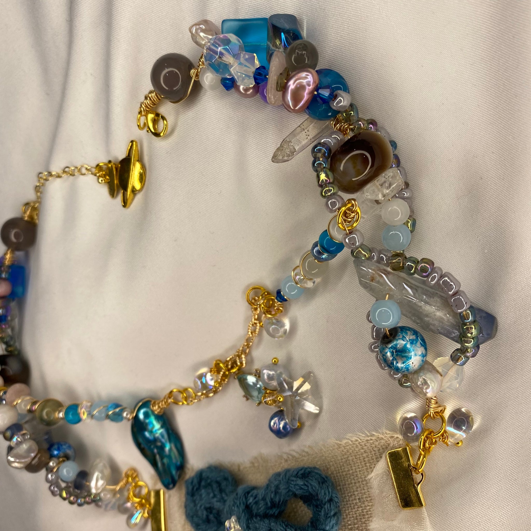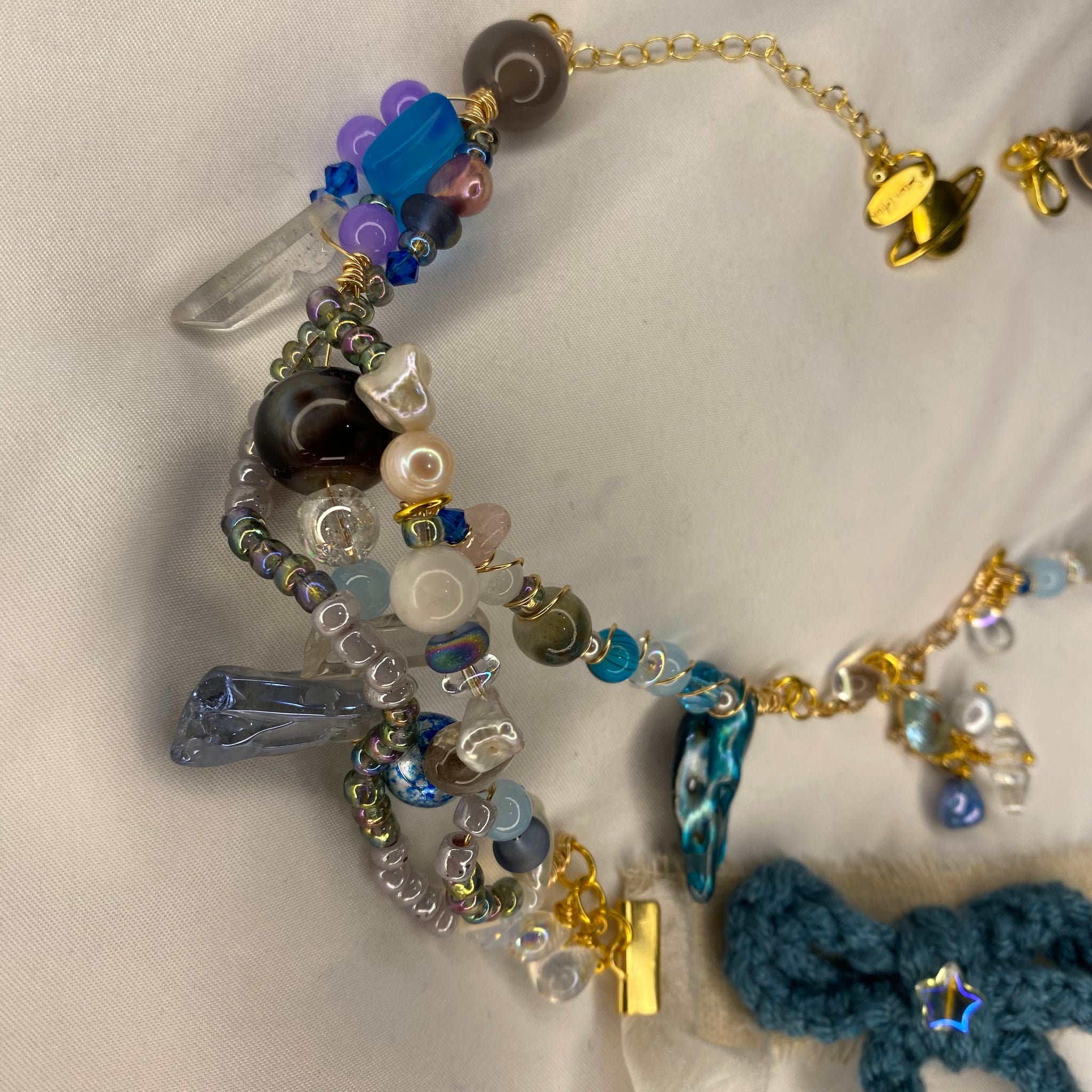 Made with: Opals, yarn, stars, blue luster, cotton and lace, cats eye, fw pearls, glass, lampwork beads, clear quartz, cloudy quartz, moonstone, rose quartz and zirconia.
