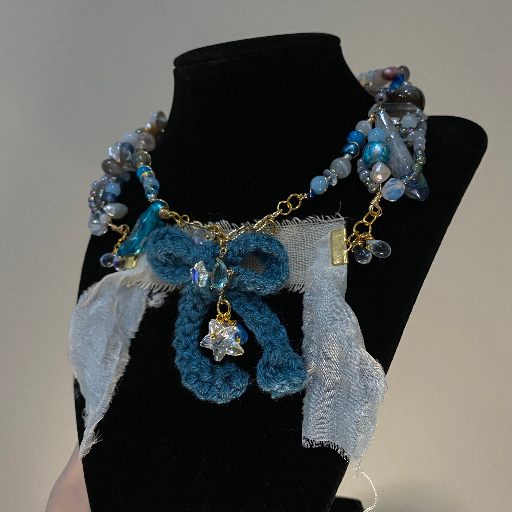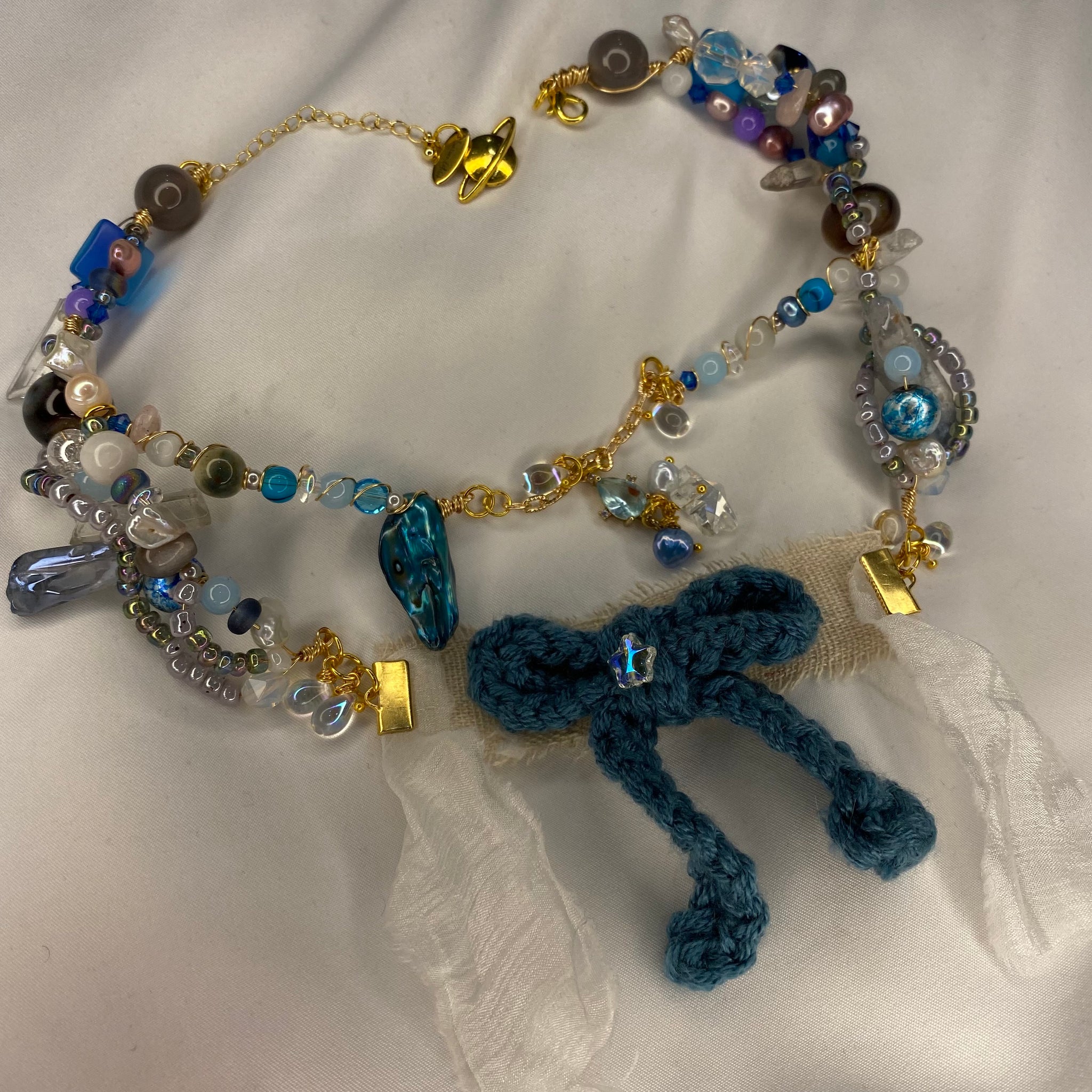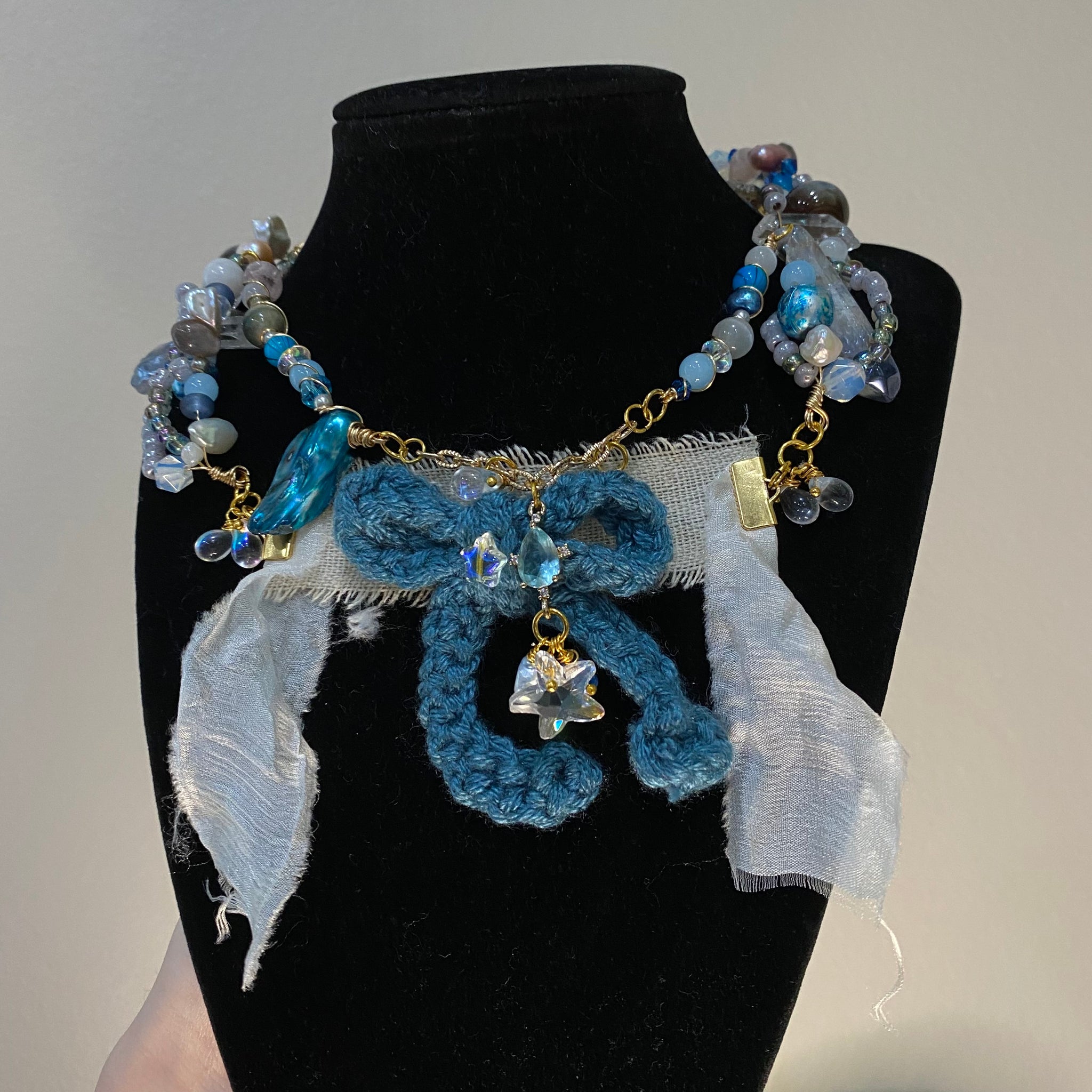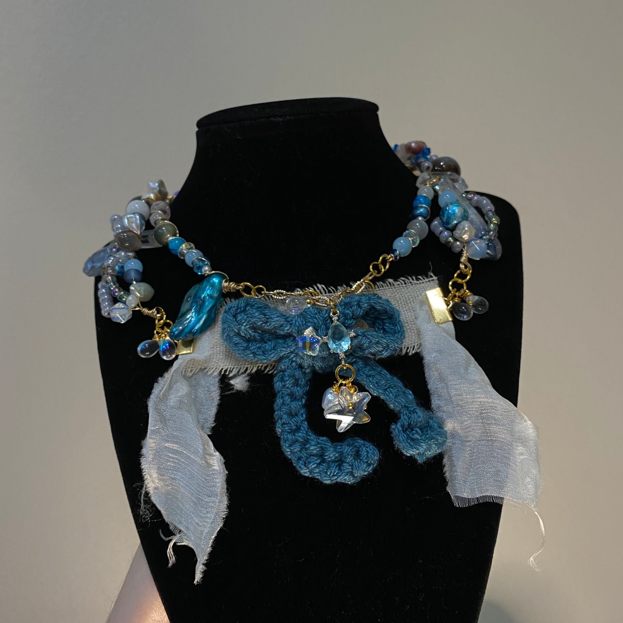 Made with: Opals, yarn, stars, blue luster, cotton and lace, cats eye, fw pearls, glass, lampwork beads, clear quartz, cloudy quartz, moonstone, rose quartz and zirconia.