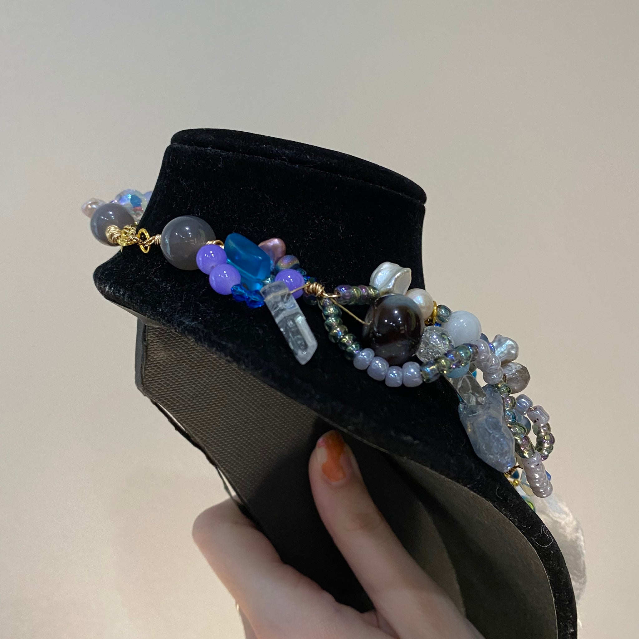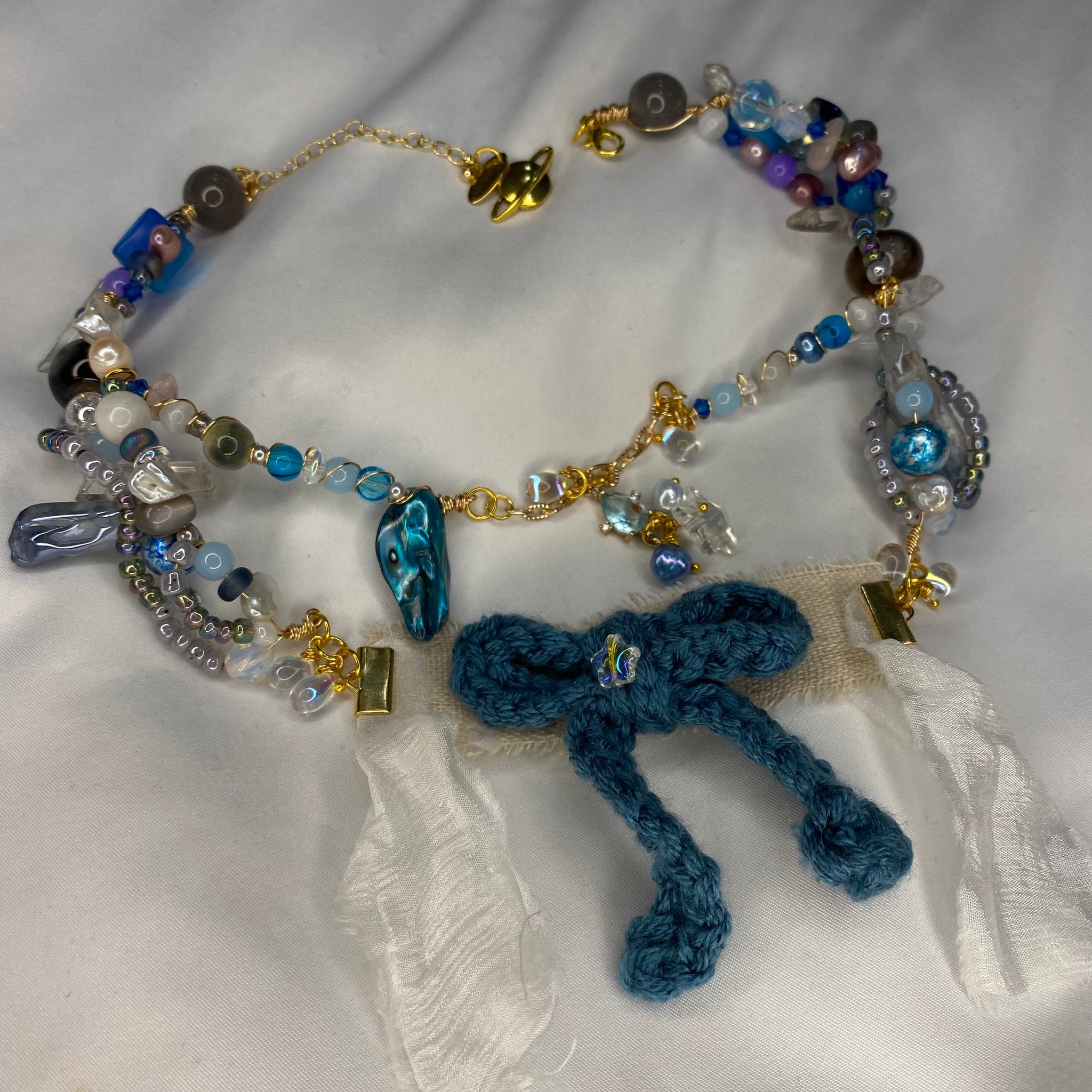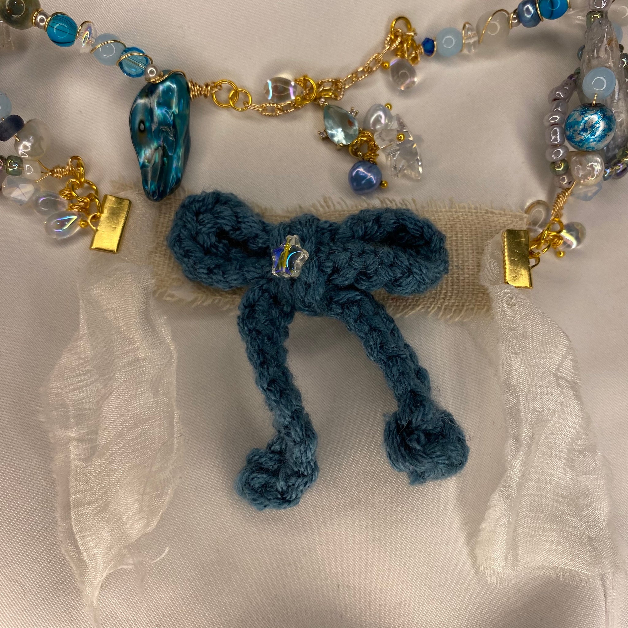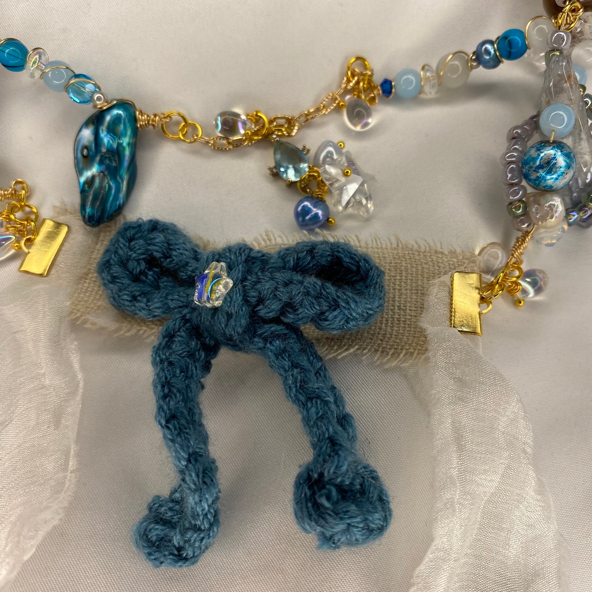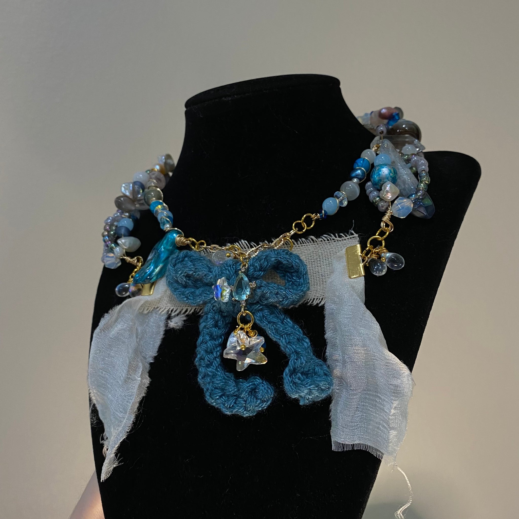 Made with: Opals, yarn, stars, blue luster, cotton and lace, cats eye, fw pearls, glass, lampwork beads, clear quartz, cloudy quartz, moonstone, rose quartz and zirconia.