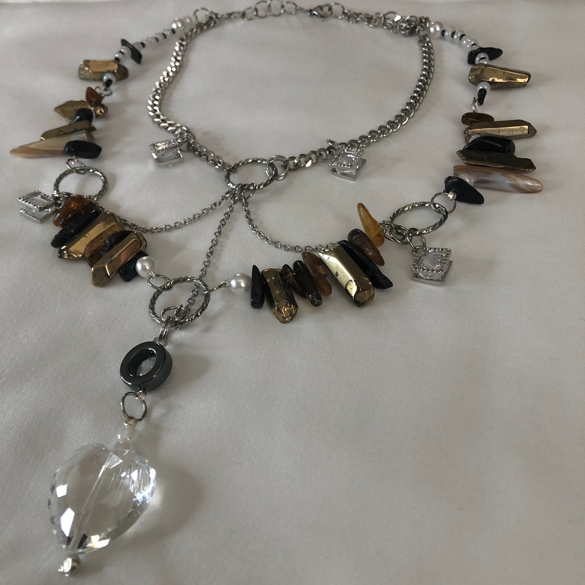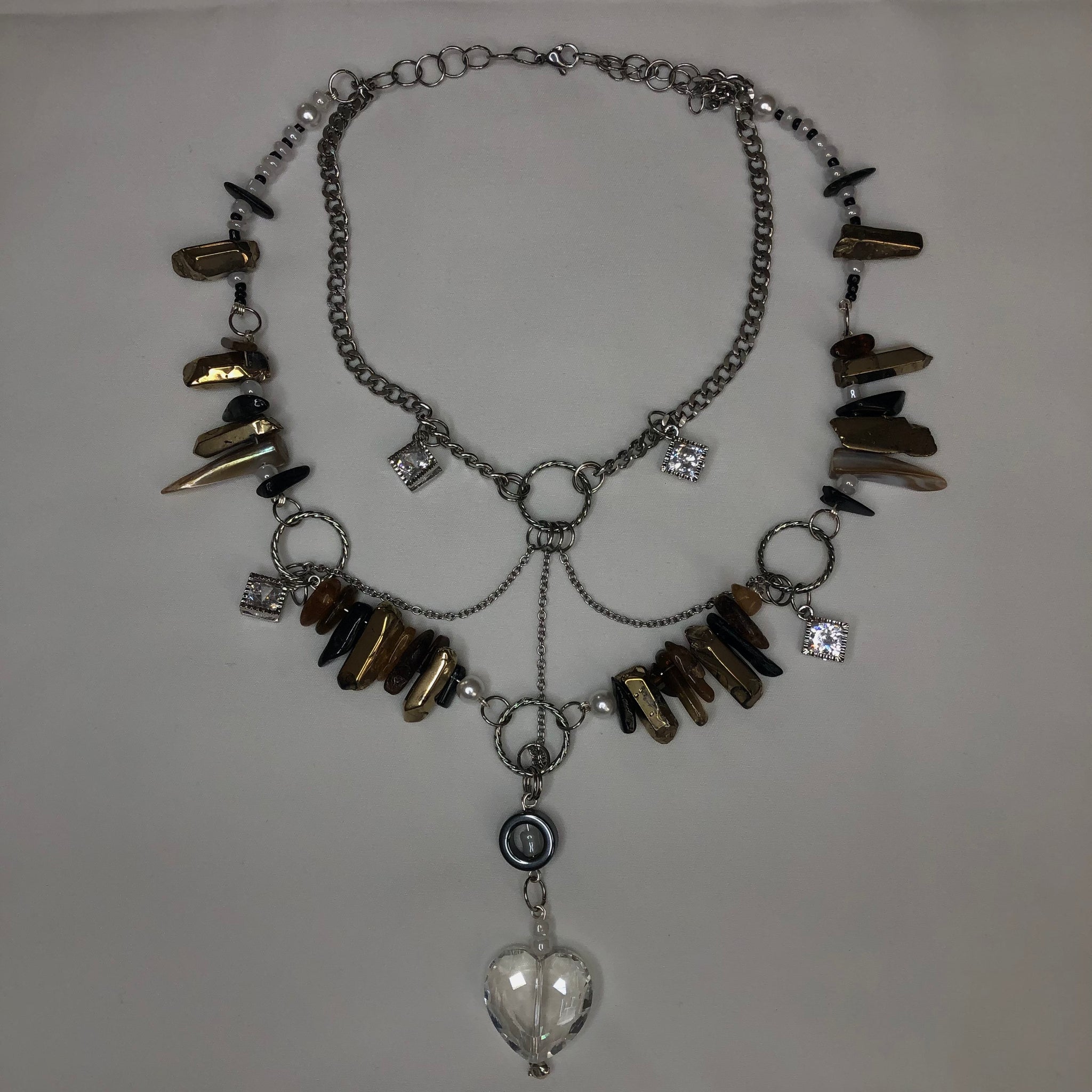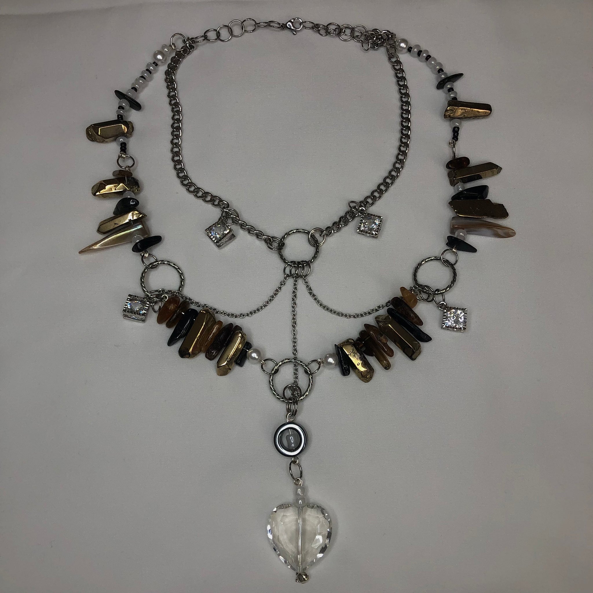 Made with: White seeds, Black seeds, Gold cluster, Black & Brown Tourmaline, Stainless Steel, and a Glass heart.