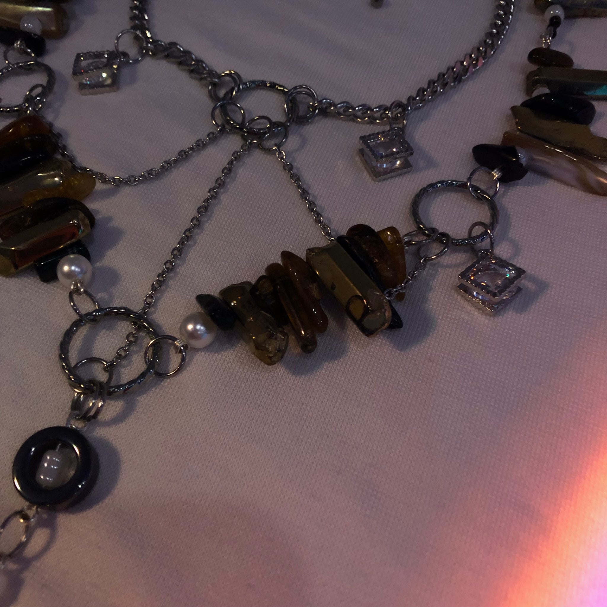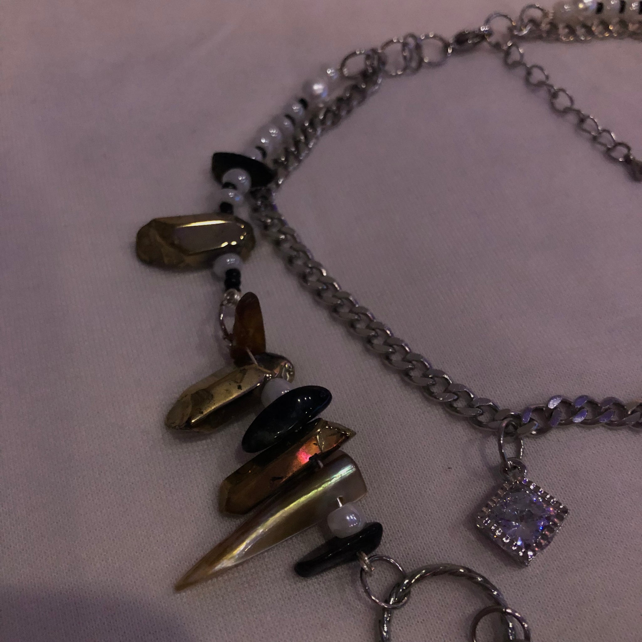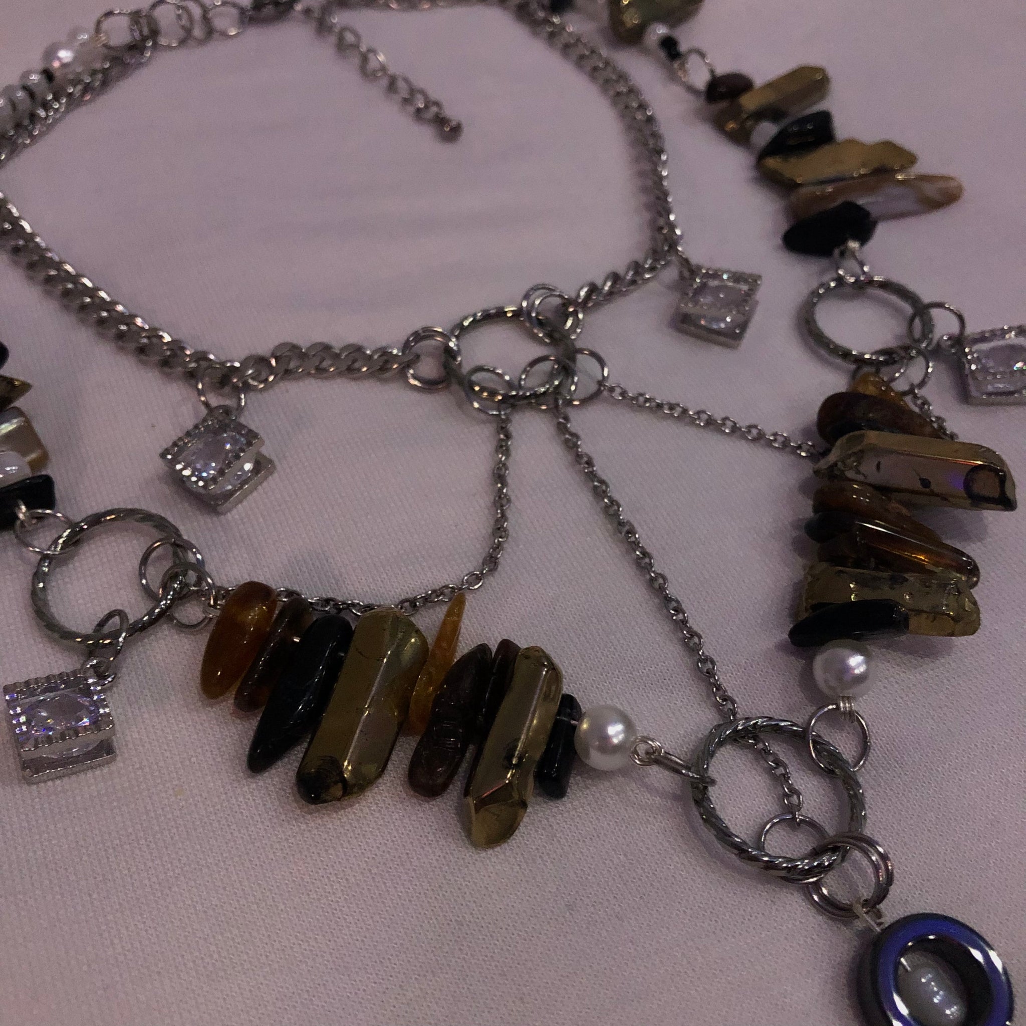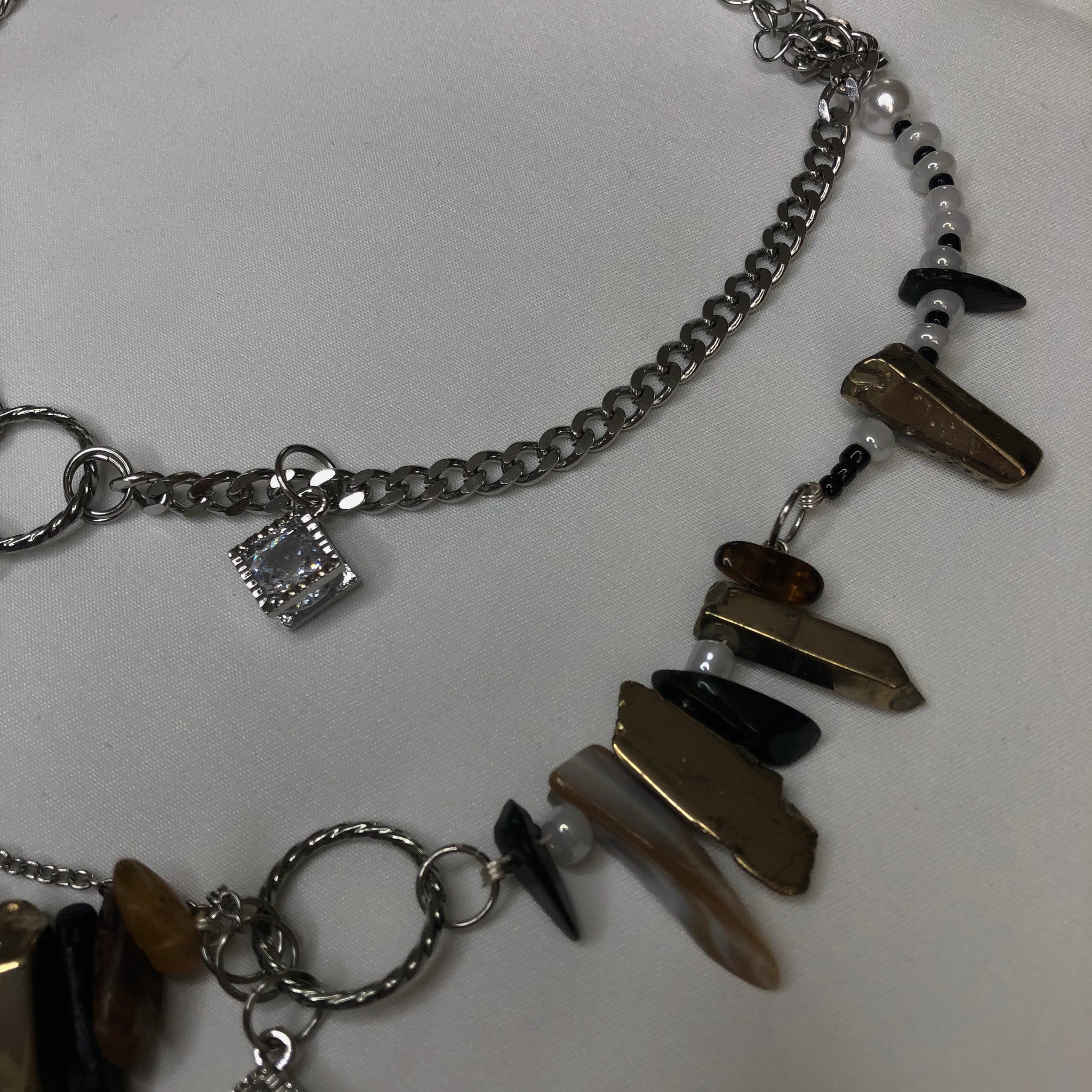 Made with: White seeds, Black seeds, Gold cluster, Black & Brown Tourmaline, Stainless Steel, and a Glass heart.